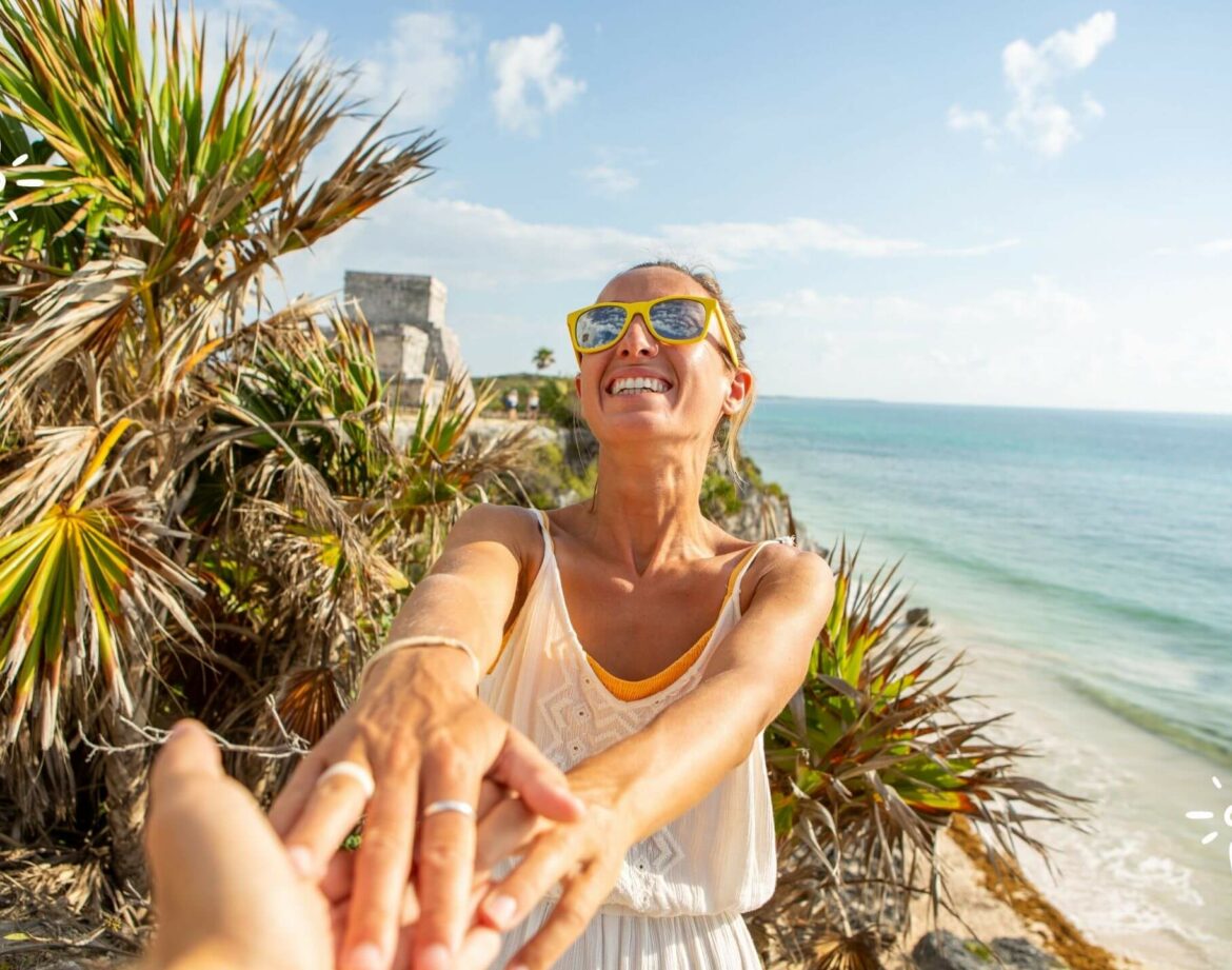 Group member joyfully participating in the Leadership Retreat Tulum with picturesque Caribbean Sea backdrop