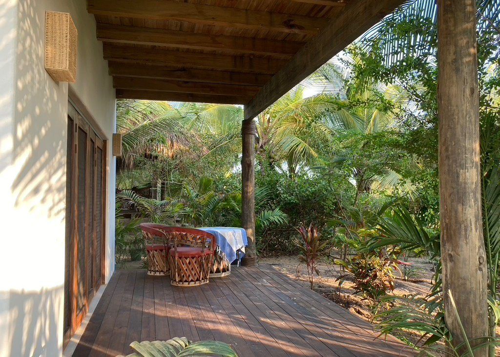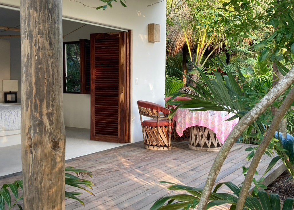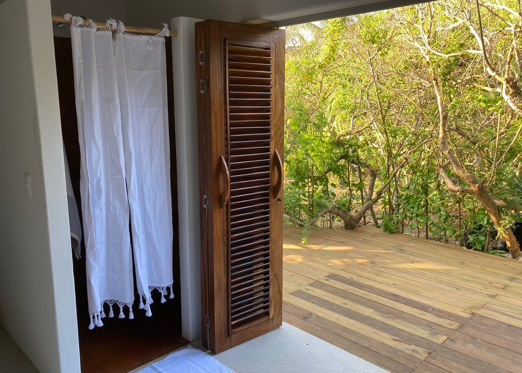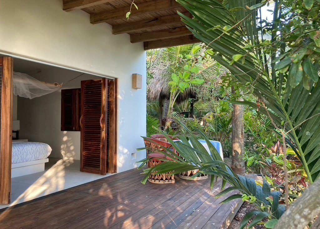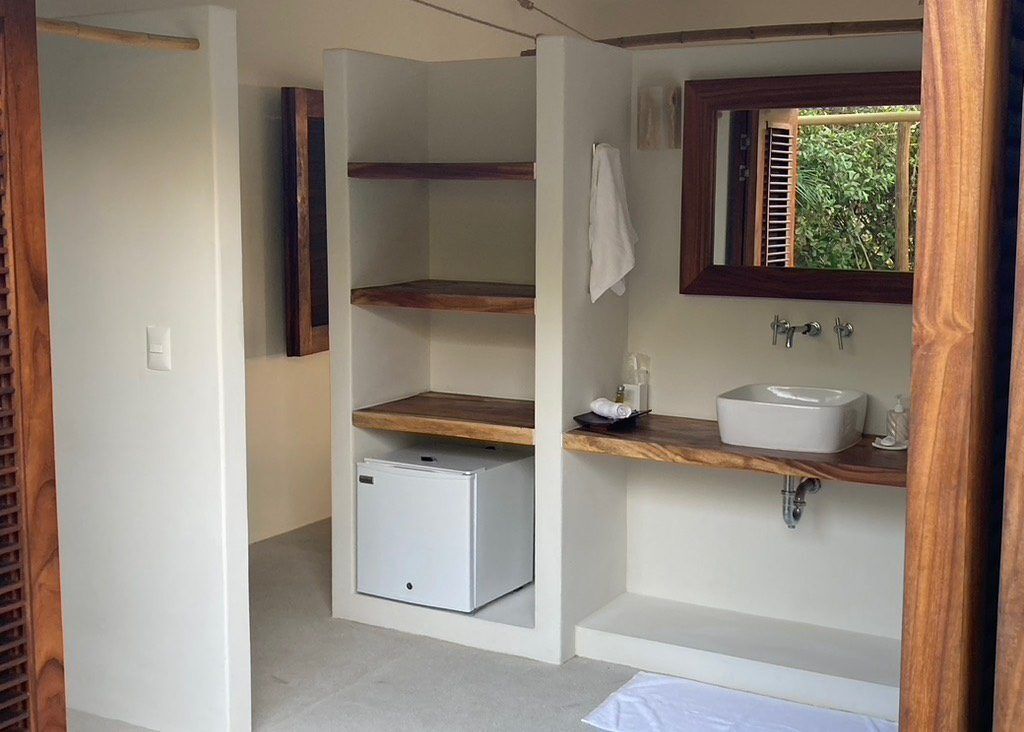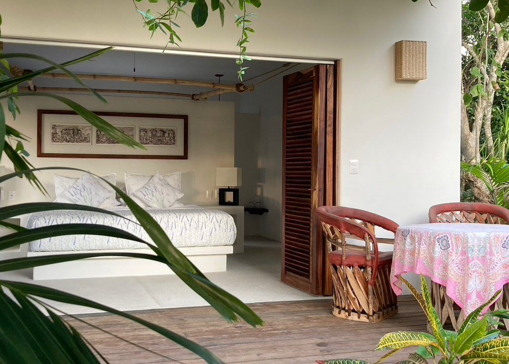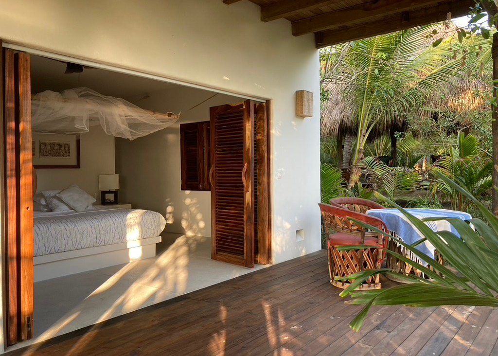 Situated on the ground floor, Bungalow Lavanda presents guests with captivating views of the gardens, pool, and the vast ocean. Its interior, painted in soft, neutral colors, harmoniously contrasts the rich green of the encircling jungle. When you lie on the king-sized bed, the serene outdoor view fills your sight from the terrace. Additionally, the bungalow boasts spacious closets, a comprehensive bathroom, and warm wood shutters. These features and a handy refrigerator for cooling beverages and snacks make Lavanda a delightful retreat.