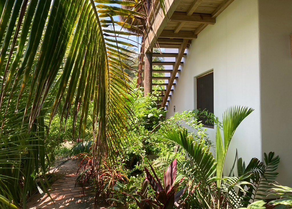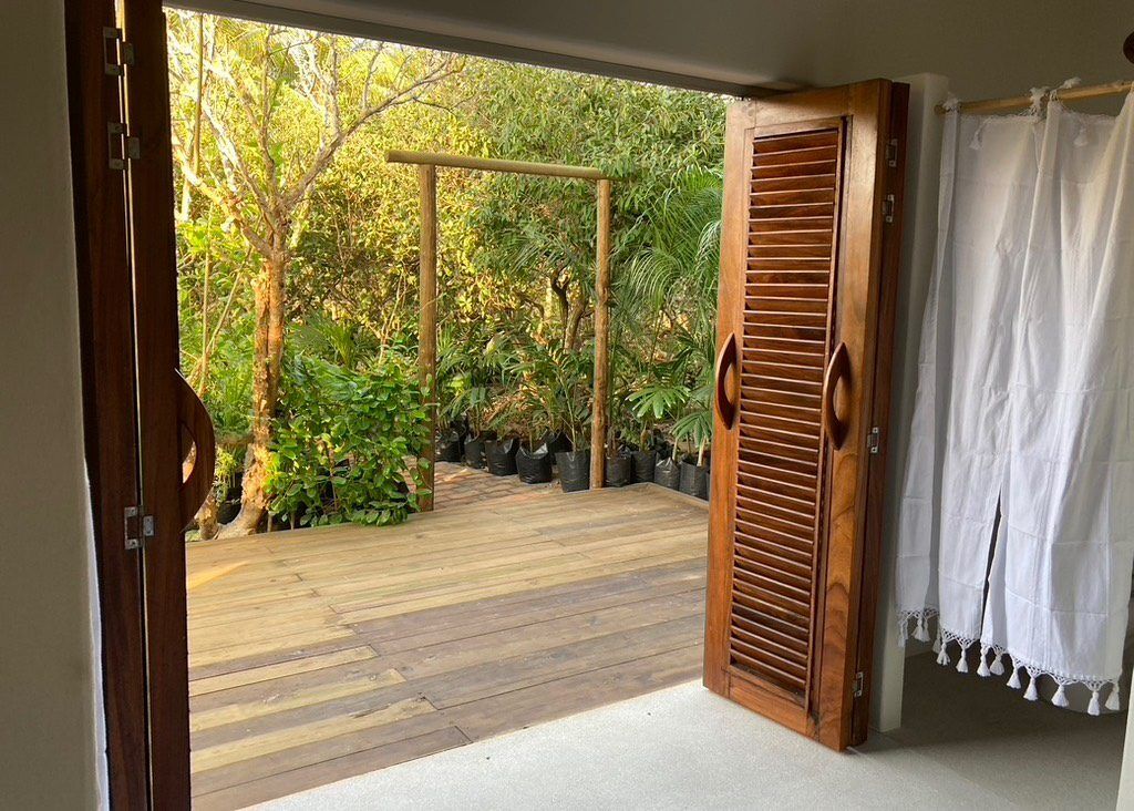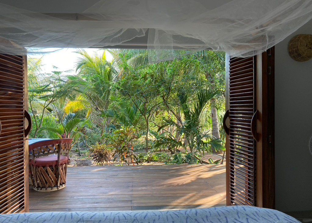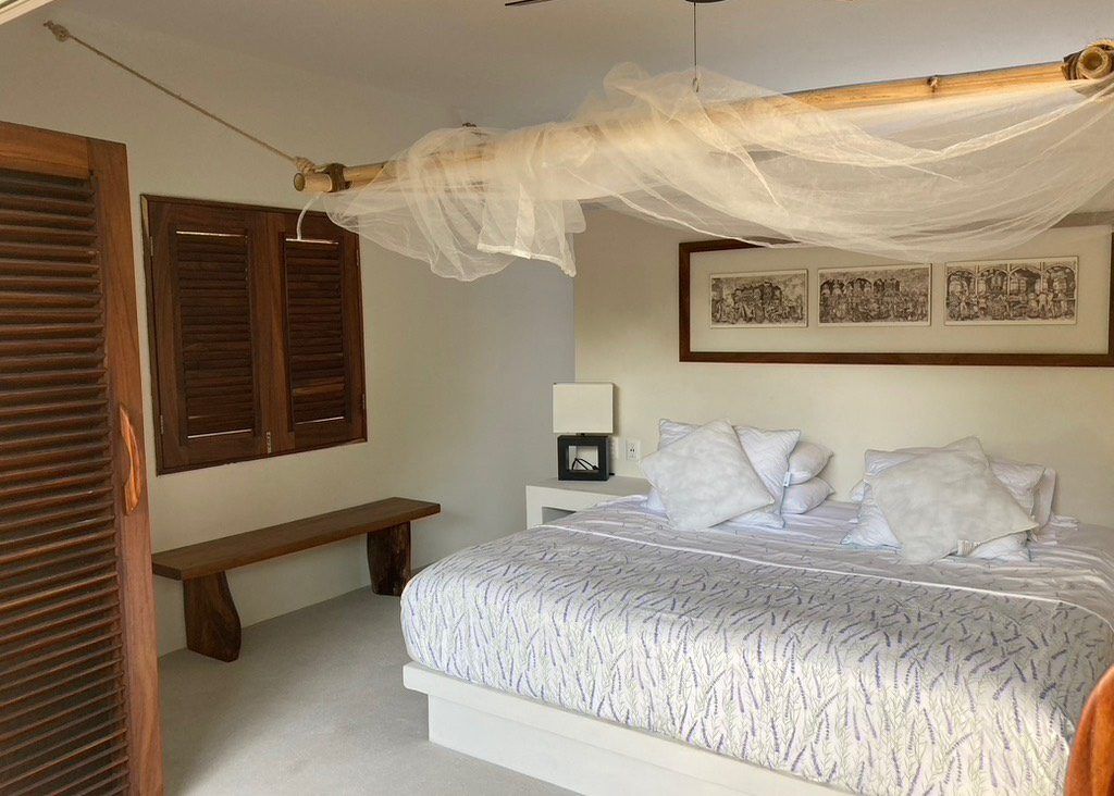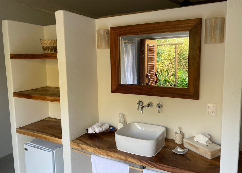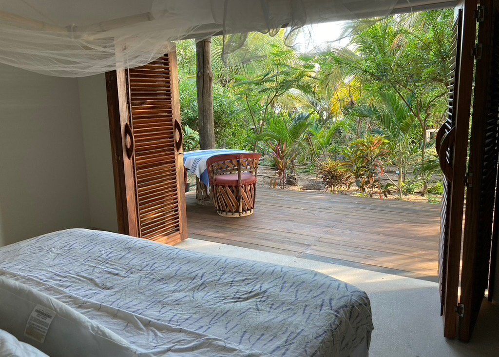 Situated on the ground floor, Bungalow Lavanda presents guests with captivating views of the gardens, pool, and the vast ocean. Its interior, painted in soft, neutral colors, harmoniously contrasts the rich green of the encircling jungle. When you lie on the king-sized bed, the serene outdoor view fills your sight from the terrace. Additionally, the bungalow boasts spacious closets, a comprehensive bathroom, and warm wood shutters. These features and a handy refrigerator for cooling beverages and snacks make Lavanda a delightful retreat.