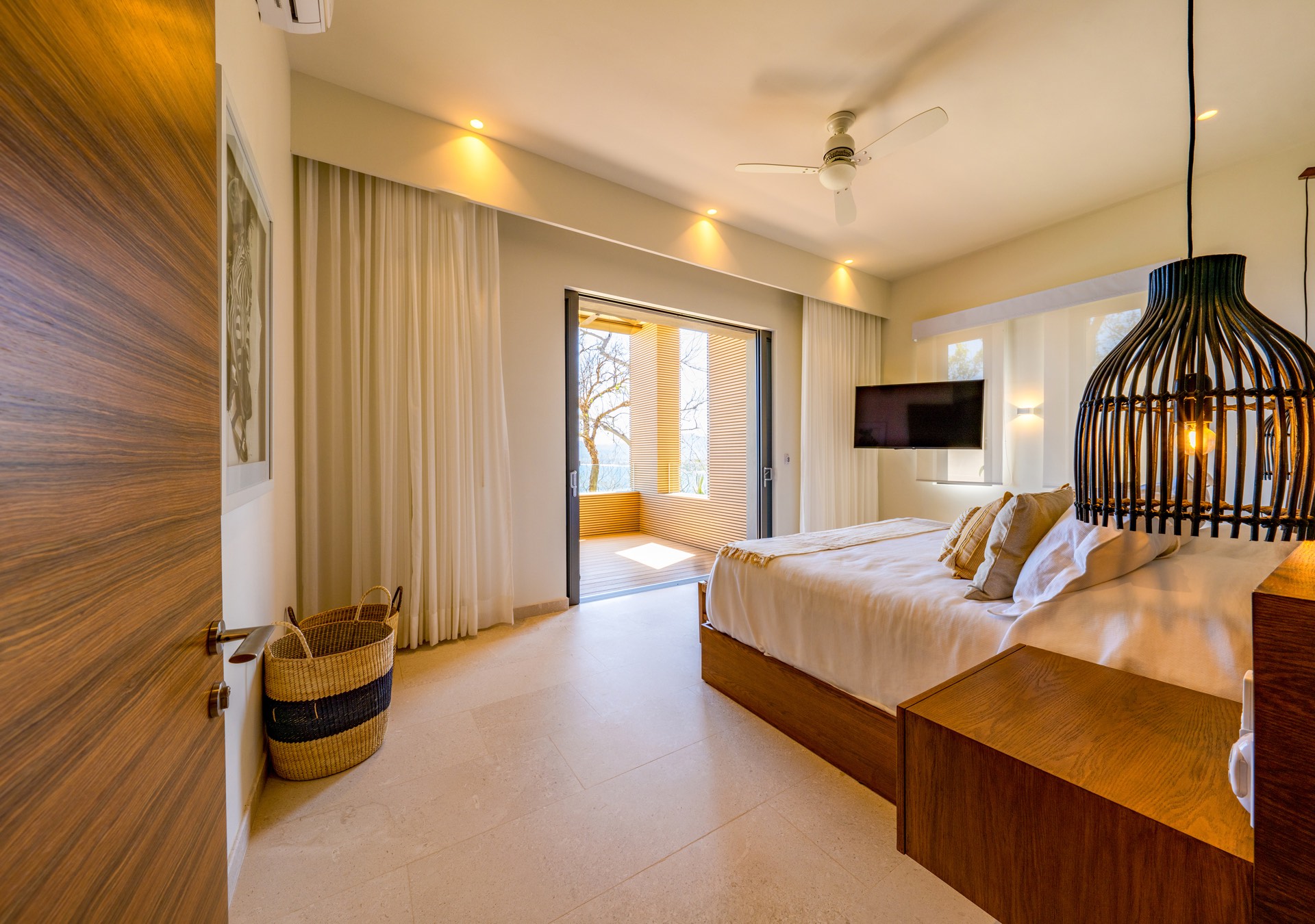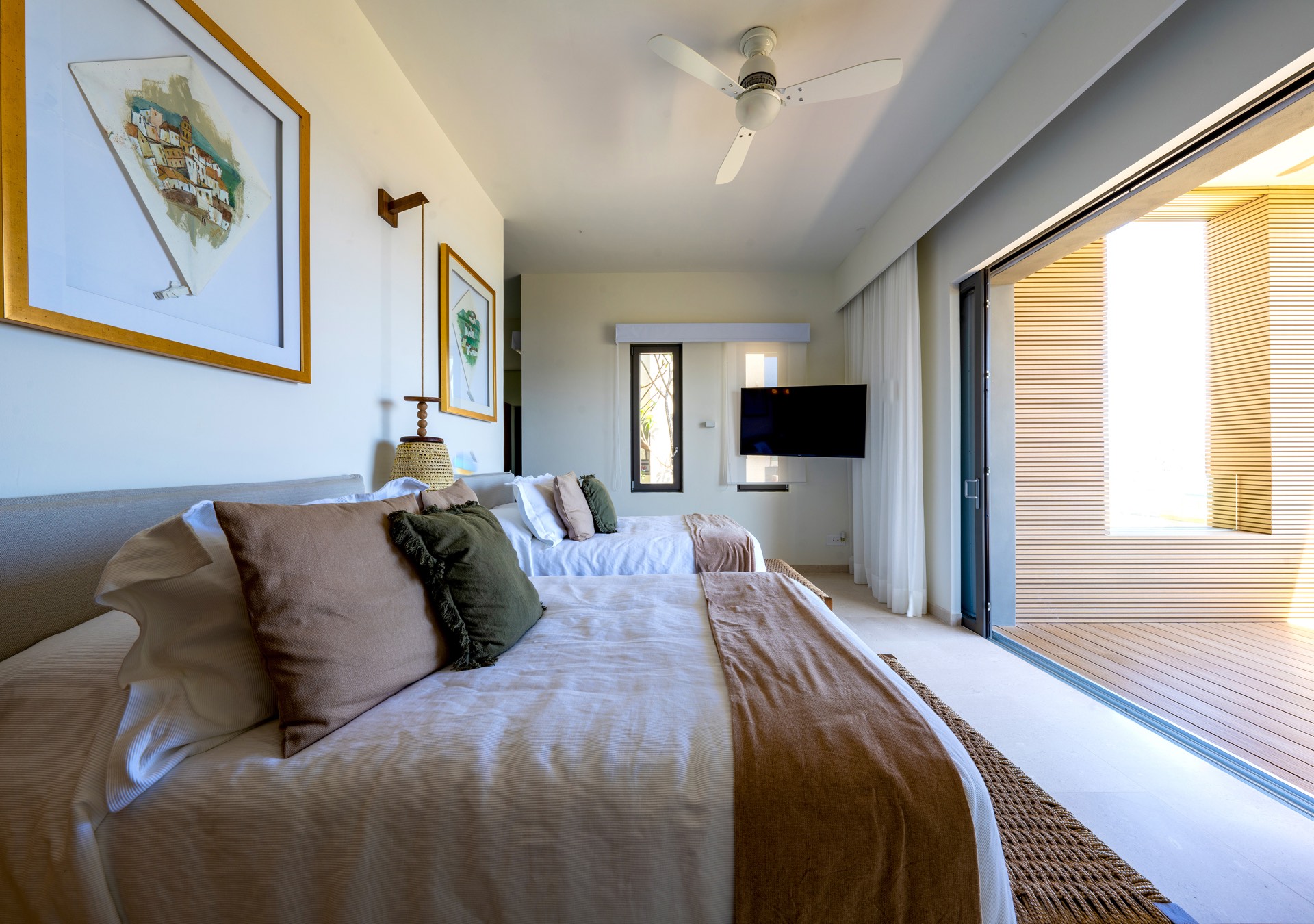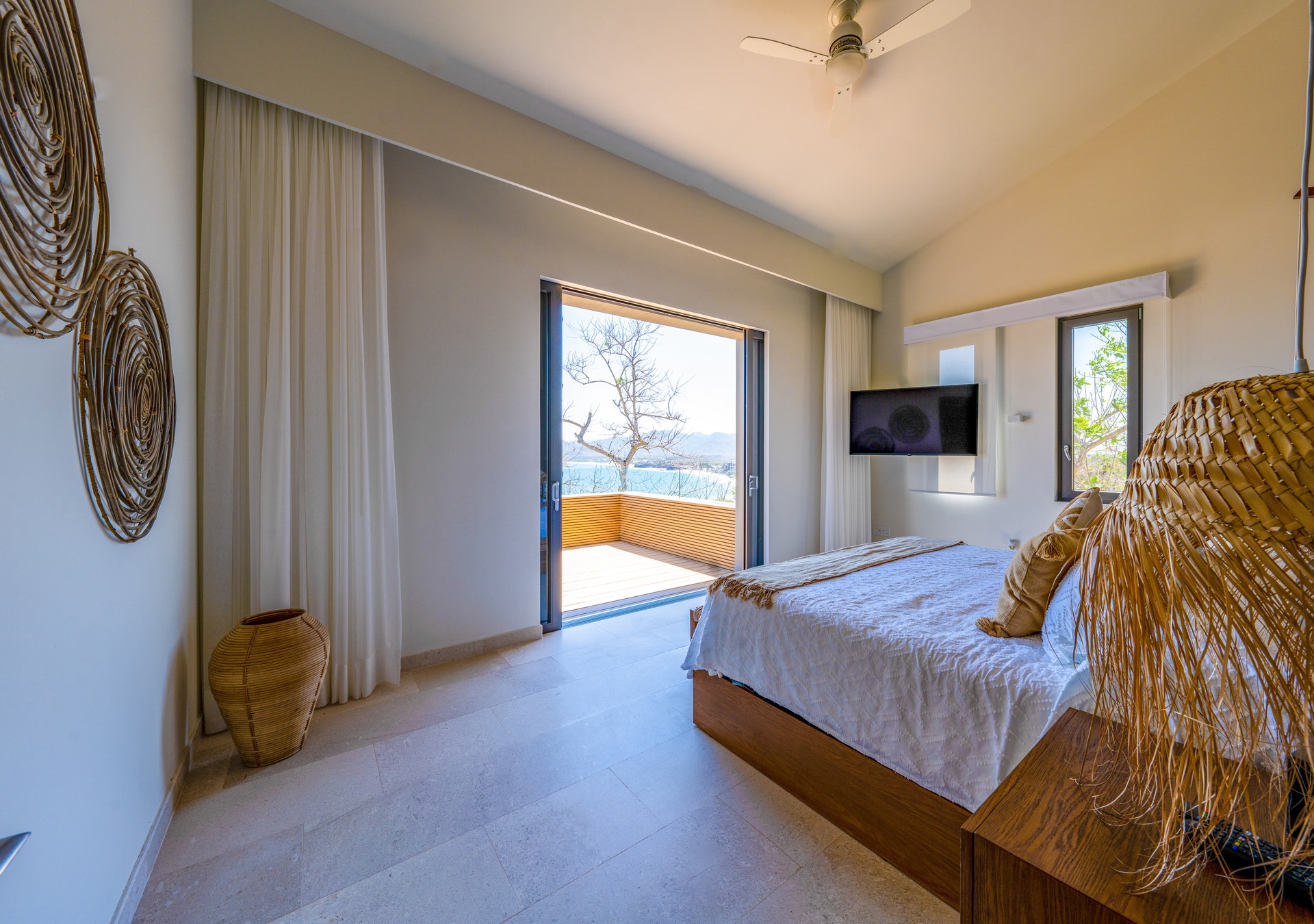 This bedroom features a king-size bed and offers direct access to a private outdoor shower, perfect for rejuvenation. The en-suite bathroom has luxury amenities, and the private terrace provides captivating ocean views for moments of quiet reflection.