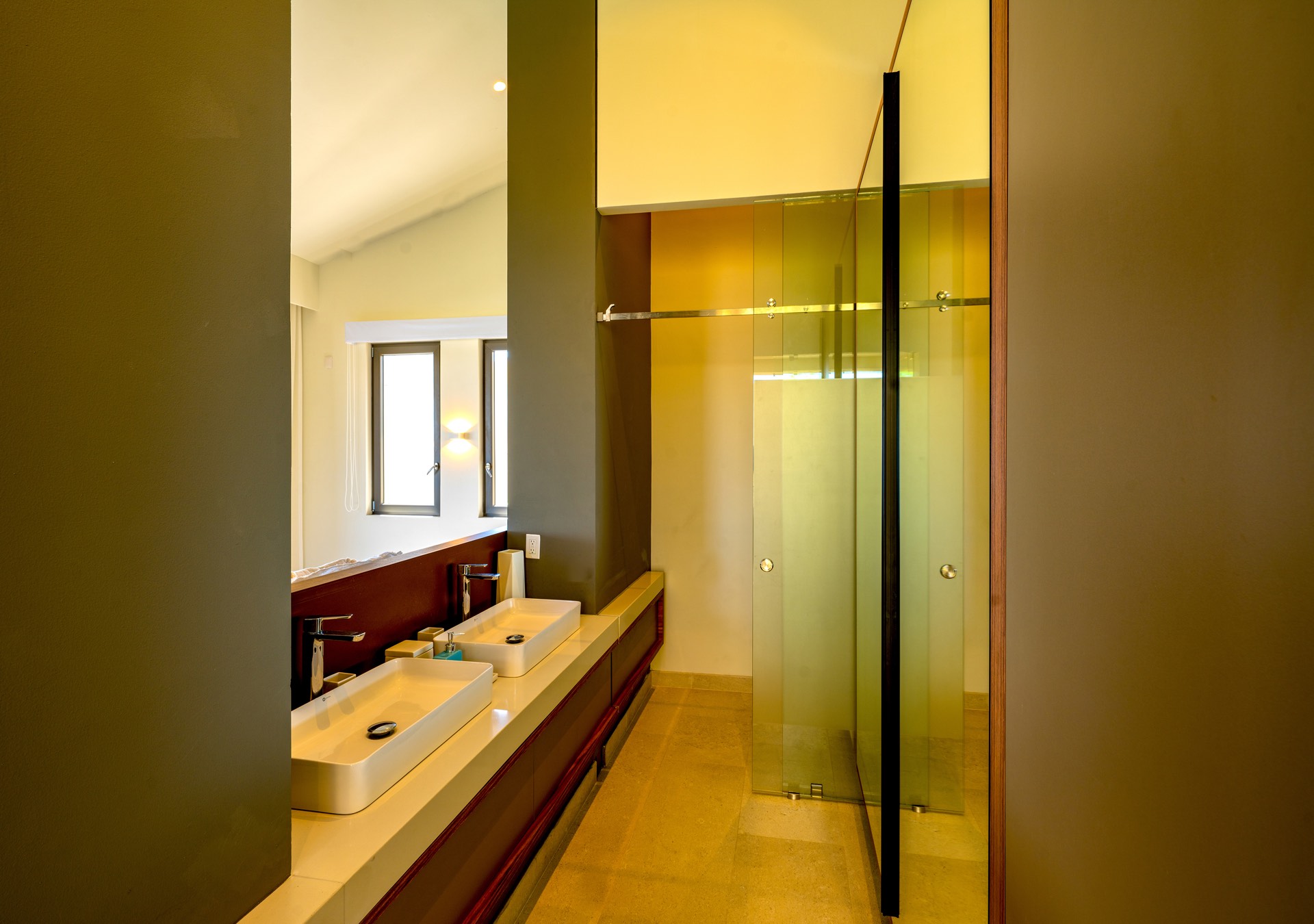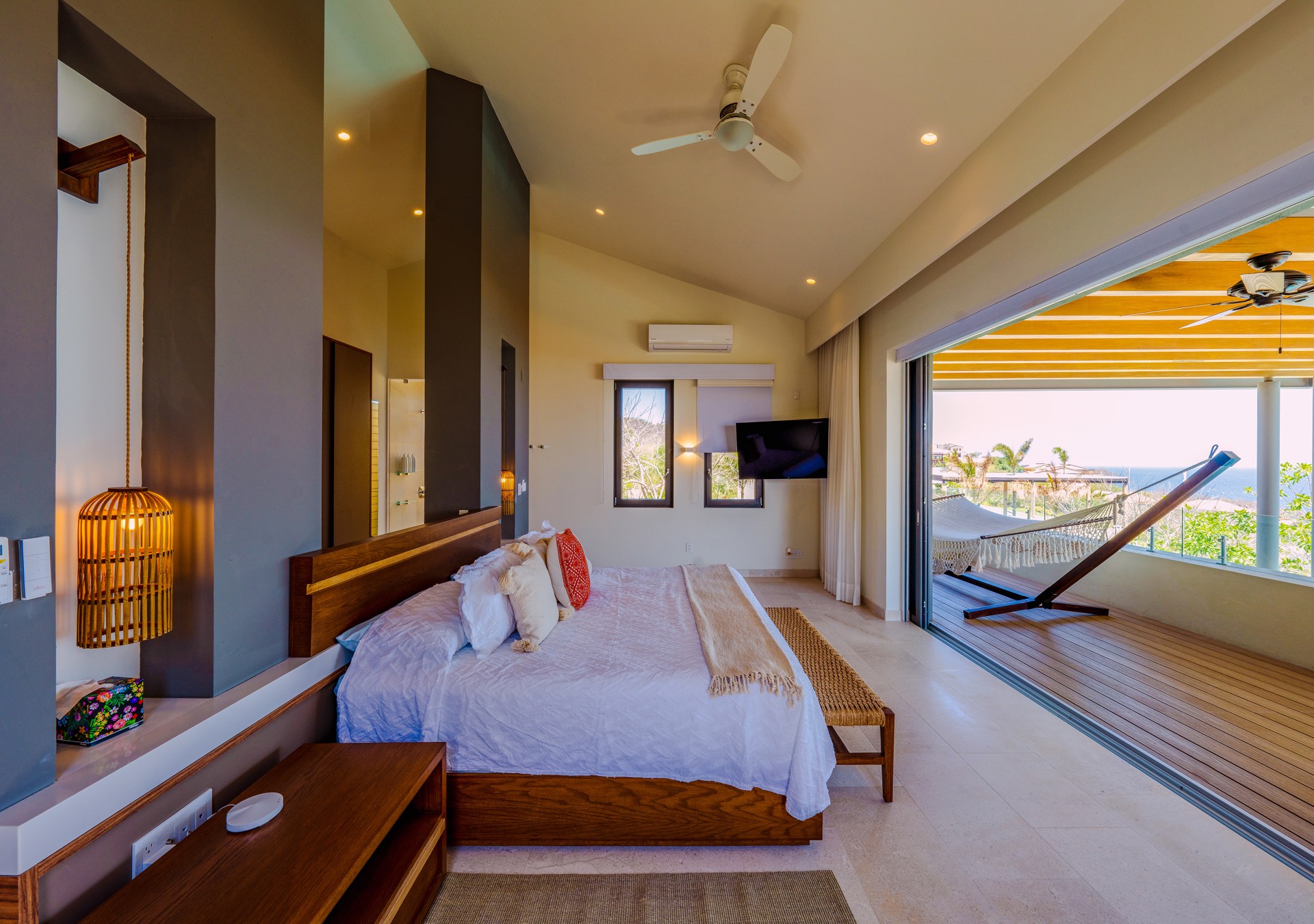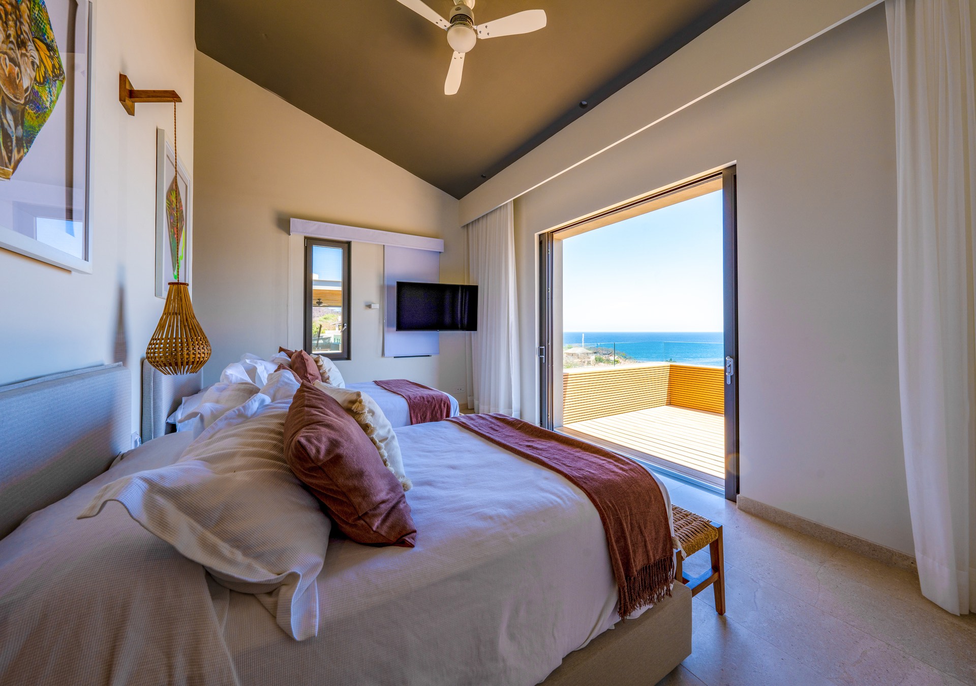This bedroom features a king-size bed and offers direct access to a private outdoor shower, perfect for rejuvenation. The en-suite bathroom has luxury amenities, and the private terrace provides captivating ocean views for moments of quiet reflection.