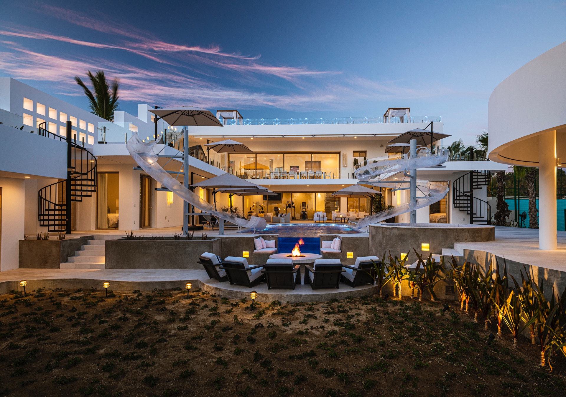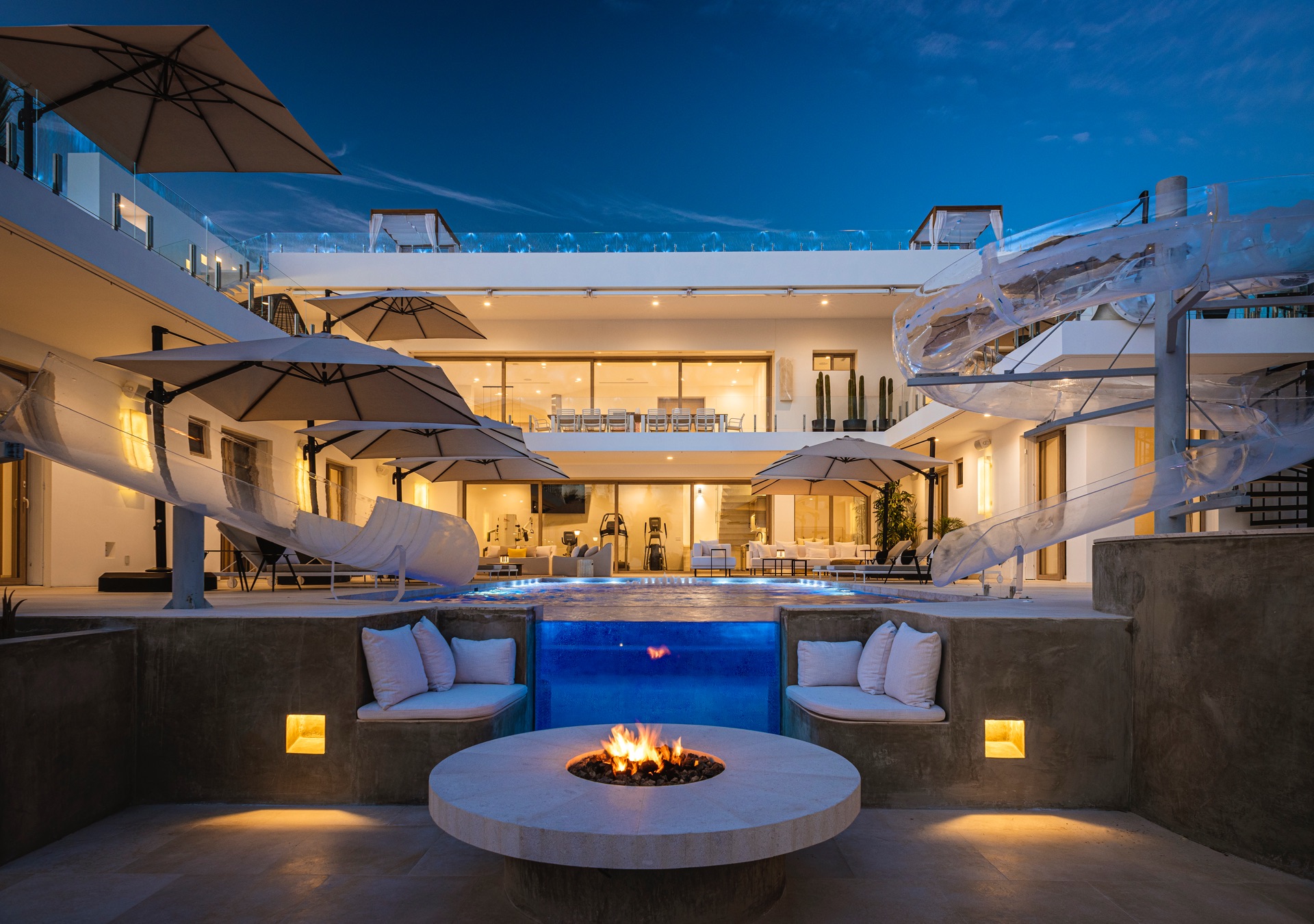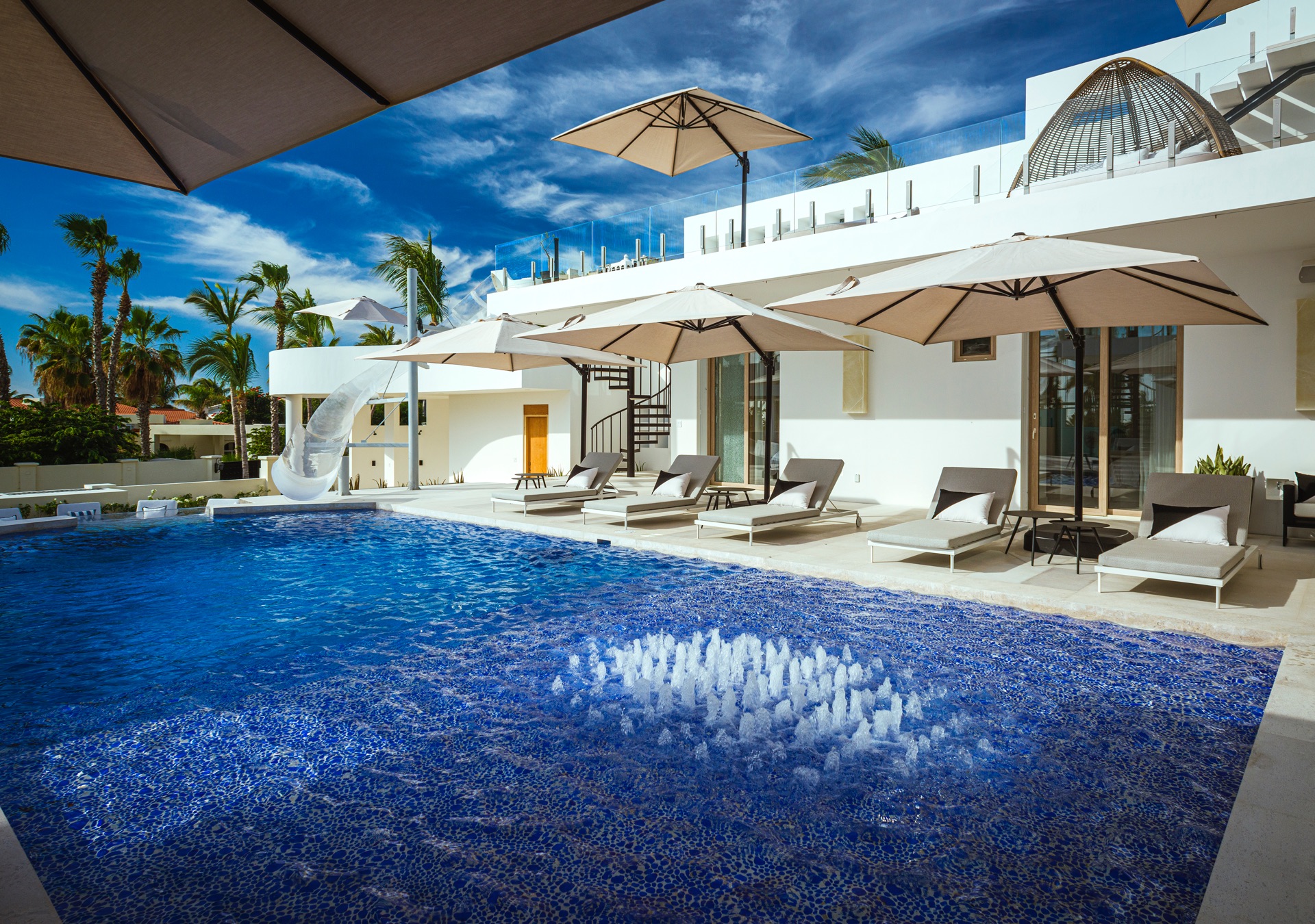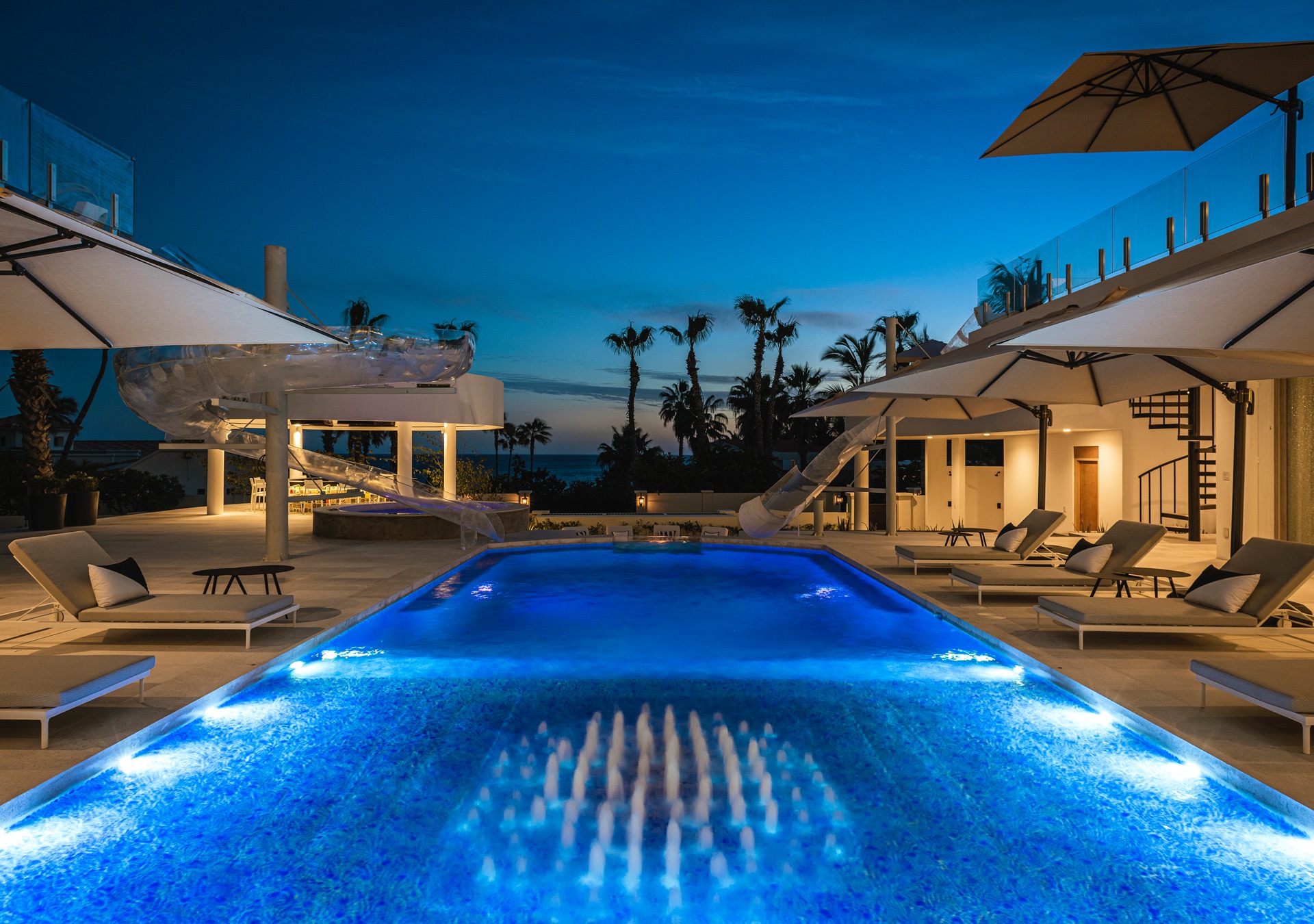 Casa Aqua Blanca is a contemporary home that perfectly combines modern architecture and new construction. Each of the seven bedrooms features comfortable beds, plush linens, en-suite bathrooms, and beautiful lighting. Guests will enjoy a fully-equipped kitchen with a dining table for 14, an in-home fitness room, and a 180″ Smart TV in the living room, perfect for watching the big game or your favorite shows in the evenings. This villa’s outdoor living area is expansive and accommodating, offering multiple levels of lounging areas. The large pool can be accessed from the rooftop firepit and lounge area via one of two clear waterslides cascading down to the lower level. Additionally, guests will love the jacuzzi, gas BBQ, outdoor bar and entertainment area, and its easy beach access.