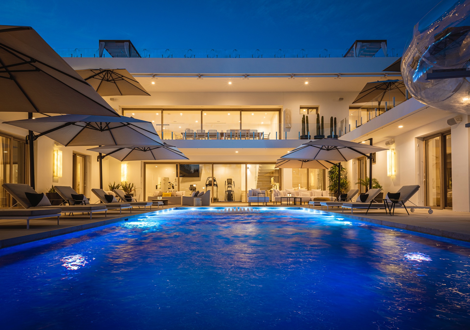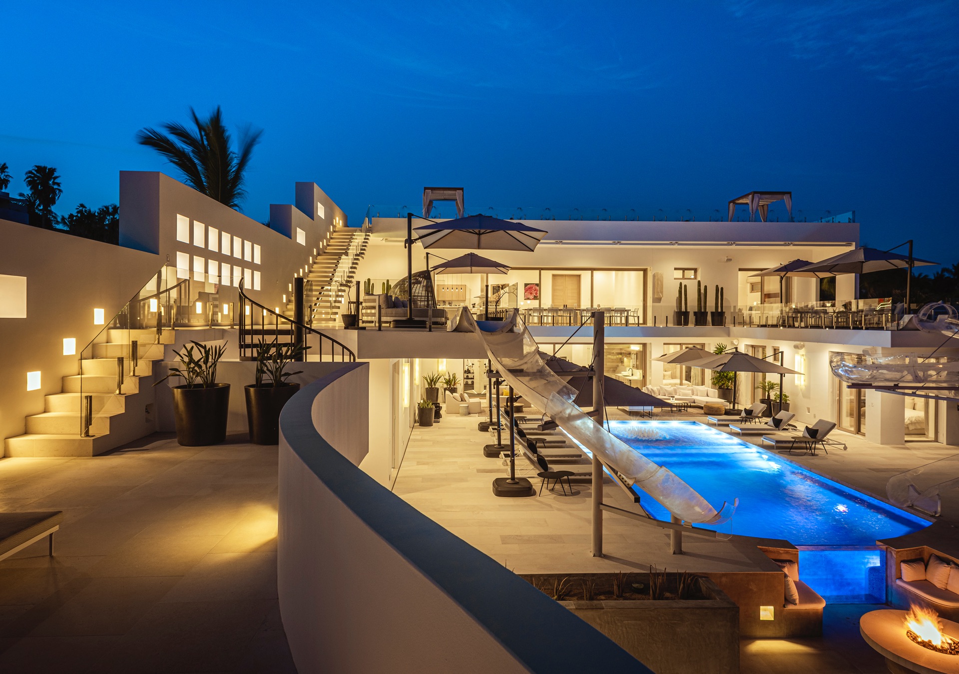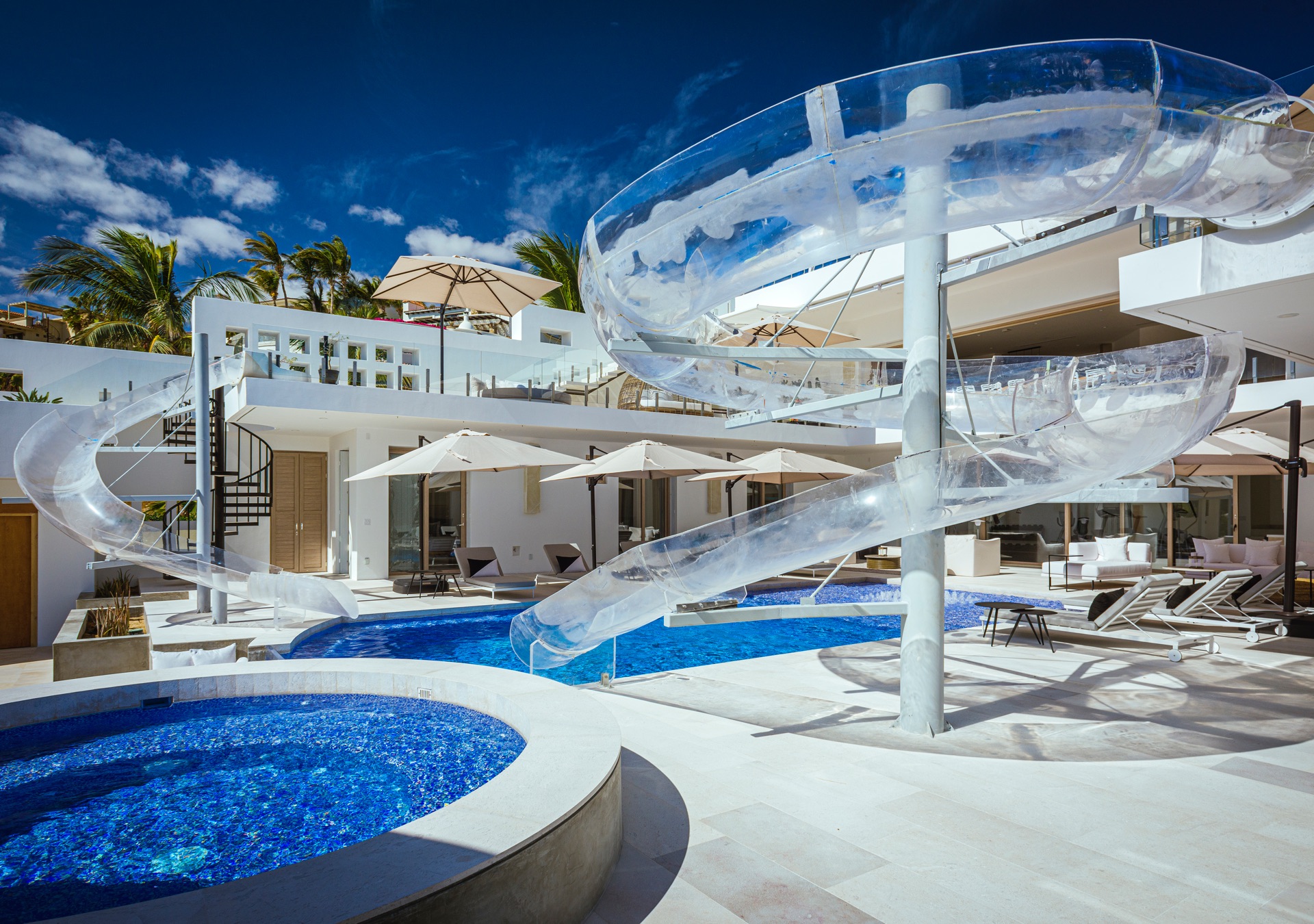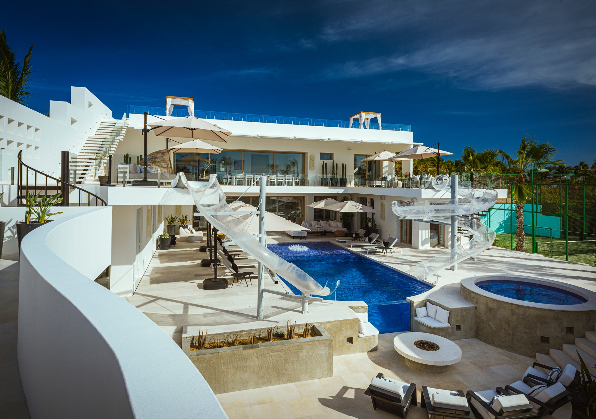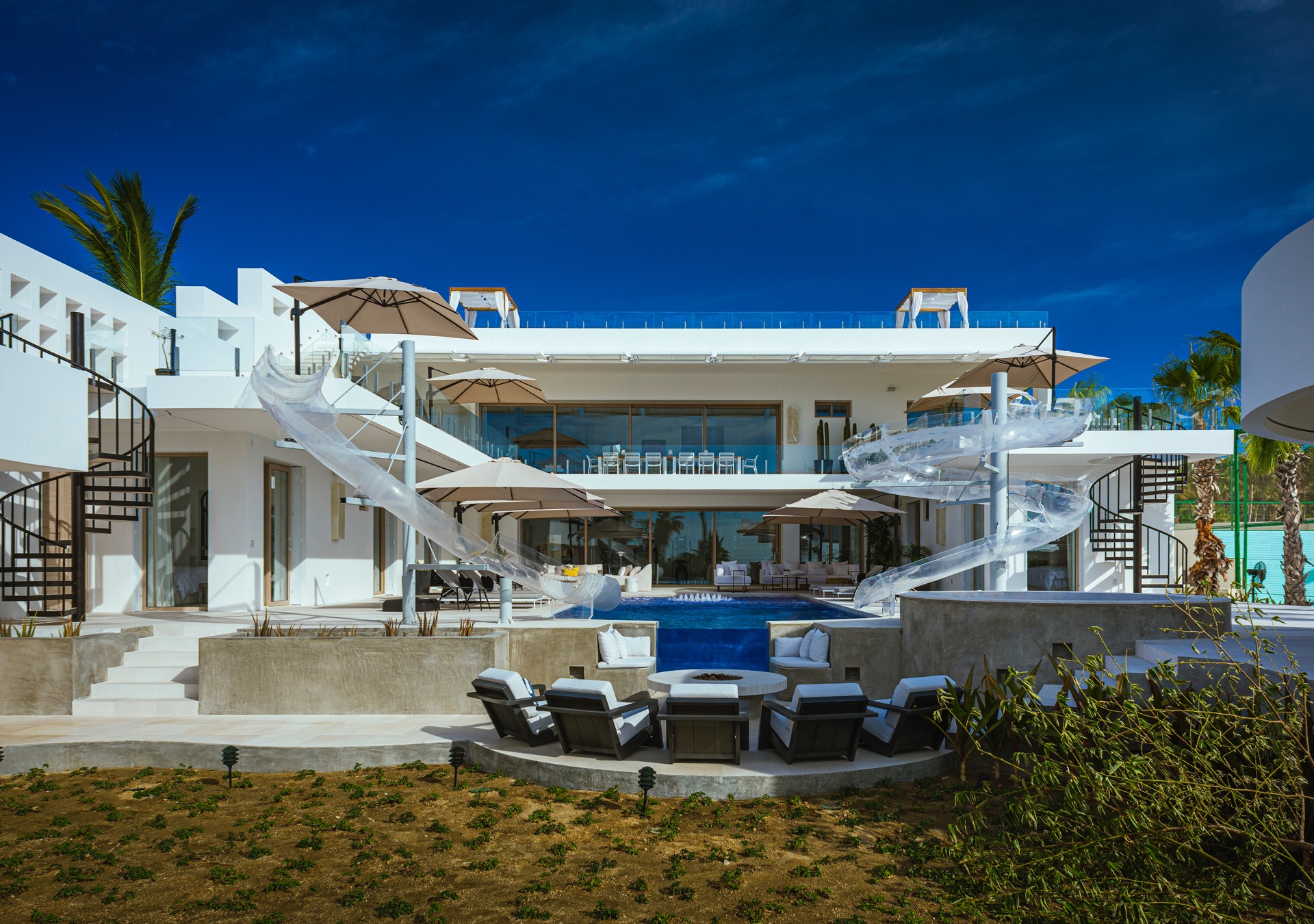 Casa Aqua Blanca is a contemporary home that perfectly combines modern architecture and new construction. Each of the seven bedrooms features comfortable beds, plush linens, en-suite bathrooms, and beautiful lighting. Guests will enjoy a fully-equipped kitchen with a dining table for 14, an in-home fitness room, and a 180″ Smart TV in the living room, perfect for watching the big game or your favorite shows in the evenings. This villa’s outdoor living area is expansive and accommodating, offering multiple levels of lounging areas. The large pool can be accessed from the rooftop firepit and lounge area via one of two clear waterslides cascading down to the lower level. Additionally, guests will love the jacuzzi, gas BBQ, outdoor bar and entertainment area, and its easy beach access.