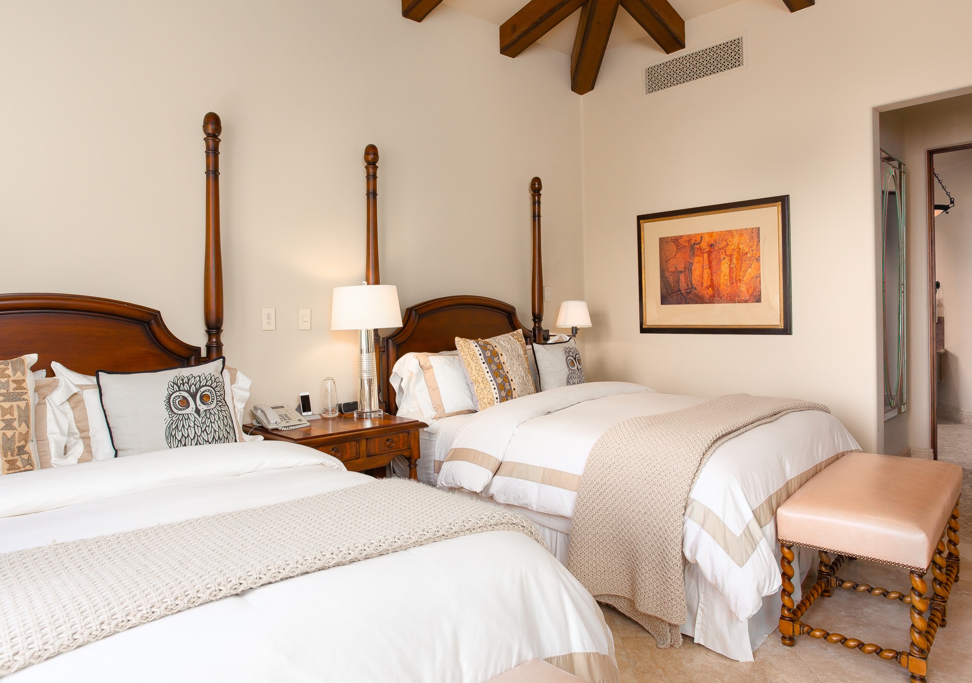 Bedroom 6 offers two twin beds that can be converted to a king bed upon request. The room includes an en-suite bathroom, toilet, shower, and in-room safe. It is located on the lower level and has direct access to the pool.