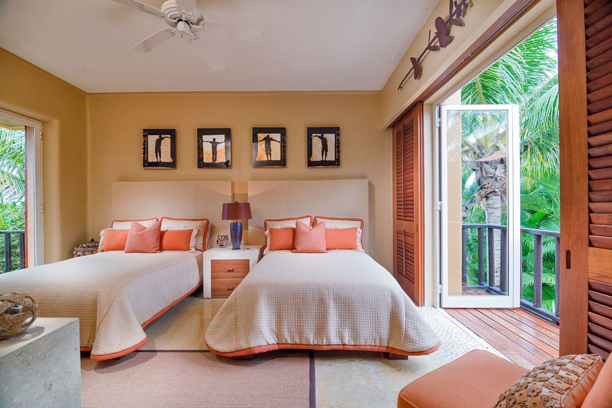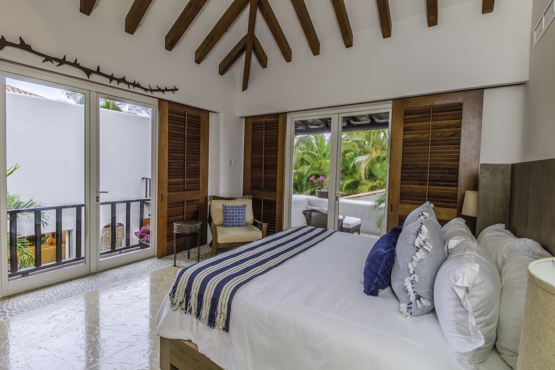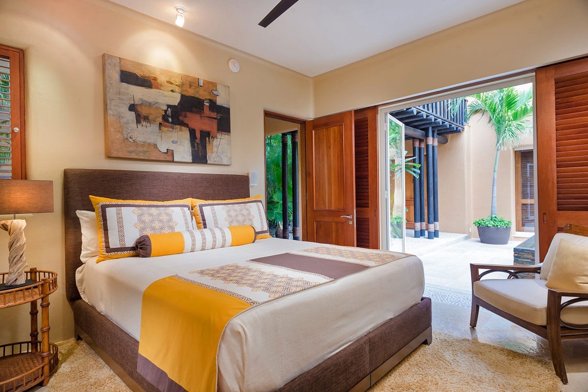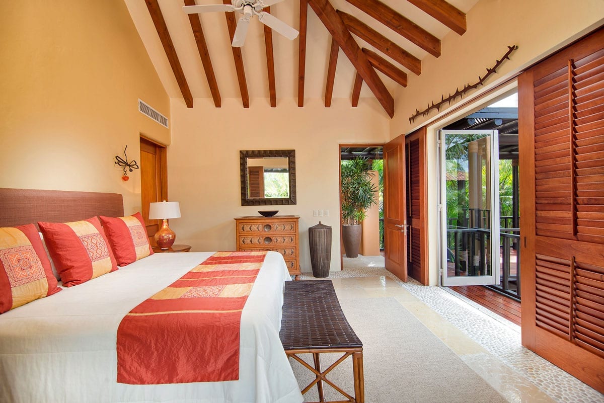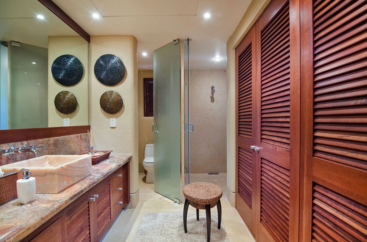 From the grandeur of the main bedroom, guests can effortlessly transition onto an outdoor terrace, an ideal vantage point for Punta Mita’s mesmerizing sunsets. Wandering the upper-level marble pathways, you’ll find two other plush guest suites. Meanwhile, tucked away on the lower level is a fourth charming bedroom. While most rooms proudly feature king-sized beds, the fourth caters to guests with two spacious queen beds.