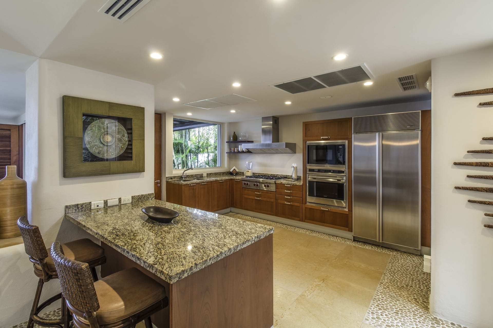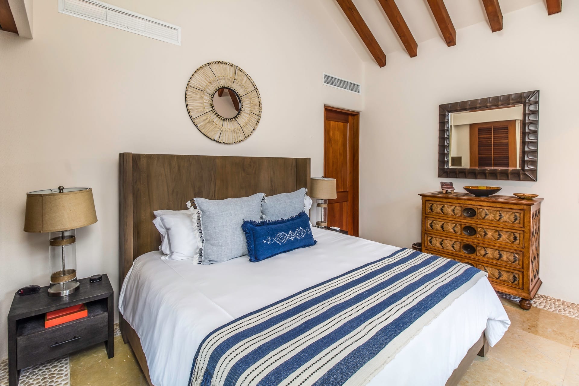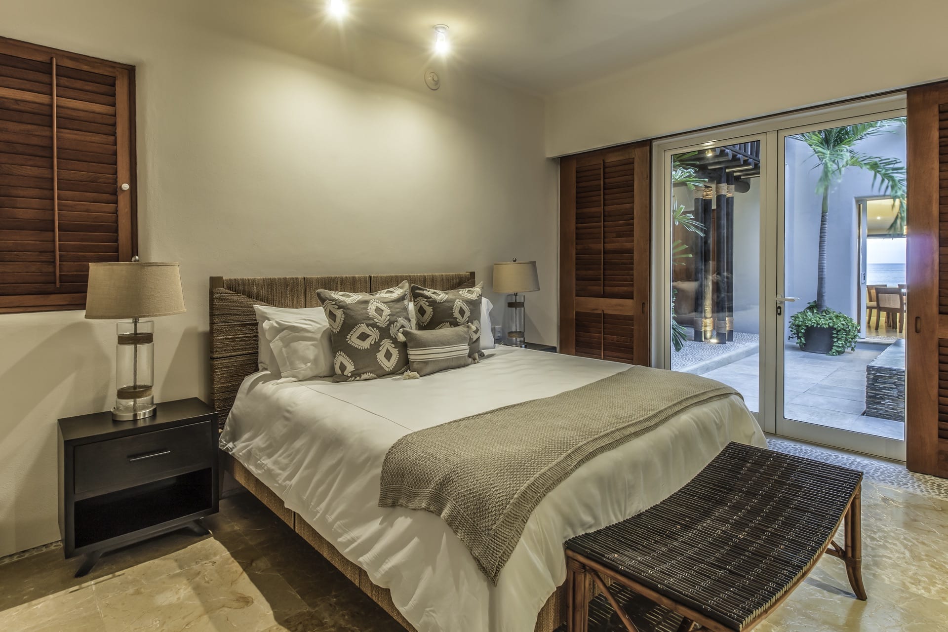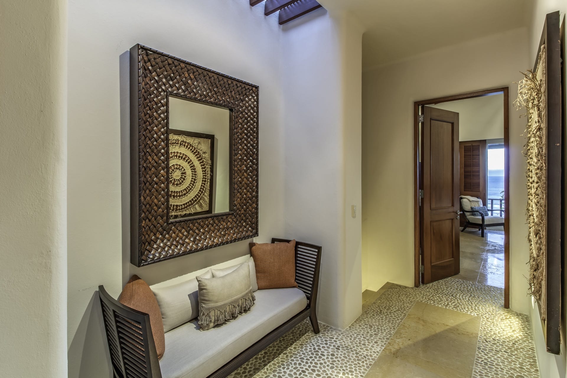 From the grandeur of the main bedroom, guests can effortlessly transition onto an outdoor terrace, an ideal vantage point for Punta Mita’s mesmerizing sunsets. Wandering the upper-level marble pathways, you’ll find two other plush guest suites. Meanwhile, tucked away on the lower level is a fourth charming bedroom. While most rooms proudly feature king-sized beds, the fourth caters to guests with two spacious queen beds.