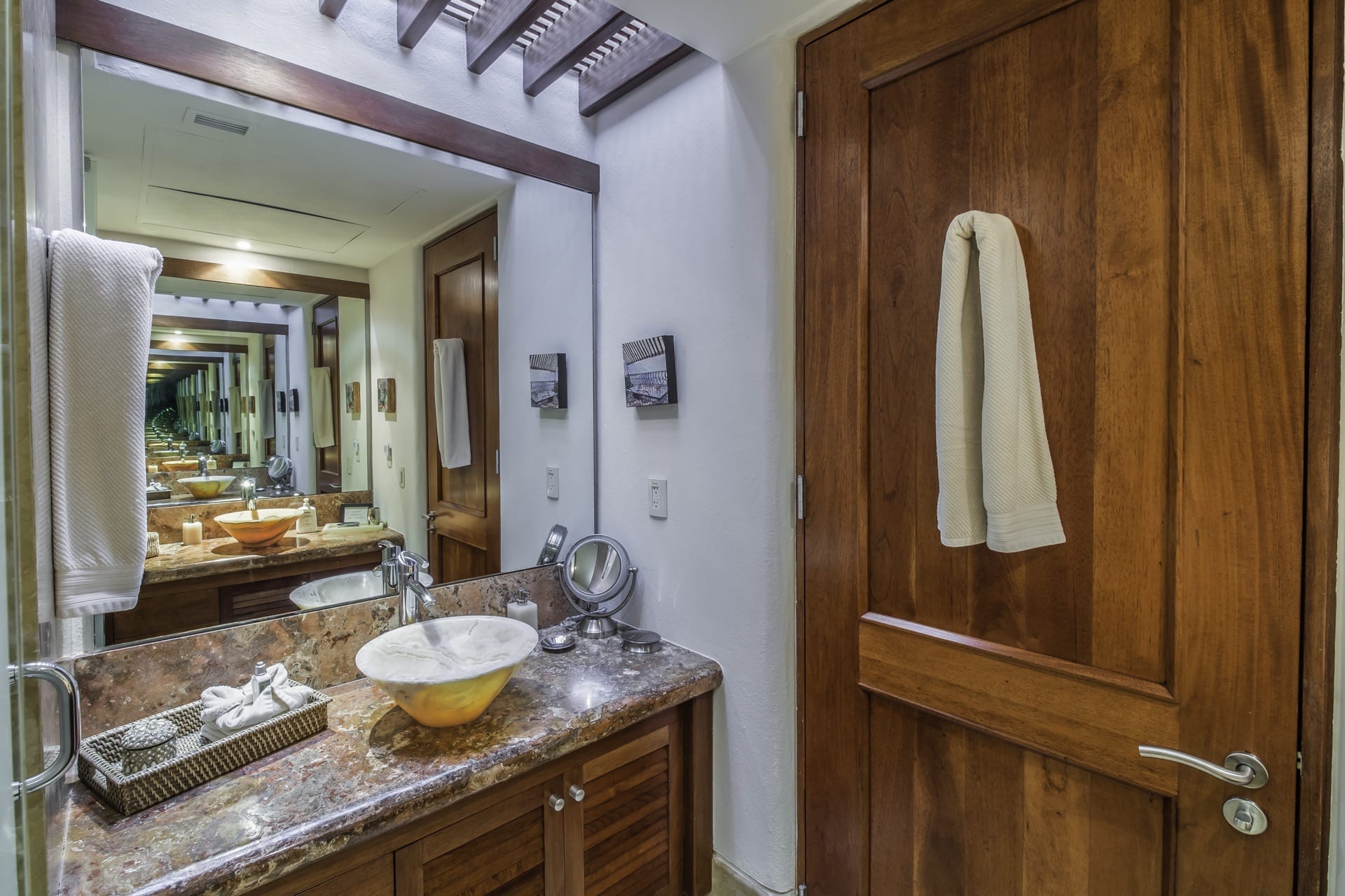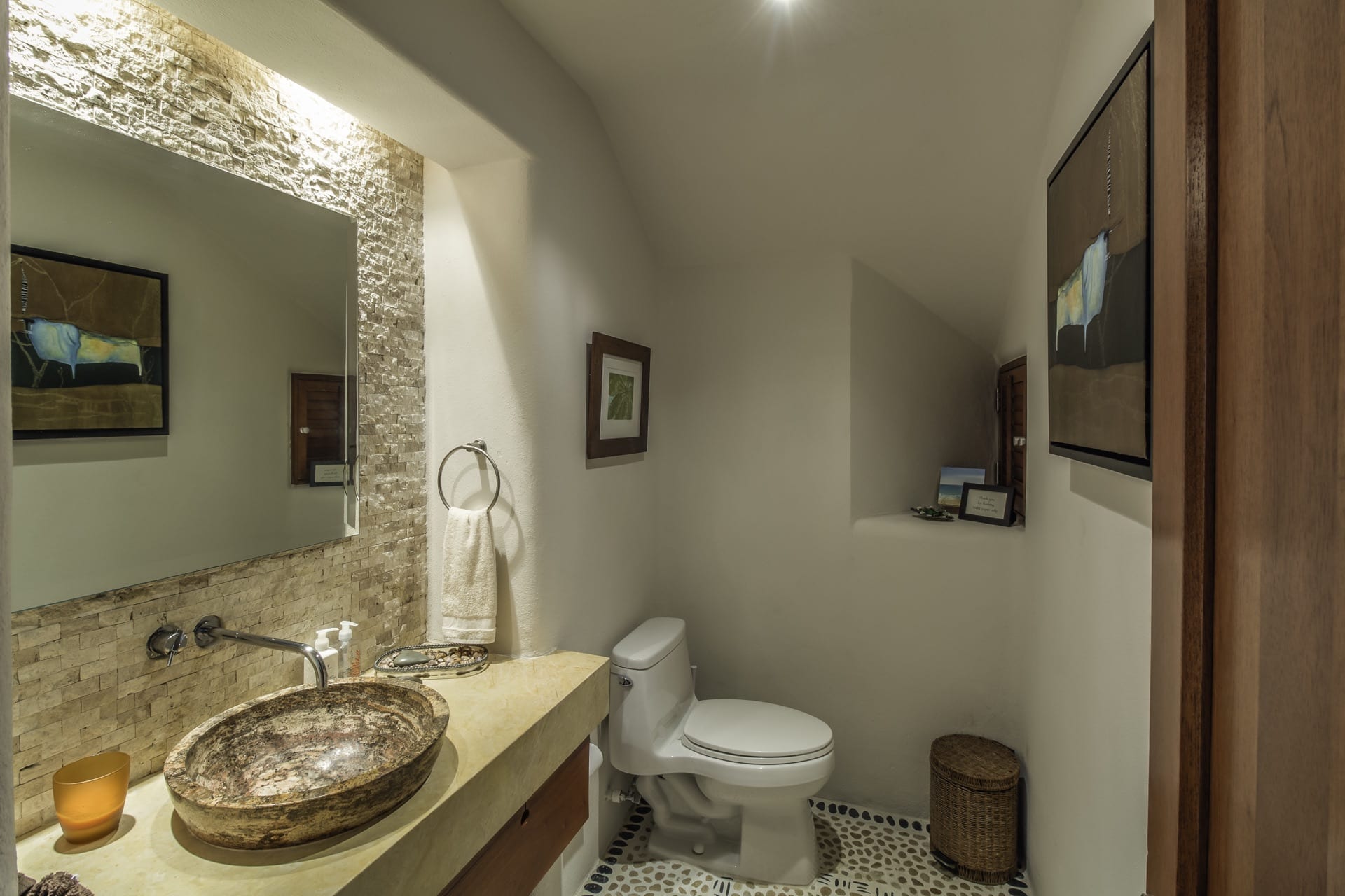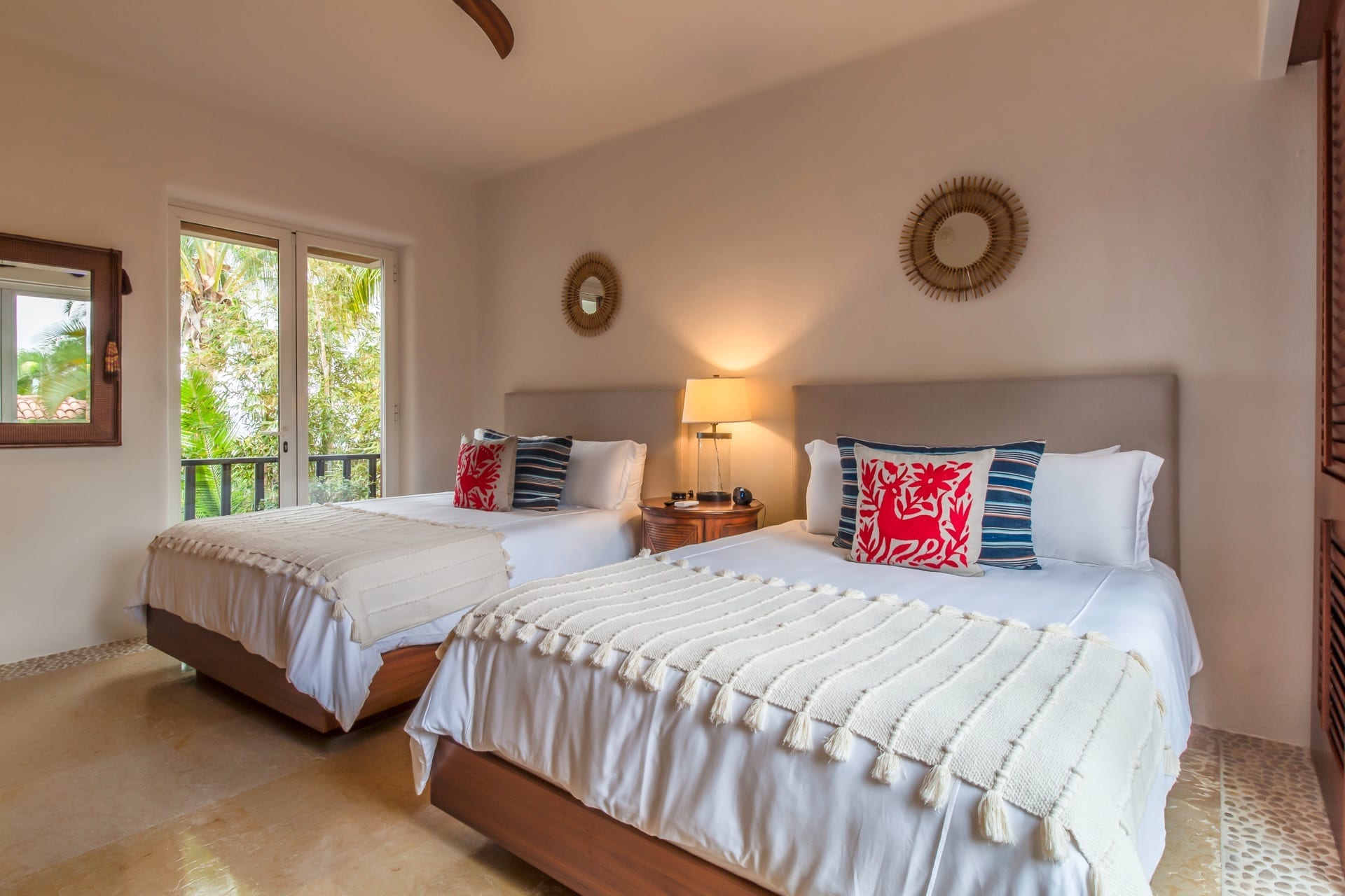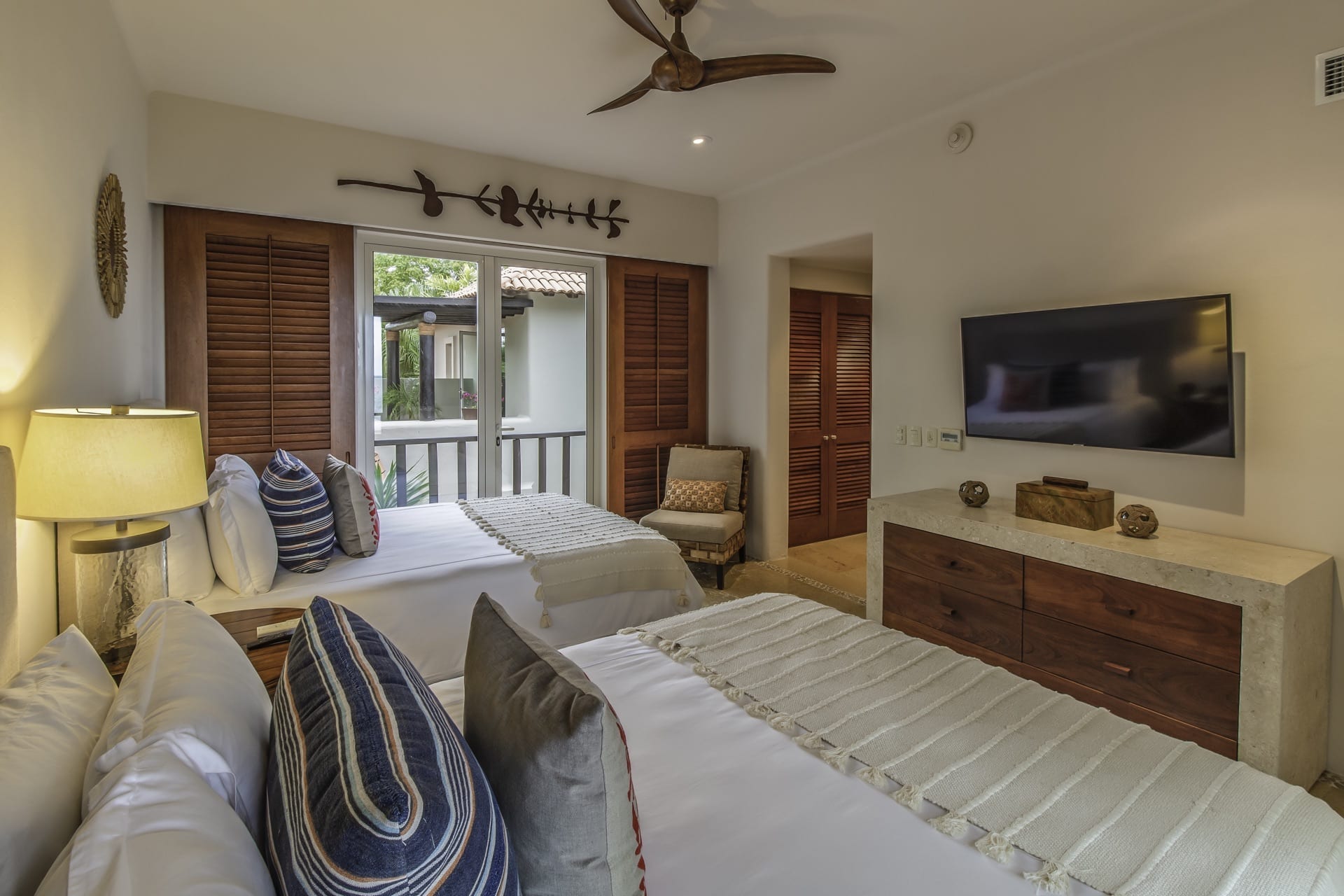 From the grandeur of the main bedroom, guests can effortlessly transition onto an outdoor terrace, an ideal vantage point for Punta Mita’s mesmerizing sunsets. Wandering the upper-level marble pathways, you’ll find two other plush guest suites. Meanwhile, tucked away on the lower level is a fourth charming bedroom. While most rooms proudly feature king-sized beds, the fourth caters to guests with two spacious queen beds.
