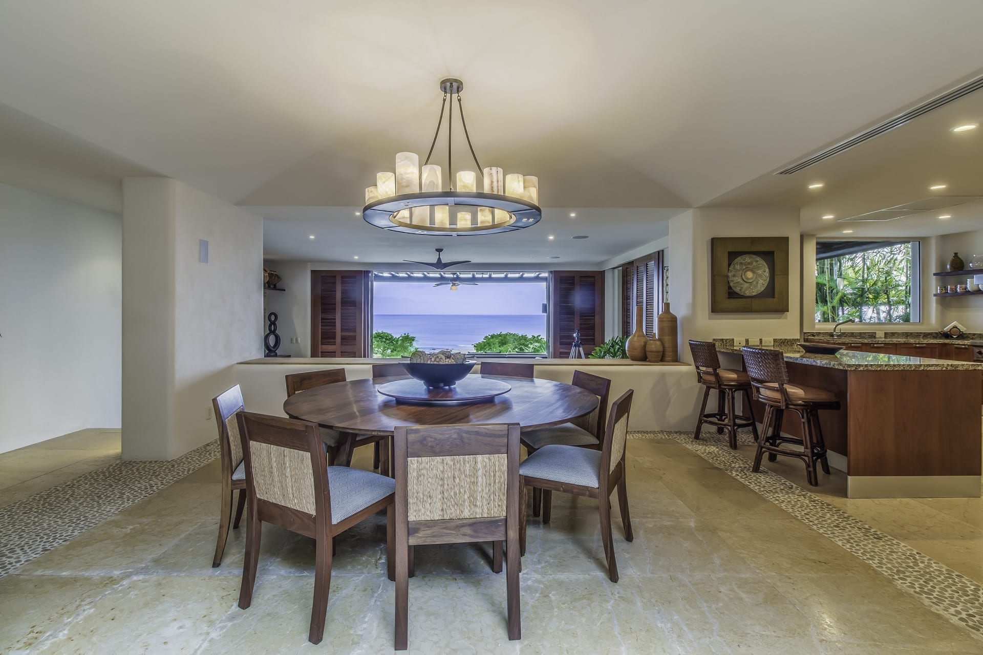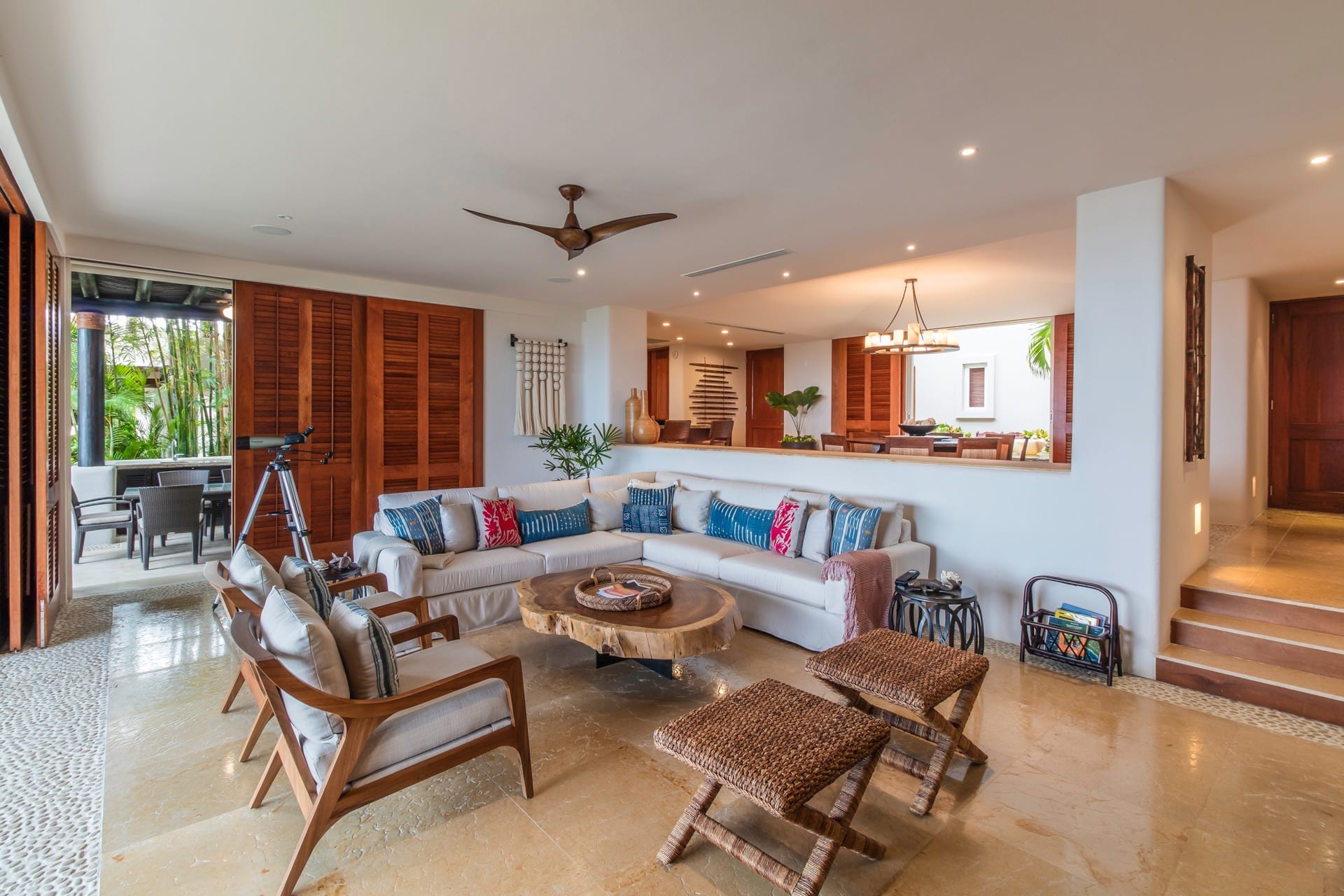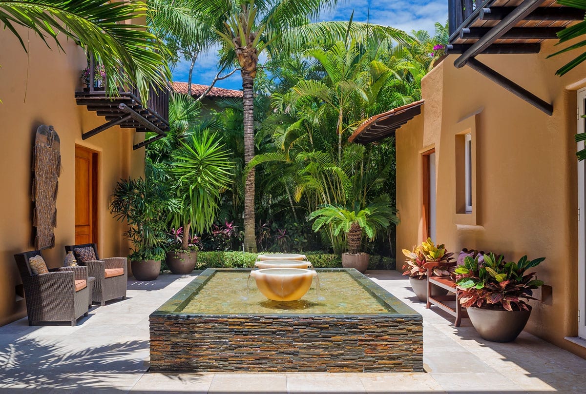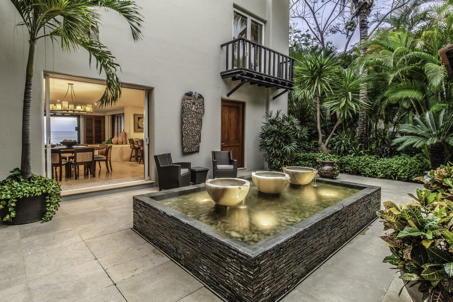 The villa’s living room is centrally located and gazes at the ocean and infinity pool. Adjacent to it, the dining area effortlessly extends into a Zen-inspired courtyard with a tranquil fountain and generous seating.