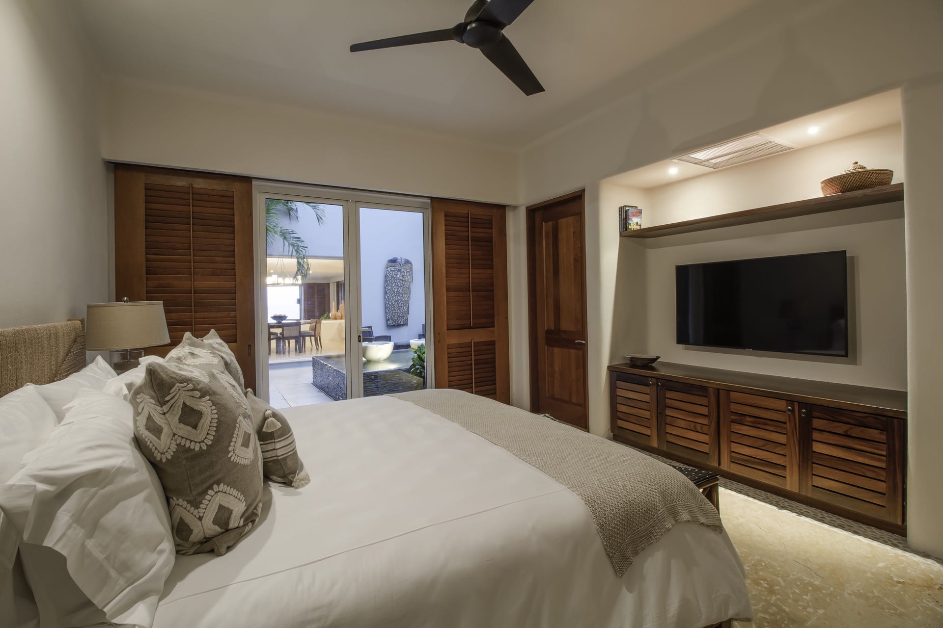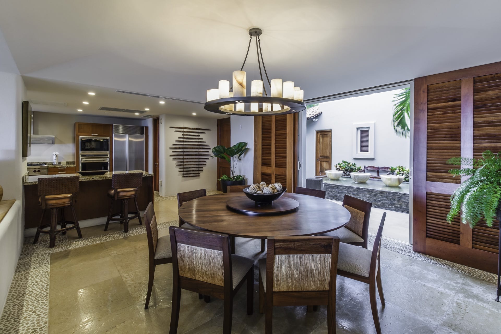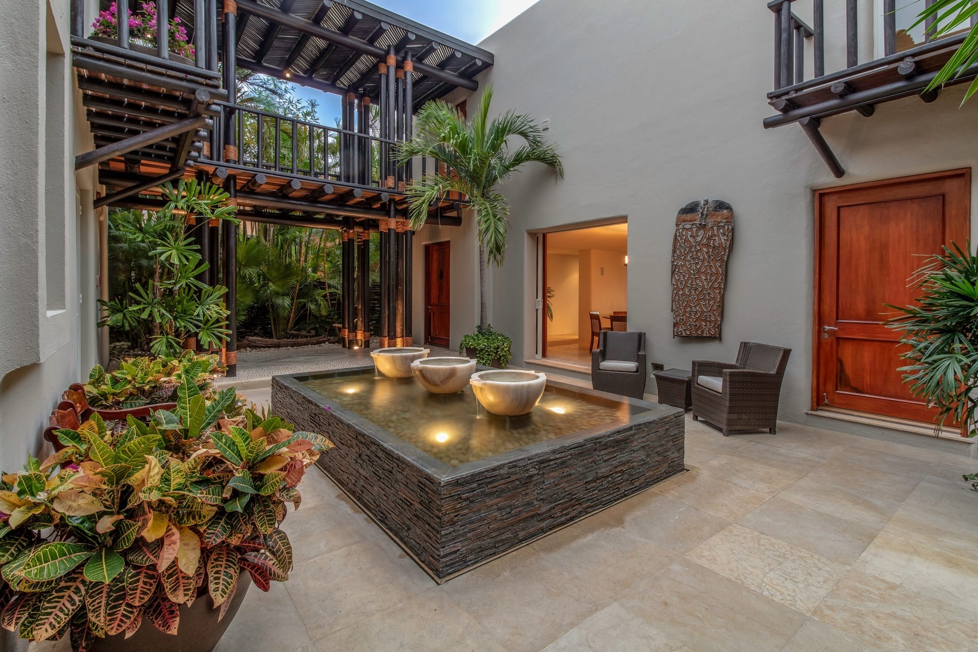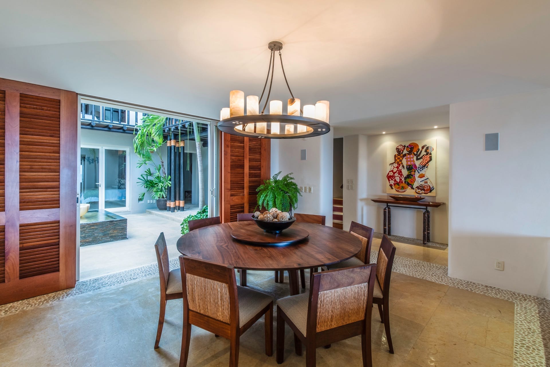 The villa’s living room is centrally located and gazes at the ocean and infinity pool. Adjacent to it, the dining area effortlessly extends into a Zen-inspired courtyard with a tranquil fountain and generous seating.