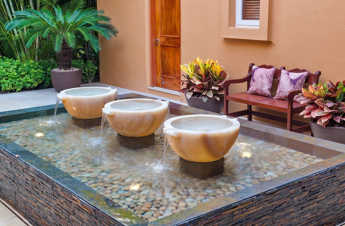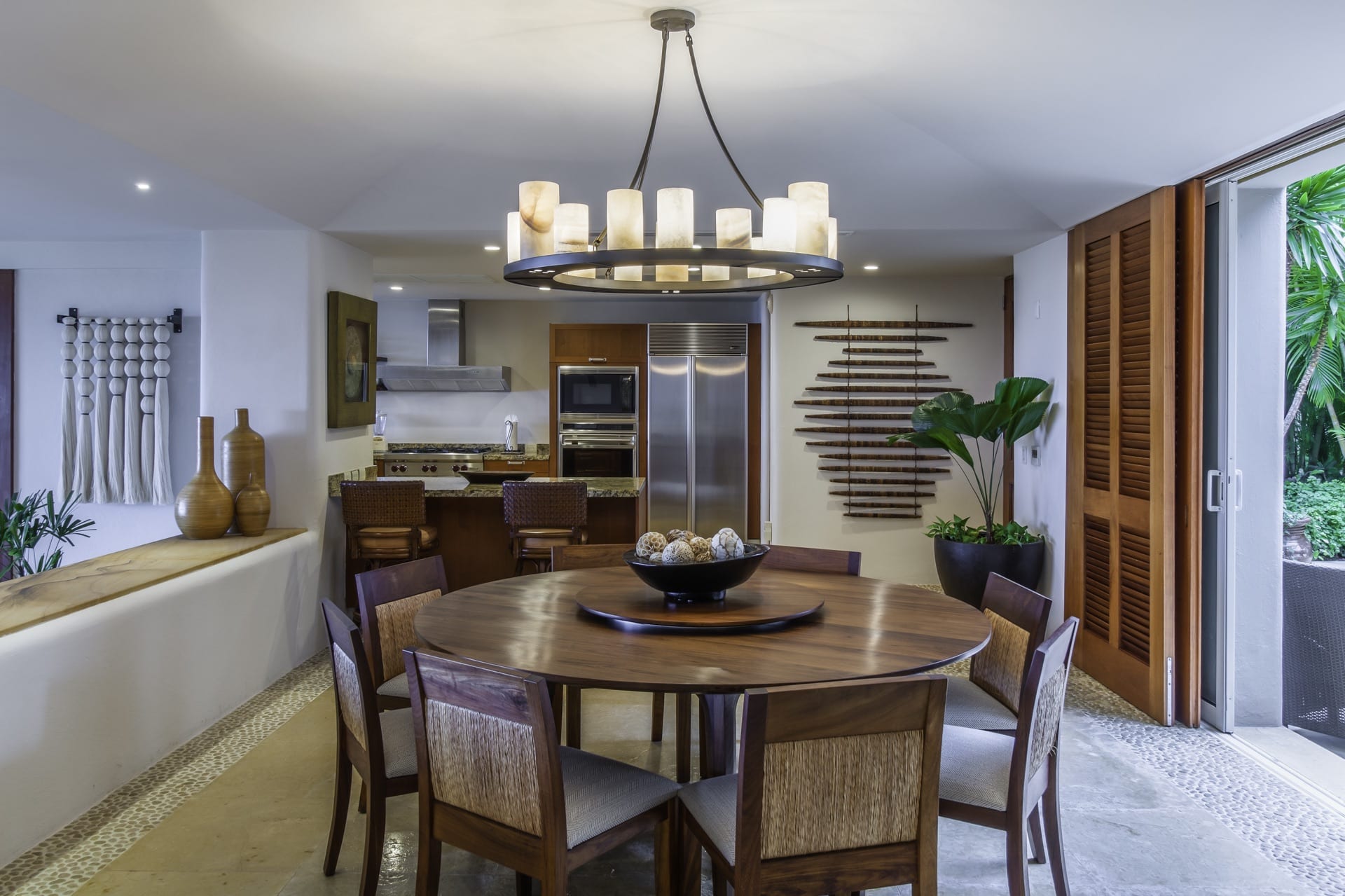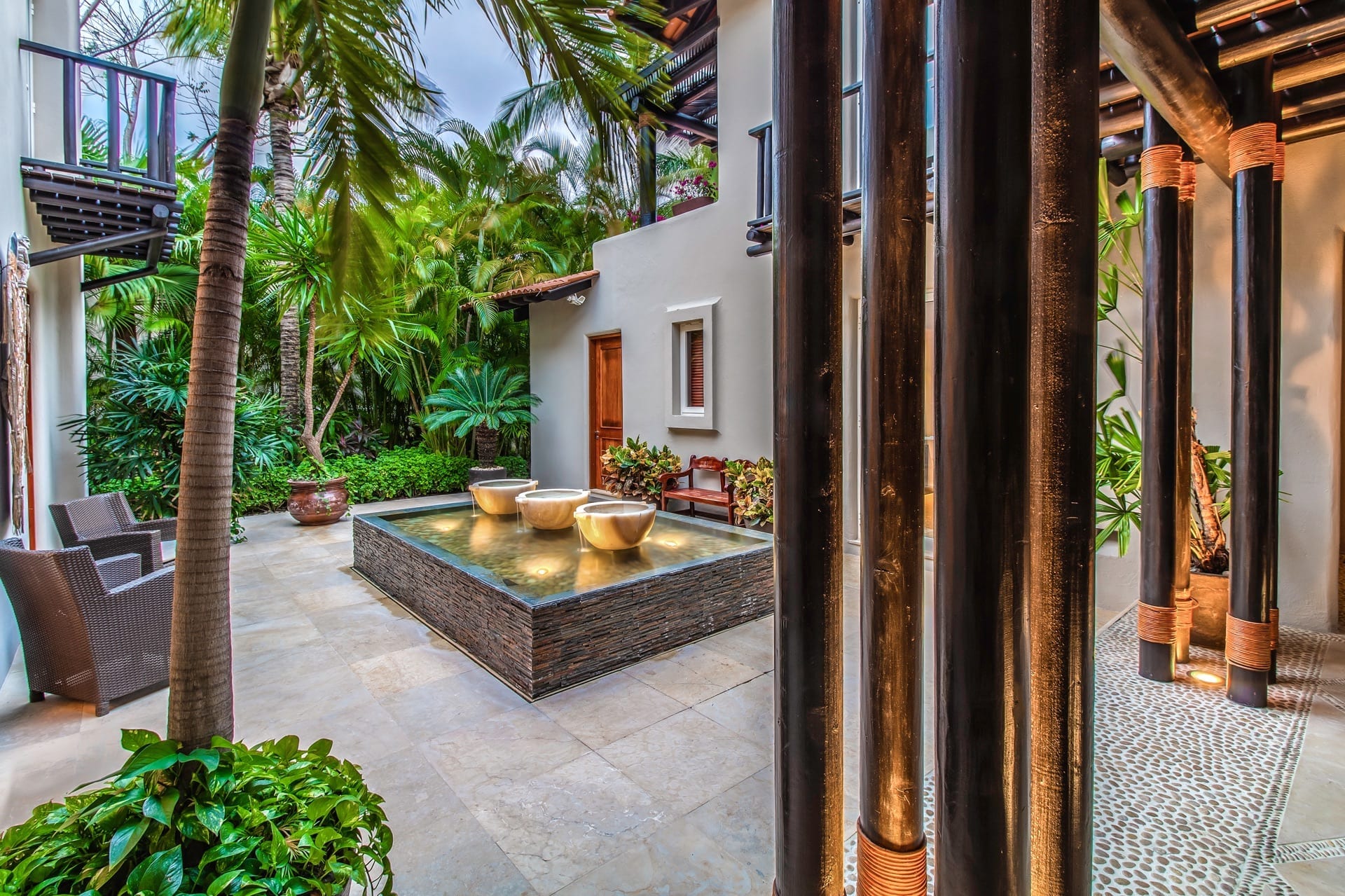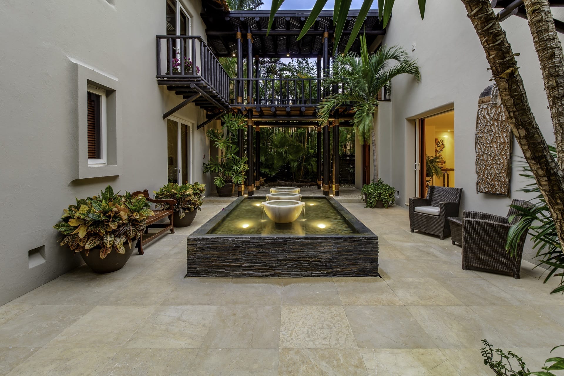The villa’s living room is centrally located and gazes at the ocean and infinity pool. Adjacent to it, the dining area effortlessly extends into a Zen-inspired courtyard with a tranquil fountain and generous seating.