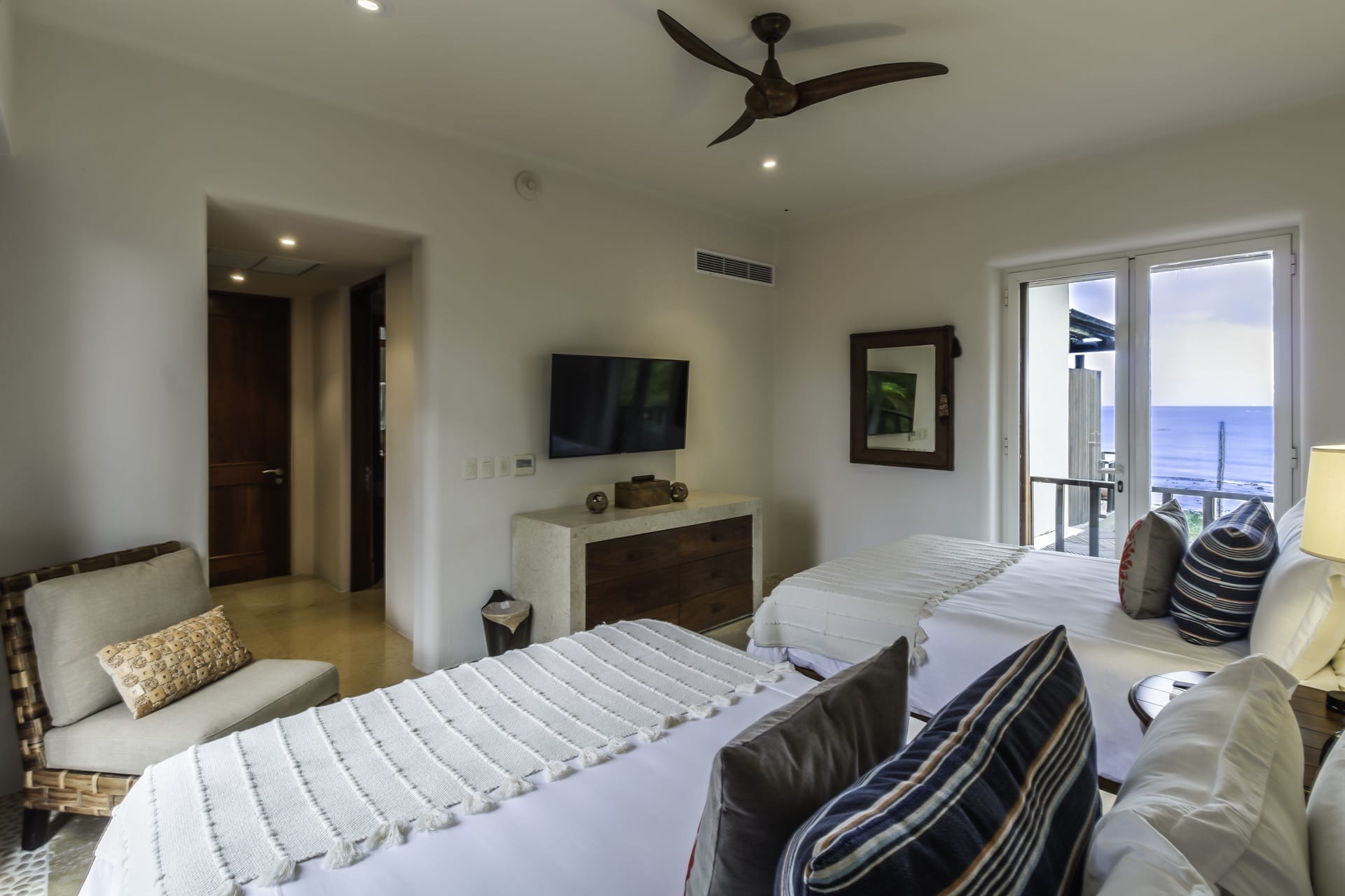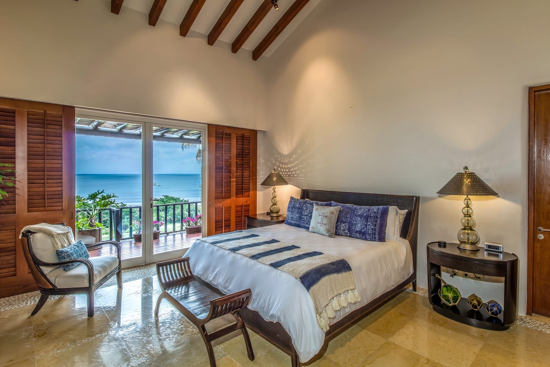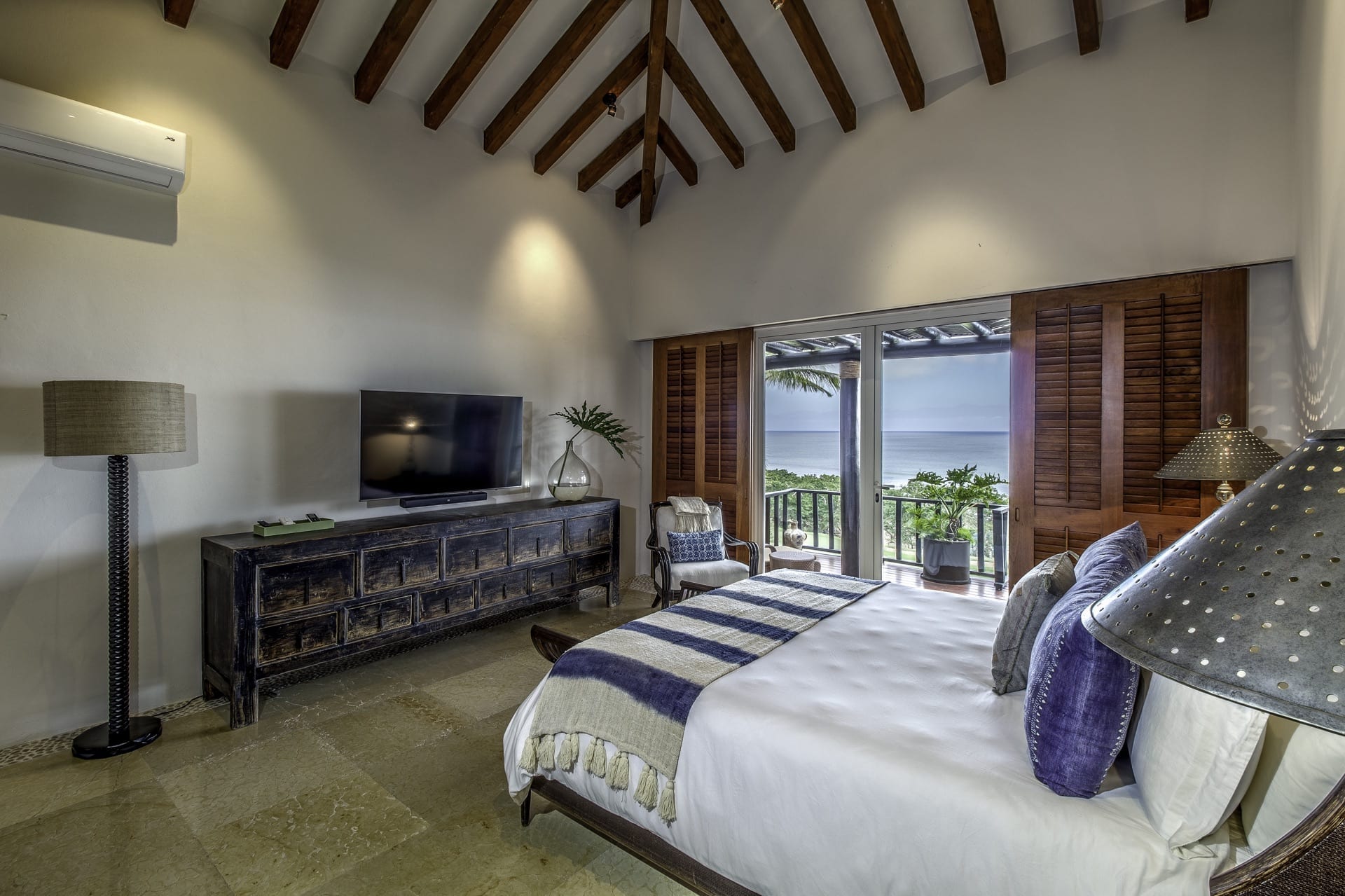 The main bedroom is a master suite oasis with a king bed, an en-suite bathroom with dual showers, a walk-in closet, a TV, and a sunset-viewing terrace.