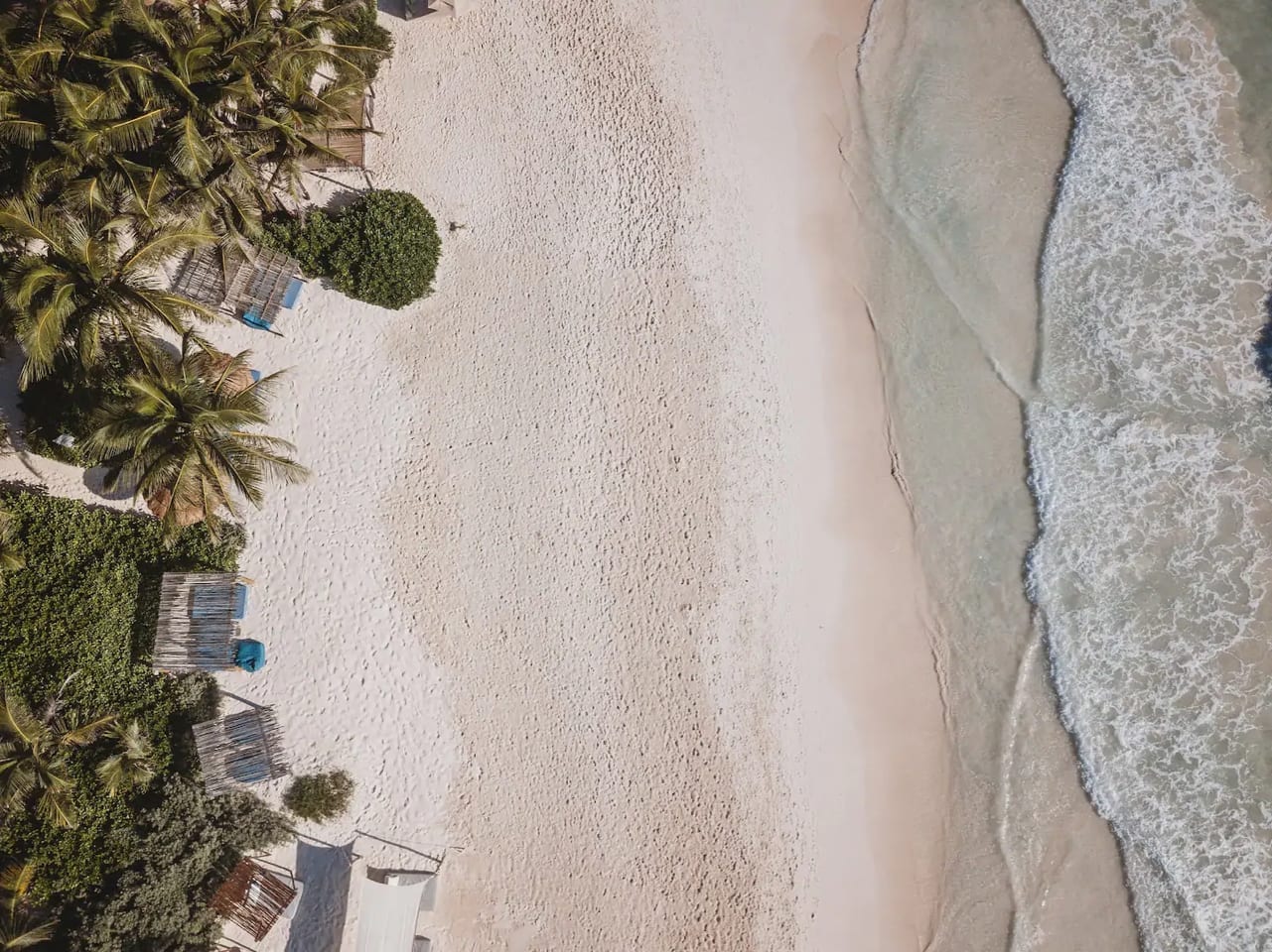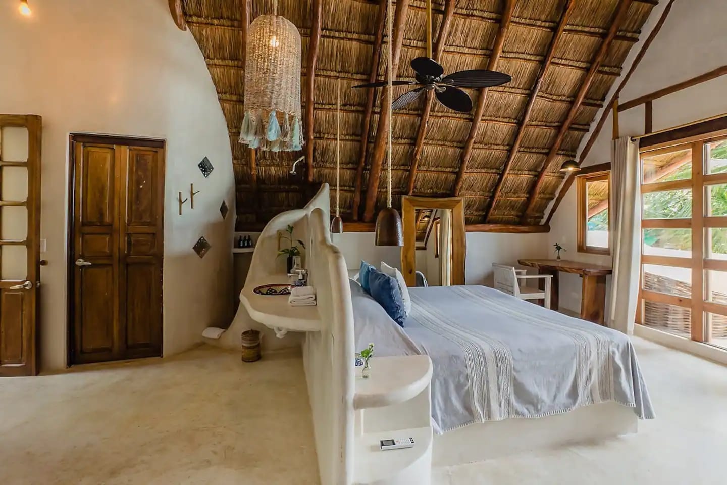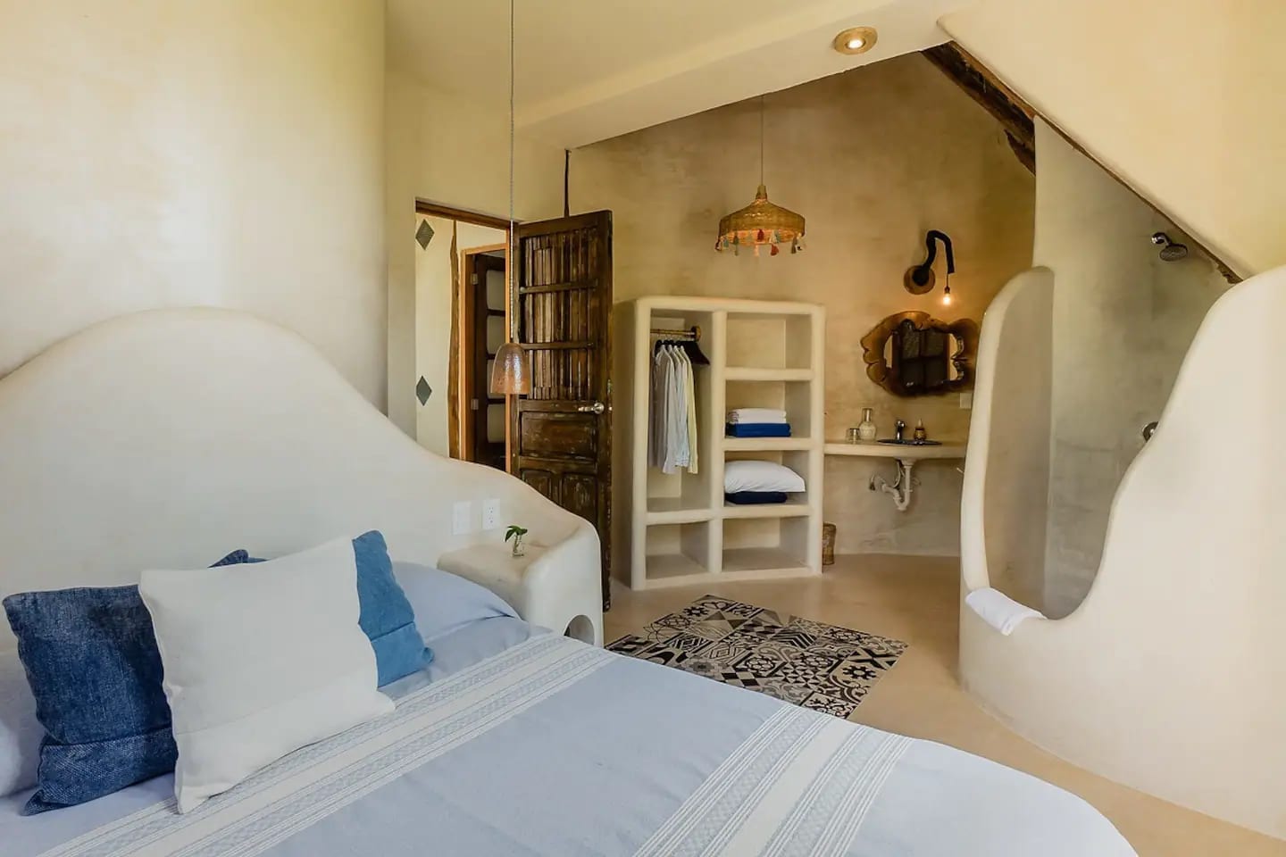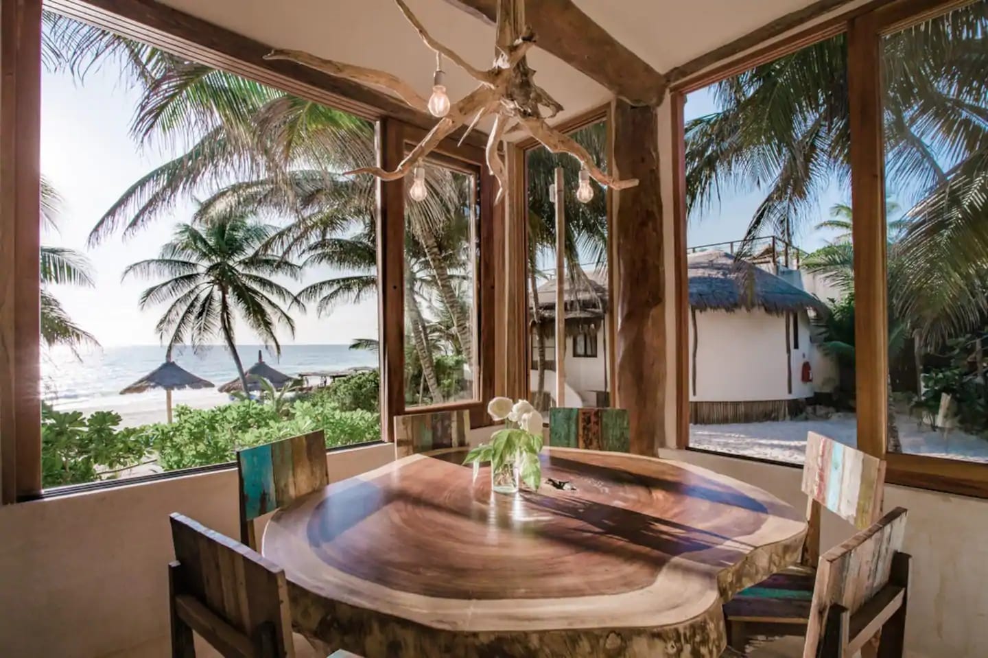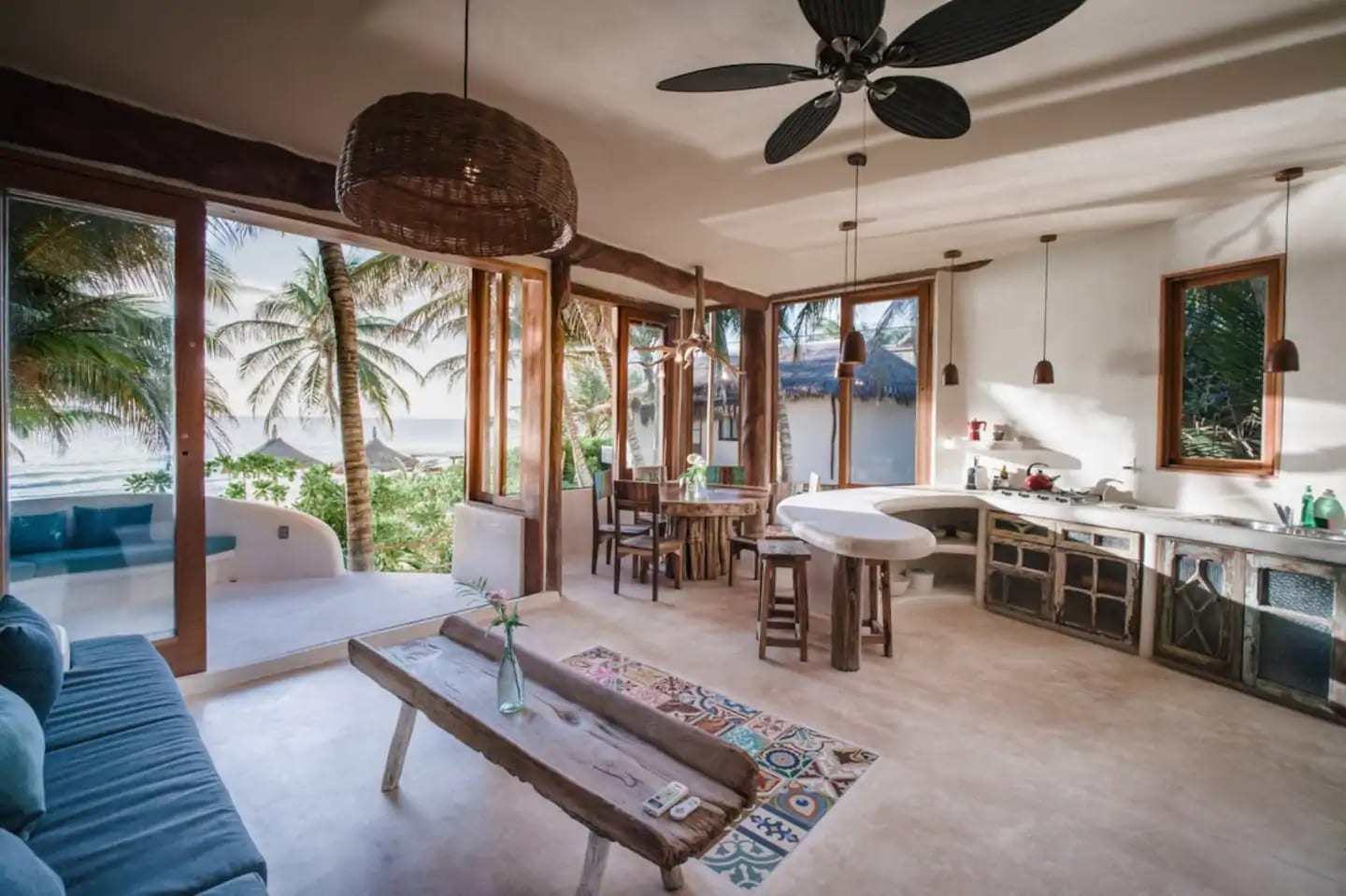 Daily life here unfolds between indoors and out, with large openings that encourage a natural flow toward the veranda and garden. A sitting area with cushions on the veranda, an outdoor shower set amid the greenery, and direct access to the seaside pool and beachfront loungers create a relaxed rhythm from morning to evening. Inside, artistic elements and details contribute to a unique Tulum beach feel, while the house is oriented to capture sea breezes and remain comfortable in warmer weather.