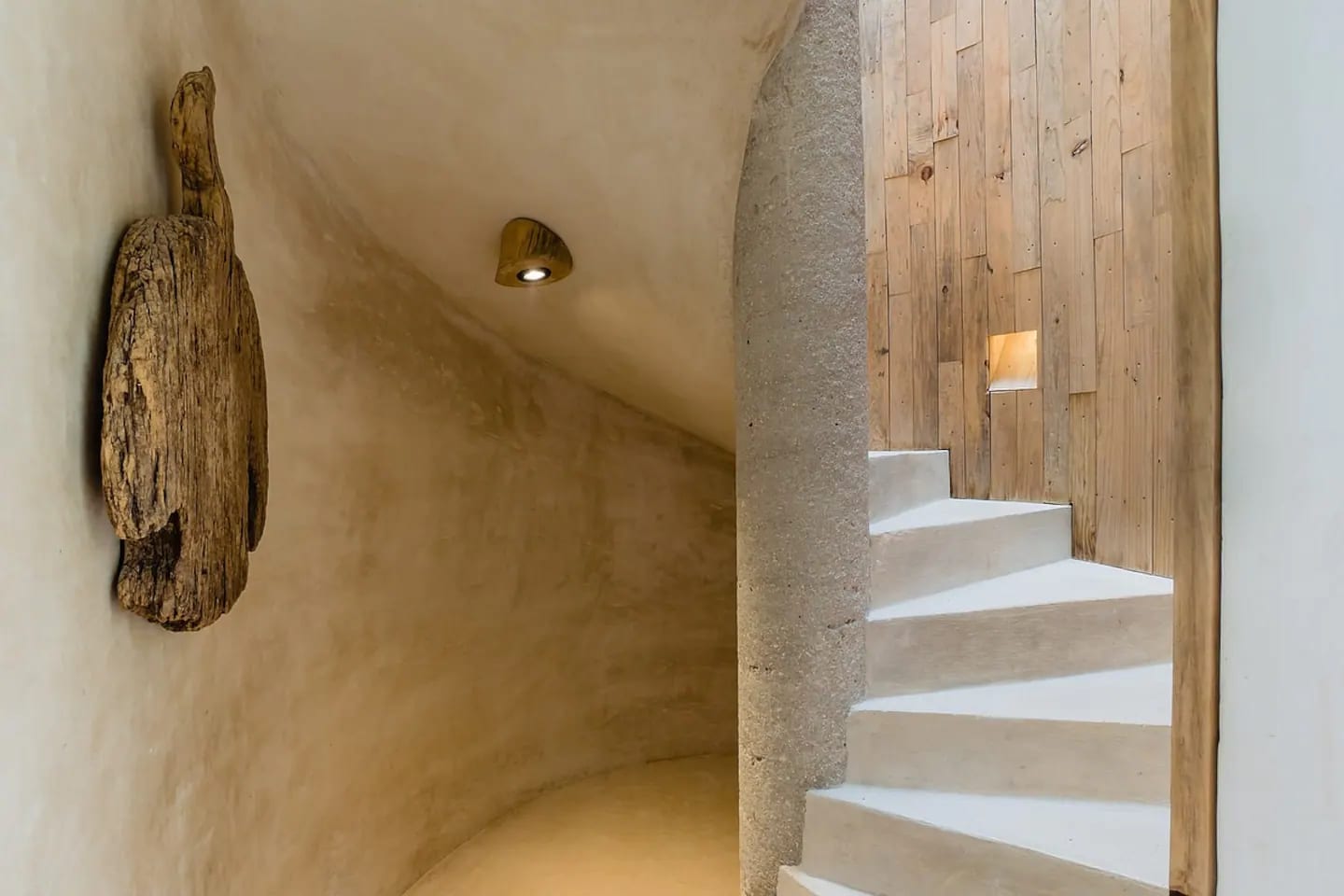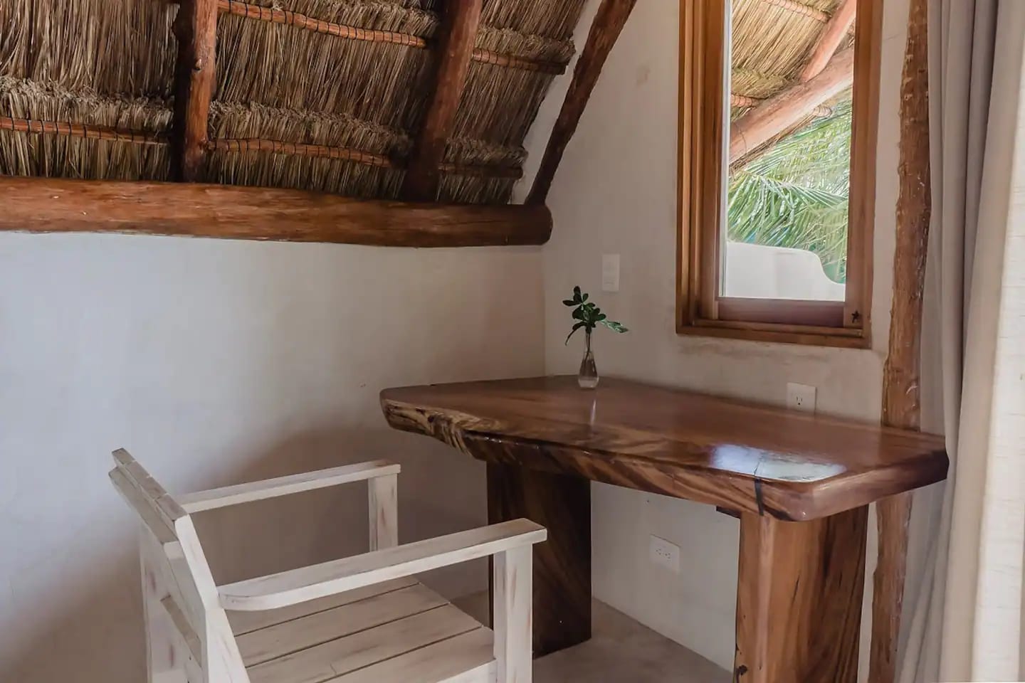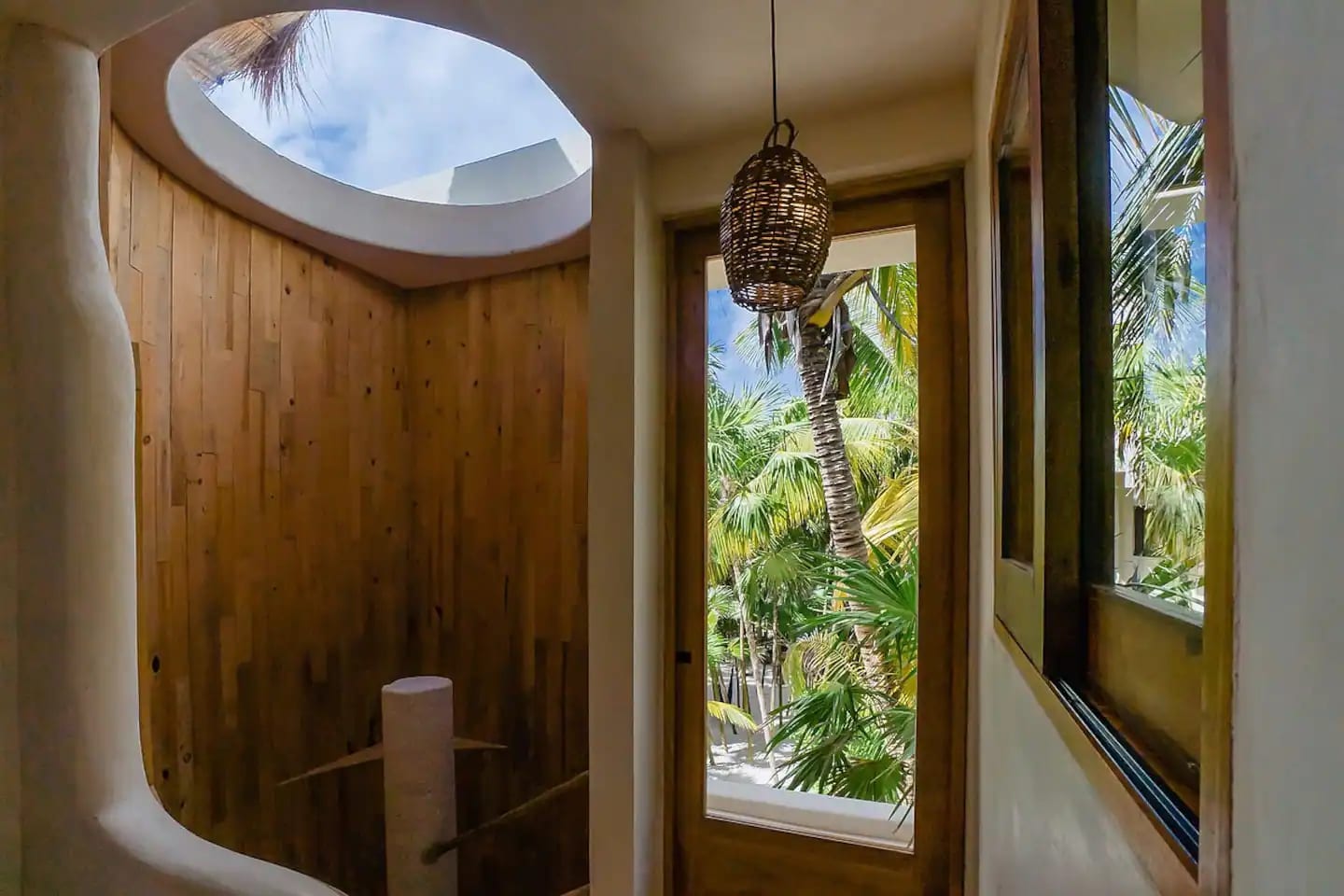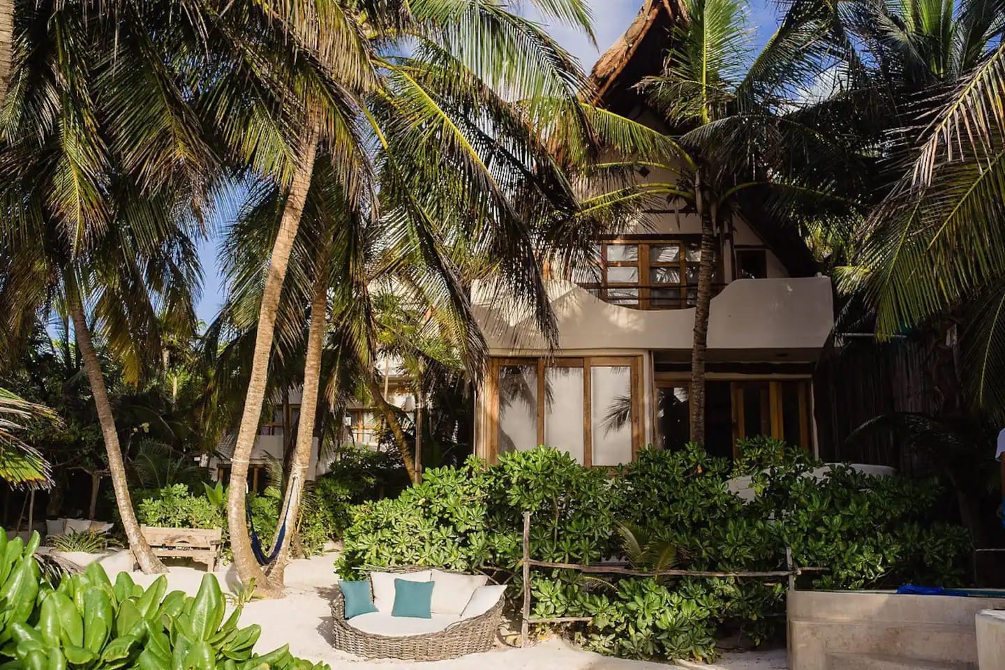 The villa sits on Tulum Beach, with its own stretch of private beachfront reserved for Mahayana property guests. Surrounded by lush greenery, the house feels tucked into its natural setting, with outdoor areas that invite lingering in the shade or by the water. The architecture and finishes are rooted in a distinctive local aesthetic, creating a clear sense of place that reflects its coastal surroundings.