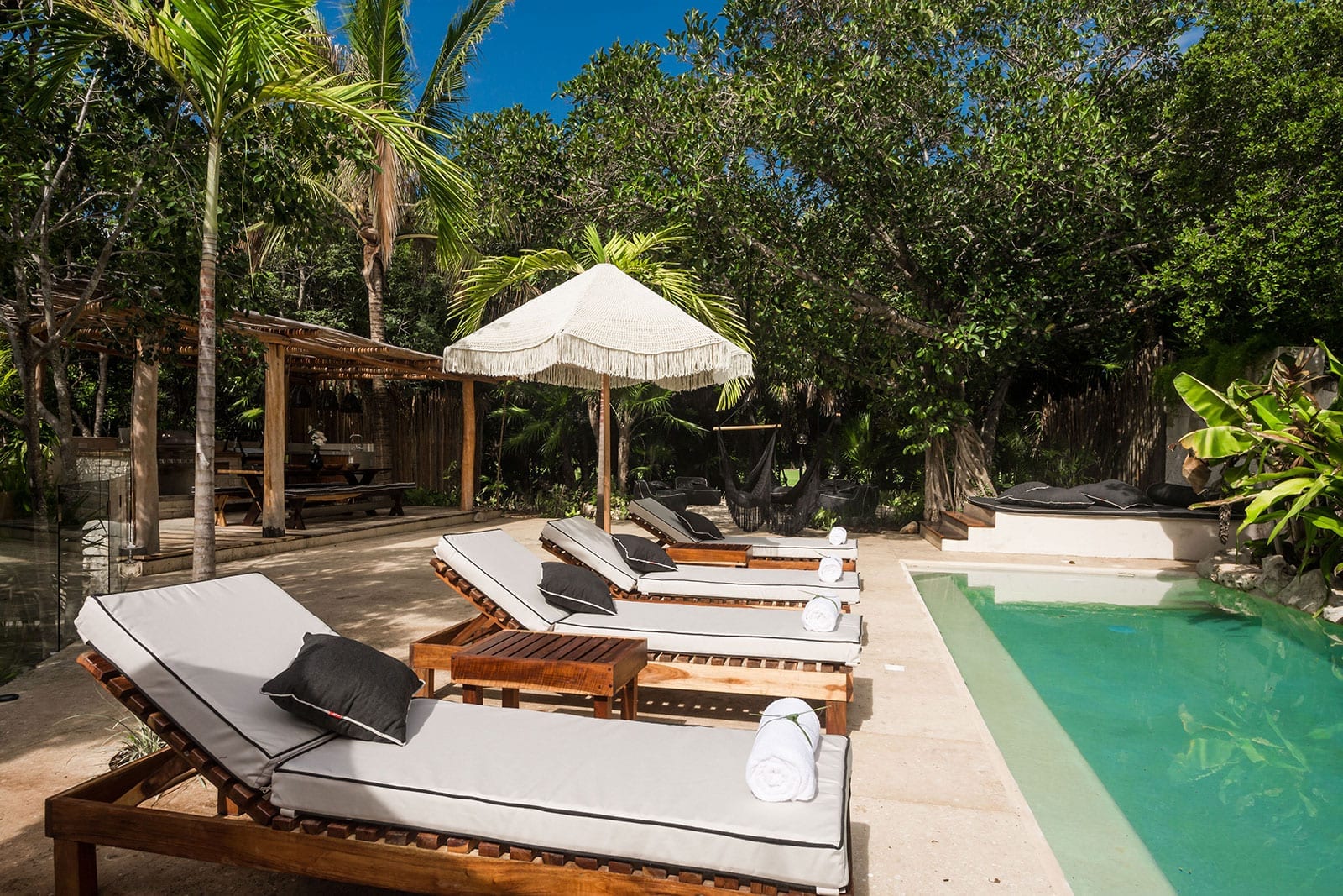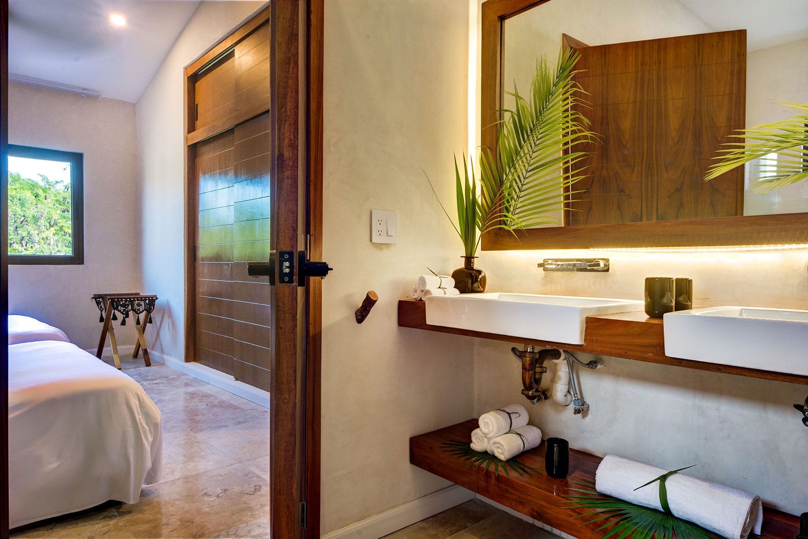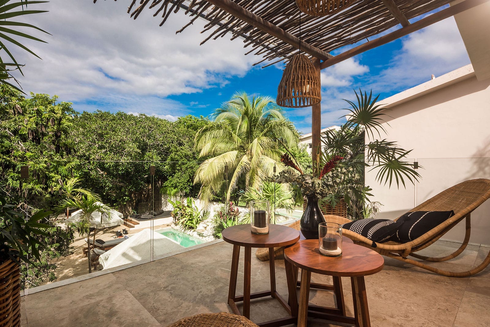 Life at the villa naturally extends outdoors, where the common areas are a focal point of the experience. A breezy rooftop bar and dining area with jacuzzi invites relaxed gatherings, complemented by views of the property’s namesake cenote from the rooftop terrace, creating a distinctive connection to the surrounding Riviera Maya landscape. Two private balconies and a swimming pool framed by native plants offer additional pockets of space for quiet reading, casual conversation, or time in the water.