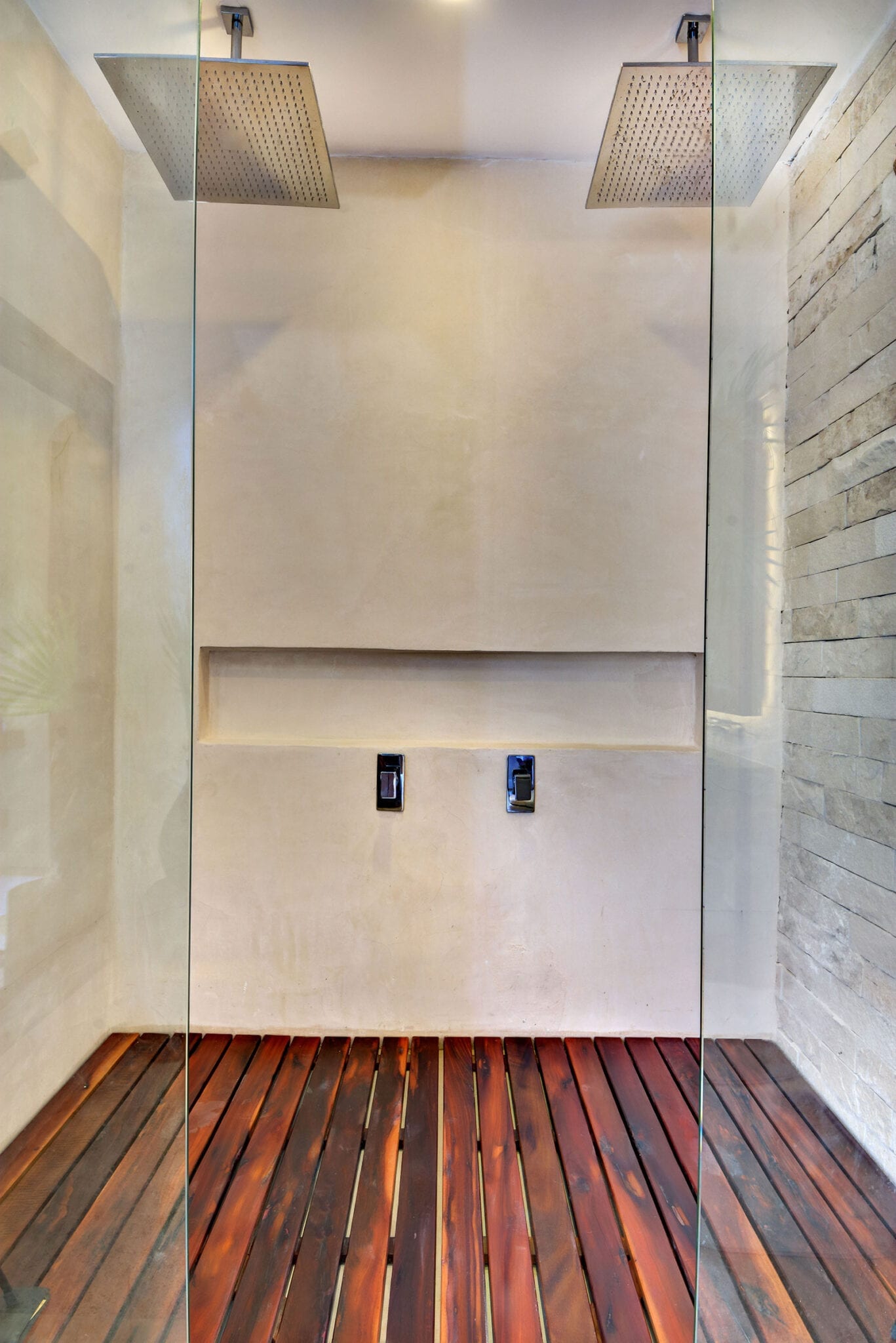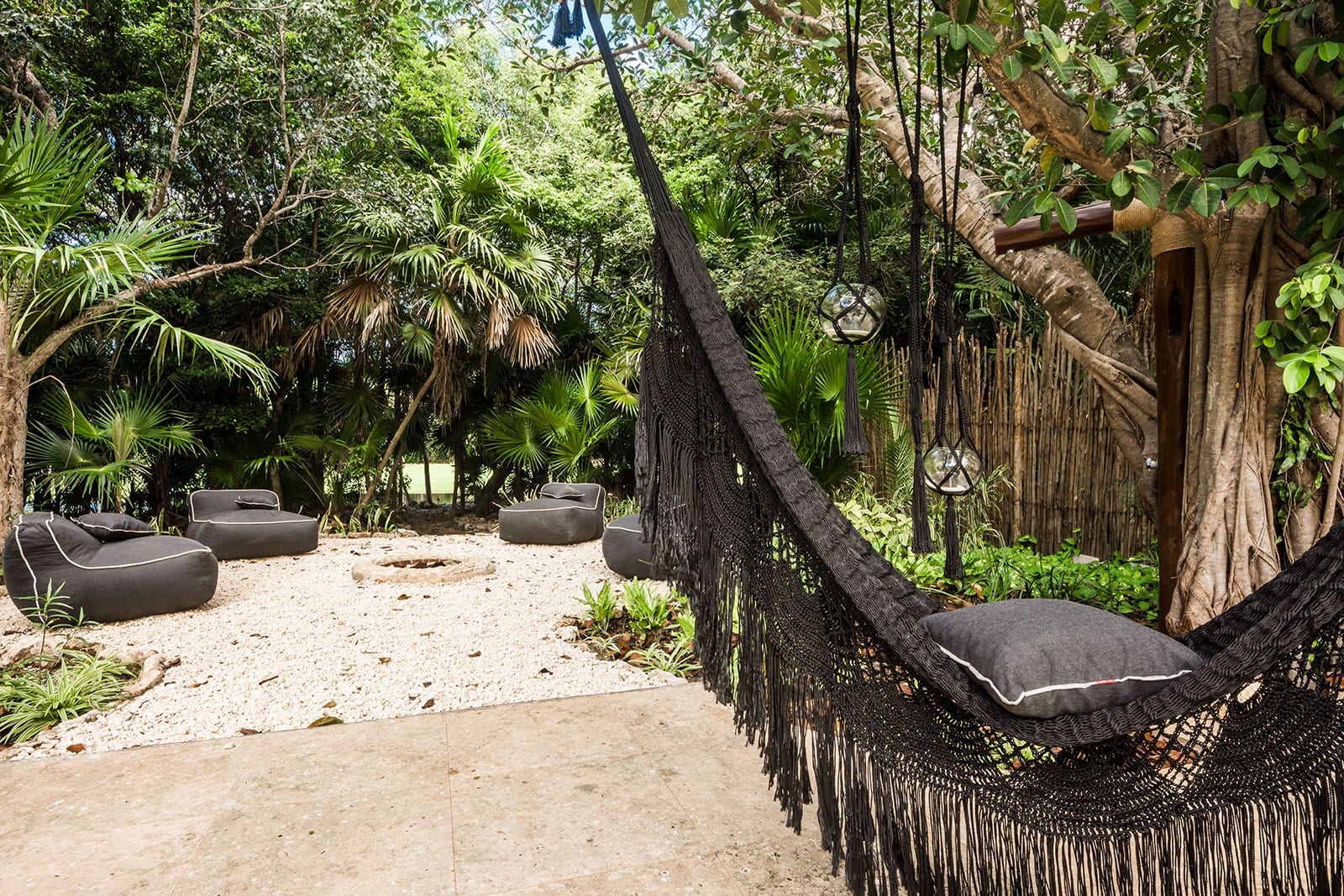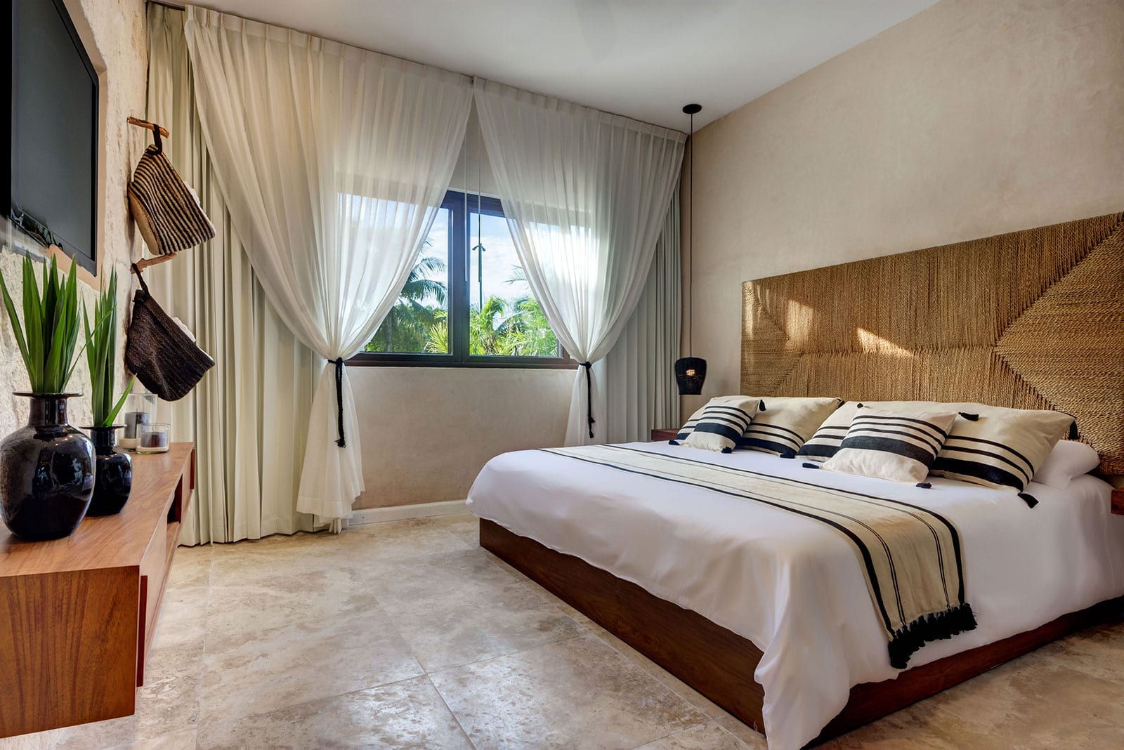Life at the villa naturally extends outdoors, where the common areas are a focal point of the experience. A breezy rooftop bar and dining area with jacuzzi invites relaxed gatherings, complemented by views of the property’s namesake cenote from the rooftop terrace, creating a distinctive connection to the surrounding Riviera Maya landscape. Two private balconies and a swimming pool framed by native plants offer additional pockets of space for quiet reading, casual conversation, or time in the water.
