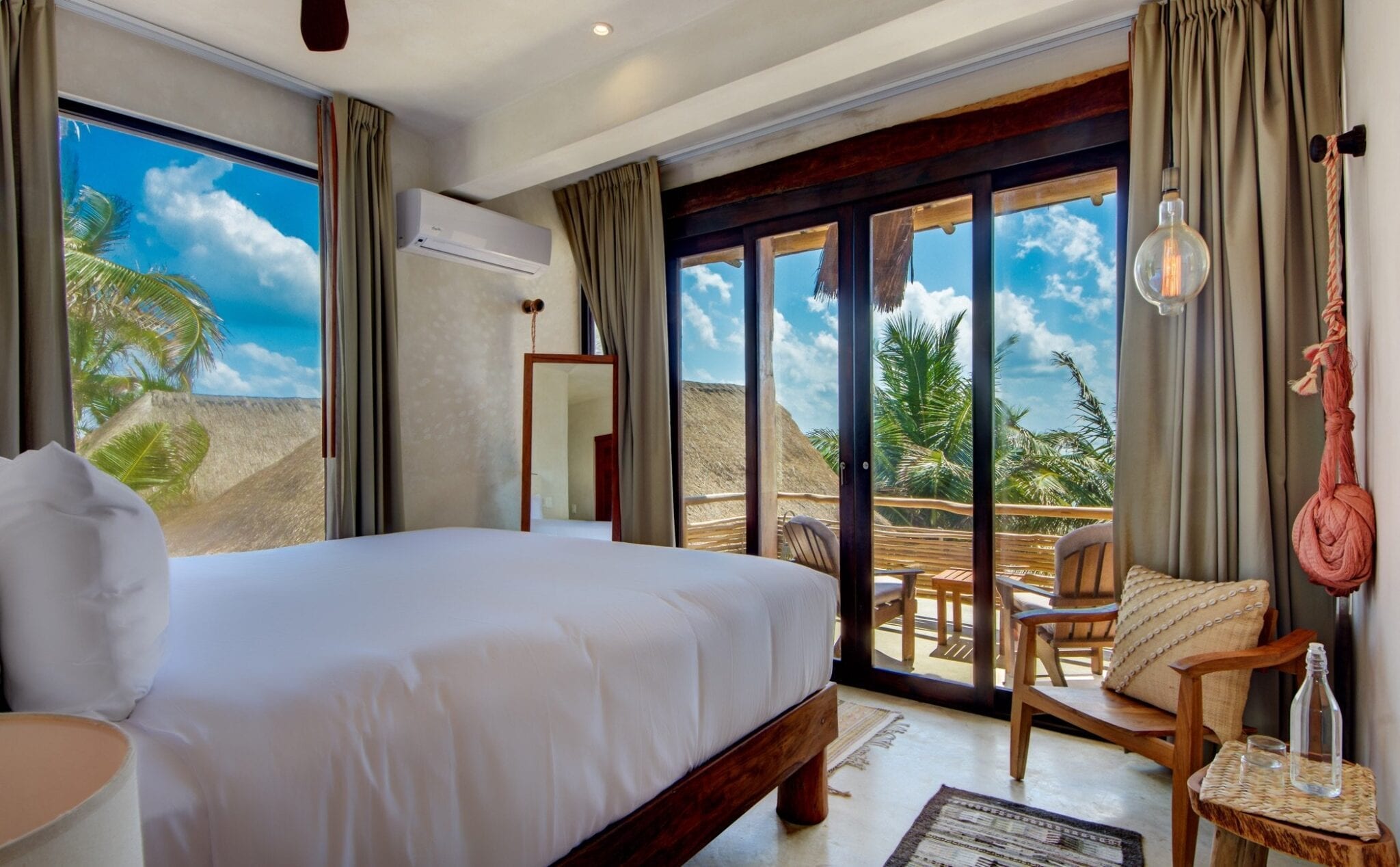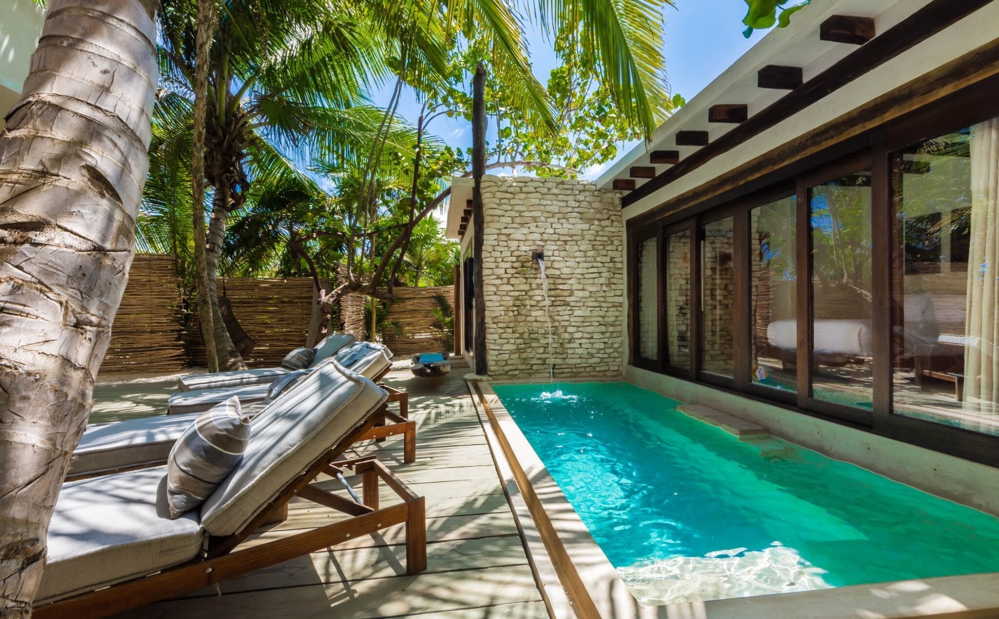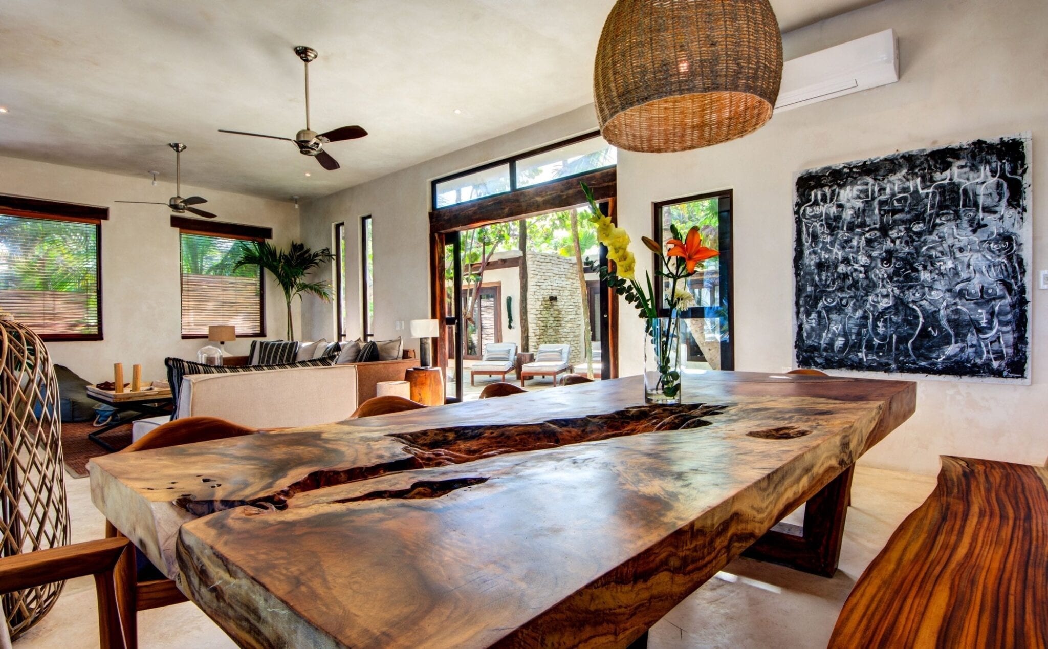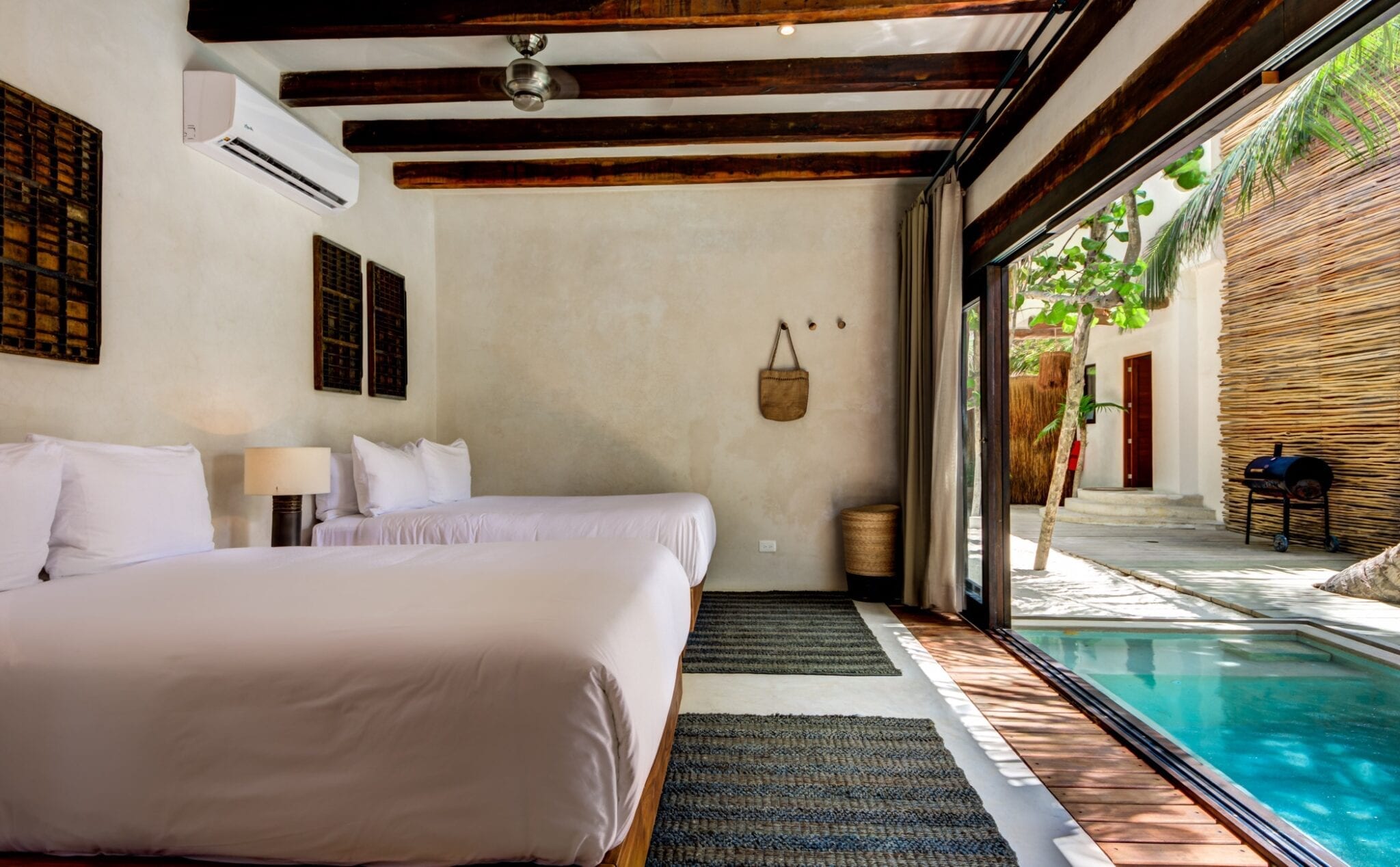 Set within one of the trendiest corners of Tulum’s hotel zone, the villa occupies a privileged position among three neighboring houses. Its surroundings balance the energy of a fashionable destination with the calm of a private retreat. Here, guests are close to the area’s celebrated beach culture while still enjoying a sense of seclusion that encourages slow mornings and quiet evenings.