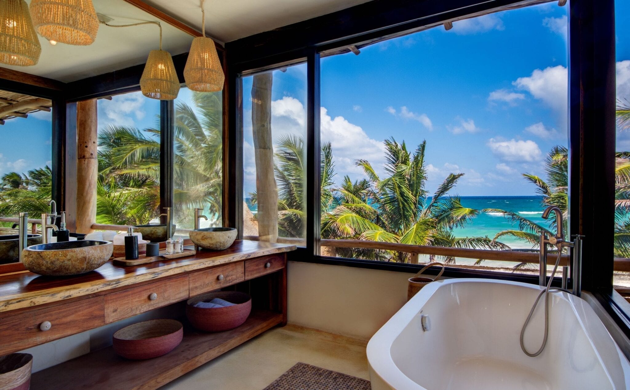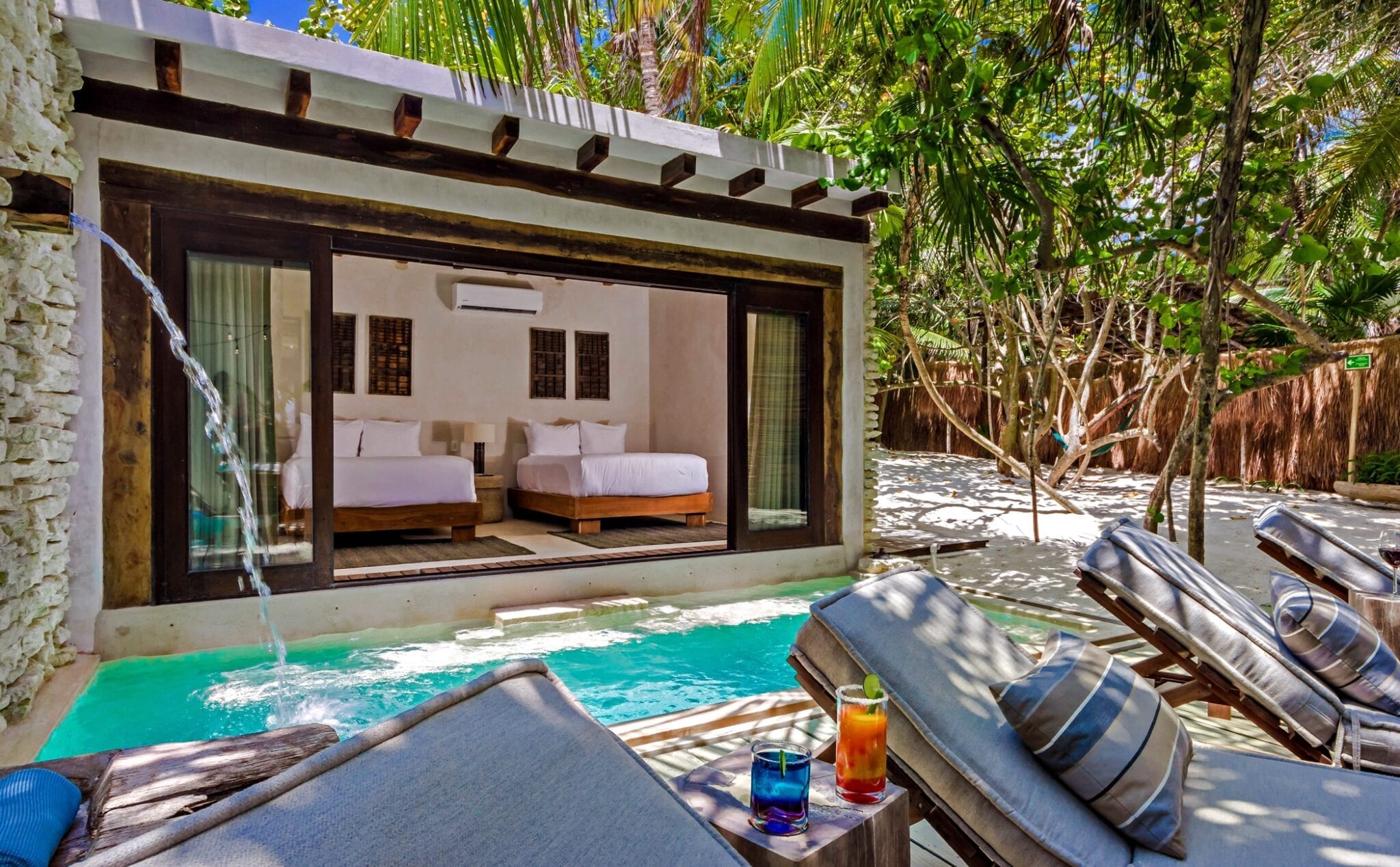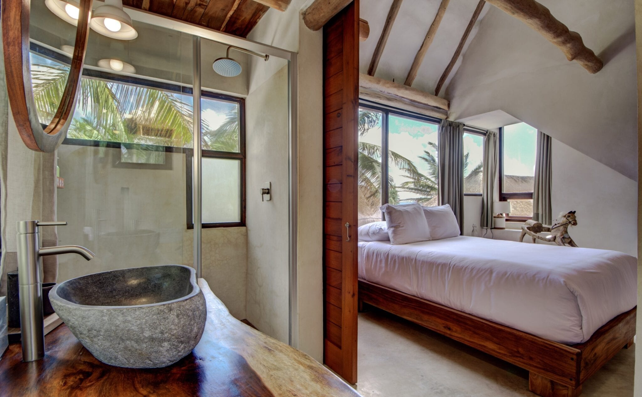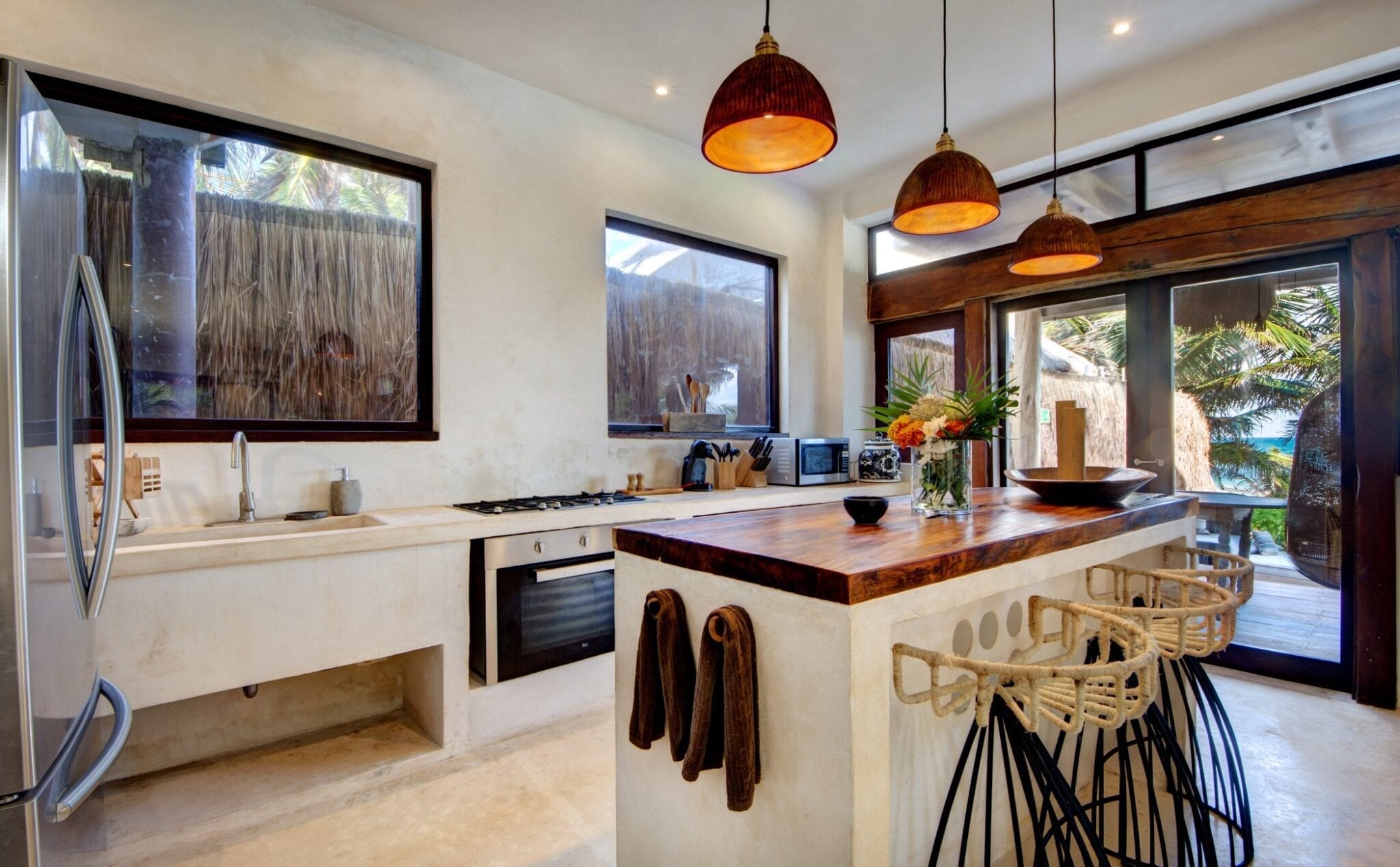 Set within one of the trendiest corners of Tulum’s hotel zone, the villa occupies a privileged position among three neighboring houses. Its surroundings balance the energy of a fashionable destination with the calm of a private retreat. Here, guests are close to the area’s celebrated beach culture while still enjoying a sense of seclusion that encourages slow mornings and quiet evenings.