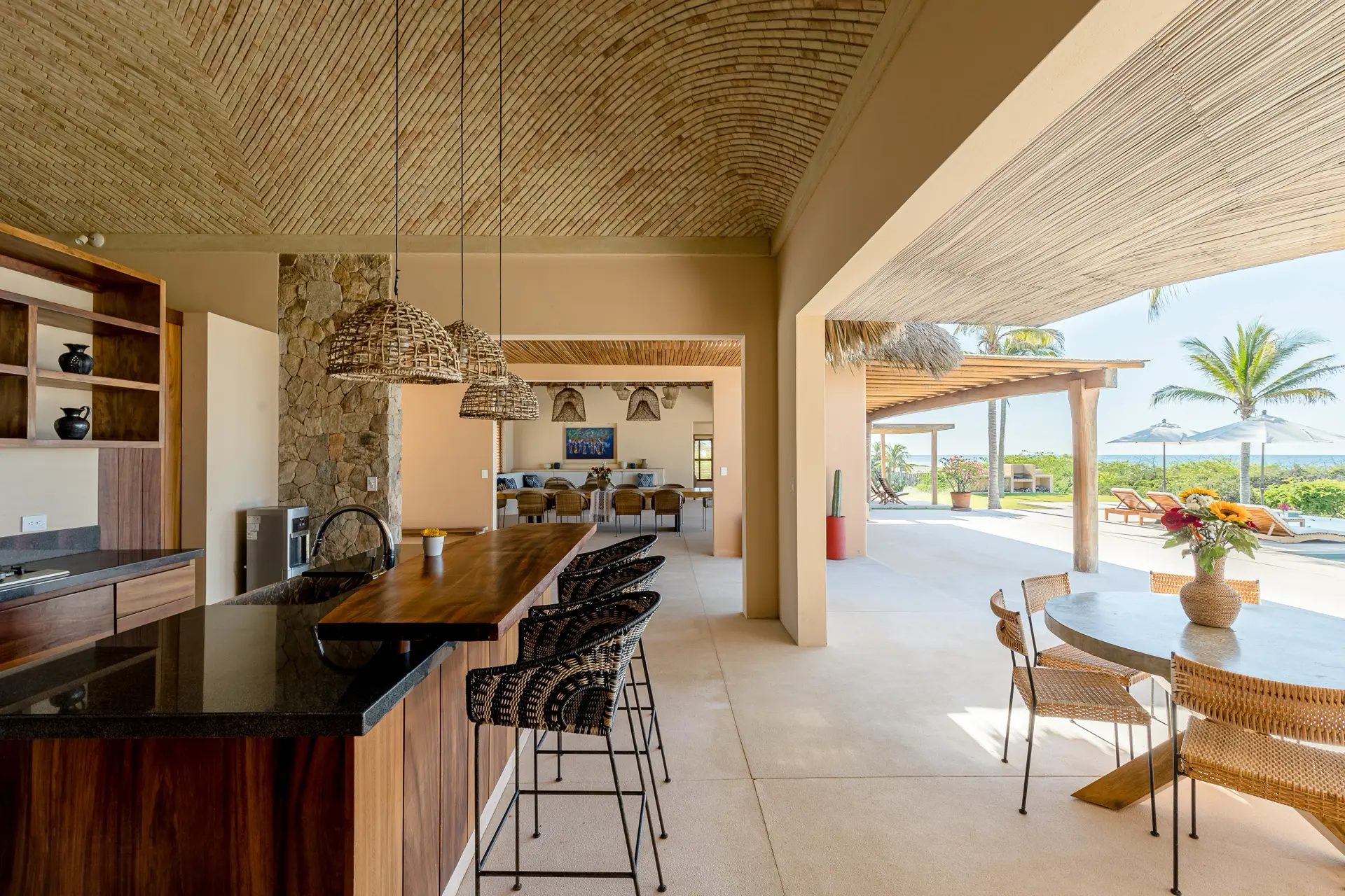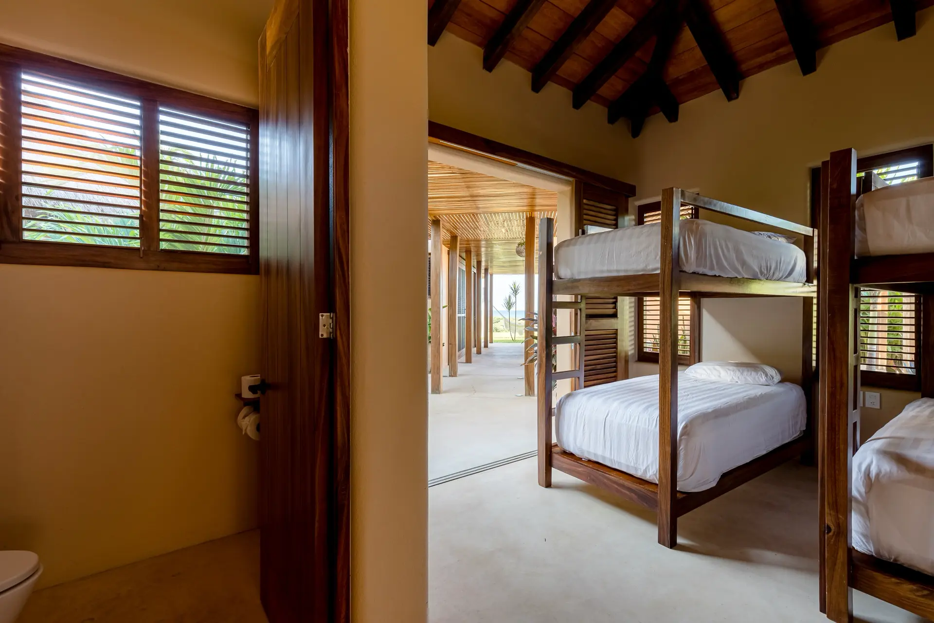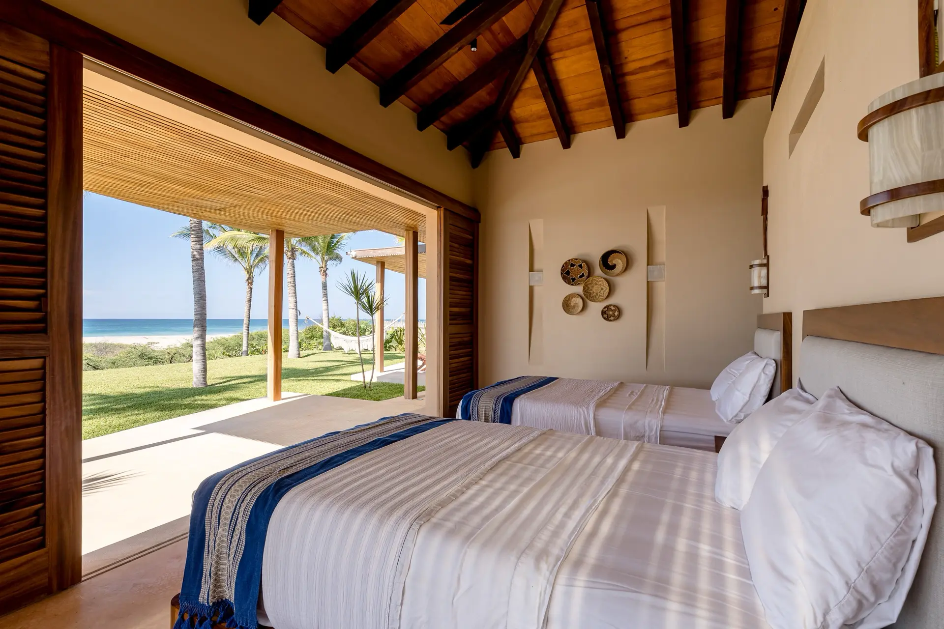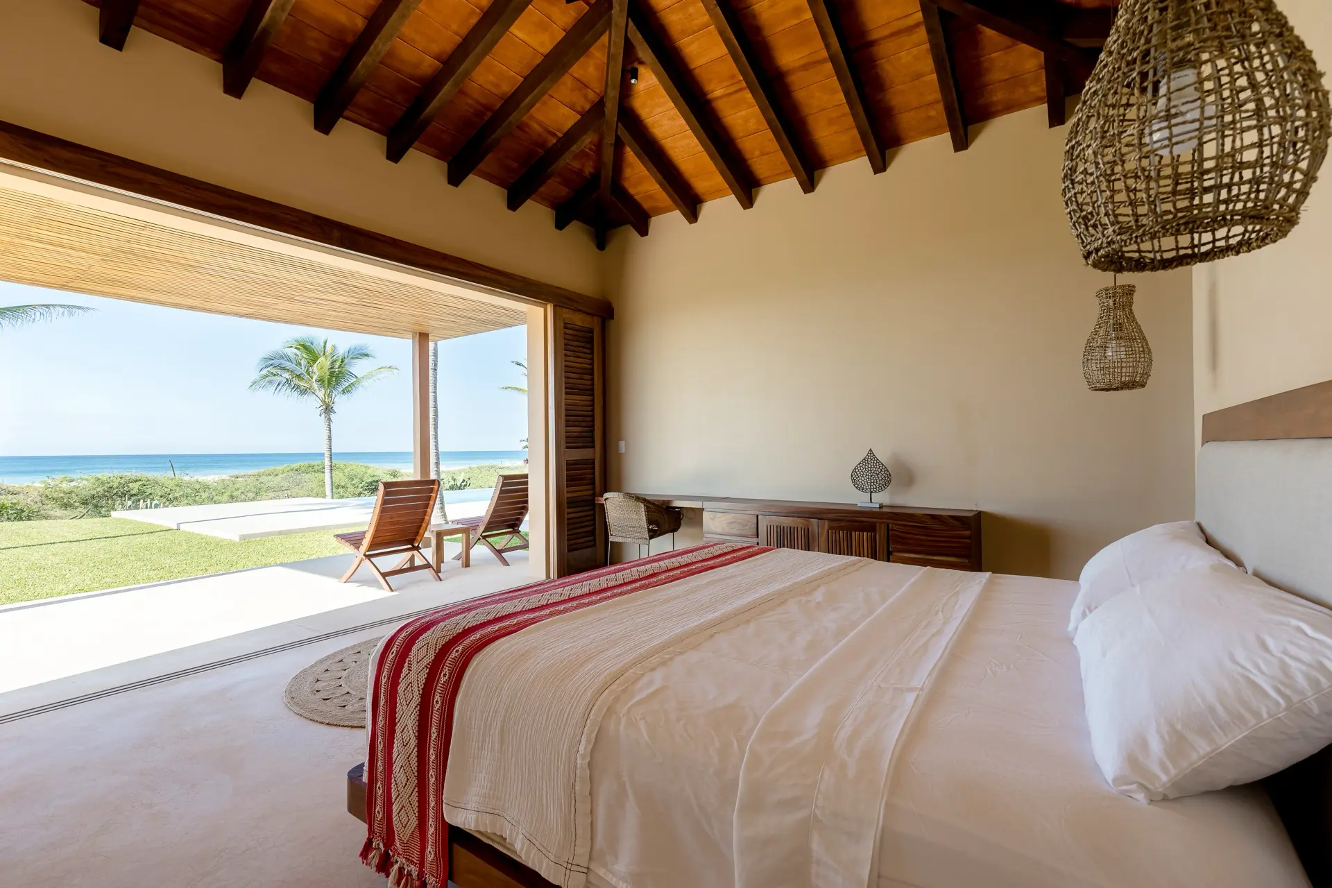 Five thoughtfully designed bedrooms, each with a garden en-suite bathroom, accommodate up to 14 guests in an atmosphere of effortless comfort. Four oceanfront master suites open to the sound of the waves, while a spacious bunkroom is perfect for families or groups of friends.
