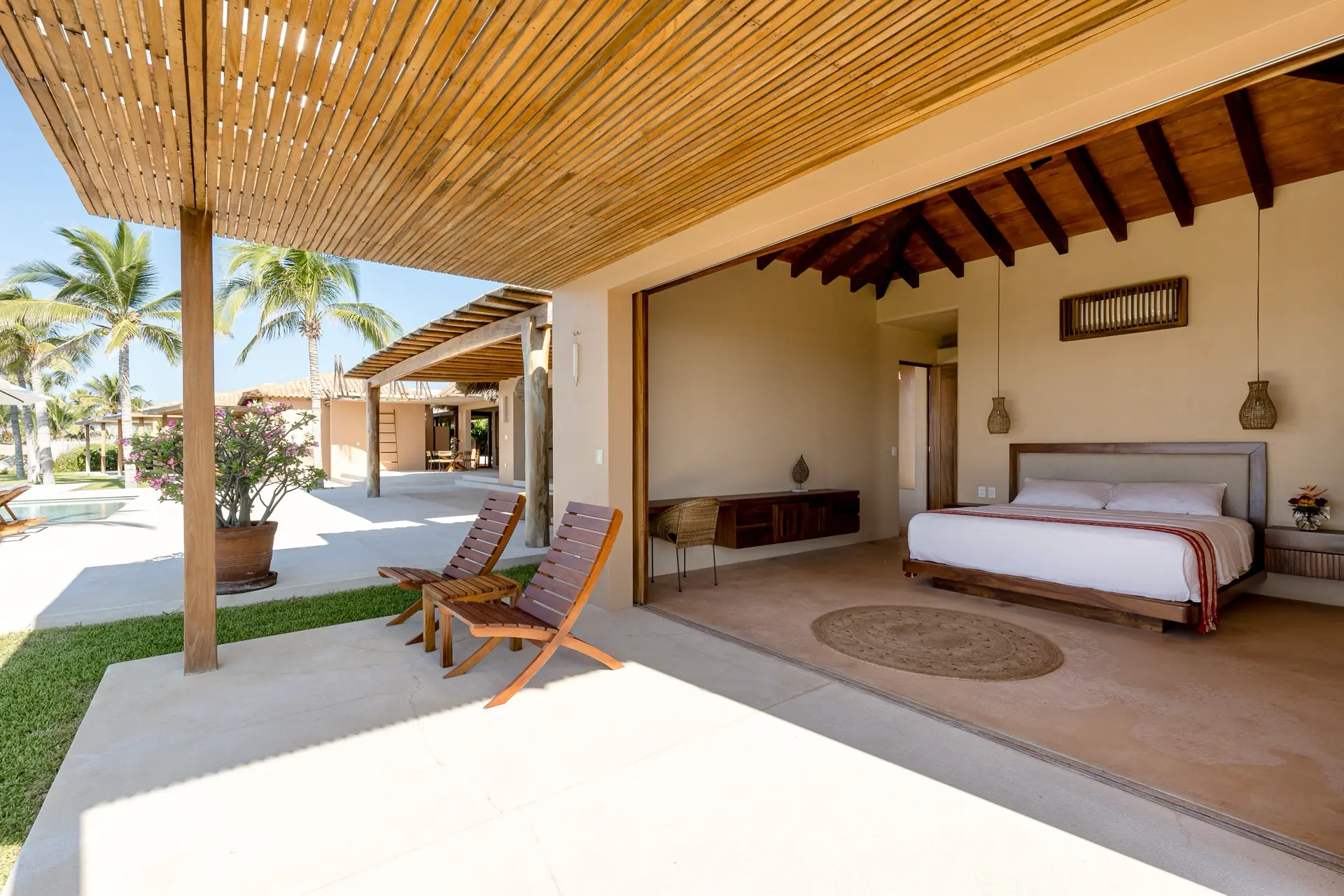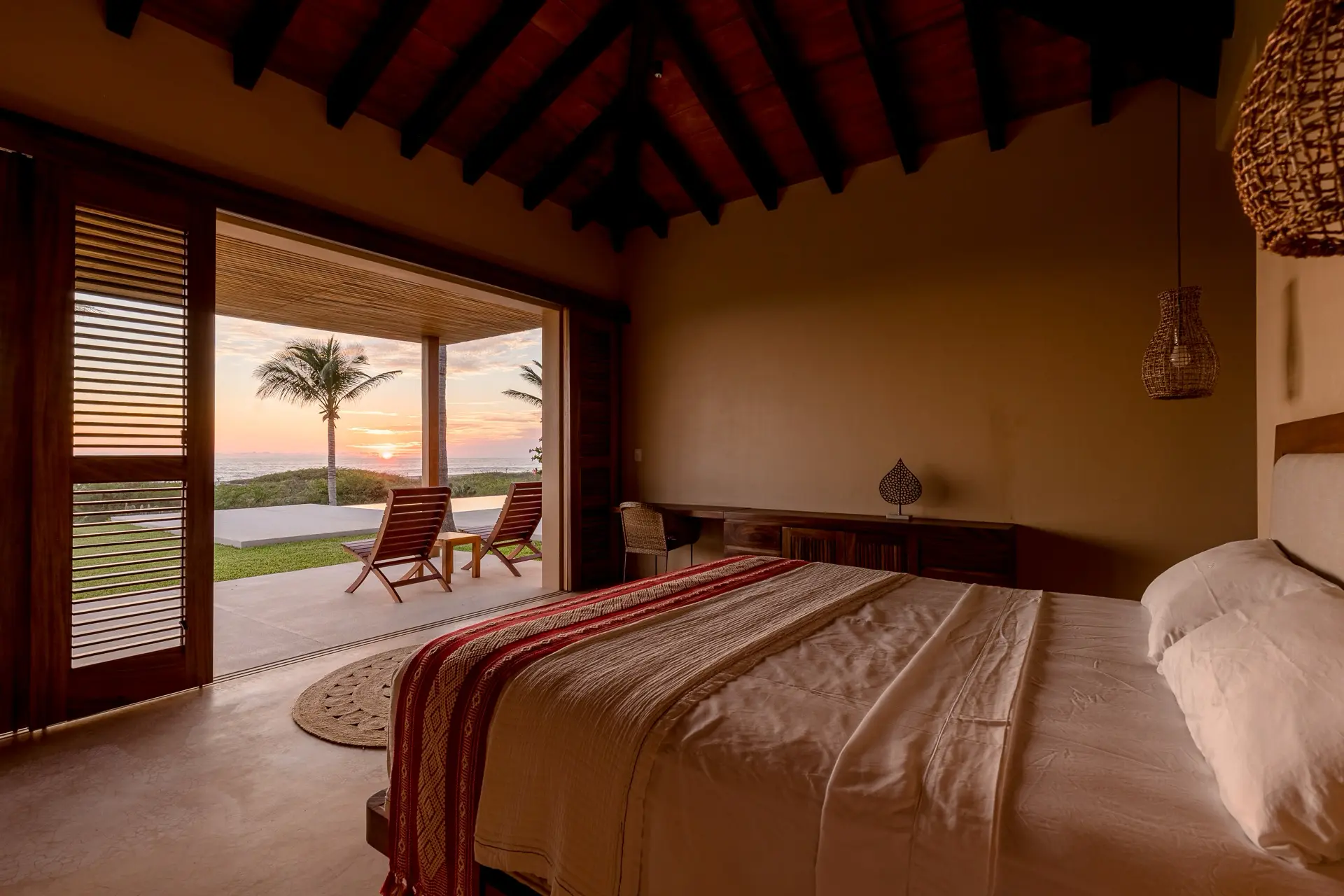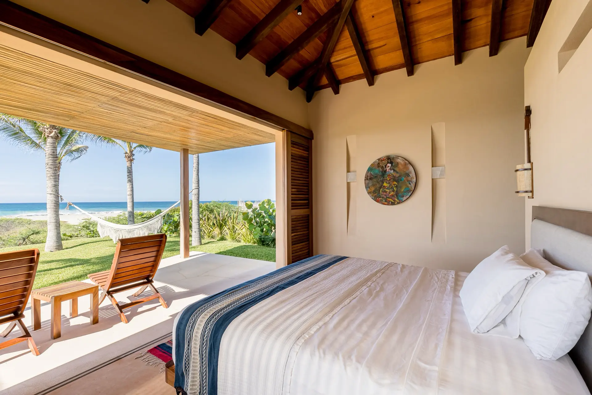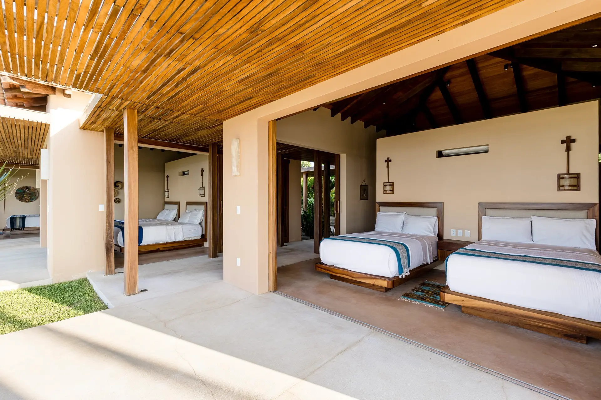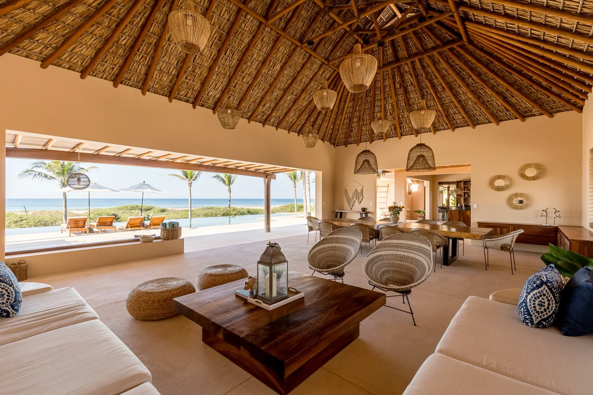 Five thoughtfully designed bedrooms, each with a garden en-suite bathroom, accommodate up to 14 guests in an atmosphere of effortless comfort. Four oceanfront master suites open to the sound of the waves, while a spacious bunkroom is perfect for families or groups of friends.