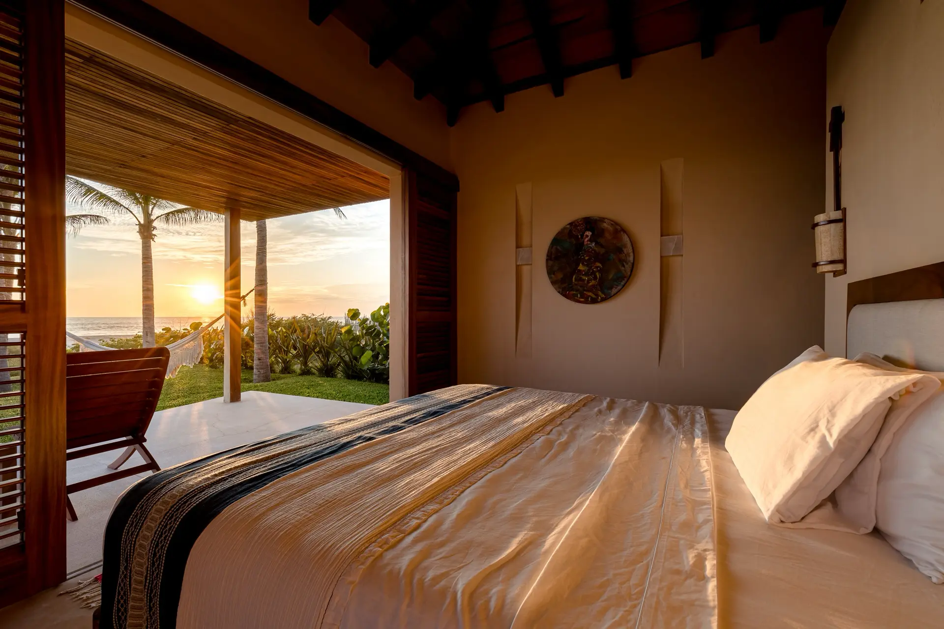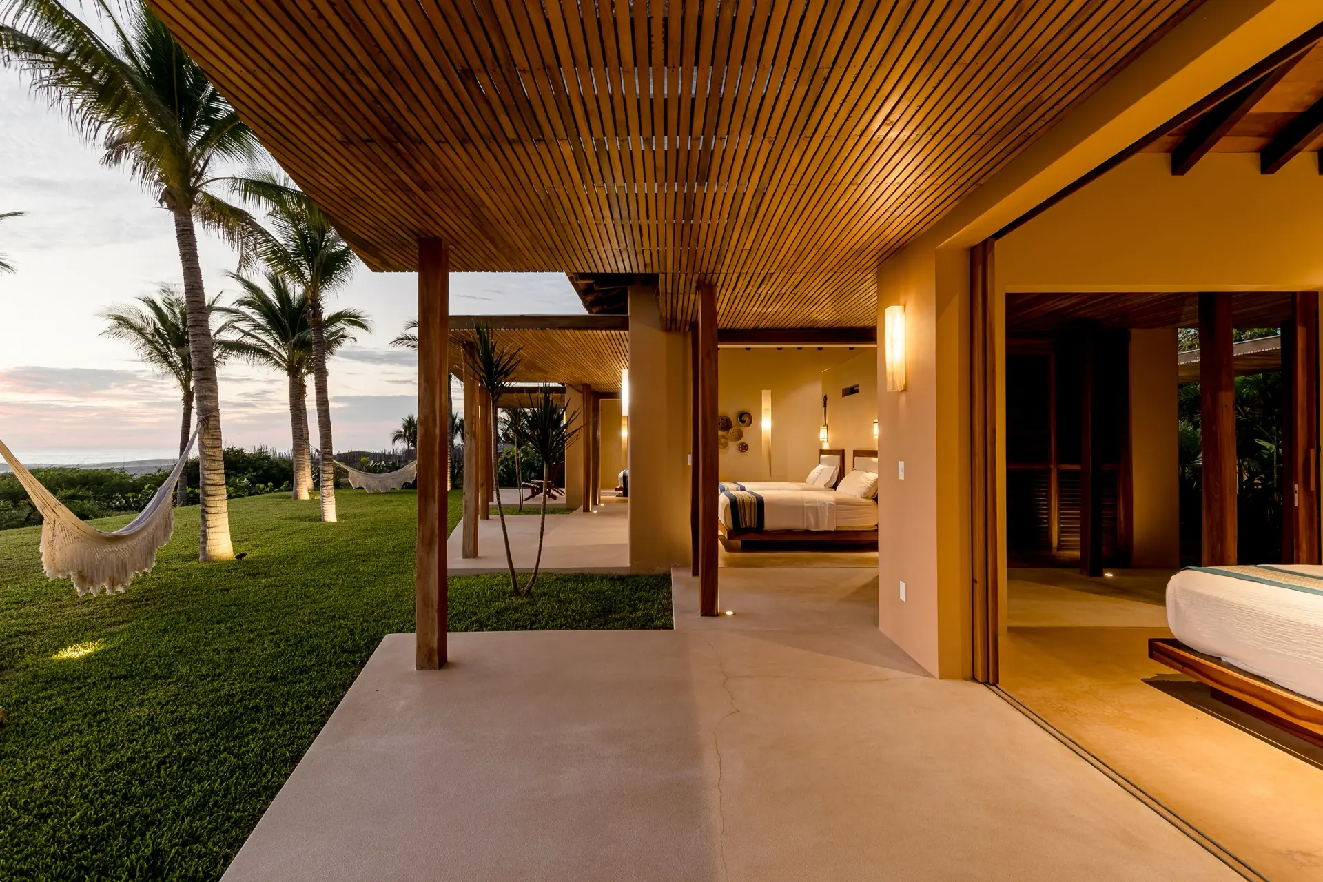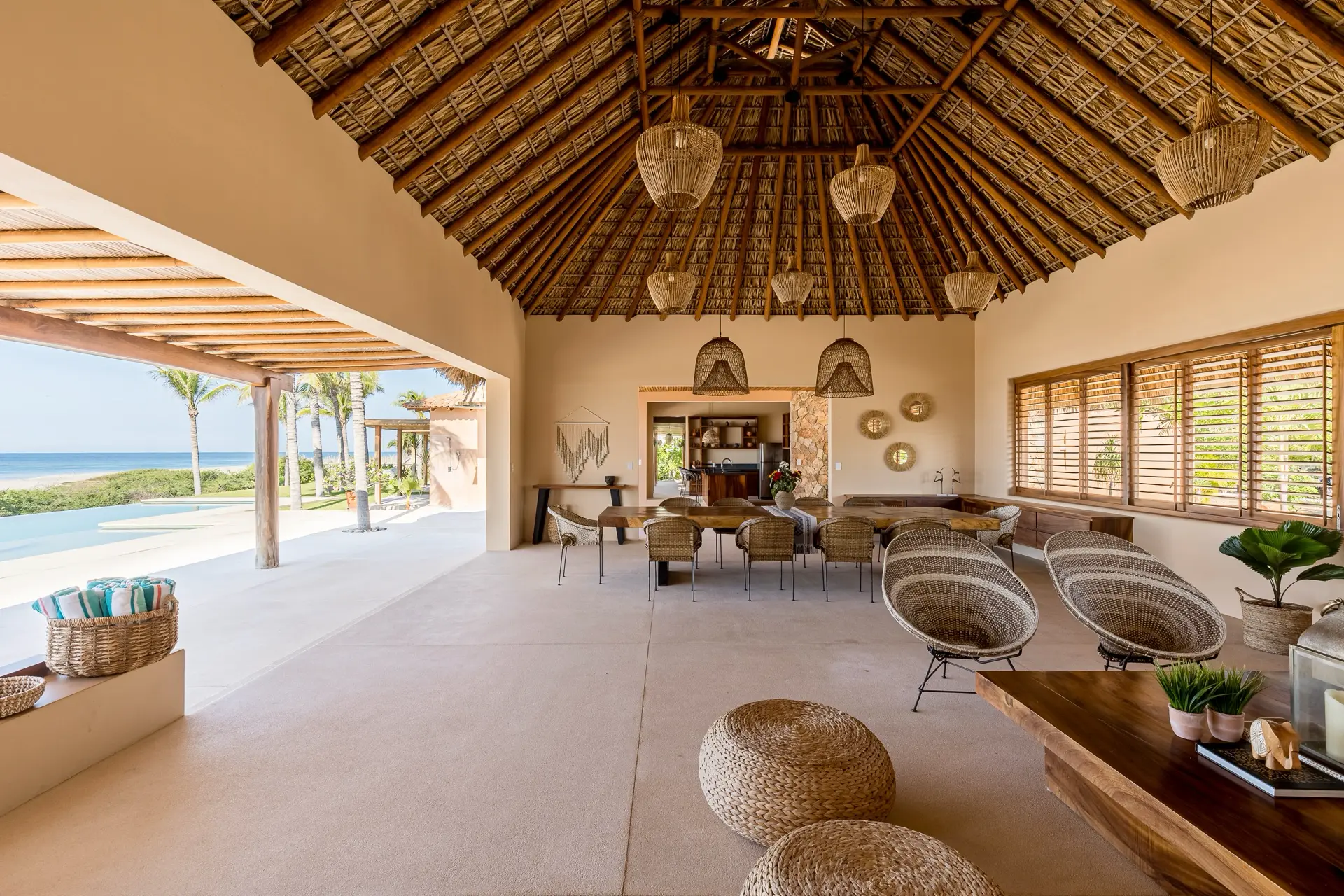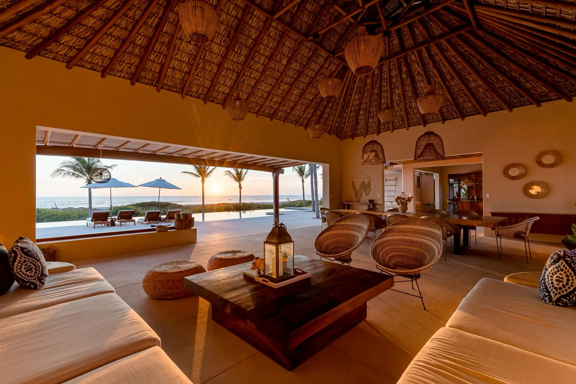 Five thoughtfully designed bedrooms, each with a garden en-suite bathroom, accommodate up to 14 guests in an atmosphere of effortless comfort. Four oceanfront master suites open to the sound of the waves, while a spacious bunkroom is perfect for families or groups of friends.