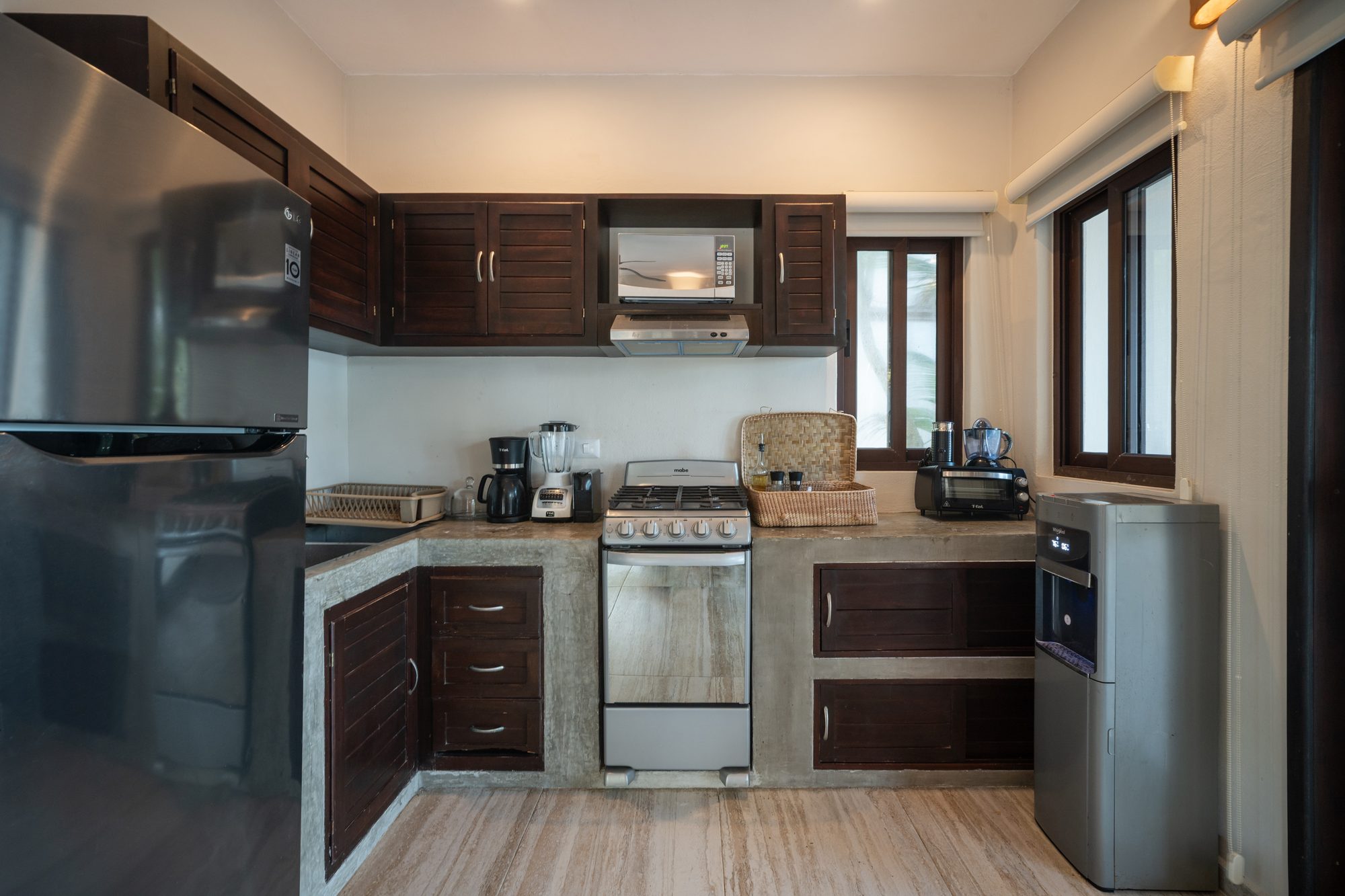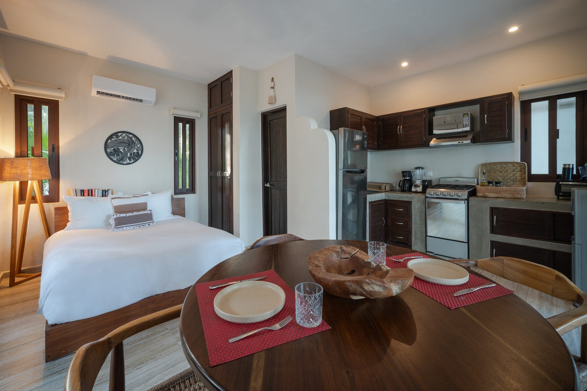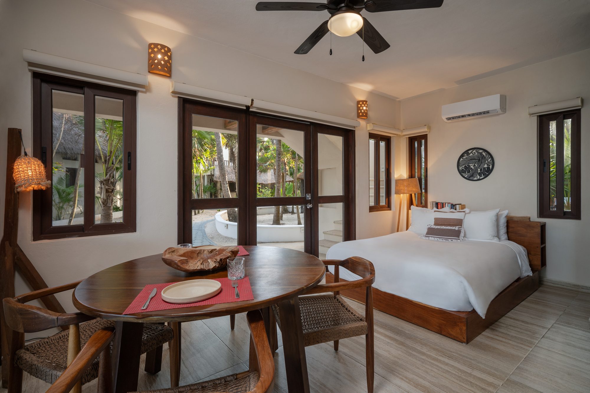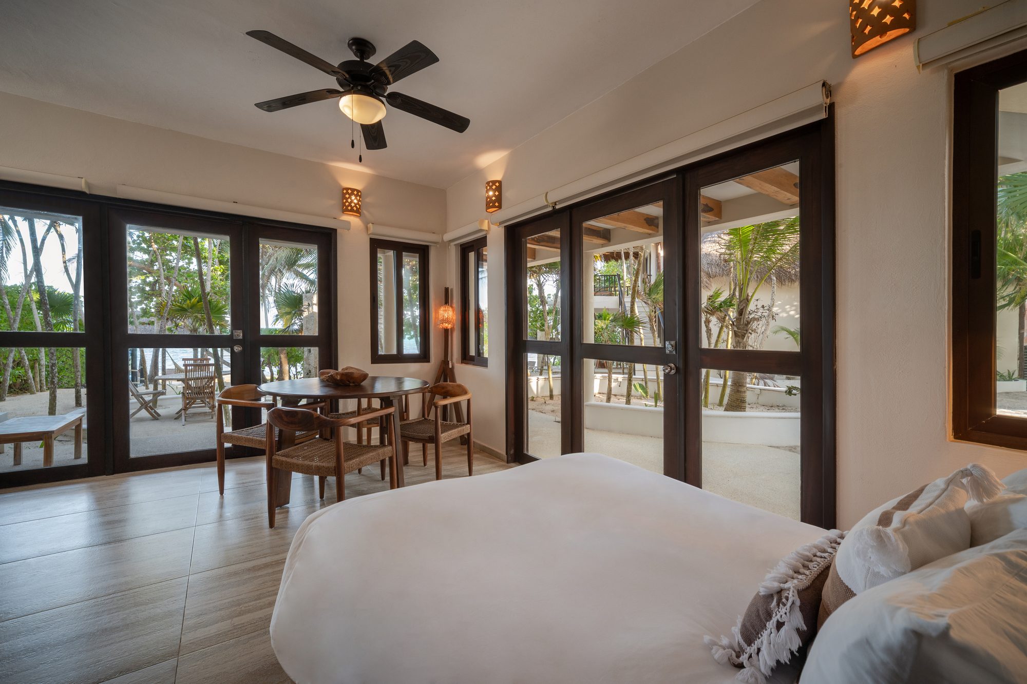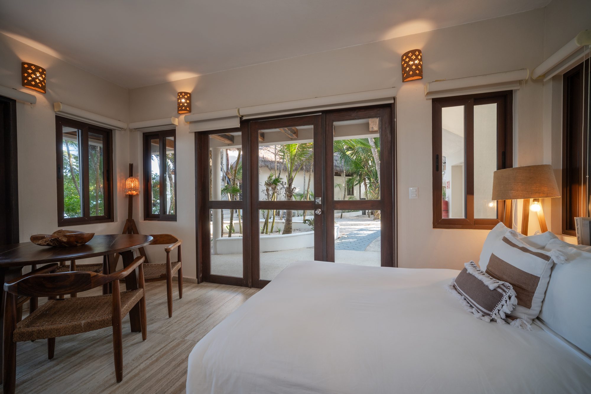 The casita features open living areas, natural textures, and a shaded private terrace for outdoor dining. Guests share a serene beachfront pool with the neighboring bungalows, along with complimentary kayaks and paddleboards for reef exploration. Daily housekeeping and a pre-arrival concierge are included from day one.