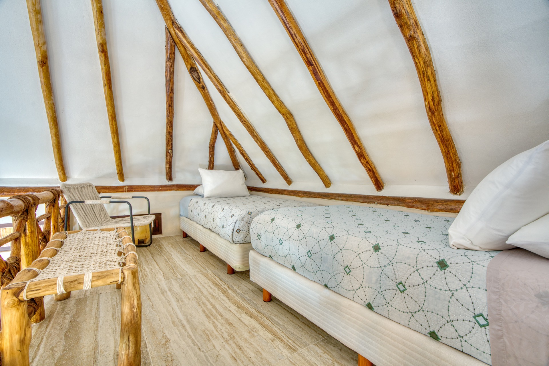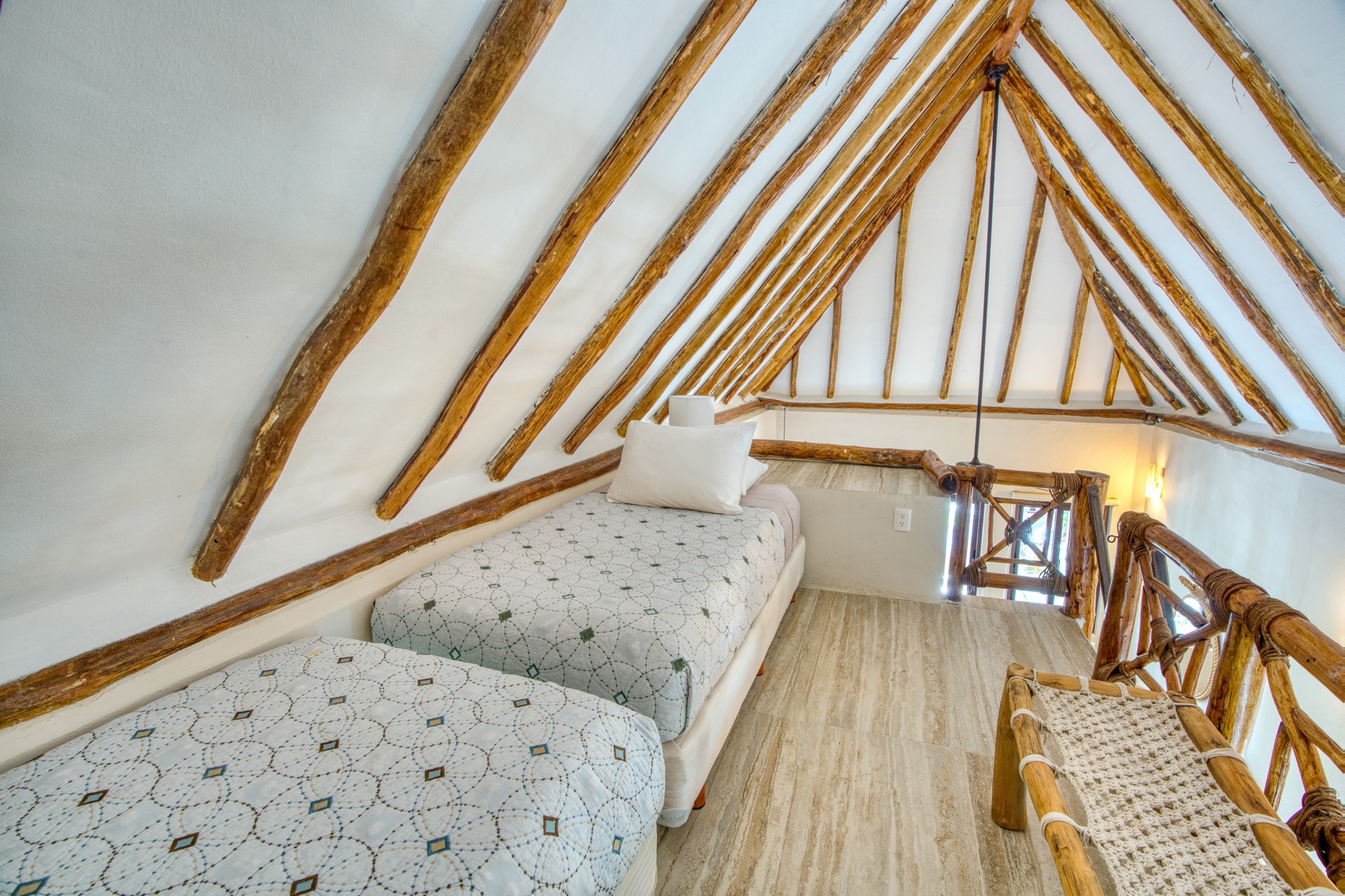 Located on the first level, this spacious room features a king-size bed as its centerpiece. For added flexibility, the room also boasts a unique loft area accessible by a ladder, which includes two single beds. This setup is perfect for families traveling with children. In addition, the room comes with air conditioning, a ceiling fan, WiFi, and a private bathroom for your convenience and comfort.