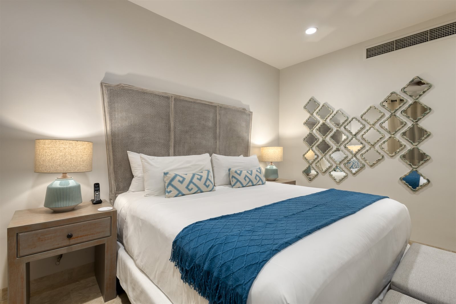 You will fall in love with this newly remodeled three-bedroom, three-bath penthouse located in building C in one of Cabo’s best-kept secret developments, Puerta del Sol. Casa de los Vientos was recently upgraded with new travertine floors, bathroom tiles, counters, windows, sliders, furniture, and all kitchen appliances. The tasteful décor gives it a true relaxing beach feeling while maintaining subtle Mexican décor tones throughout.