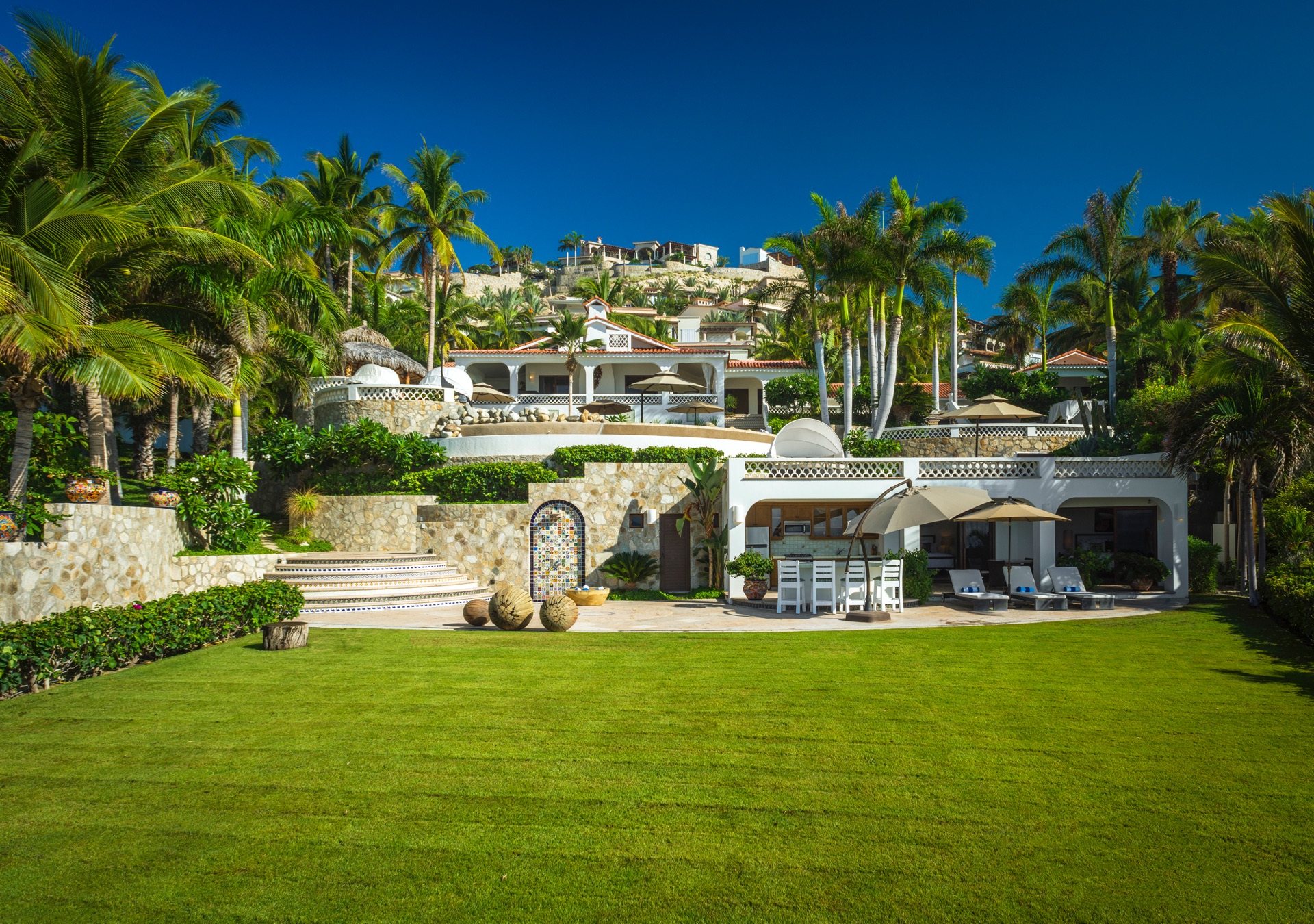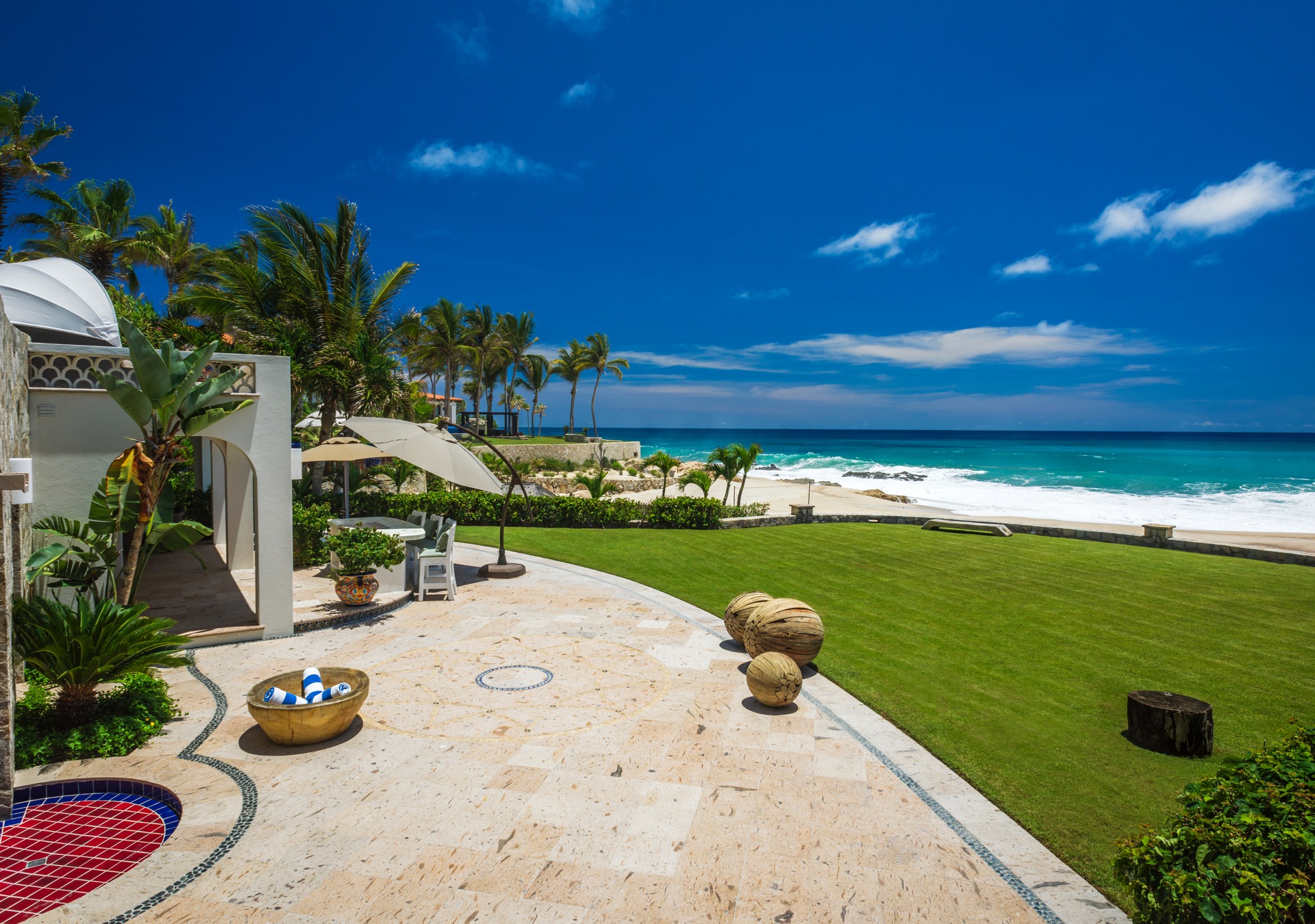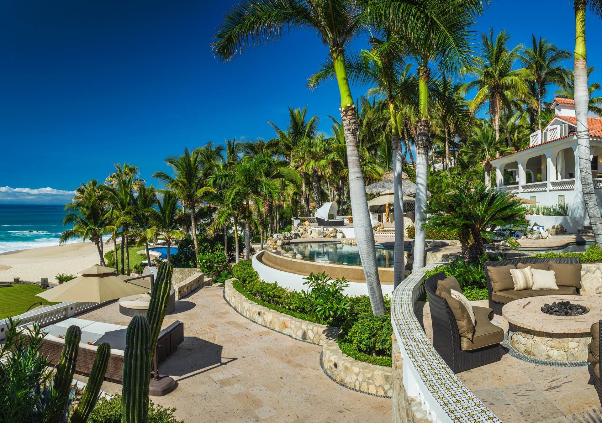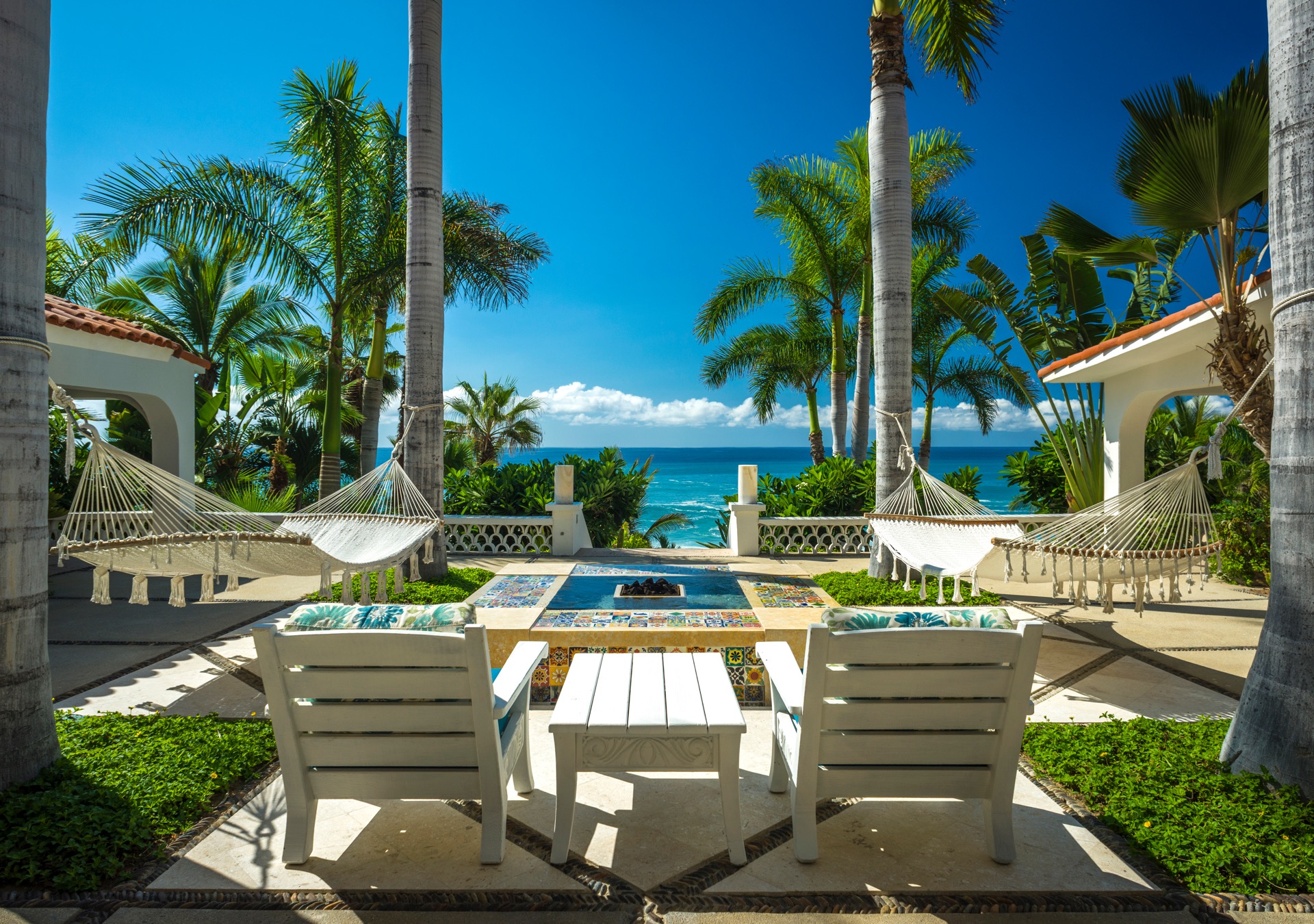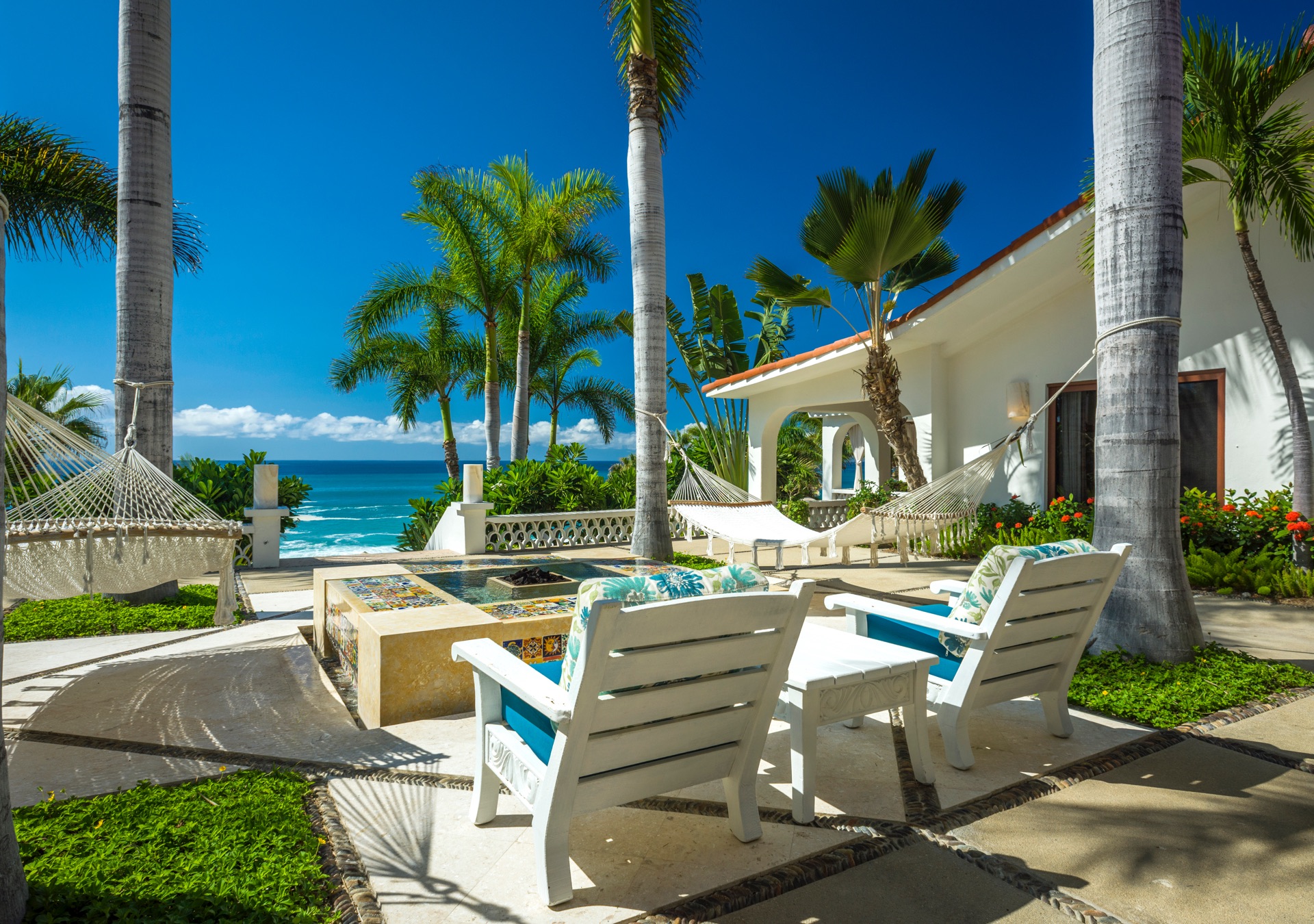 The outdoor amenities at Casa Edwards are designed for relaxation and entertainment. The infinity pool overlooks the ocean and is surrounded by sun loungers and umbrellas. Adjacent to the pool is a Jacuzzi with stunning sea views. The outdoor palapa bar is perfect for sunset cocktails and casual gatherings. Guests have direct access to the villa’s private beach, steps away. The lush villa’s gardens, colorful tiles, and fountains create a serene atmosphere. Two gas fire pits provide cozy spots for evening gatherings. The outdoor kitchen and dining area, complete with a BBQ and bar, is perfect for alfresco meals, adjacent to a large lawn that enhances the outdoor experience.