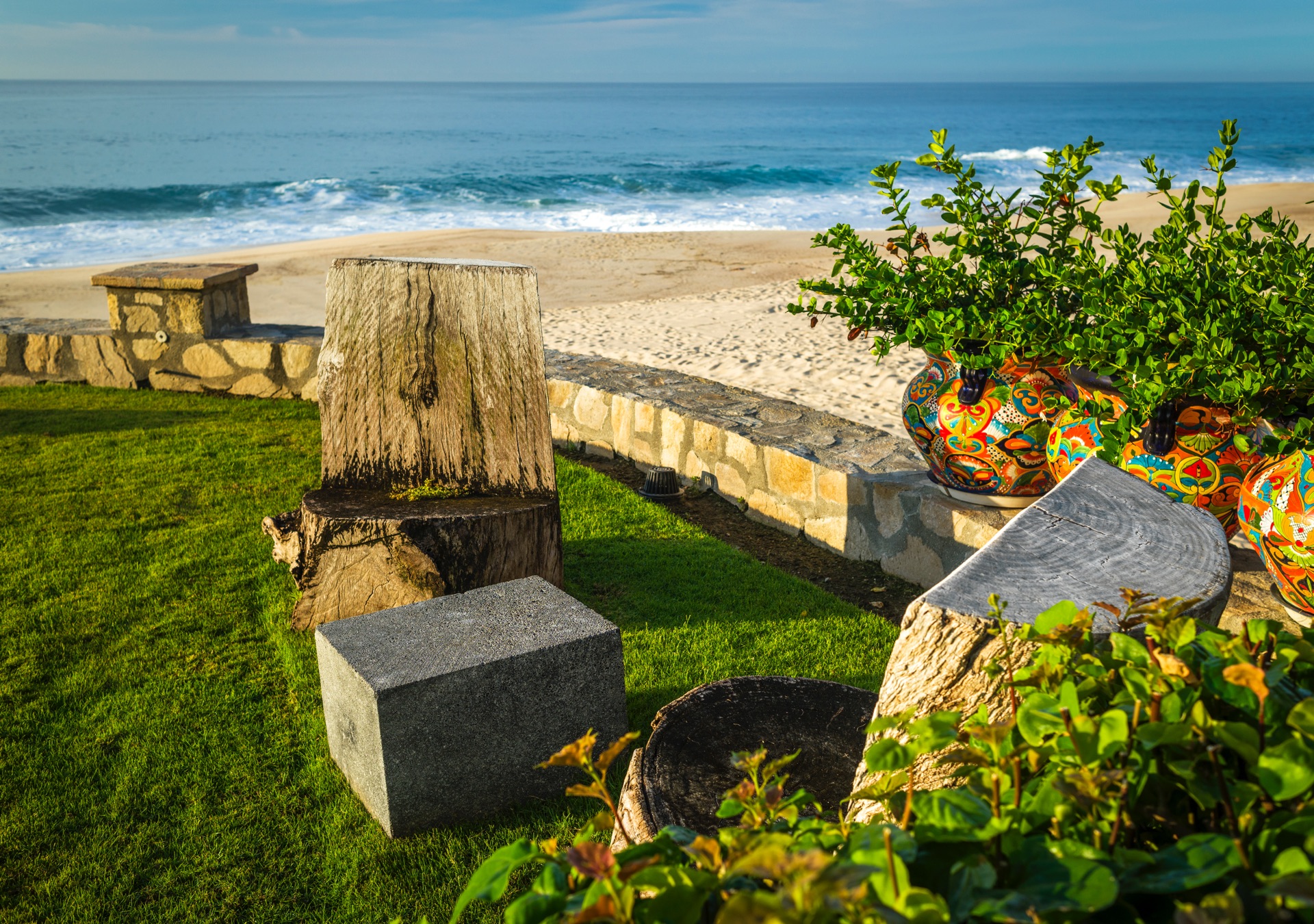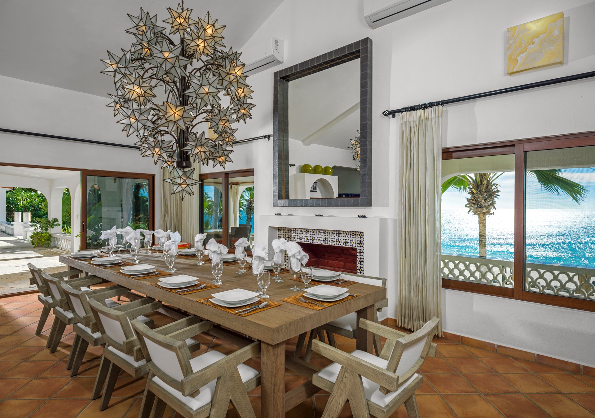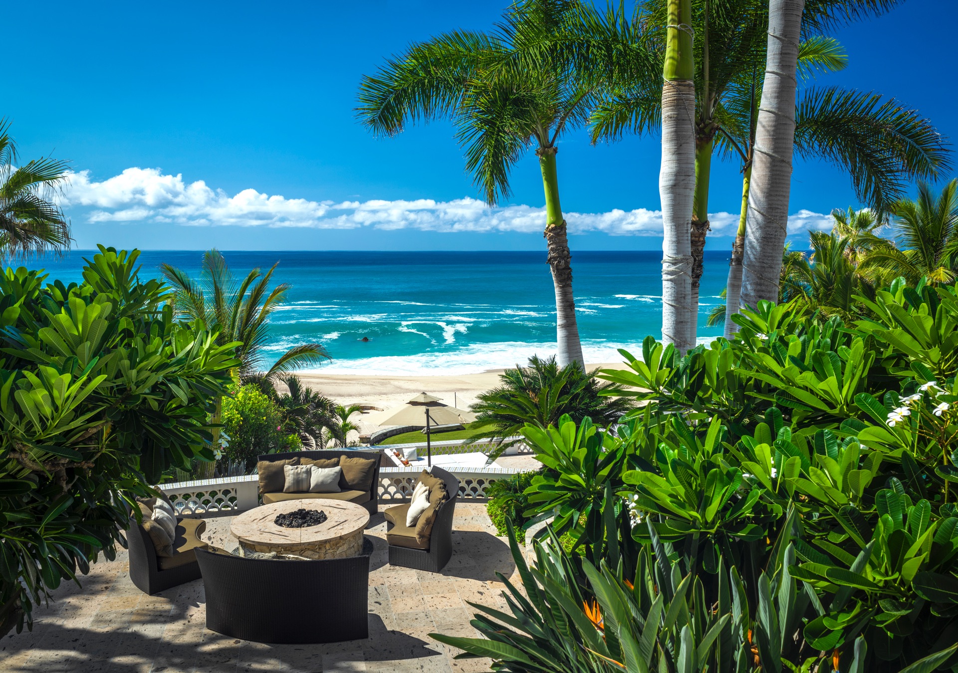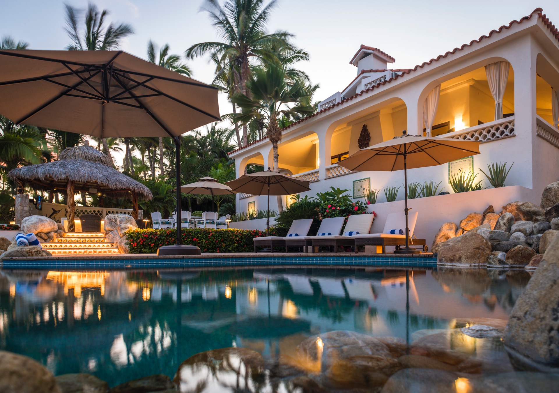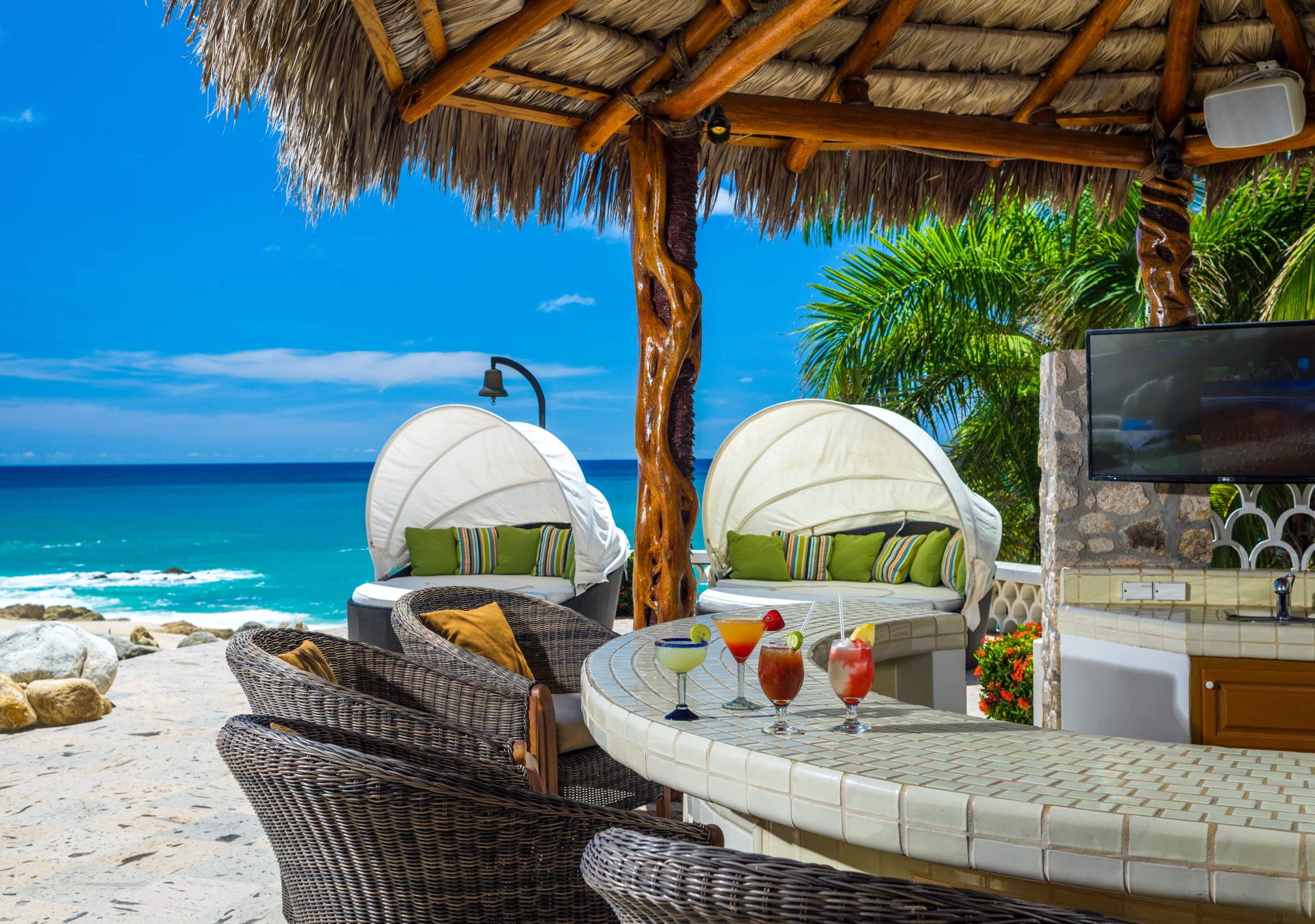 The outdoor amenities at Casa Edwards are designed for relaxation and entertainment. The infinity pool overlooks the ocean and is surrounded by sun loungers and umbrellas. Adjacent to the pool is a Jacuzzi with stunning sea views. The outdoor palapa bar is perfect for sunset cocktails and casual gatherings. Guests have direct access to the villa’s private beach, steps away. The lush villa’s gardens, colorful tiles, and fountains create a serene atmosphere. Two gas fire pits provide cozy spots for evening gatherings. The outdoor kitchen and dining area, complete with a BBQ and bar, is perfect for alfresco meals, adjacent to a large lawn that enhances the outdoor experience.