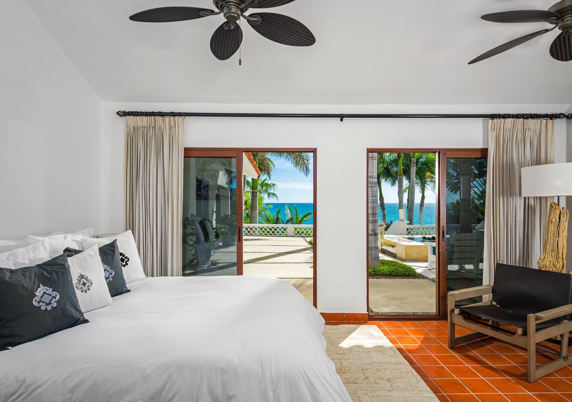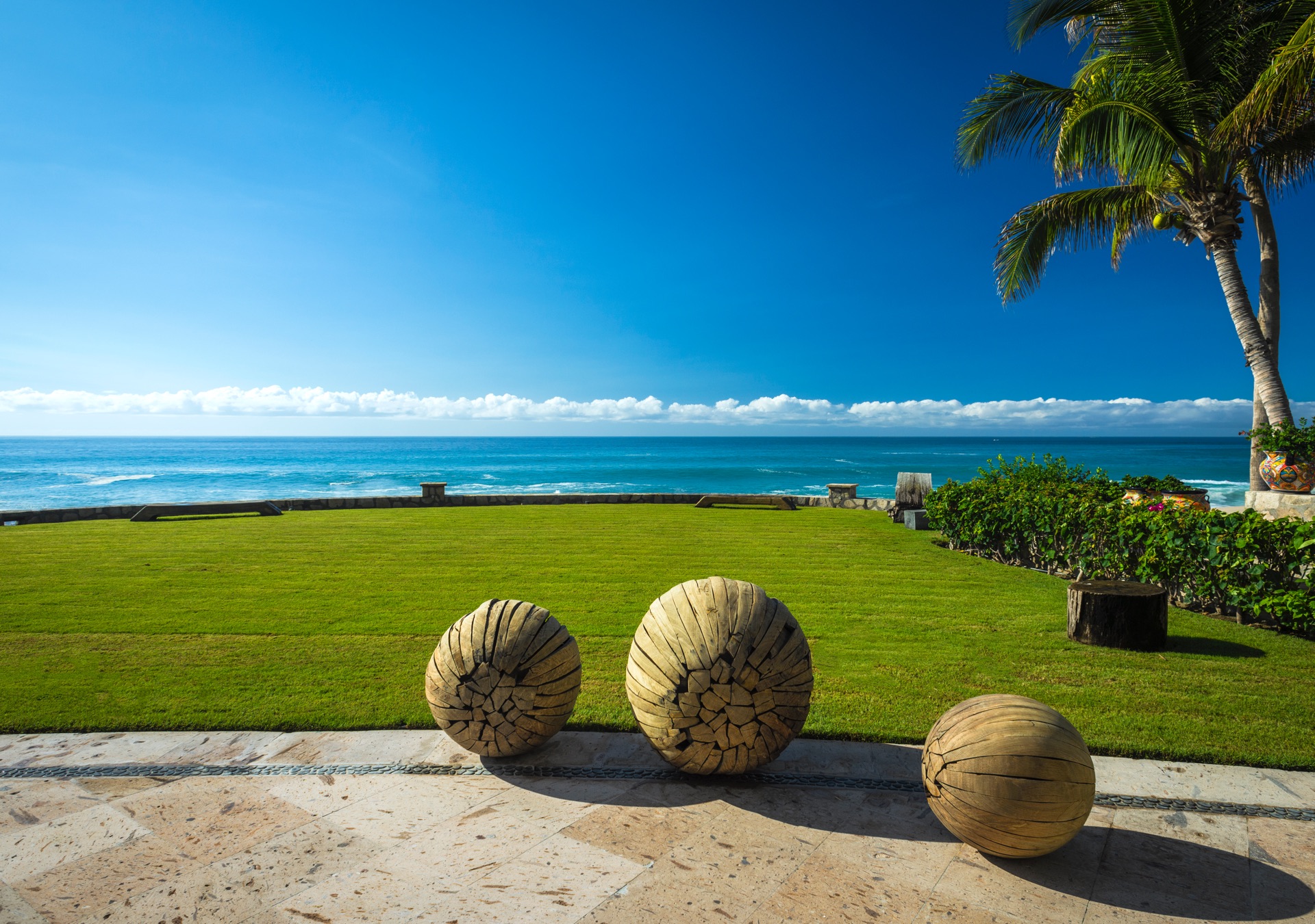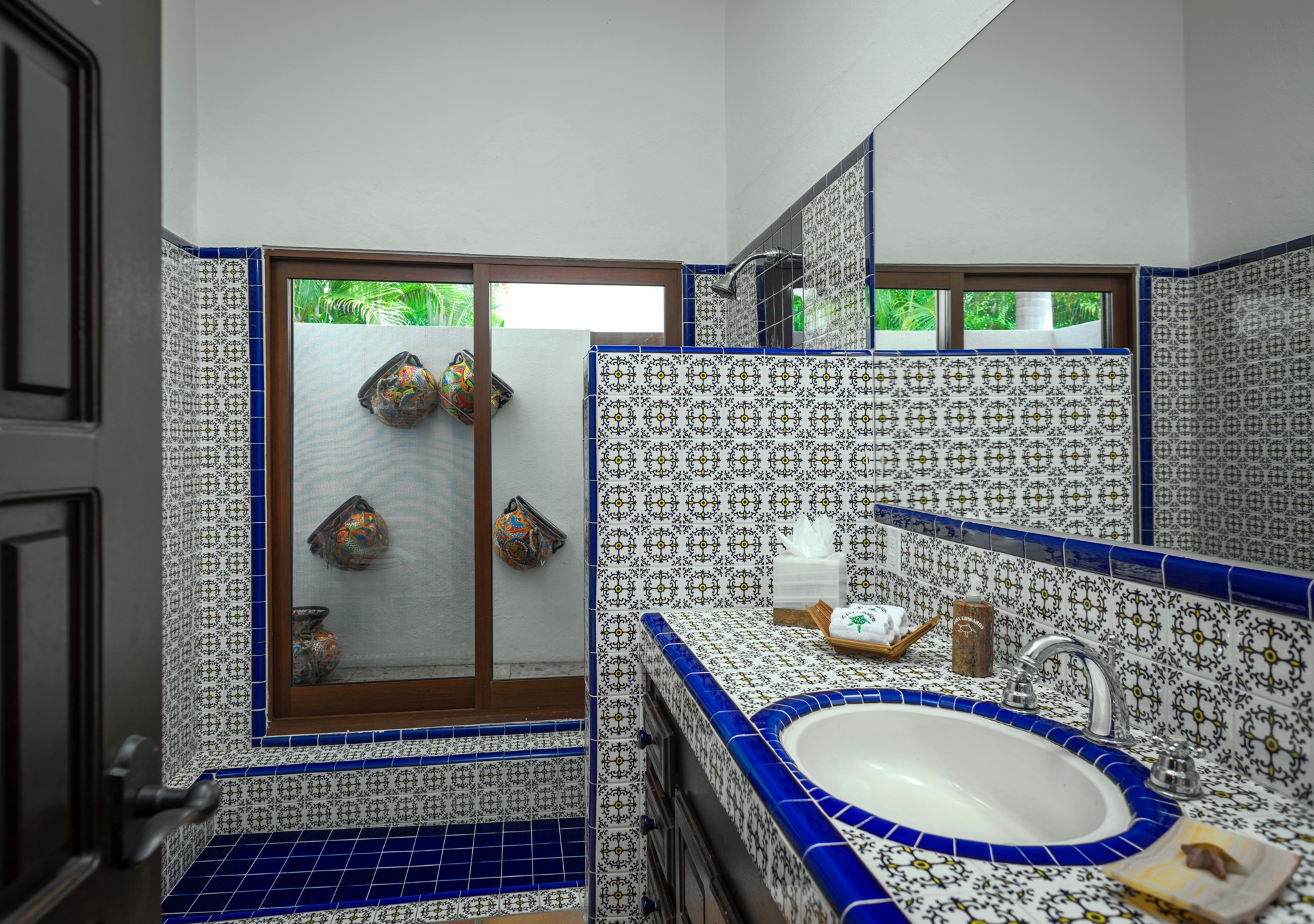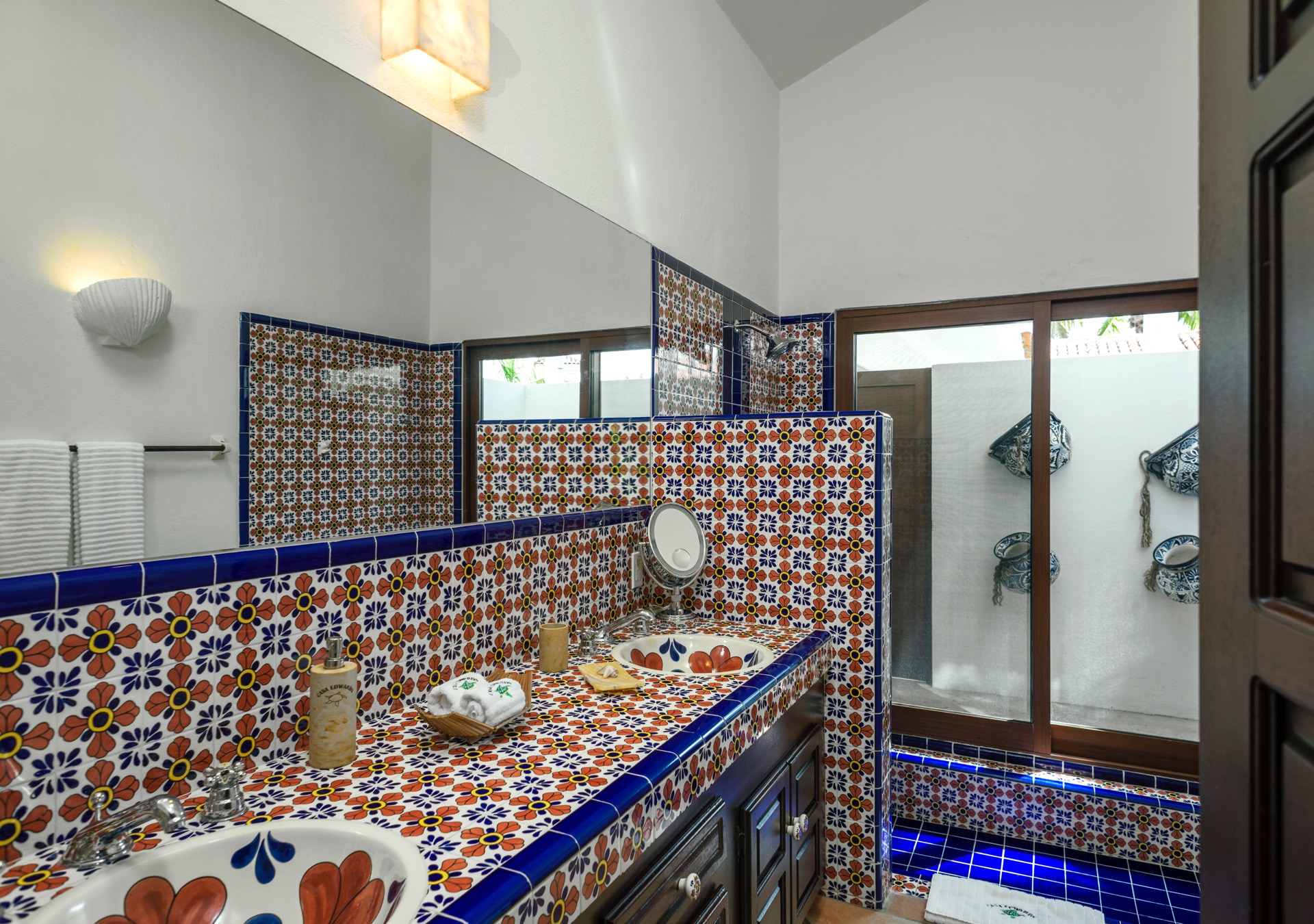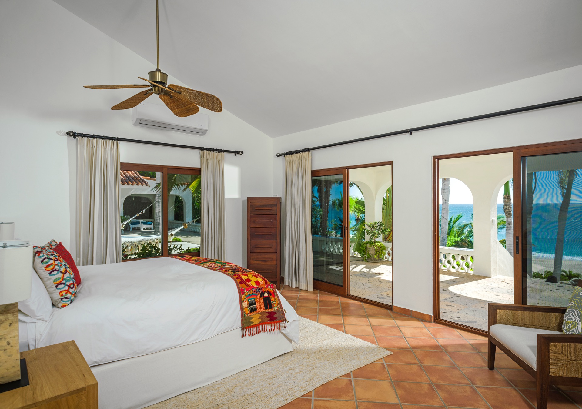 The outdoor amenities at Casa Edwards are designed for relaxation and entertainment. The infinity pool overlooks the ocean and is surrounded by sun loungers and umbrellas. Adjacent to the pool is a Jacuzzi with stunning sea views. The outdoor palapa bar is perfect for sunset cocktails and casual gatherings. Guests have direct access to the villa’s private beach, steps away. The lush villa’s gardens, colorful tiles, and fountains create a serene atmosphere. Two gas fire pits provide cozy spots for evening gatherings. The outdoor kitchen and dining area, complete with a BBQ and bar, is perfect for alfresco meals, adjacent to a large lawn that enhances the outdoor experience.