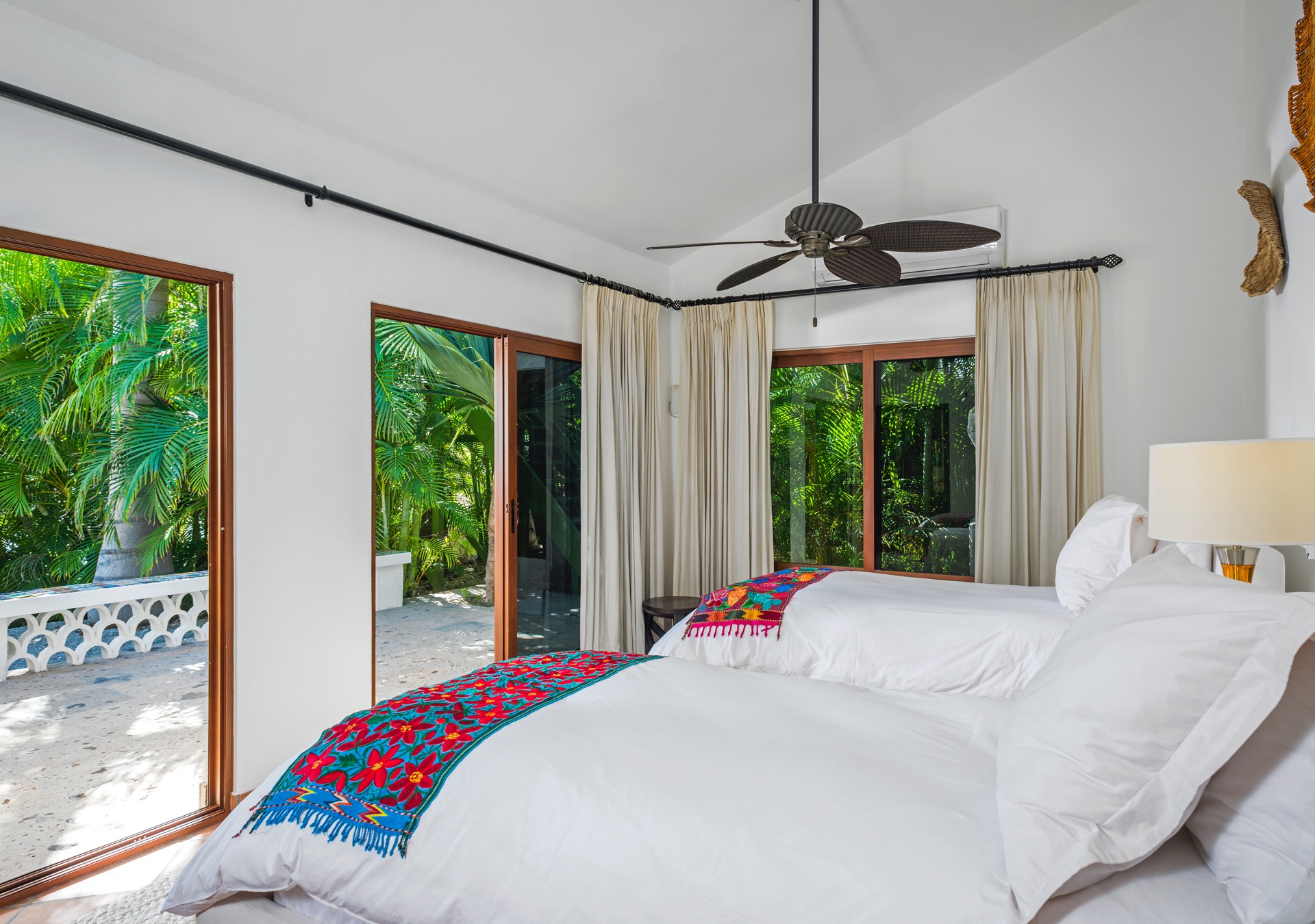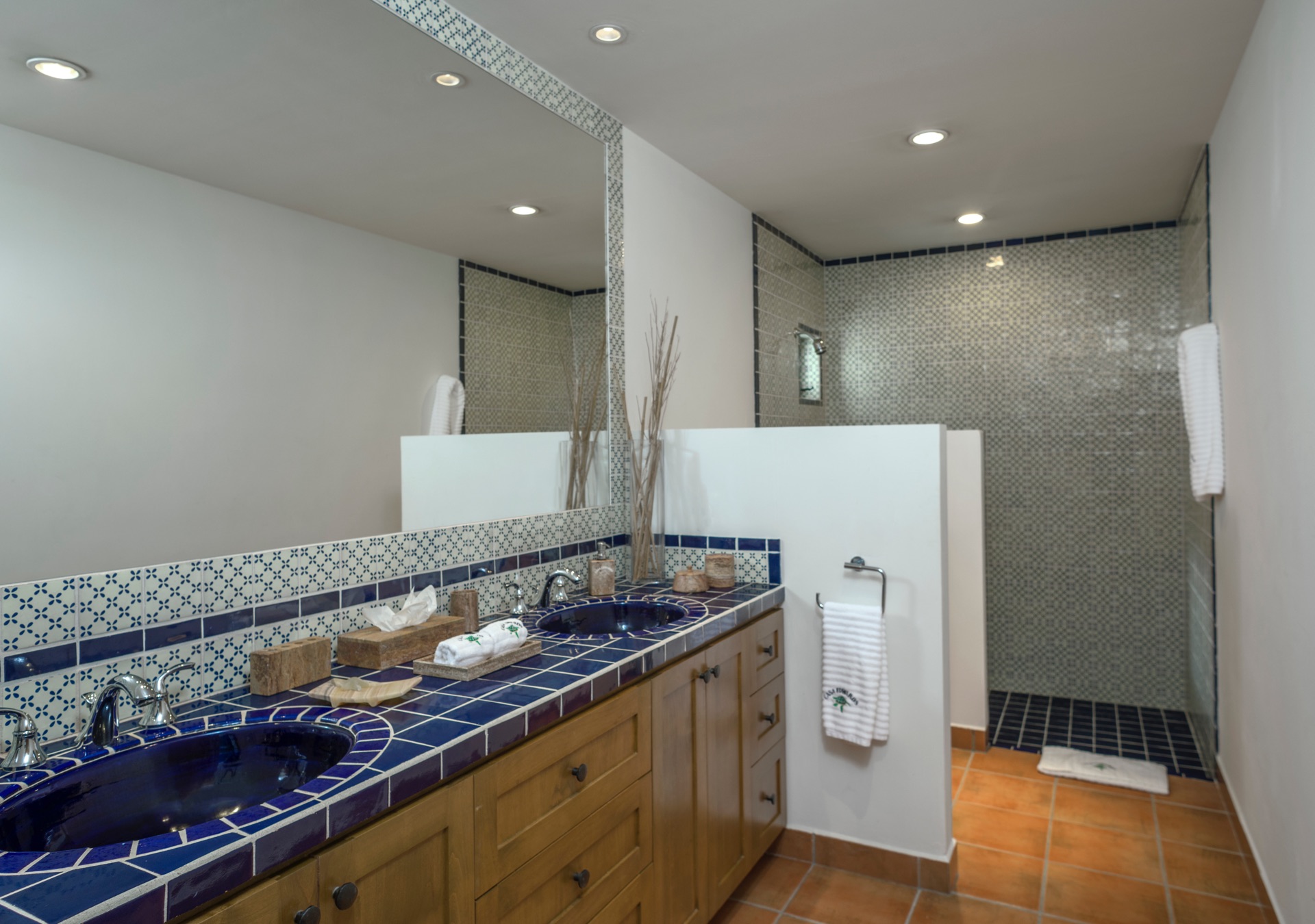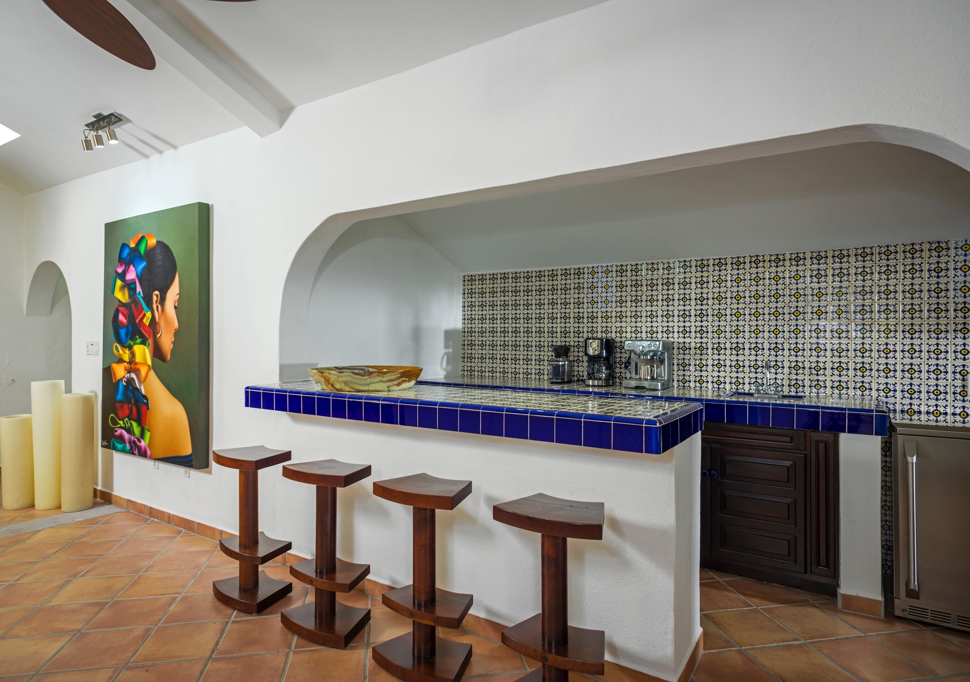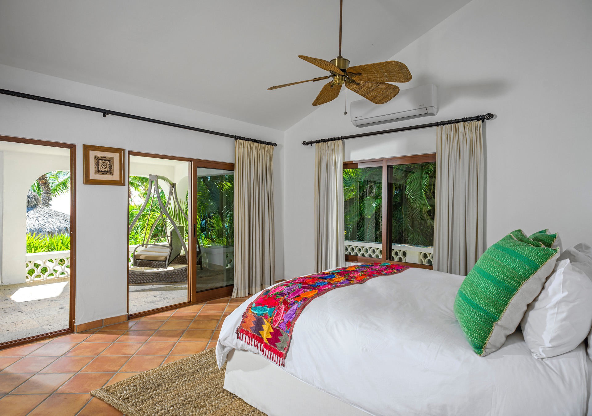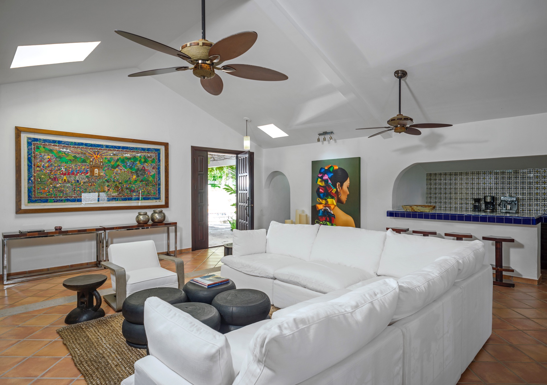The outdoor amenities at Casa Edwards are designed for relaxation and entertainment. The infinity pool overlooks the ocean and is surrounded by sun loungers and umbrellas. Adjacent to the pool is a Jacuzzi with stunning sea views. The outdoor palapa bar is perfect for sunset cocktails and casual gatherings. Guests have direct access to the villa’s private beach, steps away. The lush villa’s gardens, colorful tiles, and fountains create a serene atmosphere. Two gas fire pits provide cozy spots for evening gatherings. The outdoor kitchen and dining area, complete with a BBQ and bar, is perfect for alfresco meals, adjacent to a large lawn that enhances the outdoor experience.