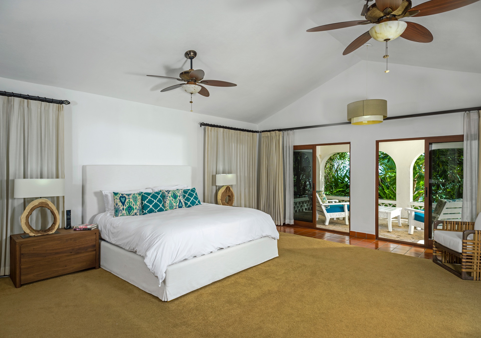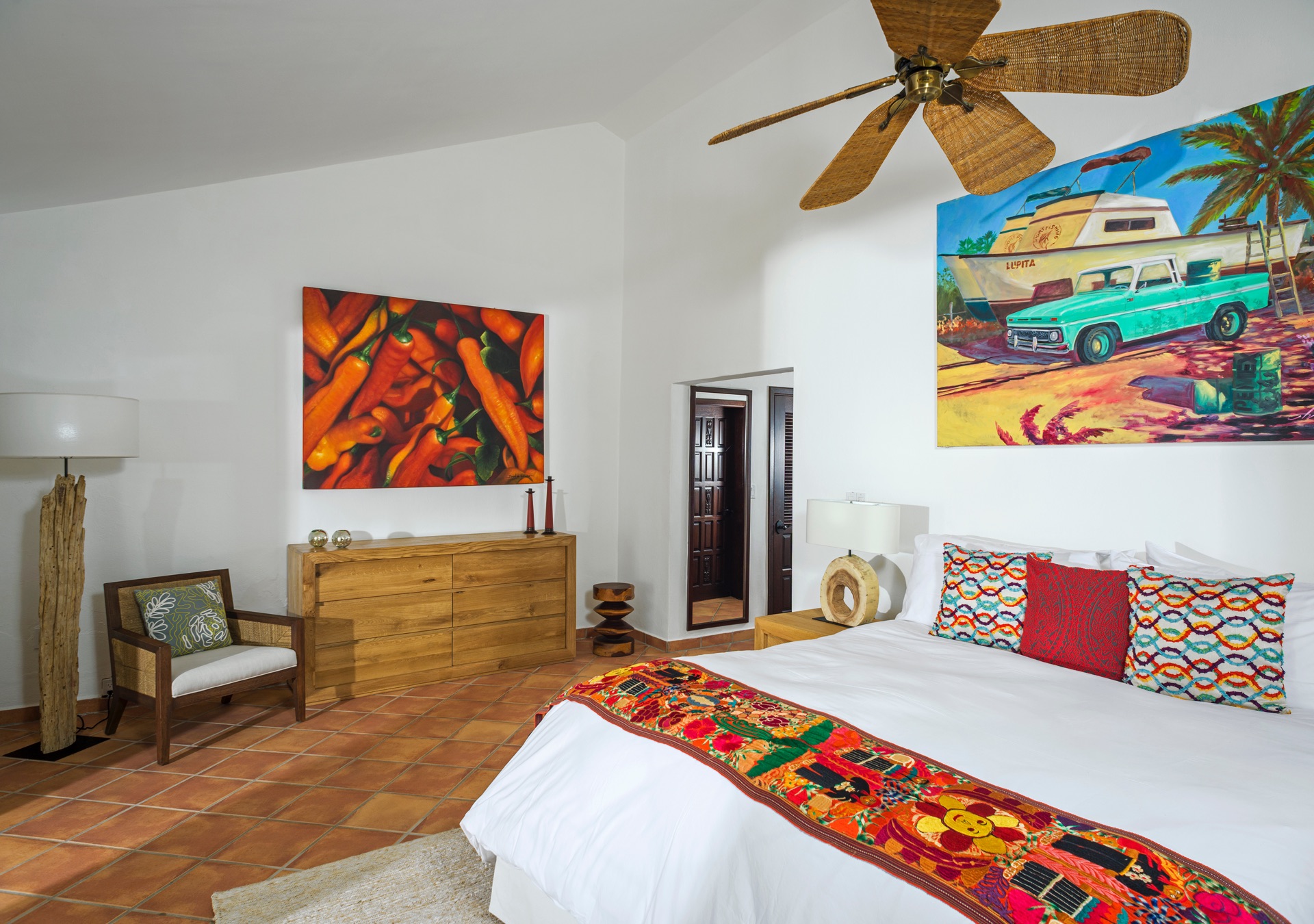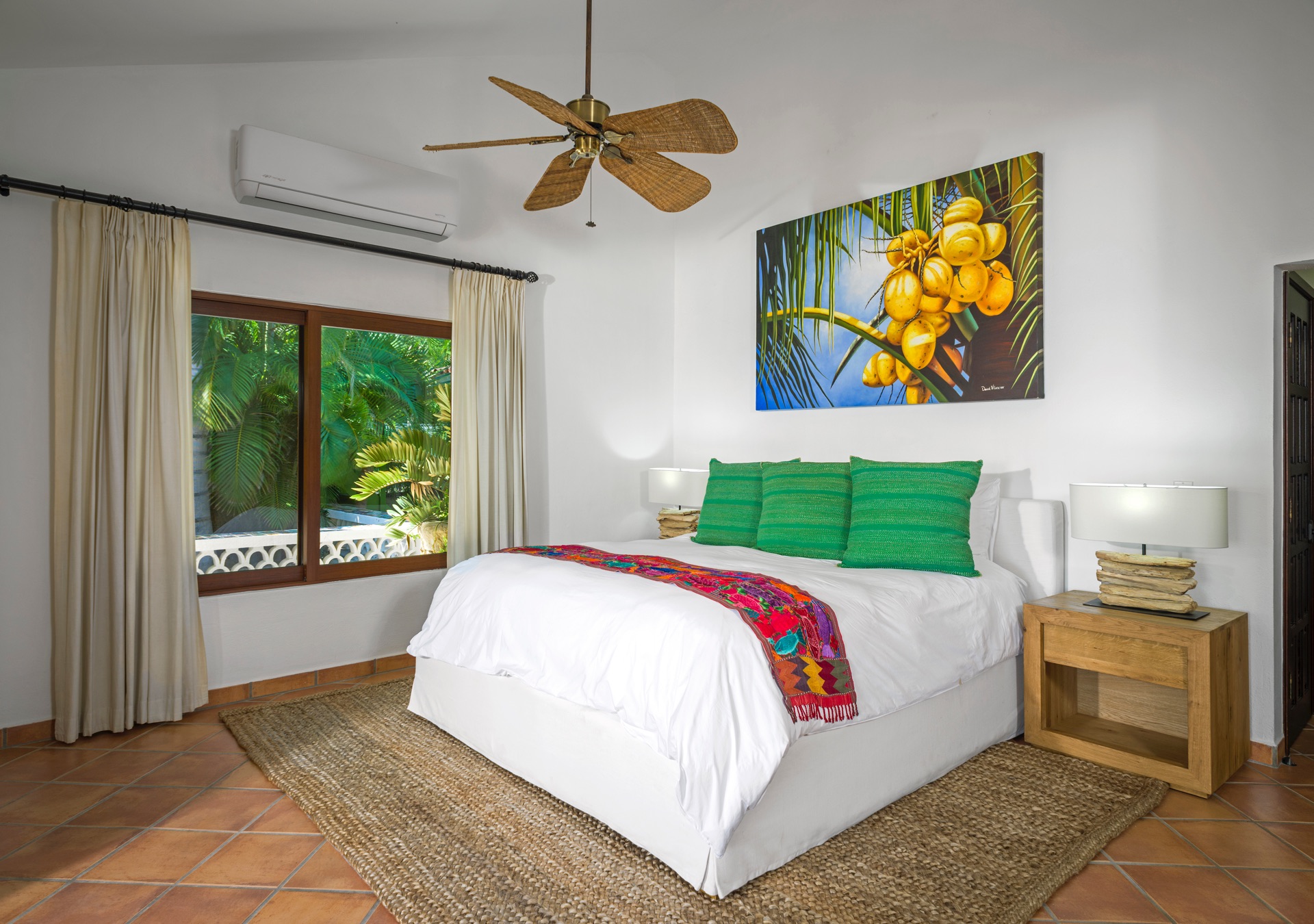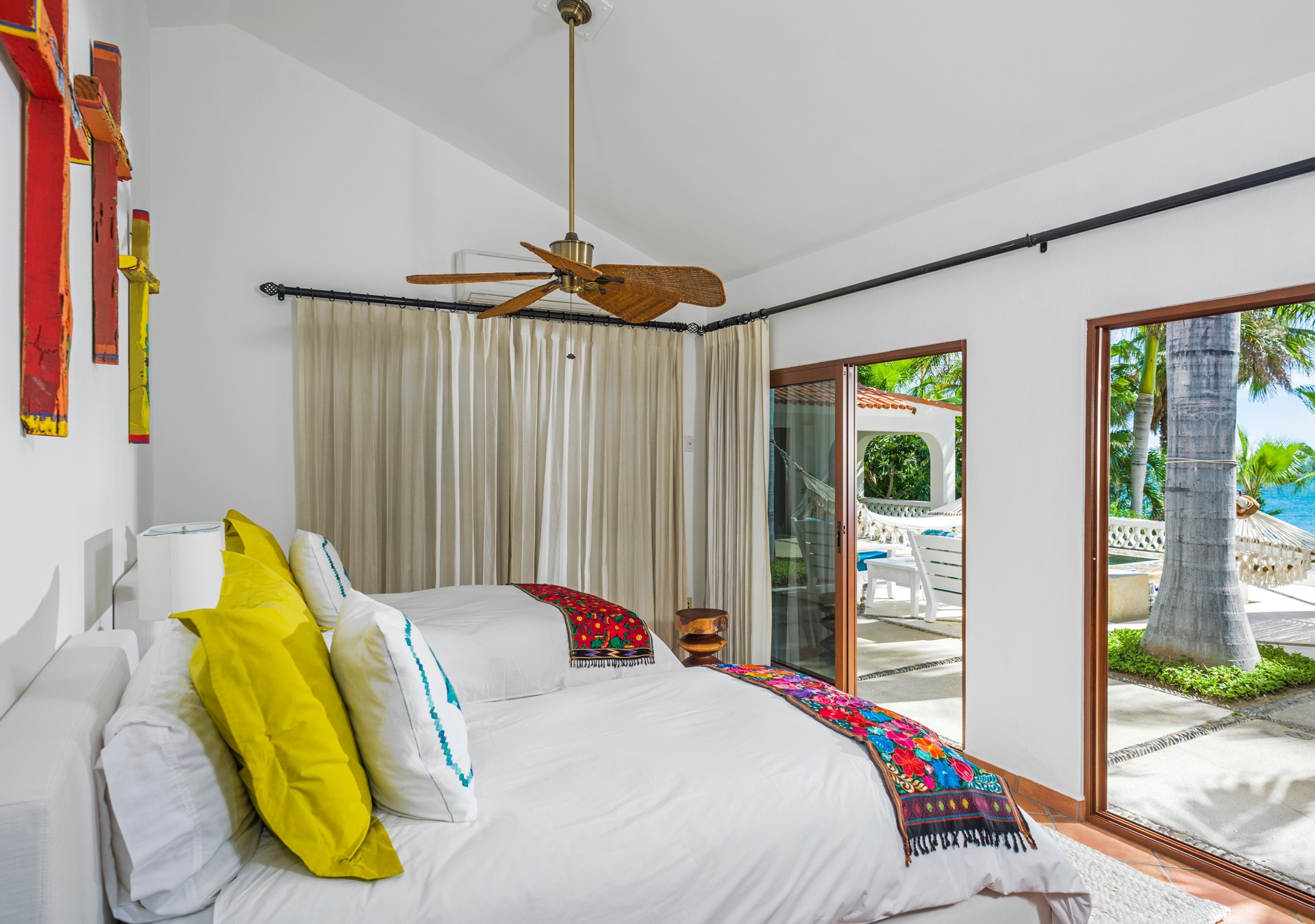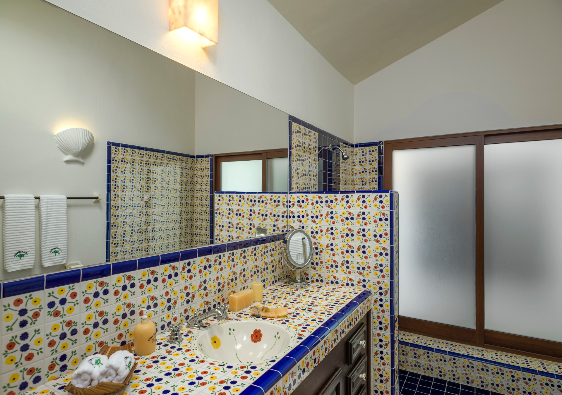 The outdoor amenities at Casa Edwards are designed for relaxation and entertainment. The infinity pool overlooks the ocean and is surrounded by sun loungers and umbrellas. Adjacent to the pool is a Jacuzzi with stunning sea views. The outdoor palapa bar is perfect for sunset cocktails and casual gatherings. Guests have direct access to the villa’s private beach, steps away. The lush villa’s gardens, colorful tiles, and fountains create a serene atmosphere. Two gas fire pits provide cozy spots for evening gatherings. The outdoor kitchen and dining area, complete with a BBQ and bar, is perfect for alfresco meals, adjacent to a large lawn that enhances the outdoor experience.