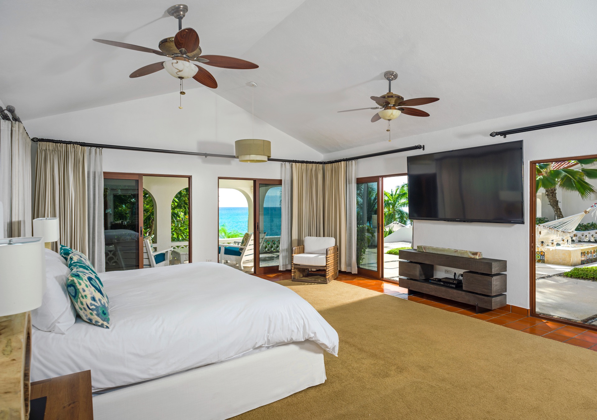 Main Bedroom 1 features a king-sized bed and two en-suite bathrooms, each with a toilet, tub, and shower. This luxurious room also includes an HDTV and a safety box. Through the sliding doors that open to the outside, guests will enjoy breathtaking ocean views.