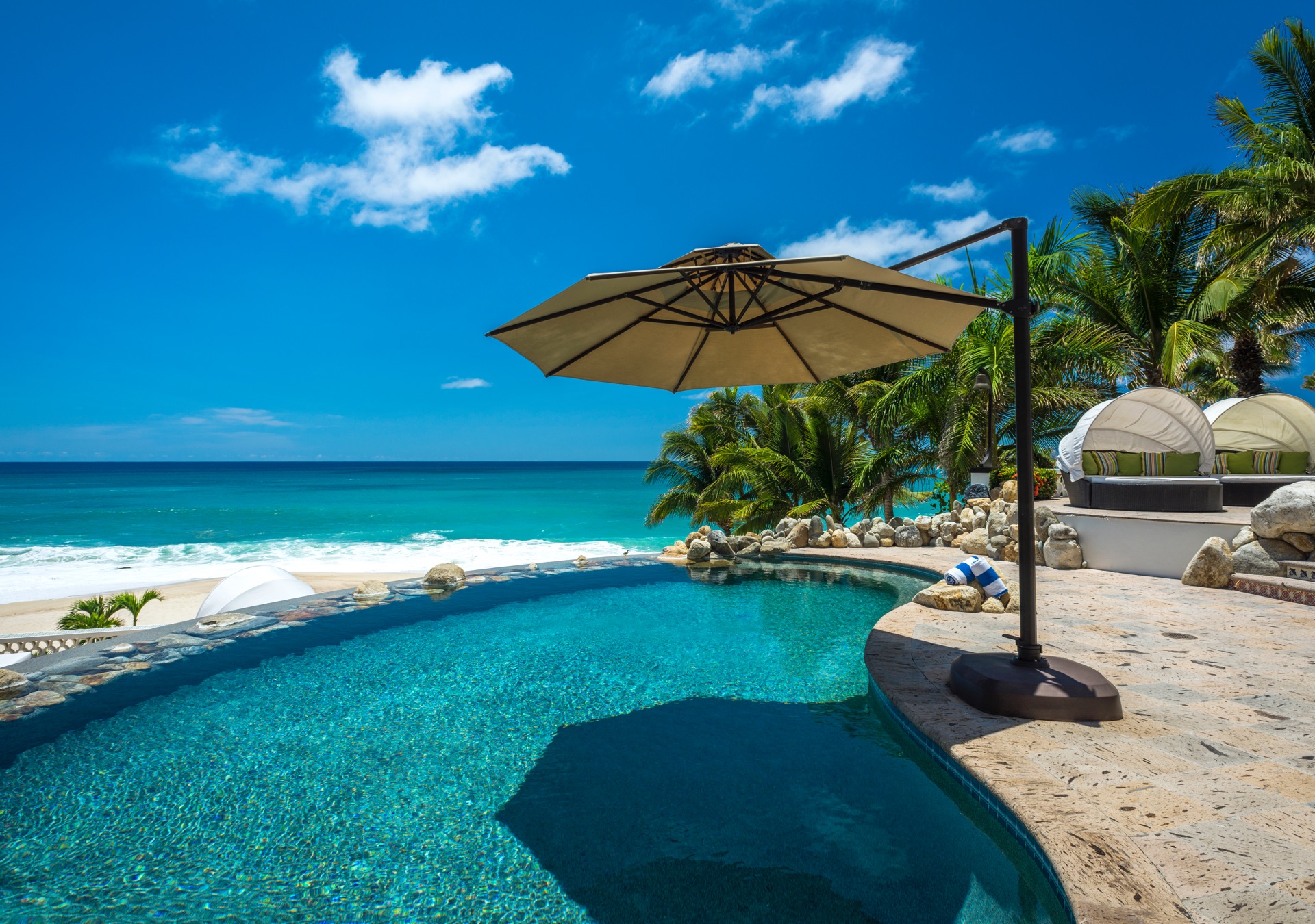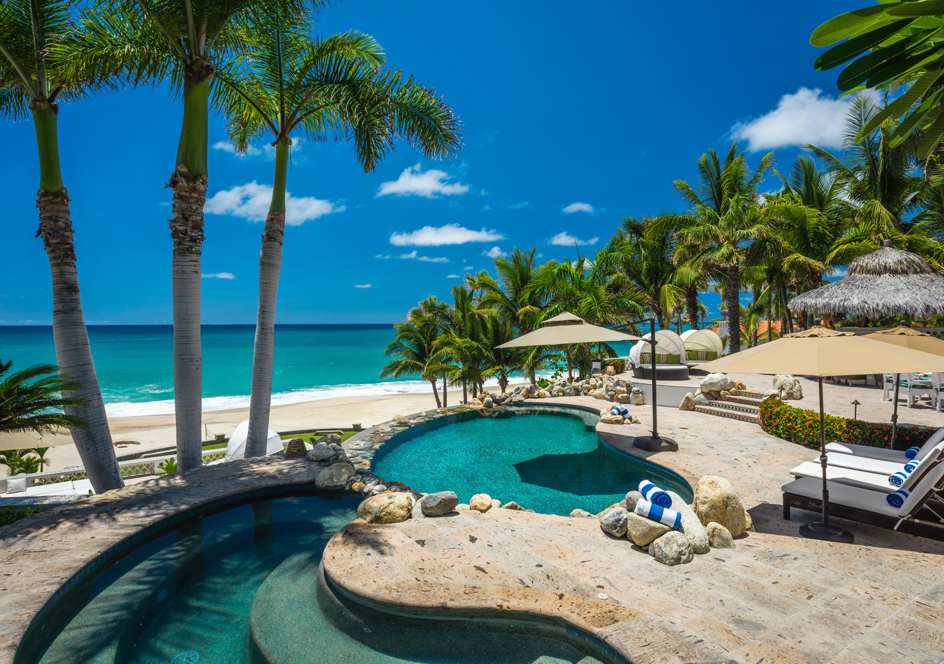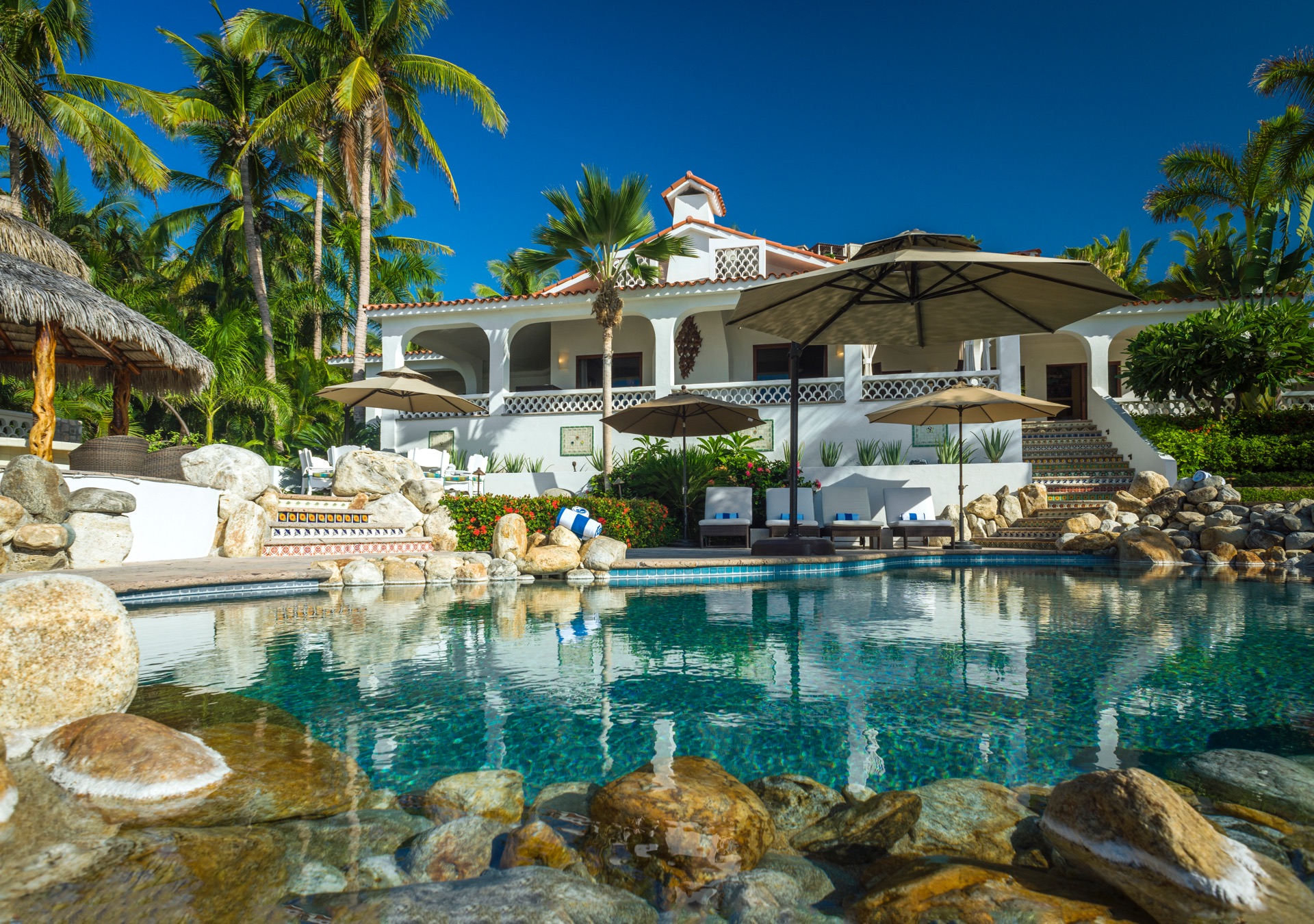 Historic Casa Edwards is one of the largest private estates in Los Cabos. It stands proudly within the ultra-exclusive gated community of Bahia Rocas, adjacent to Villas Del Mar at Palmilla. Positioned at the tip of the Baja Peninsula, this estate is just two homes away from the renowned One & Only Palmilla Hotel and a four-minute drive from the signature Jack Nicklaus Golf Course. The villa offers luxurious accommodations for up to 16 guests within its expansive 10,400 square feet of living space.
