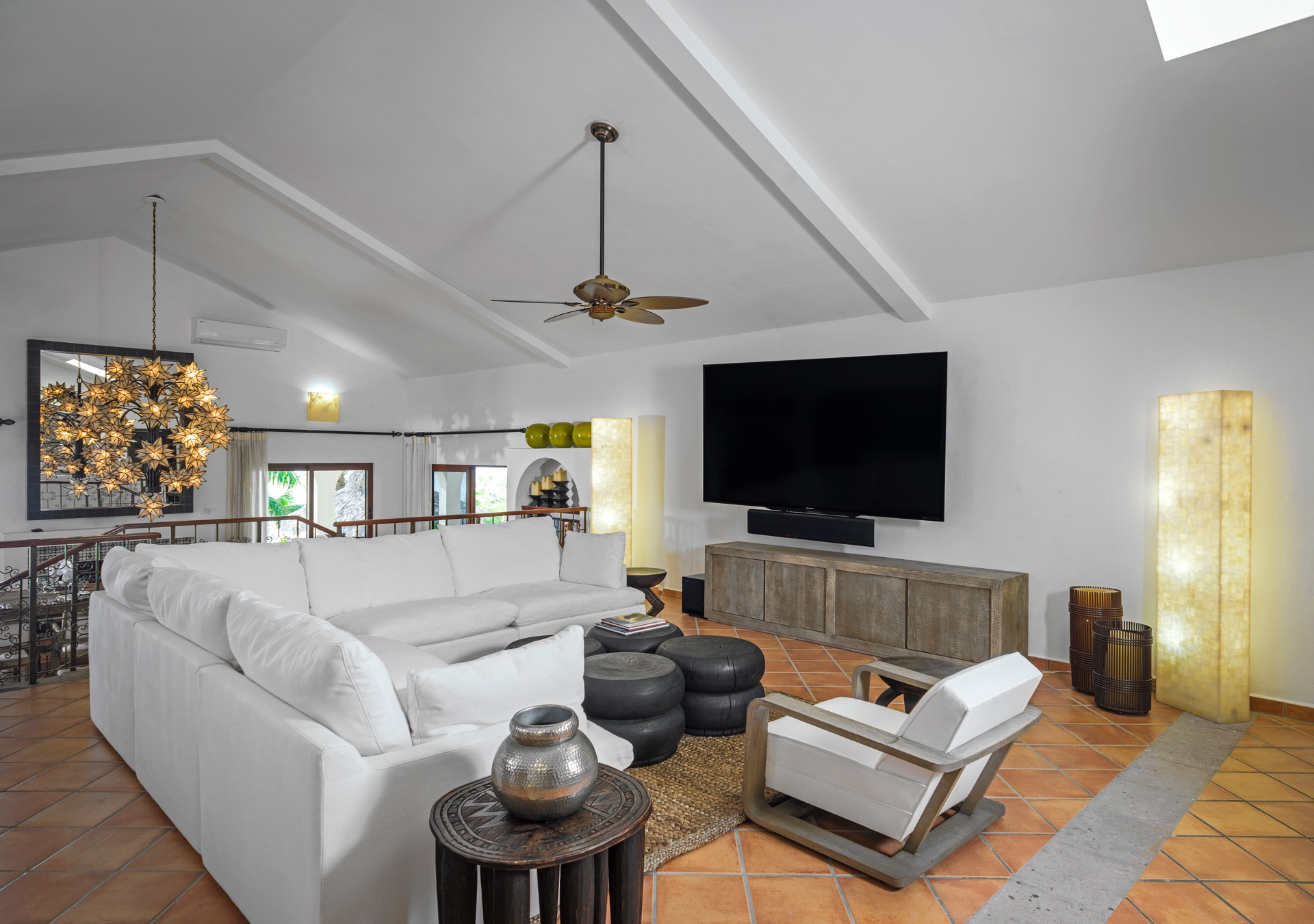 Casa Edwards boasts spacious living areas with luxurious furnishings and panoramic ocean views. The large living room features a 70-inch Plasma TV and a bar adjacent to the dining area, which can seat twelve or more guests. The gourmet kitchen has modern appliances, including a refrigerator, coffee maker, microwave, dishwasher, stove, toaster oven, BBQ, freezer, and kettle. The estate also includes the most extensive private gym in Cabo, with over ten screens, Apple TV, and state-of-the-art equipment. Full internet access is available throughout the house, along with a video library, music library, and video games for entertainment.