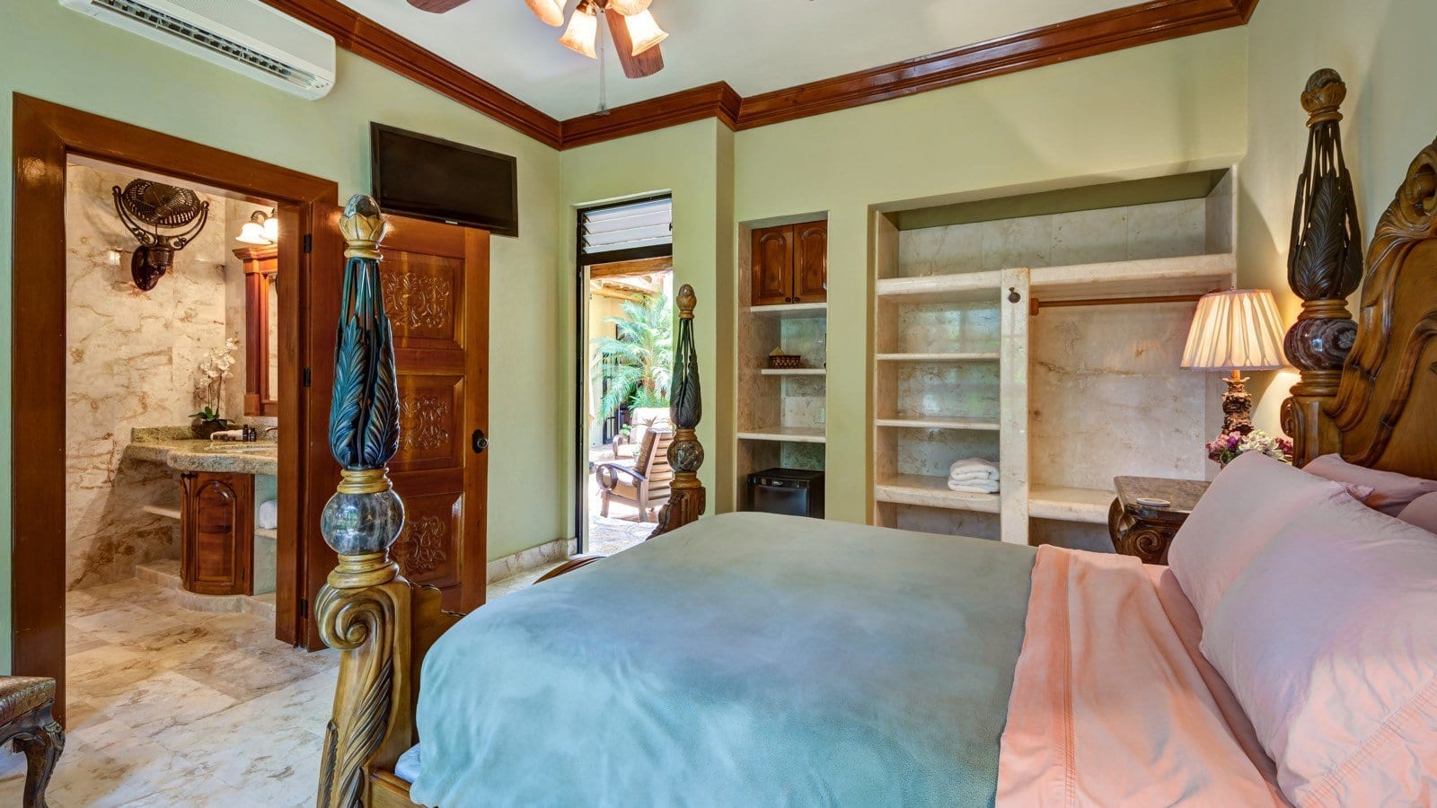 King size bed, Air conditioning, Blackout shades, Ceiling fan, Ensuite bathroom with shower, Flat screen satellite/smart TV, Garden view, Large private balcony, Mini fridge, Private entrance, Safety box, Toiletries, Wifi access
