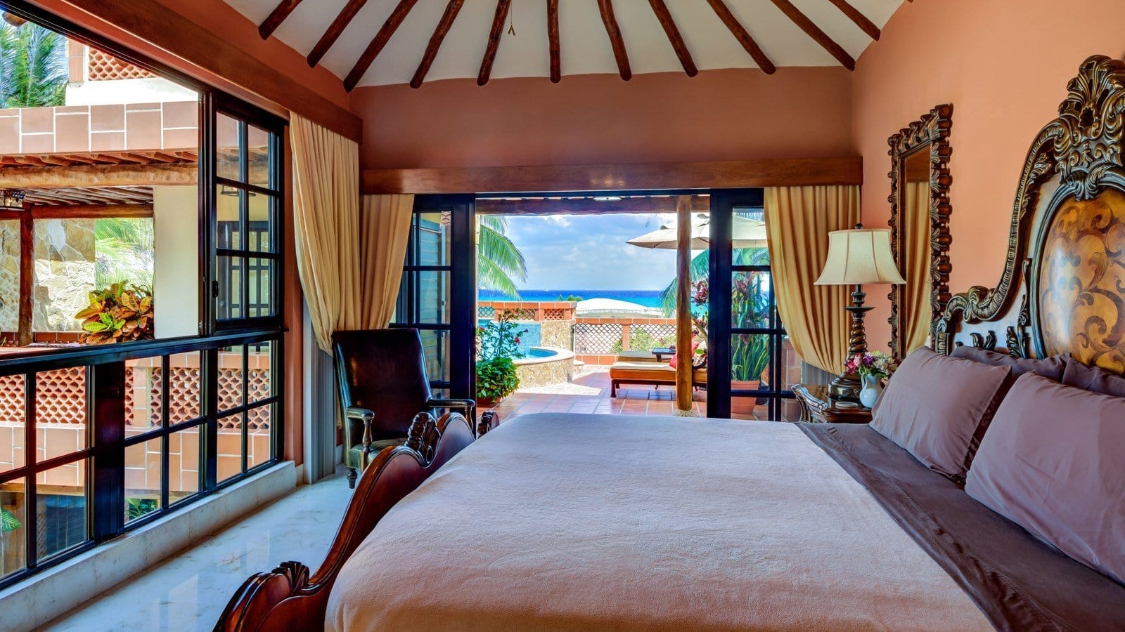 The Master Suite features a king-size bed, a private plunge pool, and a large private balcony with breathtaking ocean views. It also has a sofa bed, mini fridge, and microwave, making it a perfect space for relaxation. Guests enjoy a luxurious ensuite bathroom with a tub and shower and modern amenities such as a flat-screen satellite TV, safety box, and Wi-Fi access.