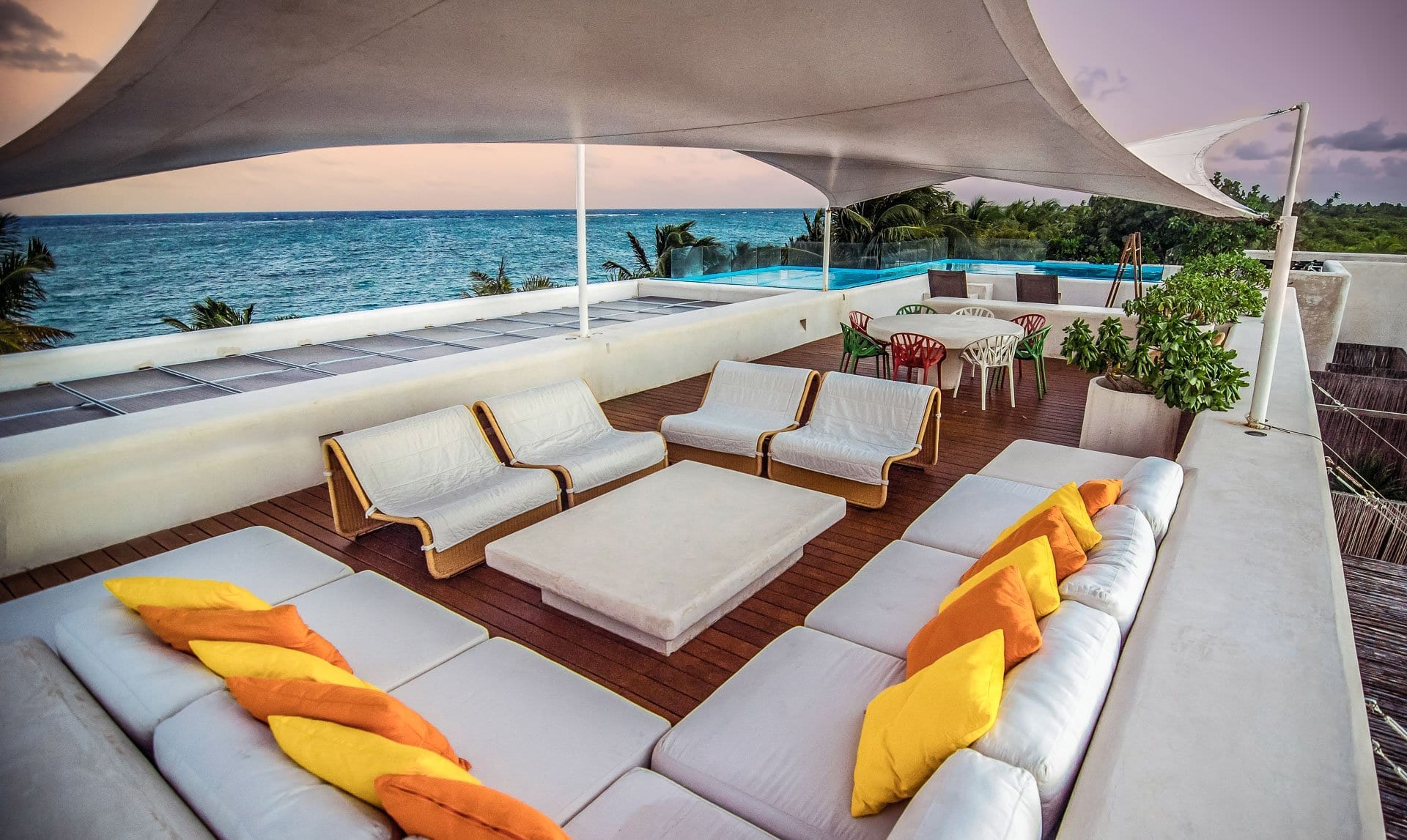 Designed by De Yturbe architects, the property is laid out around generous open-plan living and dining areas that flow into a fully fitted kitchen and extensive exterior decks. Four bedrooms and five bathrooms are distributed to accommodate groups comfortably, with both indoor and outdoor spaces allowing guests to gather or find privacy as they wish. A rooftop level with hardwood decking, green roofs, and a double infinity swimming pool extends the living areas vertically, adding another dimension to the home’s spatial experience.