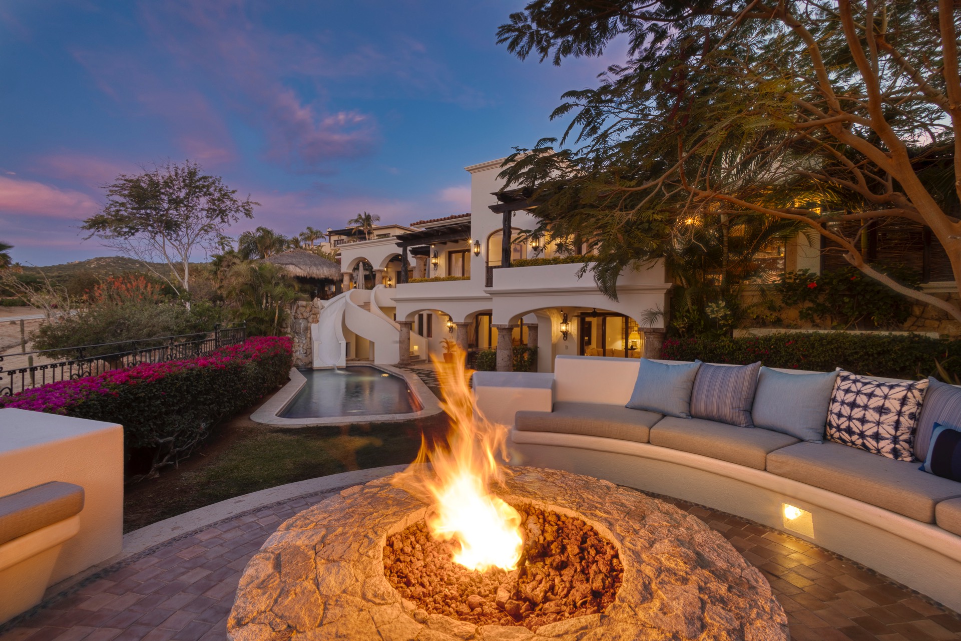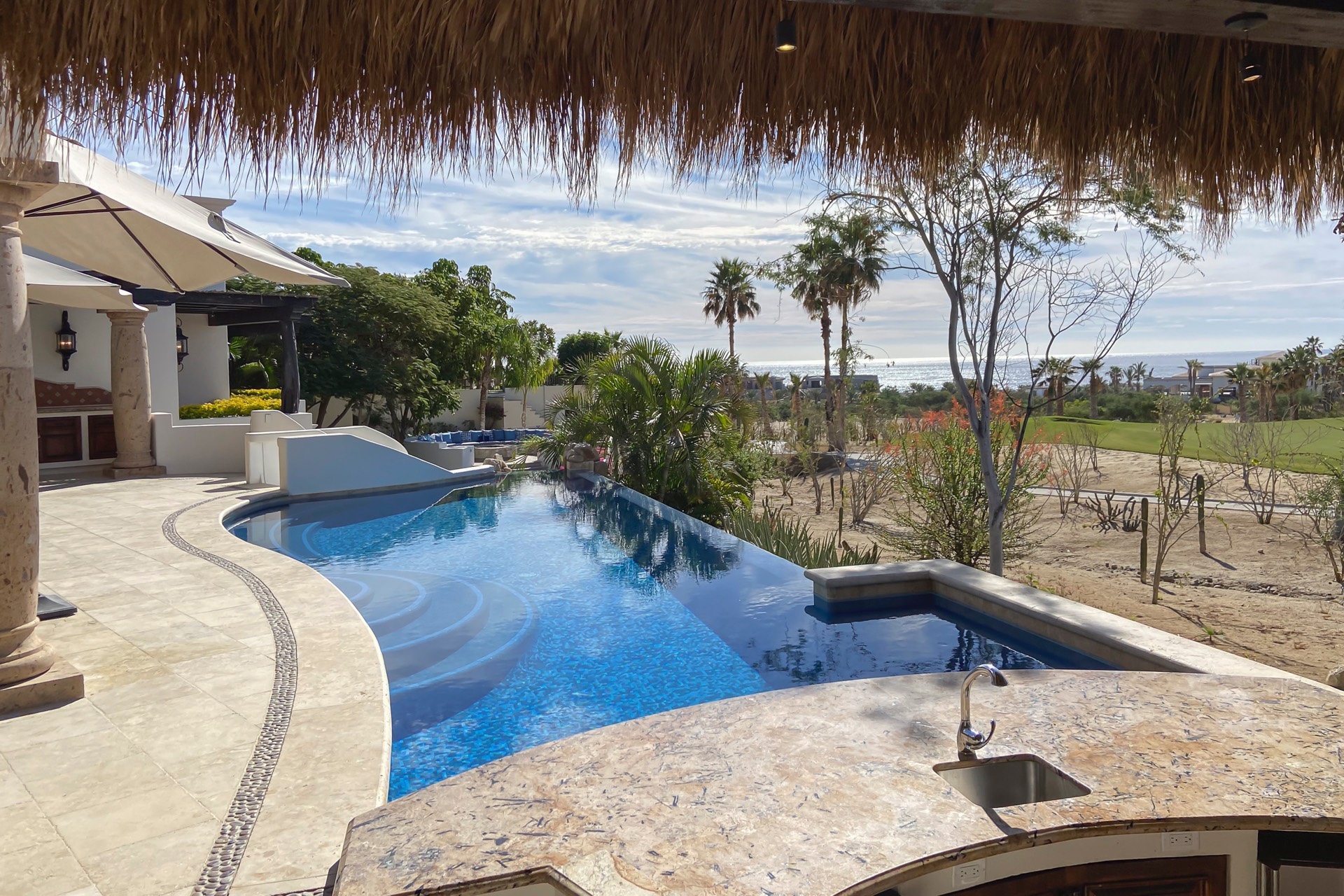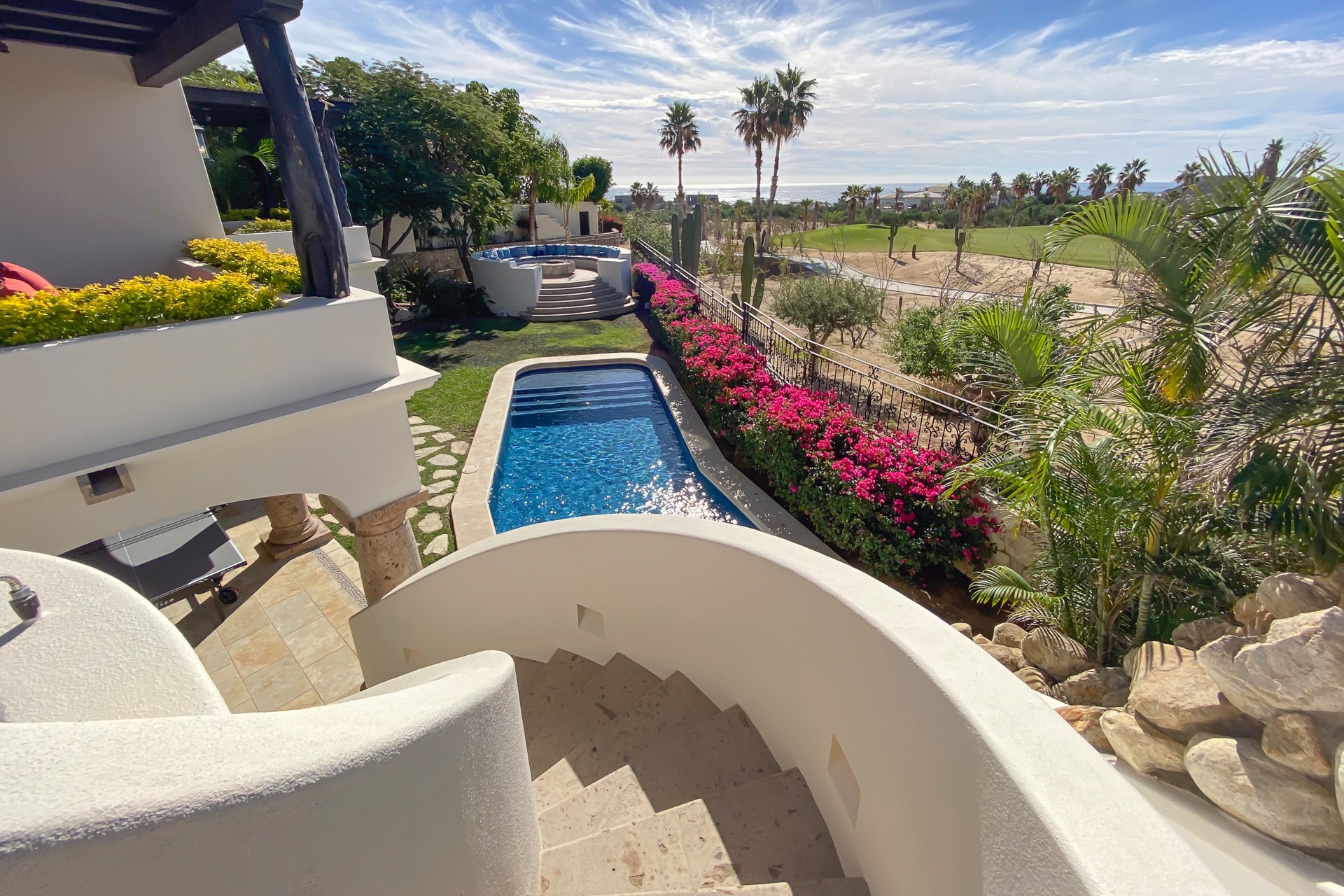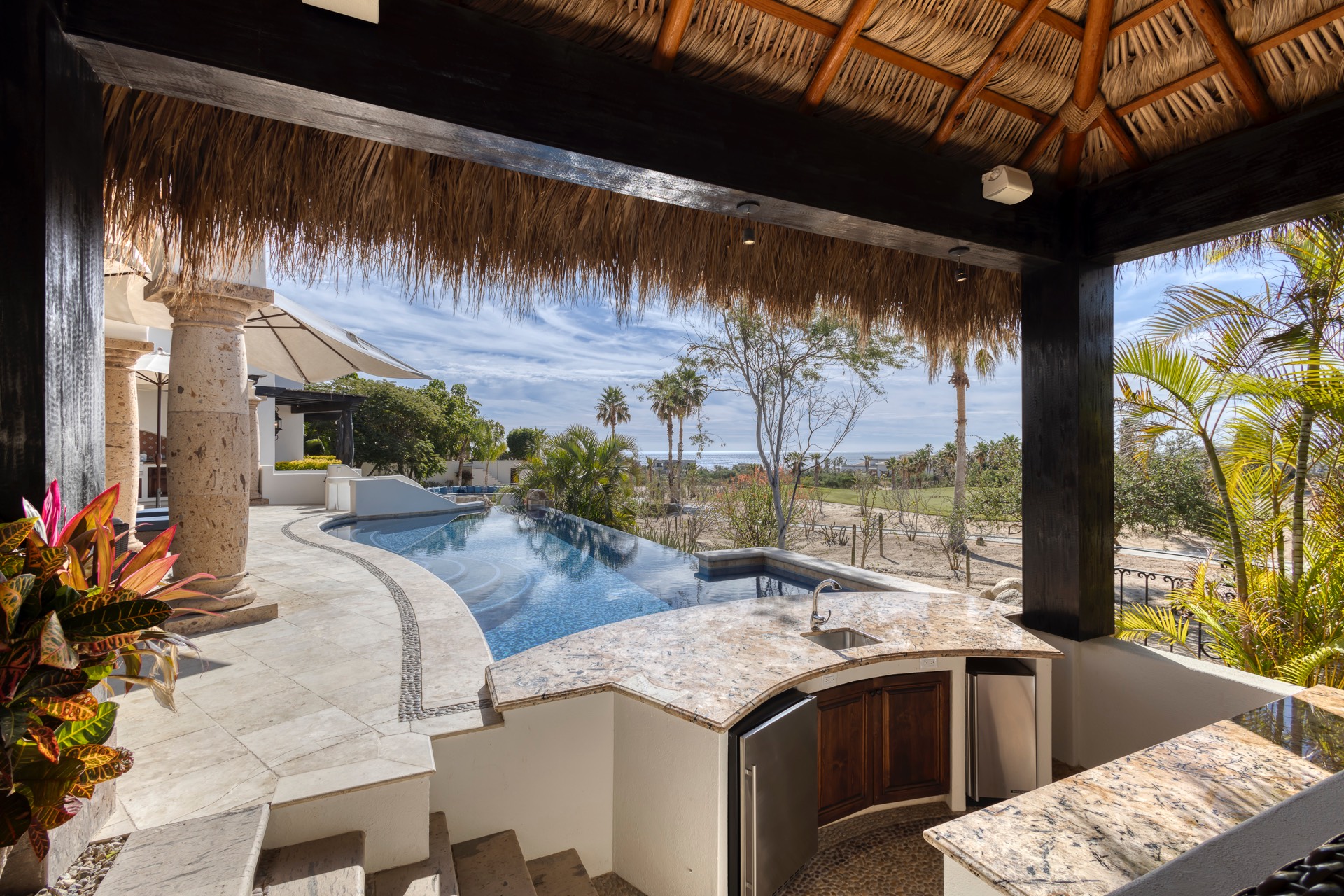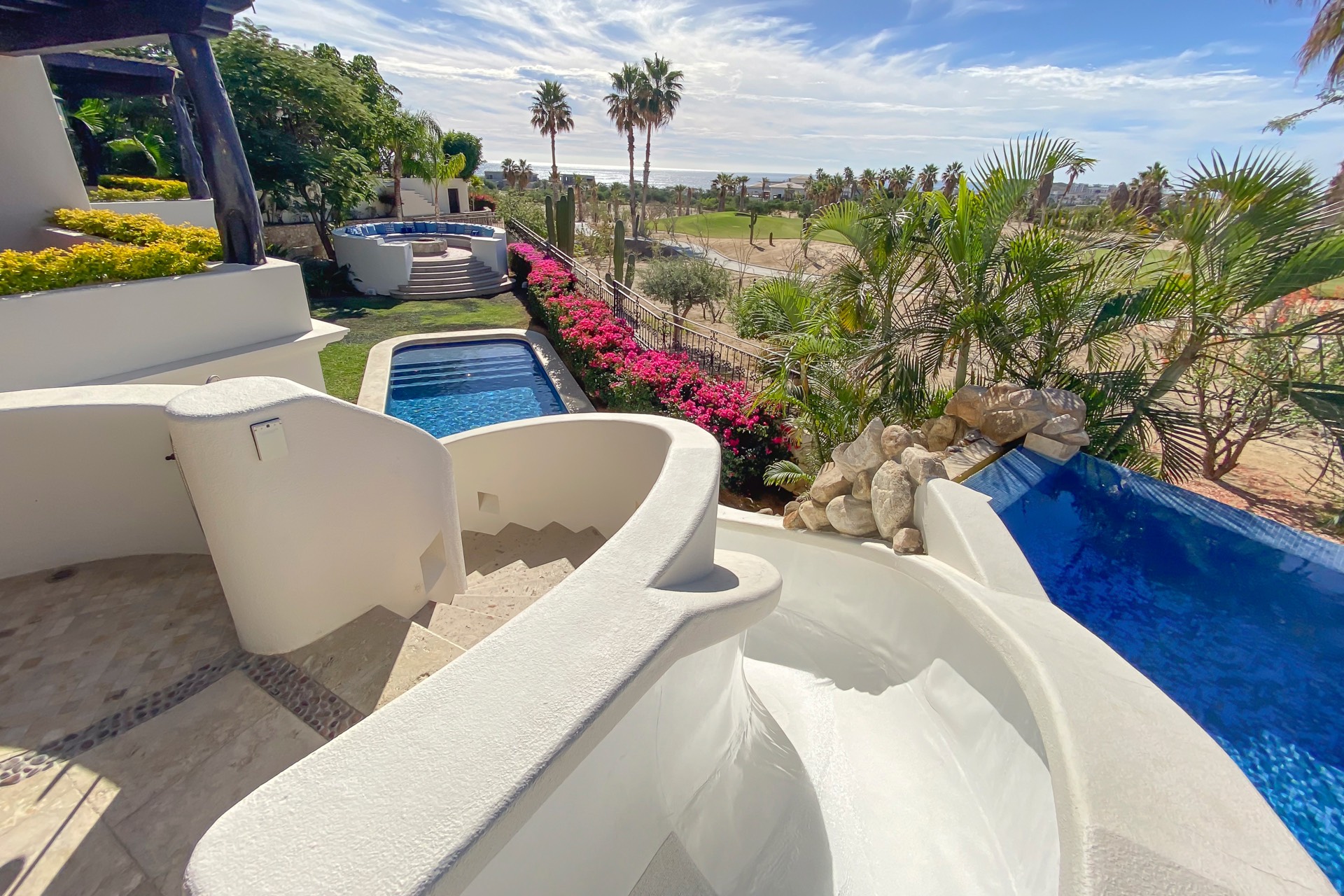 The outdoor area features fantastic ocean and golf views, two pools with a water slide, an oversized fire pit area, six bedrooms with exterior seating areas, an exterior gas BBQ, a poolside palapa, a swim-up bar, a jacuzzi, and an additional palapa for lounging with golf and ocean views, providing ample space and amenities for outdoor enjoyment.