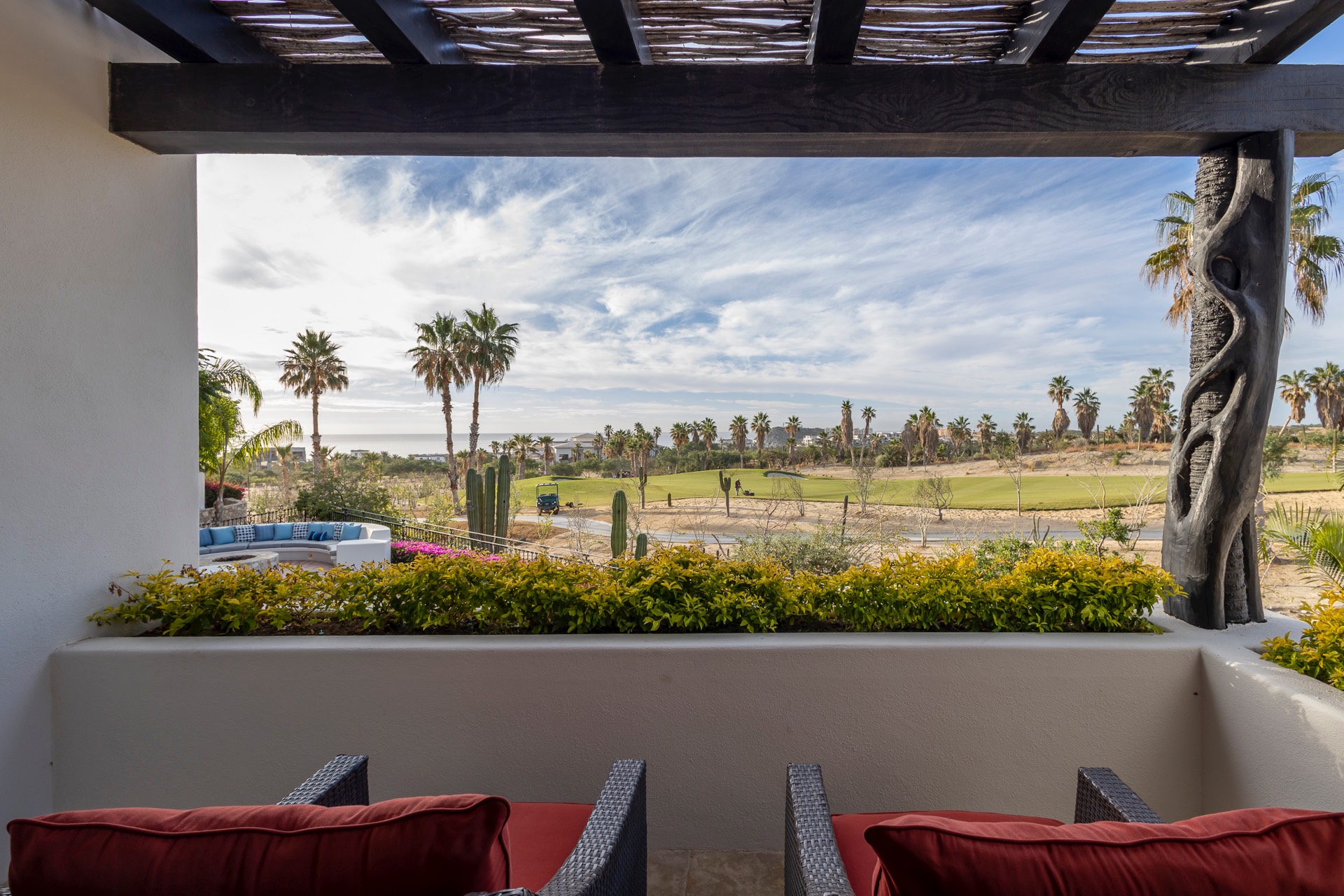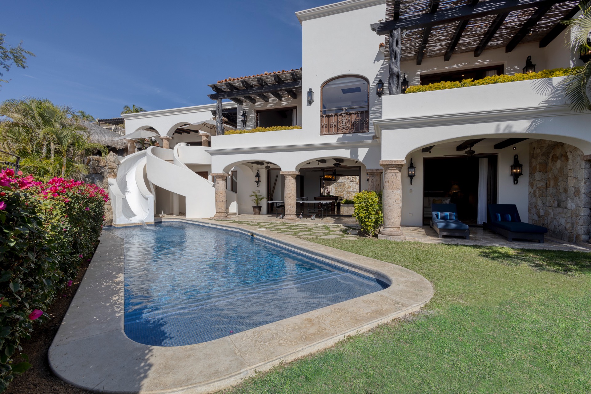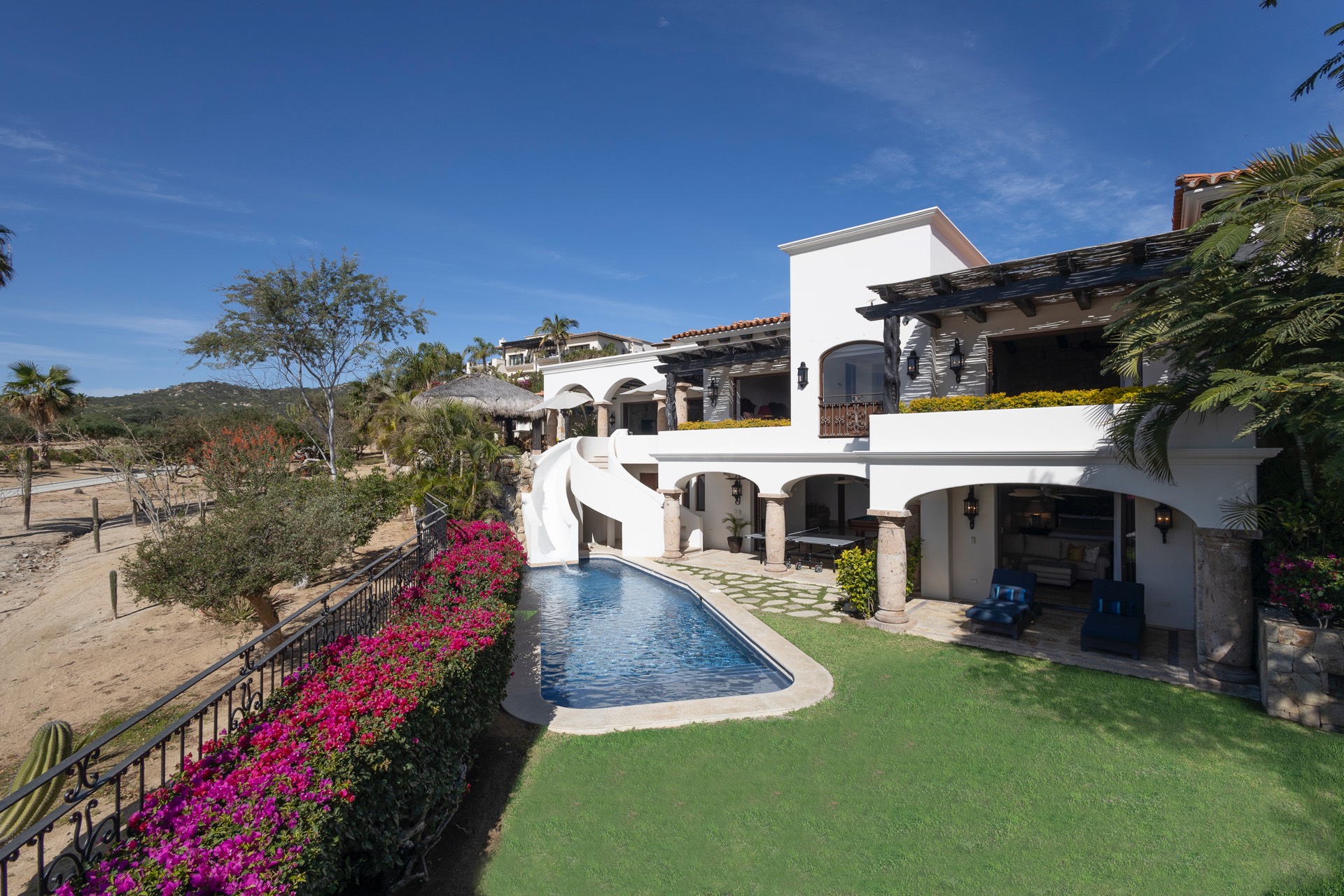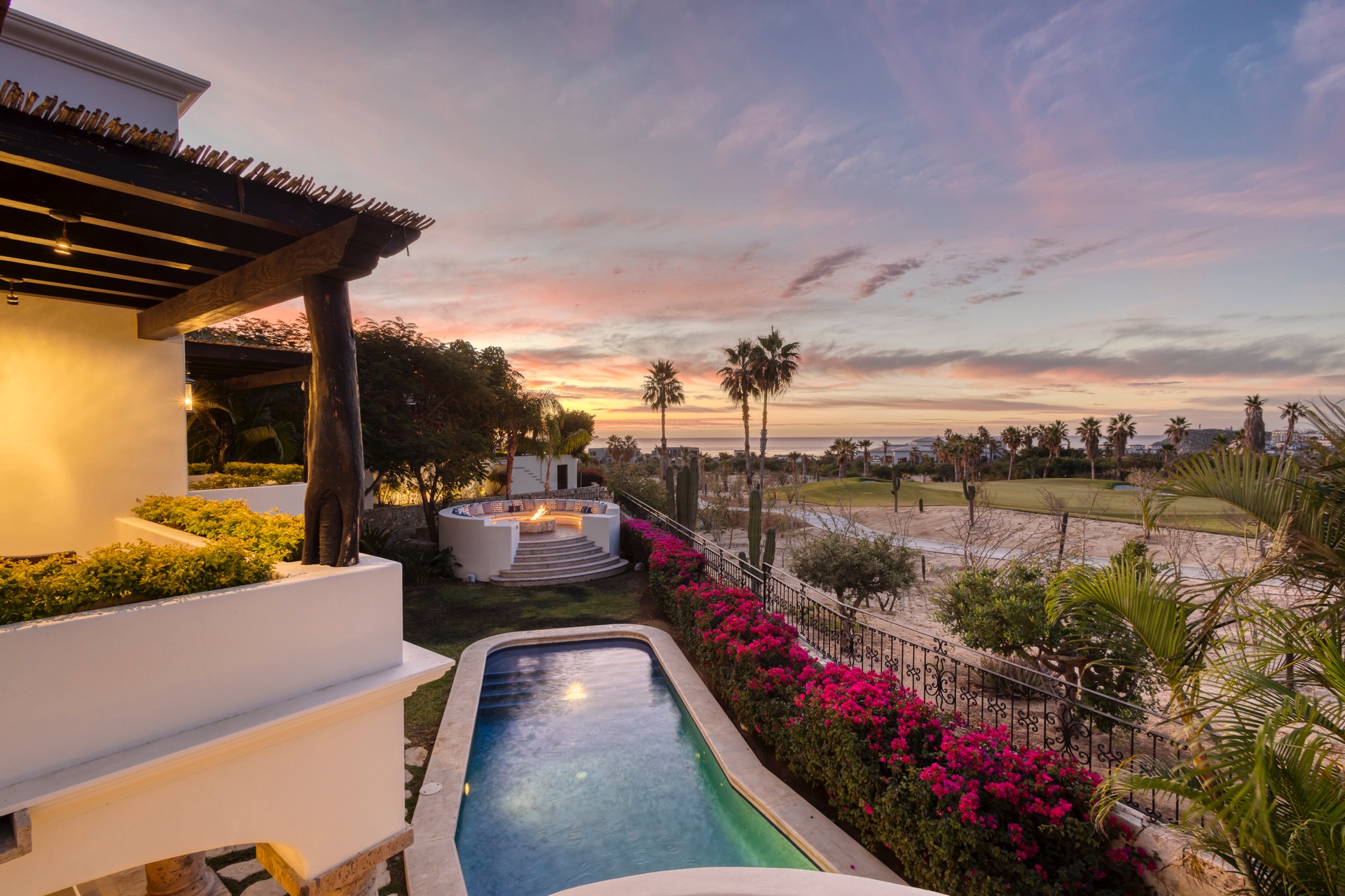 The outdoor area features fantastic ocean and golf views, two pools with a water slide, an oversized fire pit area, six bedrooms with exterior seating areas, an exterior gas BBQ, a poolside palapa, a swim-up bar, a jacuzzi, and an additional palapa for lounging with golf and ocean views, providing ample space and amenities for outdoor enjoyment.