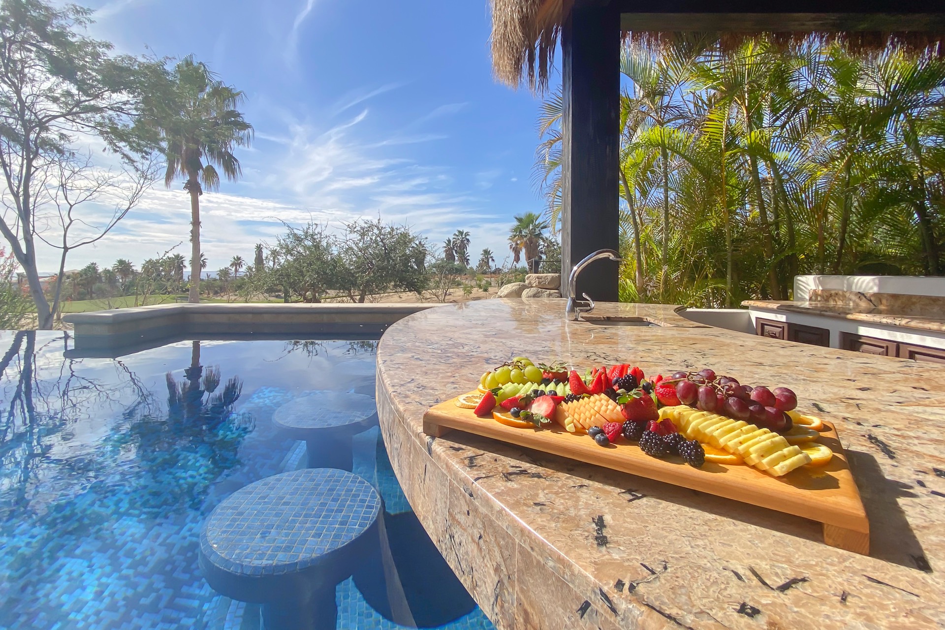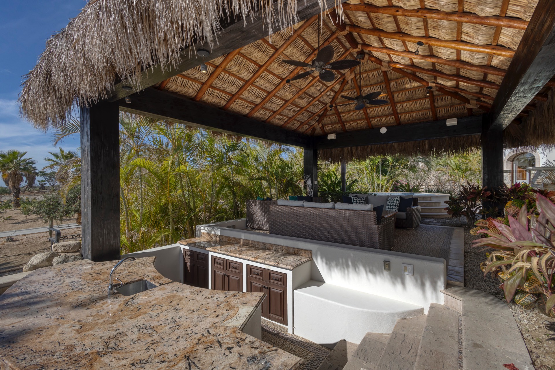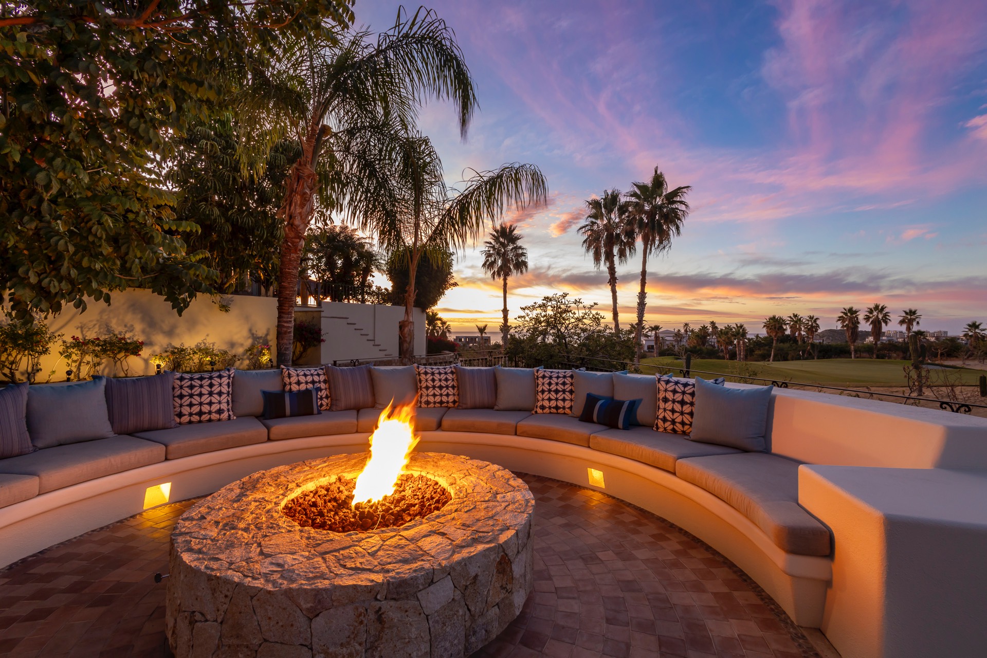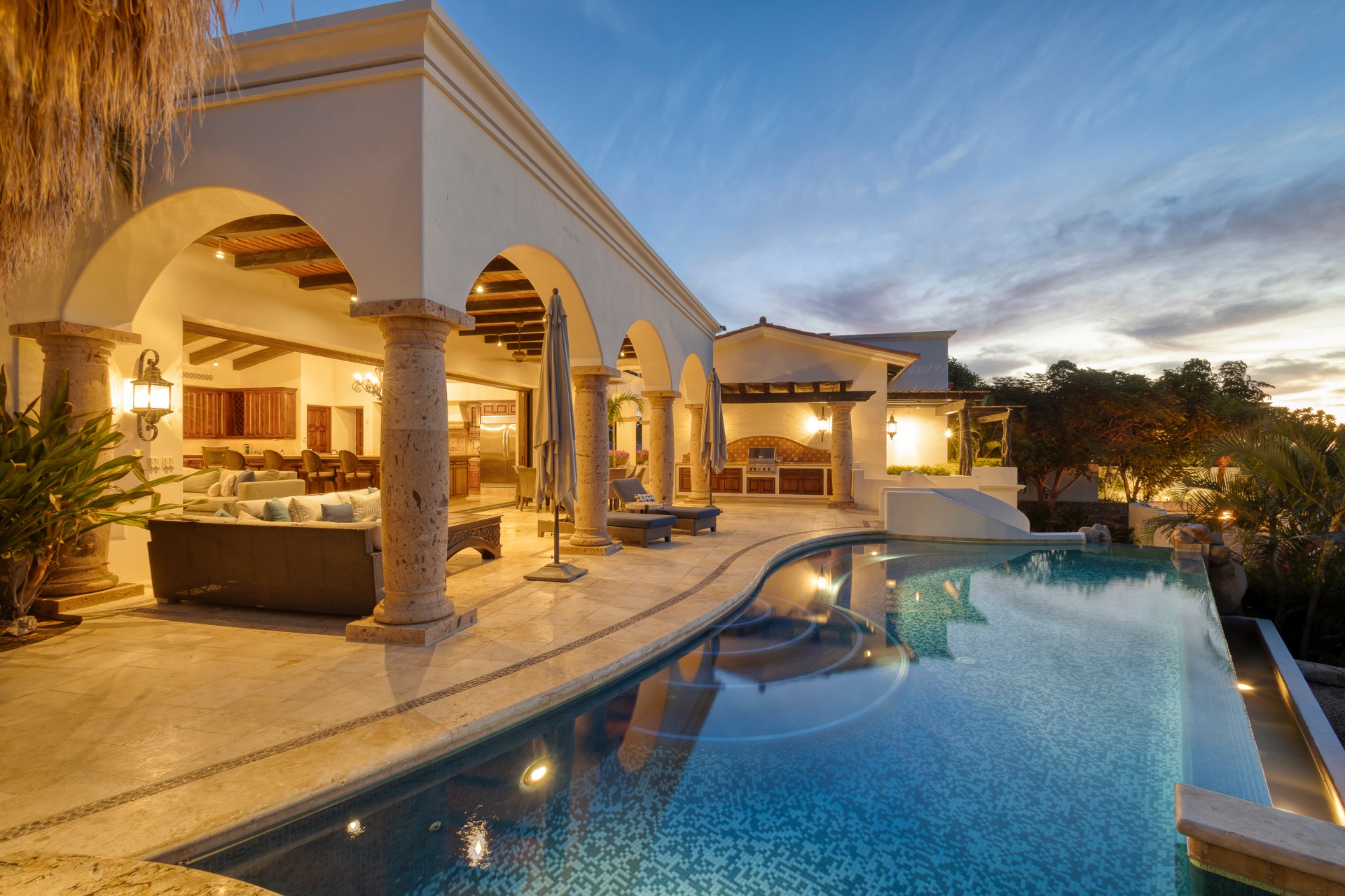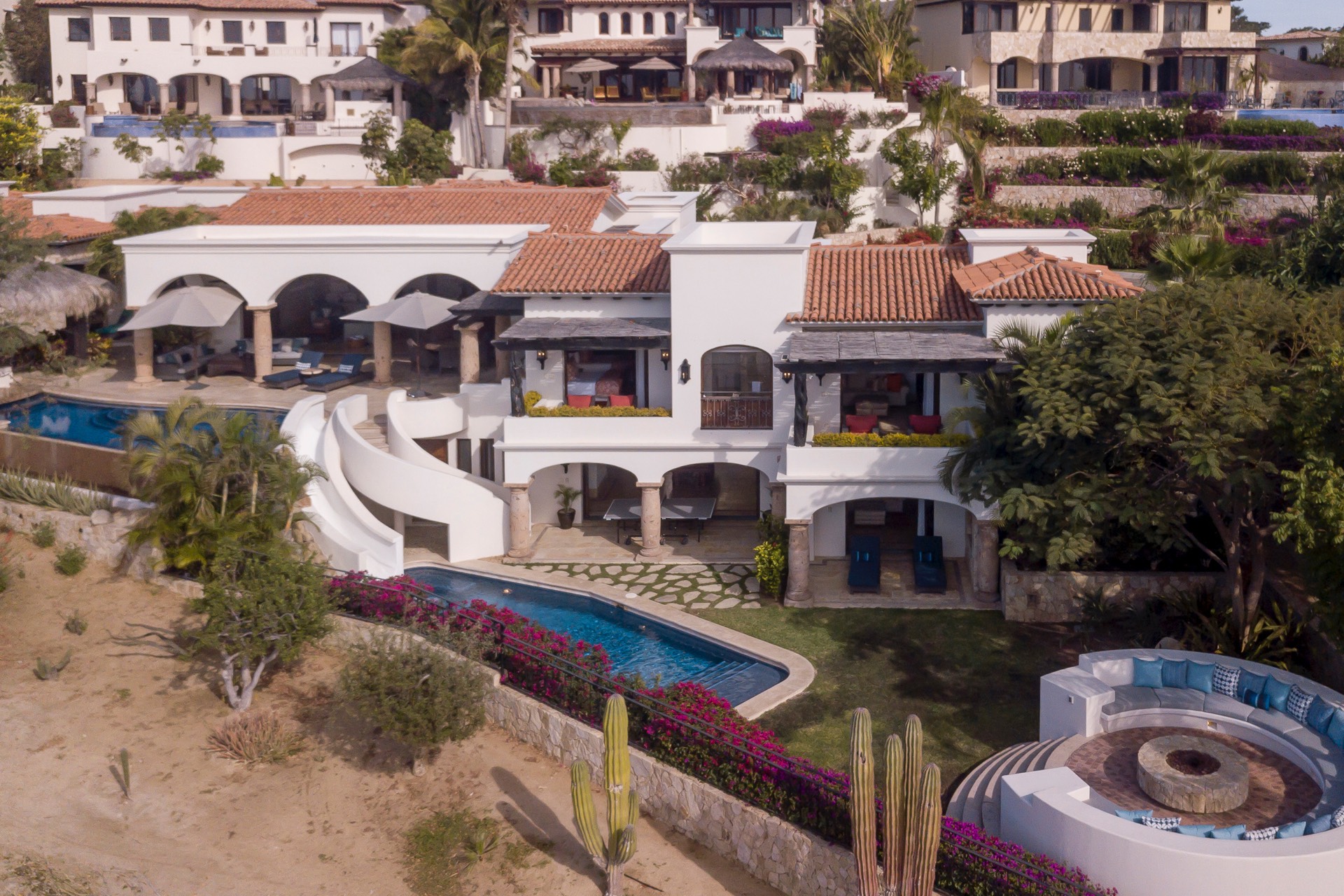 The outdoor area features fantastic ocean and golf views, two pools with a water slide, an oversized fire pit area, six bedrooms with exterior seating areas, an exterior gas BBQ, a poolside palapa, a swim-up bar, a jacuzzi, and an additional palapa for lounging with golf and ocean views, providing ample space and amenities for outdoor enjoyment.
