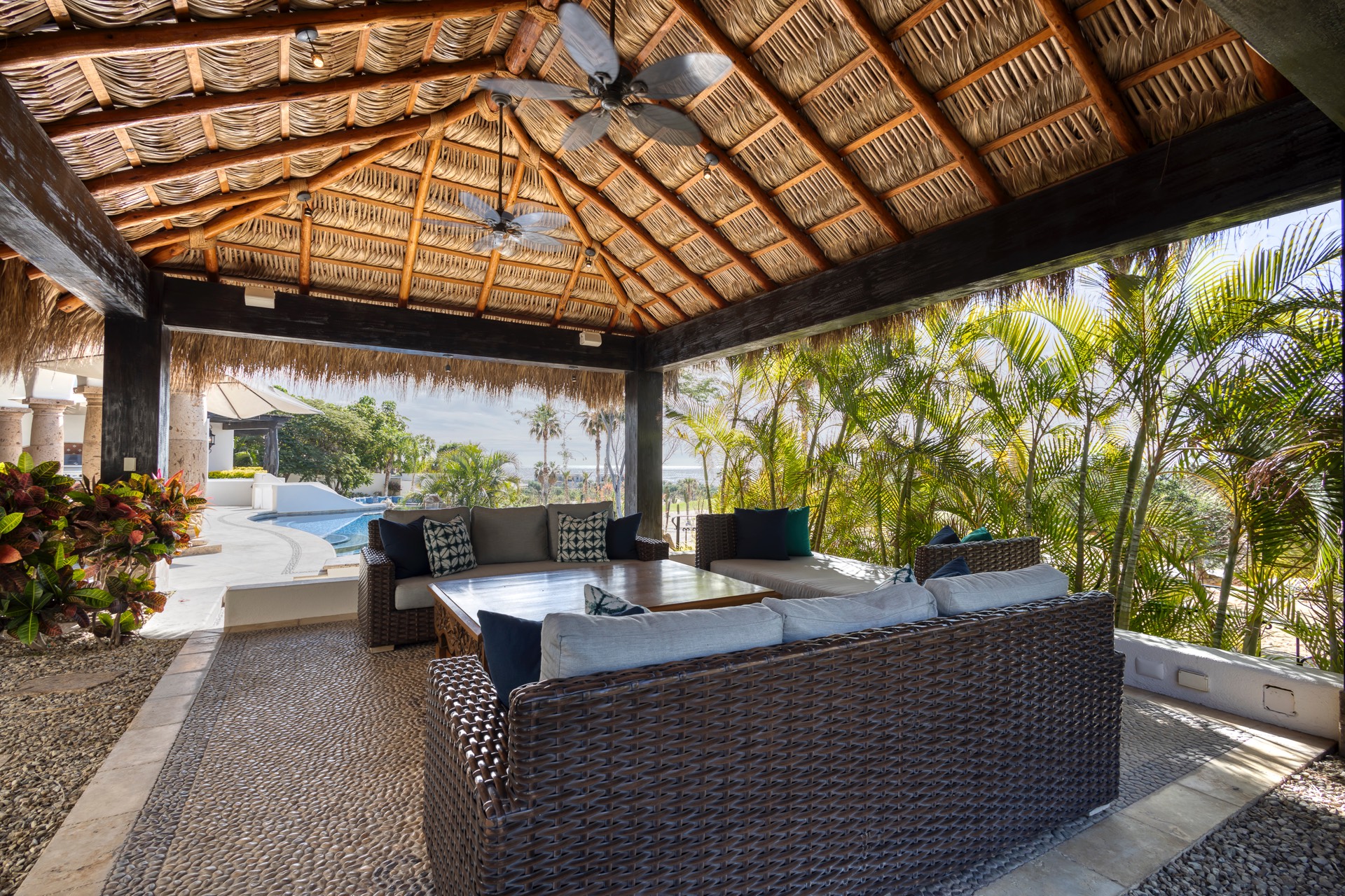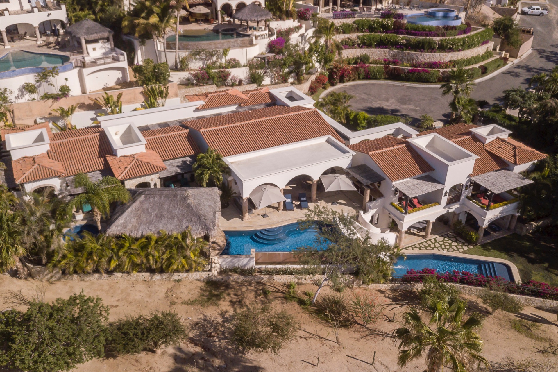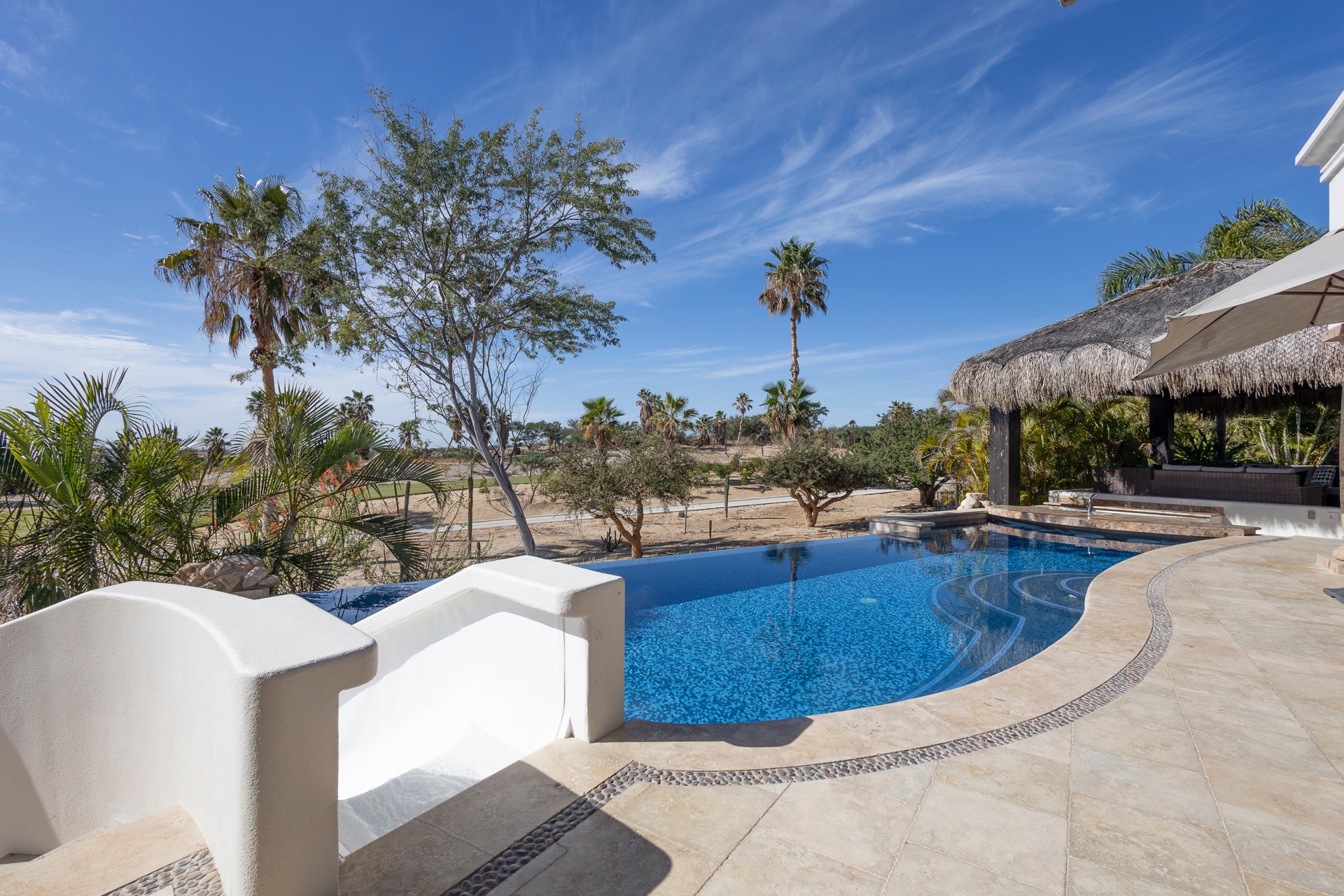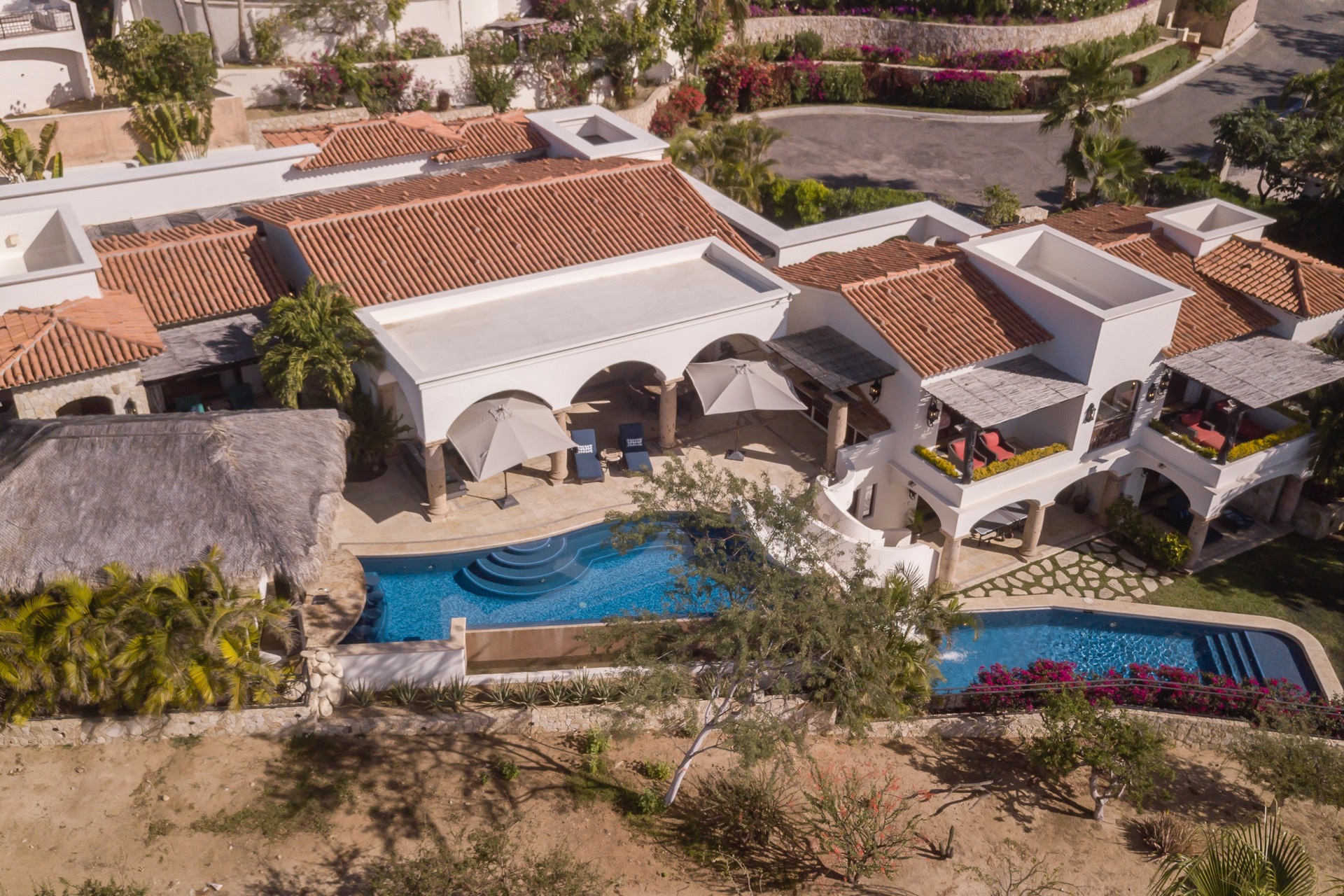 The outdoor area features fantastic ocean and golf views, two pools with a water slide, an oversized fire pit area, six bedrooms with exterior seating areas, an exterior gas BBQ, a poolside palapa, a swim-up bar, a jacuzzi, and an additional palapa for lounging with golf and ocean views, providing ample space and amenities for outdoor enjoyment.