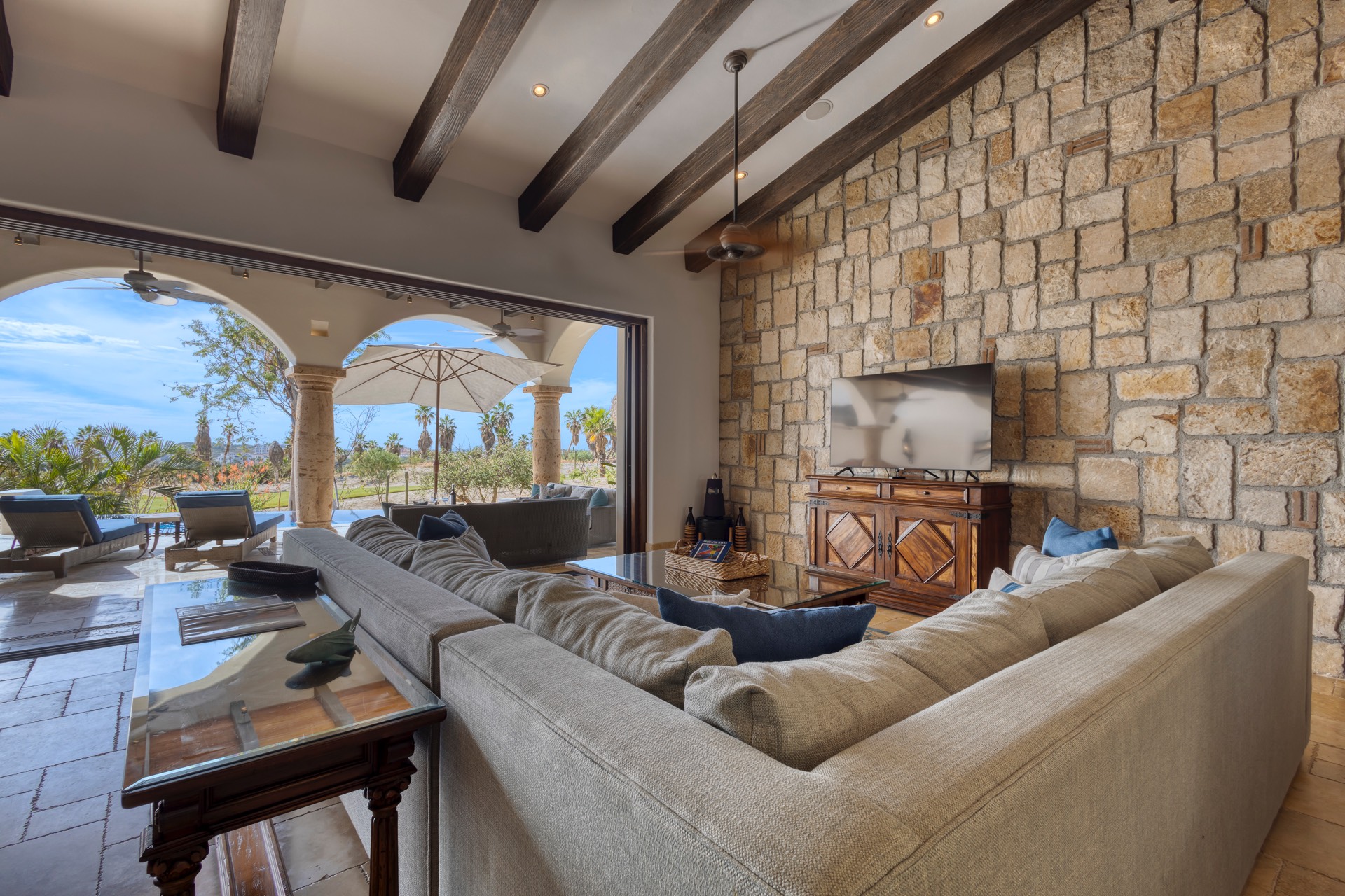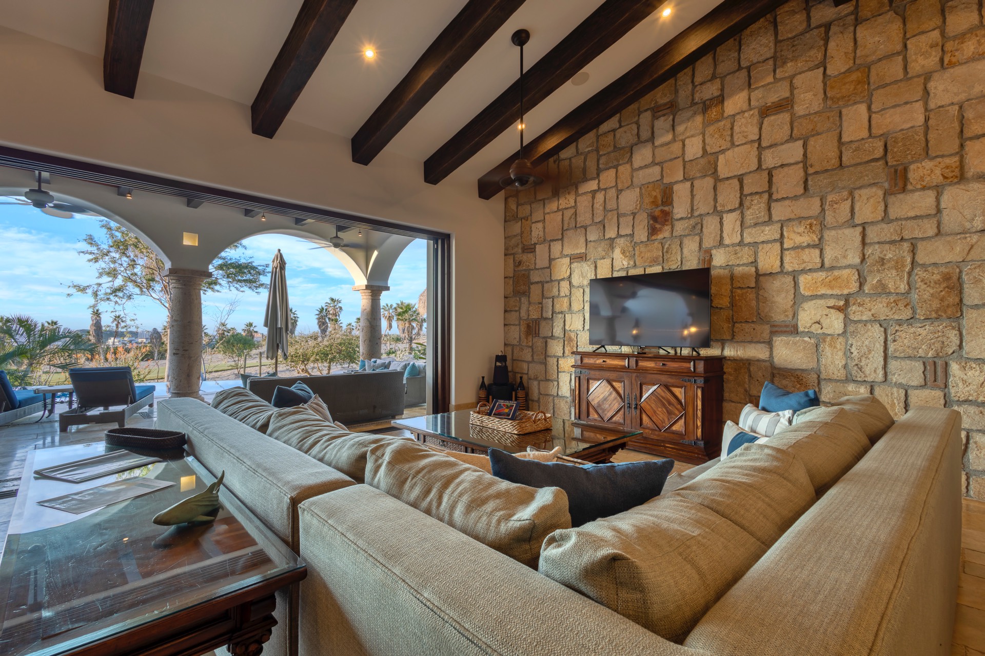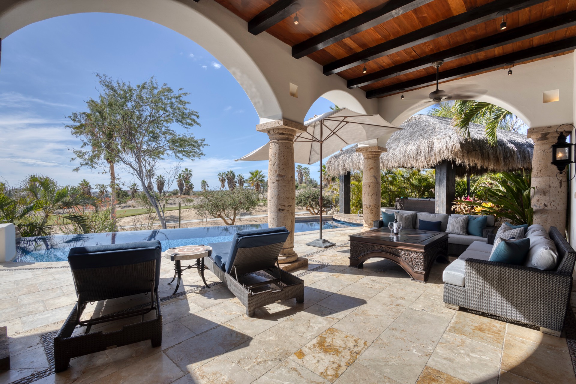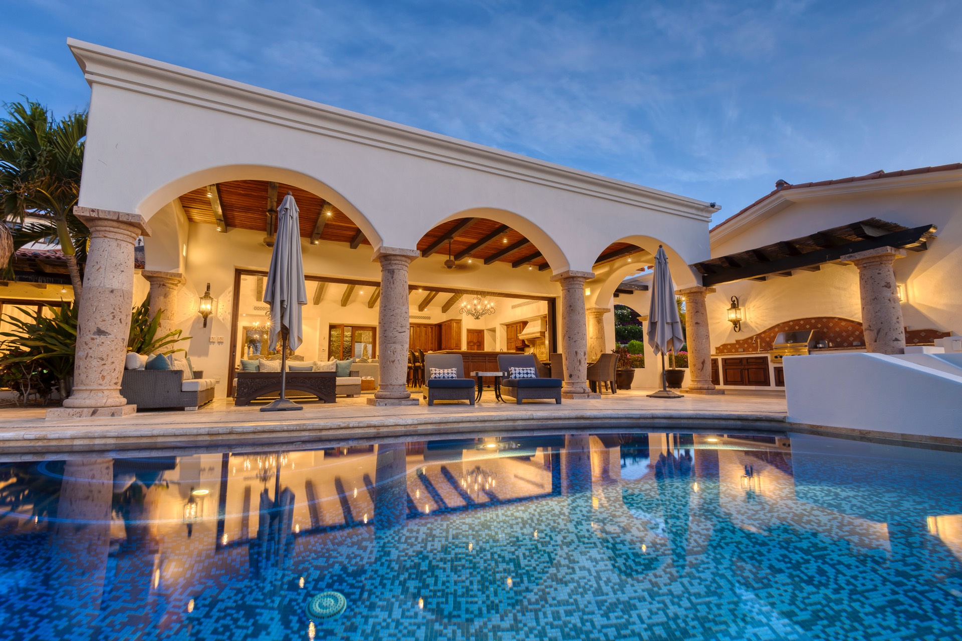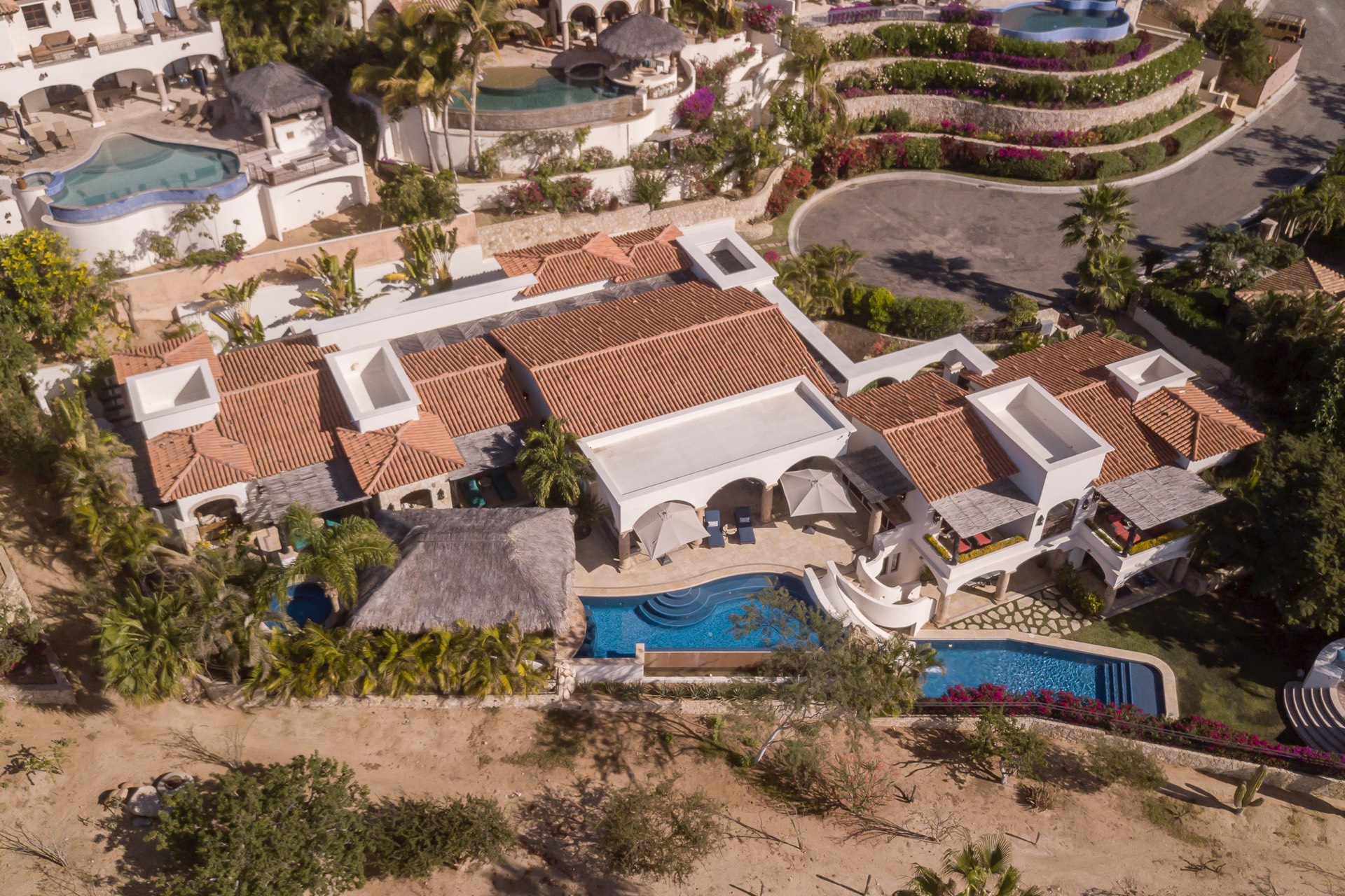The outdoor area features fantastic ocean and golf views, two pools with a water slide, an oversized fire pit area, six bedrooms with exterior seating areas, an exterior gas BBQ, a poolside palapa, a swim-up bar, a jacuzzi, and an additional palapa for lounging with golf and ocean views, providing ample space and amenities for outdoor enjoyment.