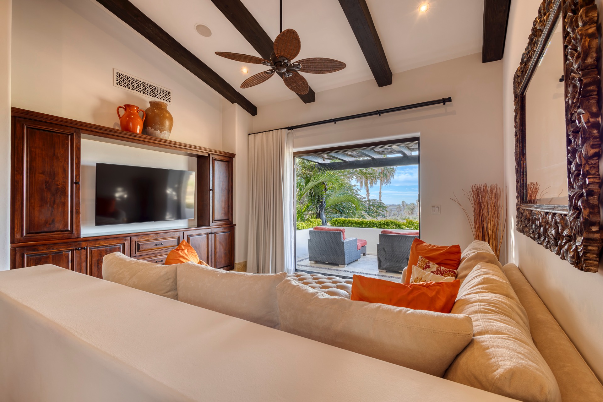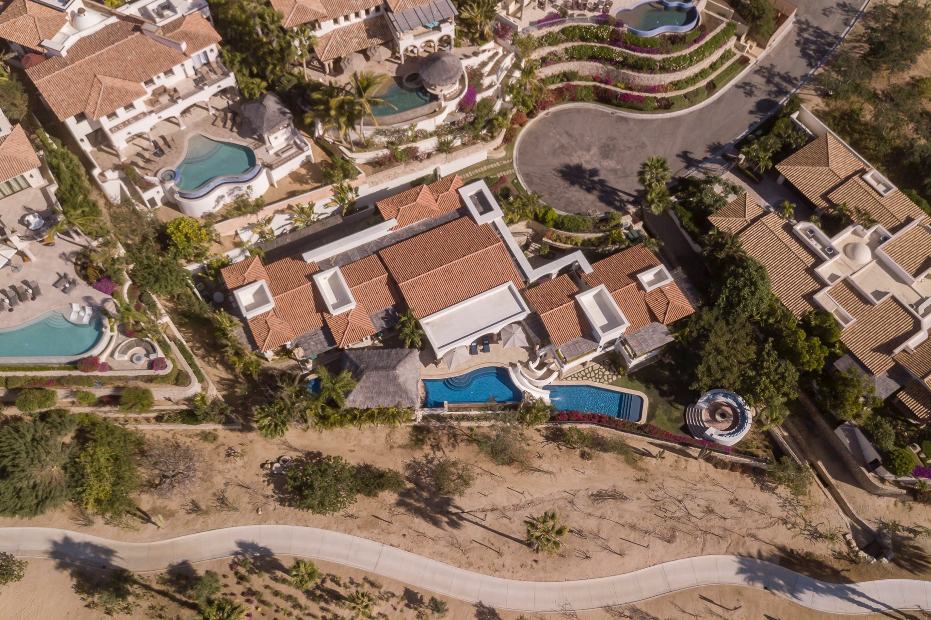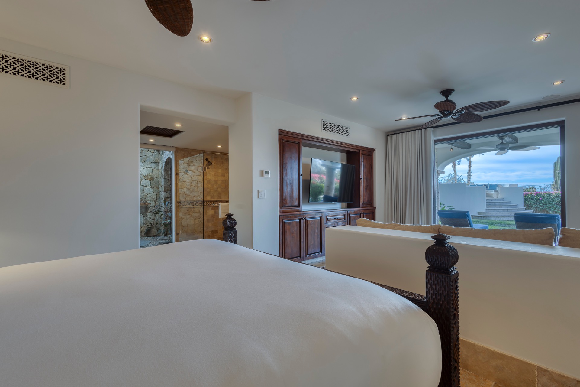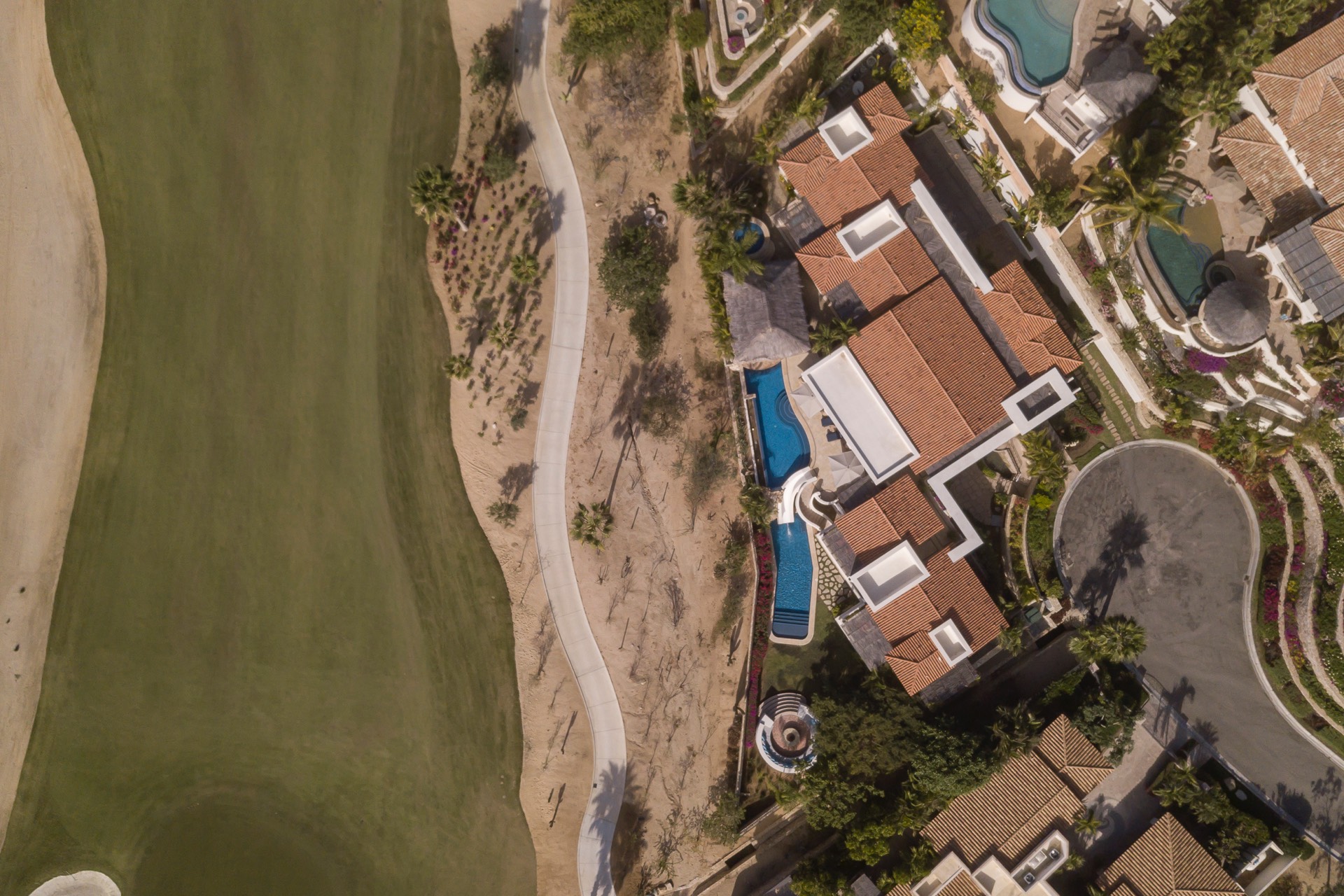 The outdoor area features fantastic ocean and golf views, two pools with a water slide, an oversized fire pit area, six bedrooms with exterior seating areas, an exterior gas BBQ, a poolside palapa, a swim-up bar, a jacuzzi, and an additional palapa for lounging with golf and ocean views, providing ample space and amenities for outdoor enjoyment.