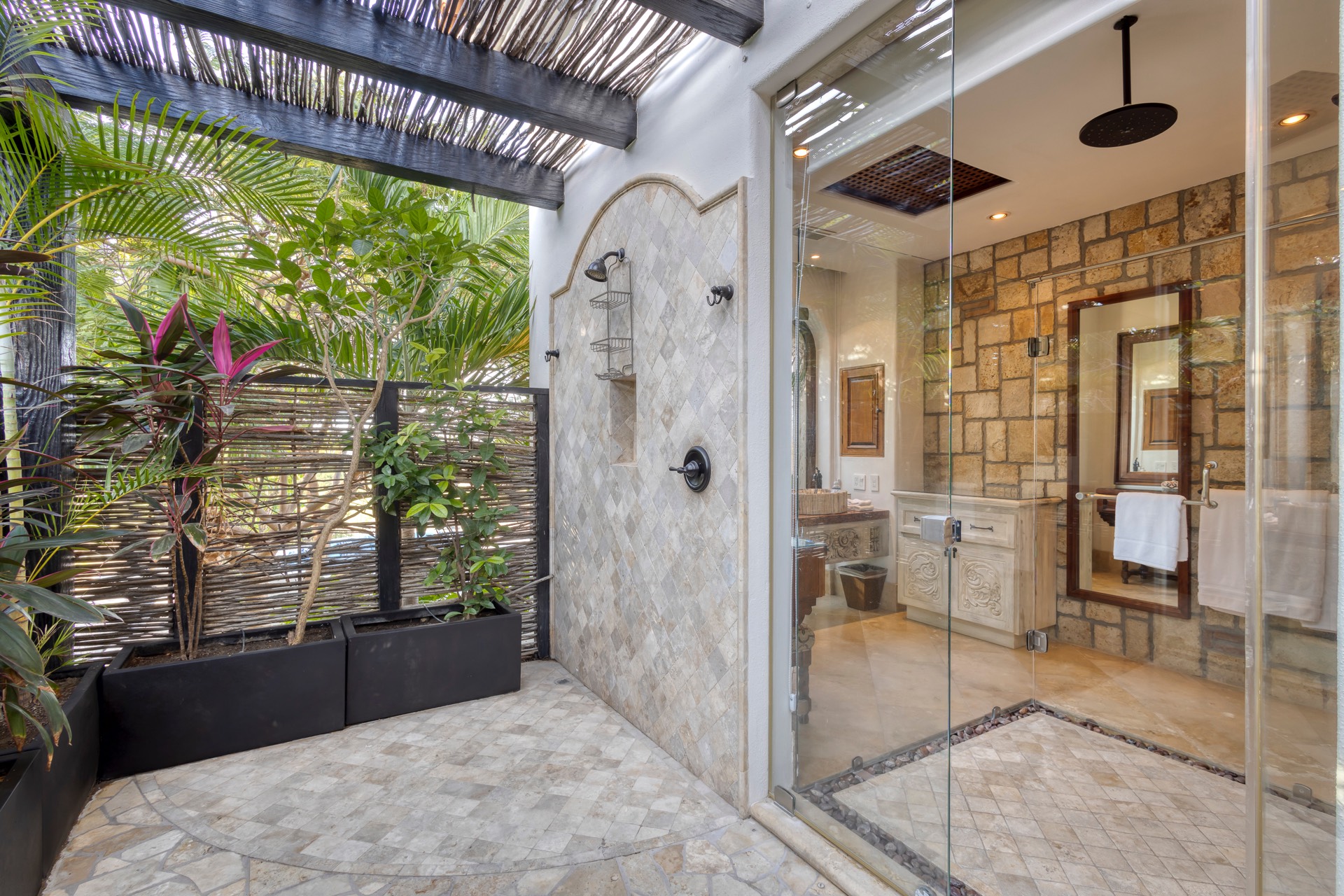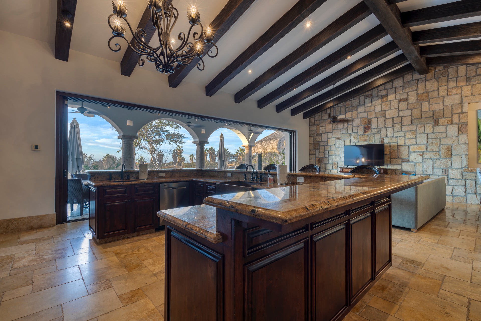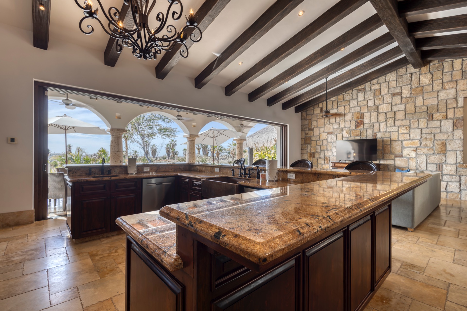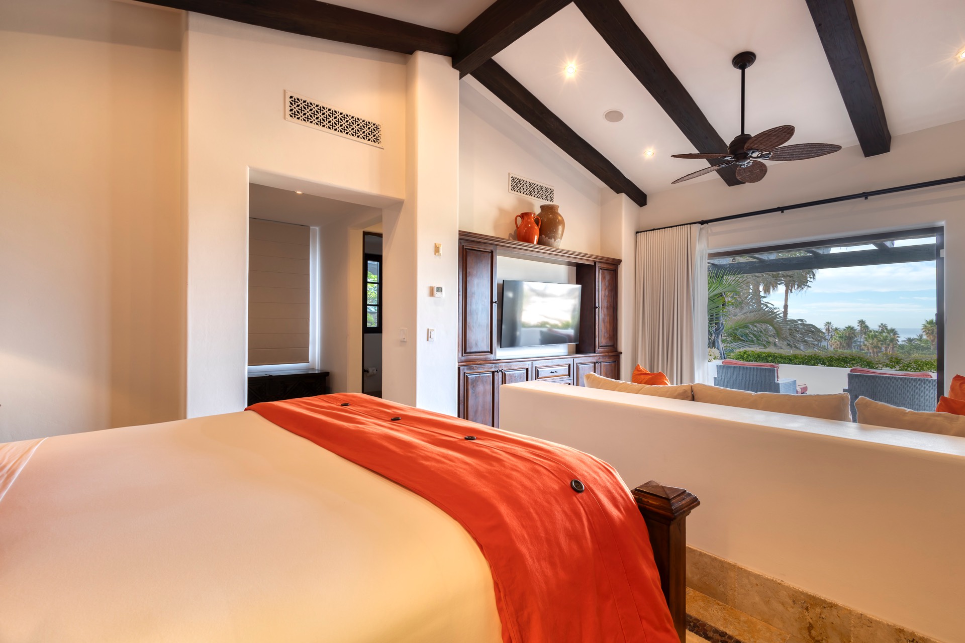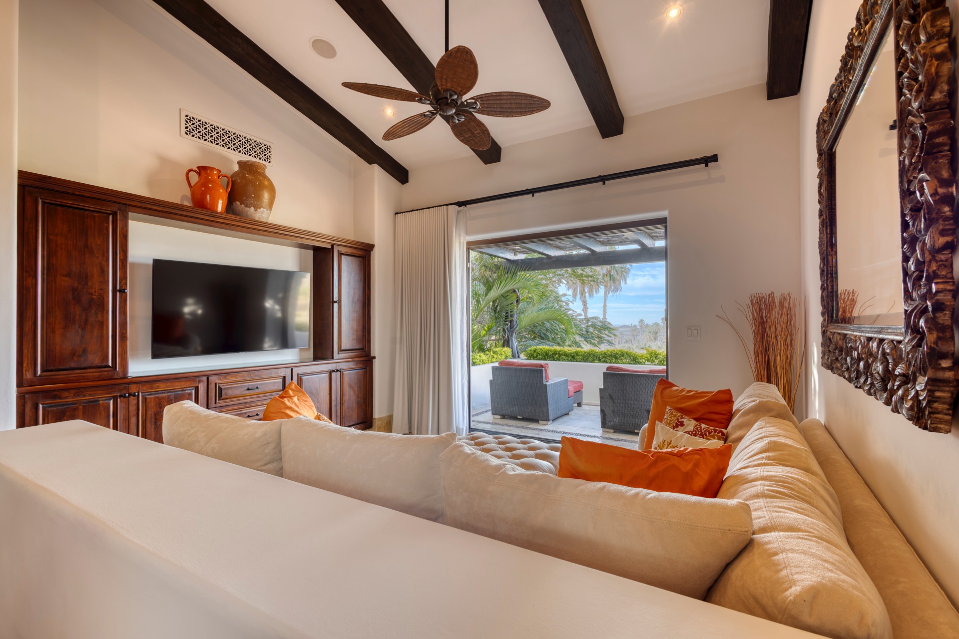 The outdoor area features fantastic ocean and golf views, two pools with a water slide, an oversized fire pit area, six bedrooms with exterior seating areas, an exterior gas BBQ, a poolside palapa, a swim-up bar, a jacuzzi, and an additional palapa for lounging with golf and ocean views, providing ample space and amenities for outdoor enjoyment.