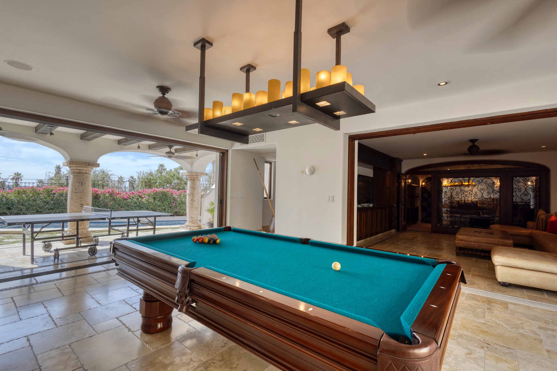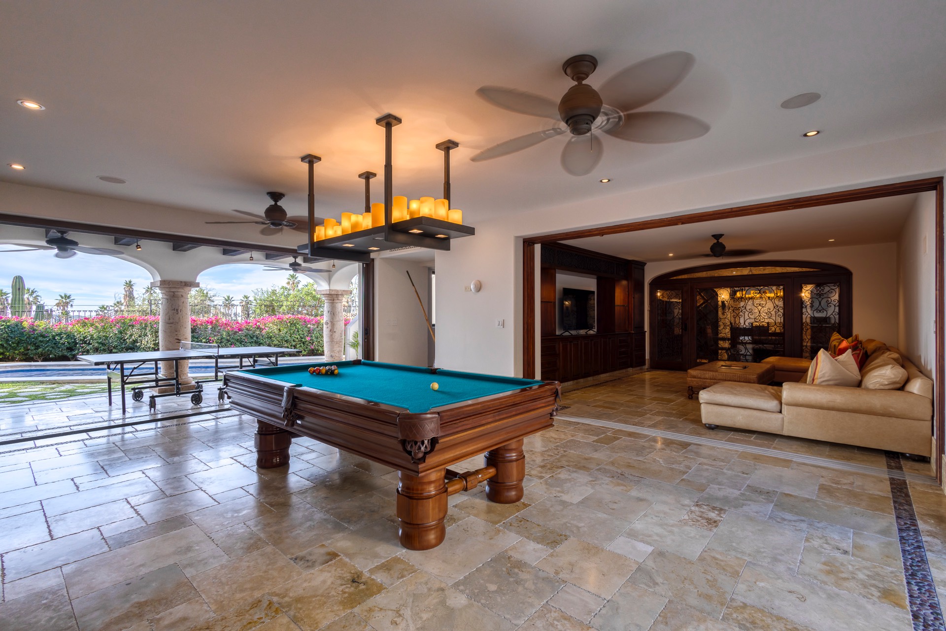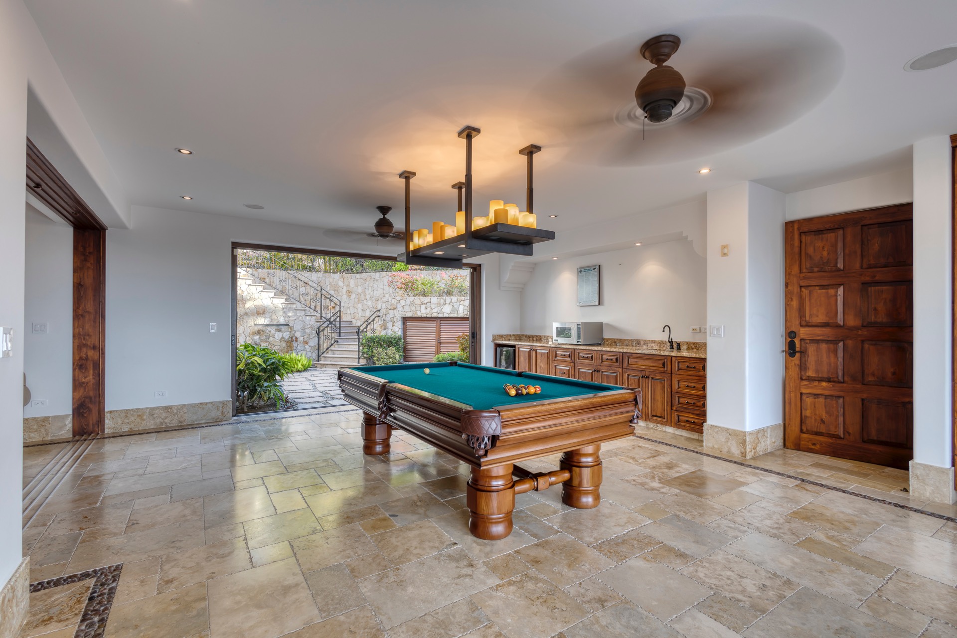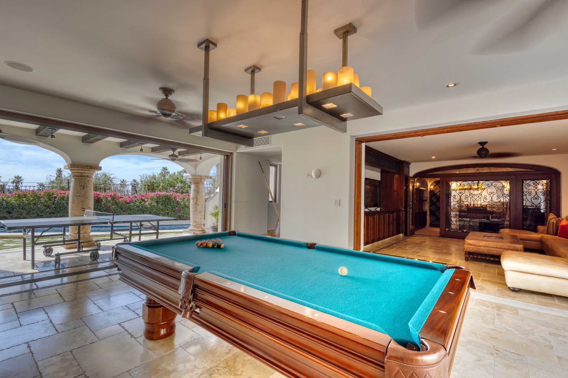 For your entertainment, the villa includes a pool table, surround sound throughout the residence, a media room with a large screen TV and Xbox, and a wine cellar, ensuring you have various options to unwind and relax.