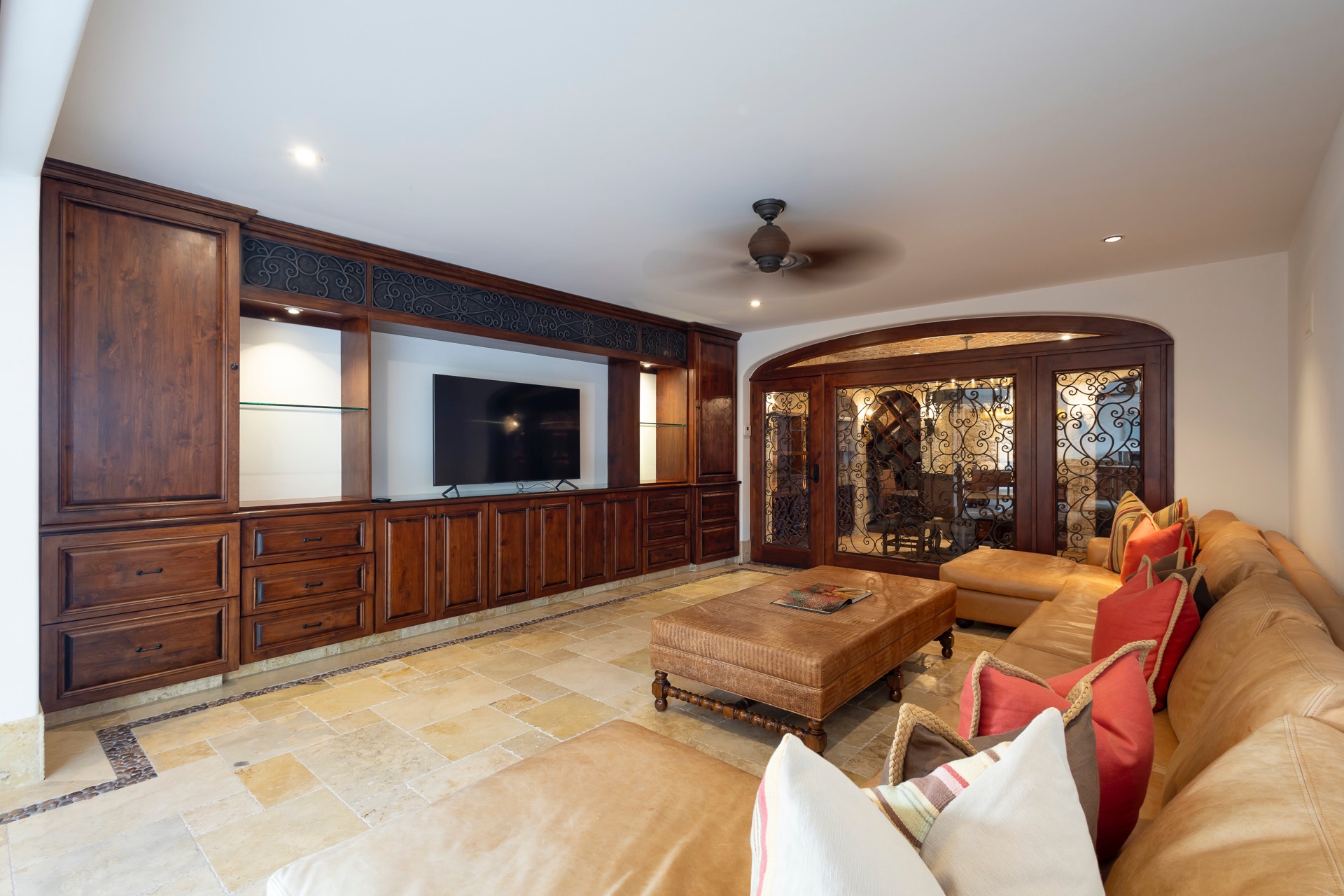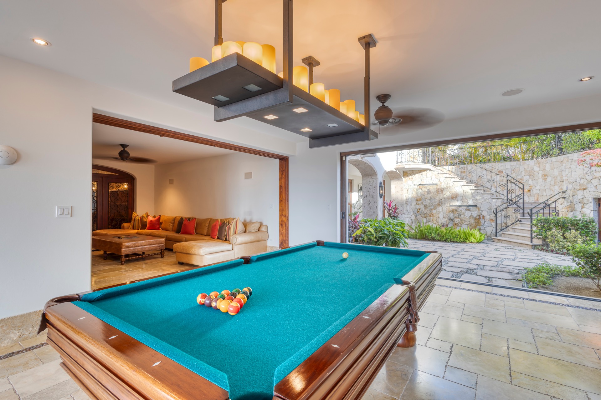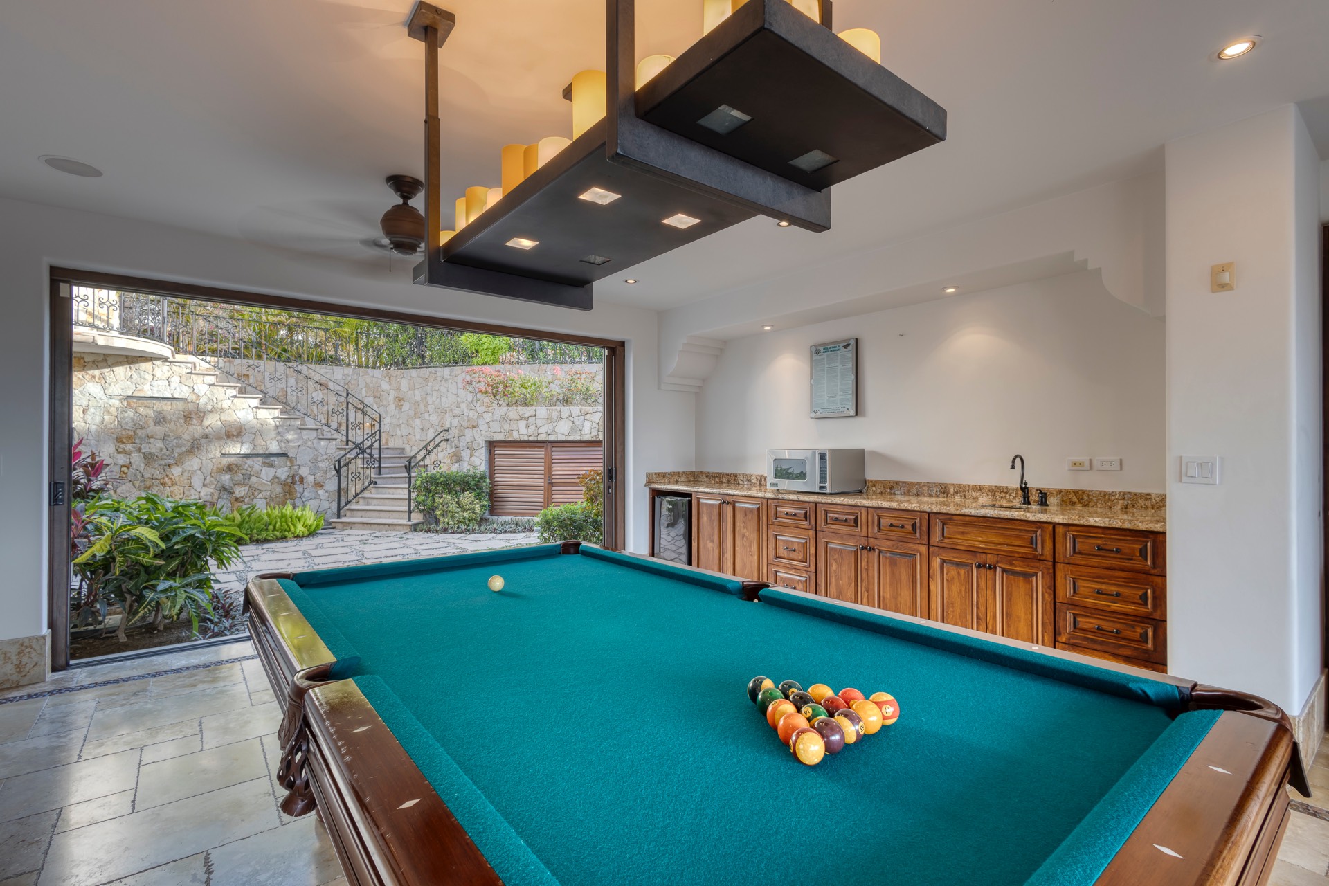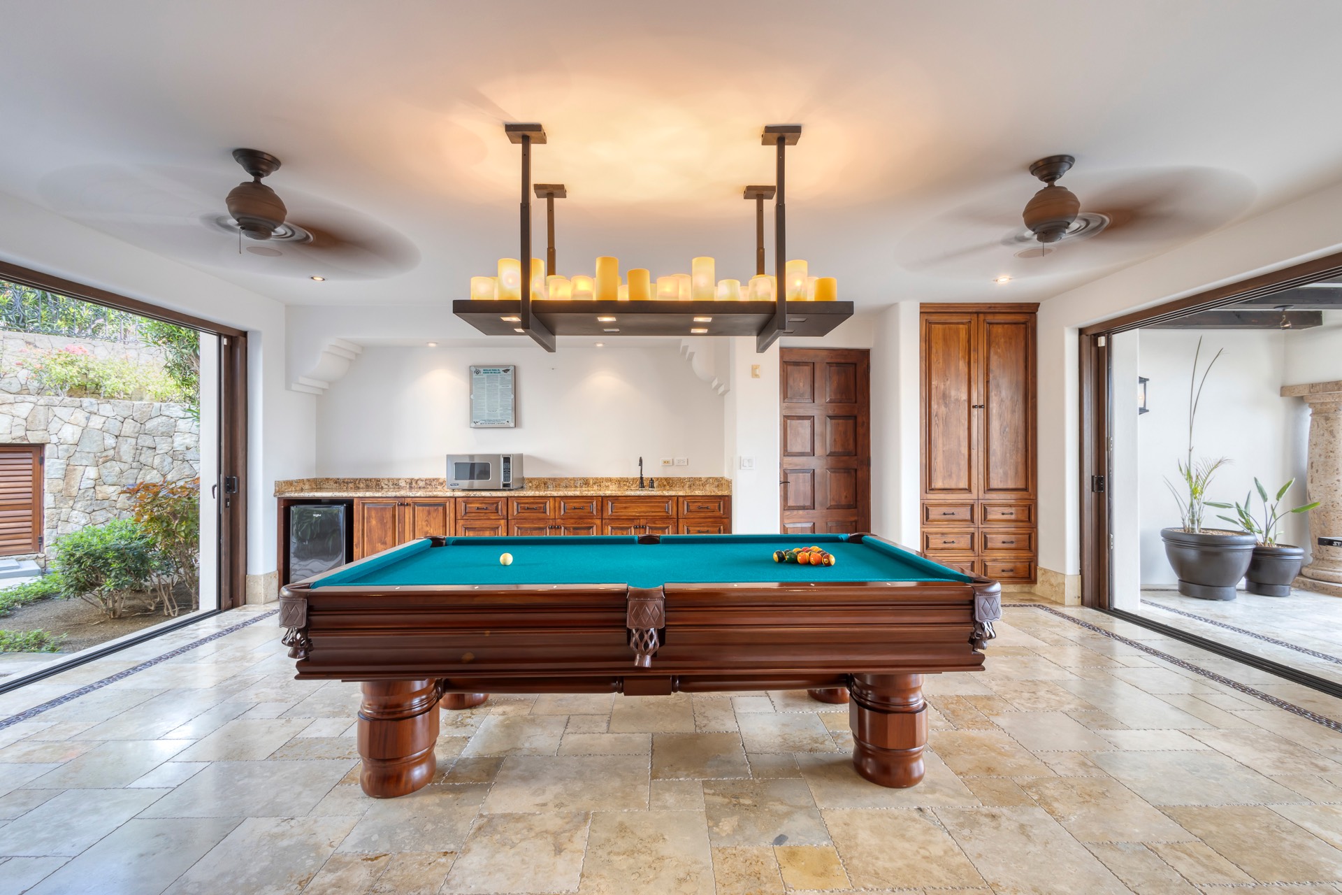 For your entertainment, the villa includes a pool table, surround sound throughout the residence, a media room with a large screen TV and Xbox, and a wine cellar, ensuring you have various options to unwind and relax.