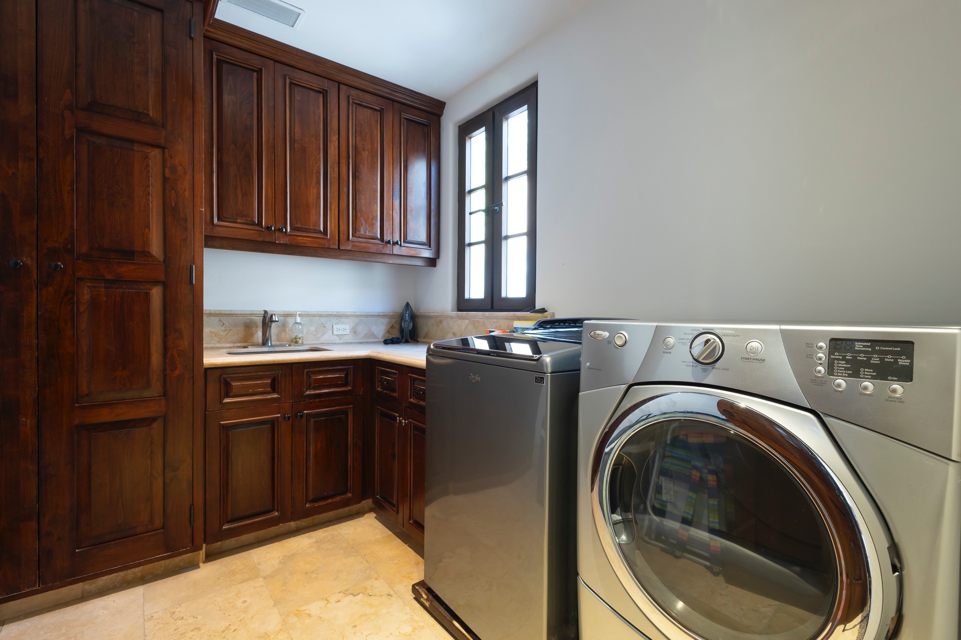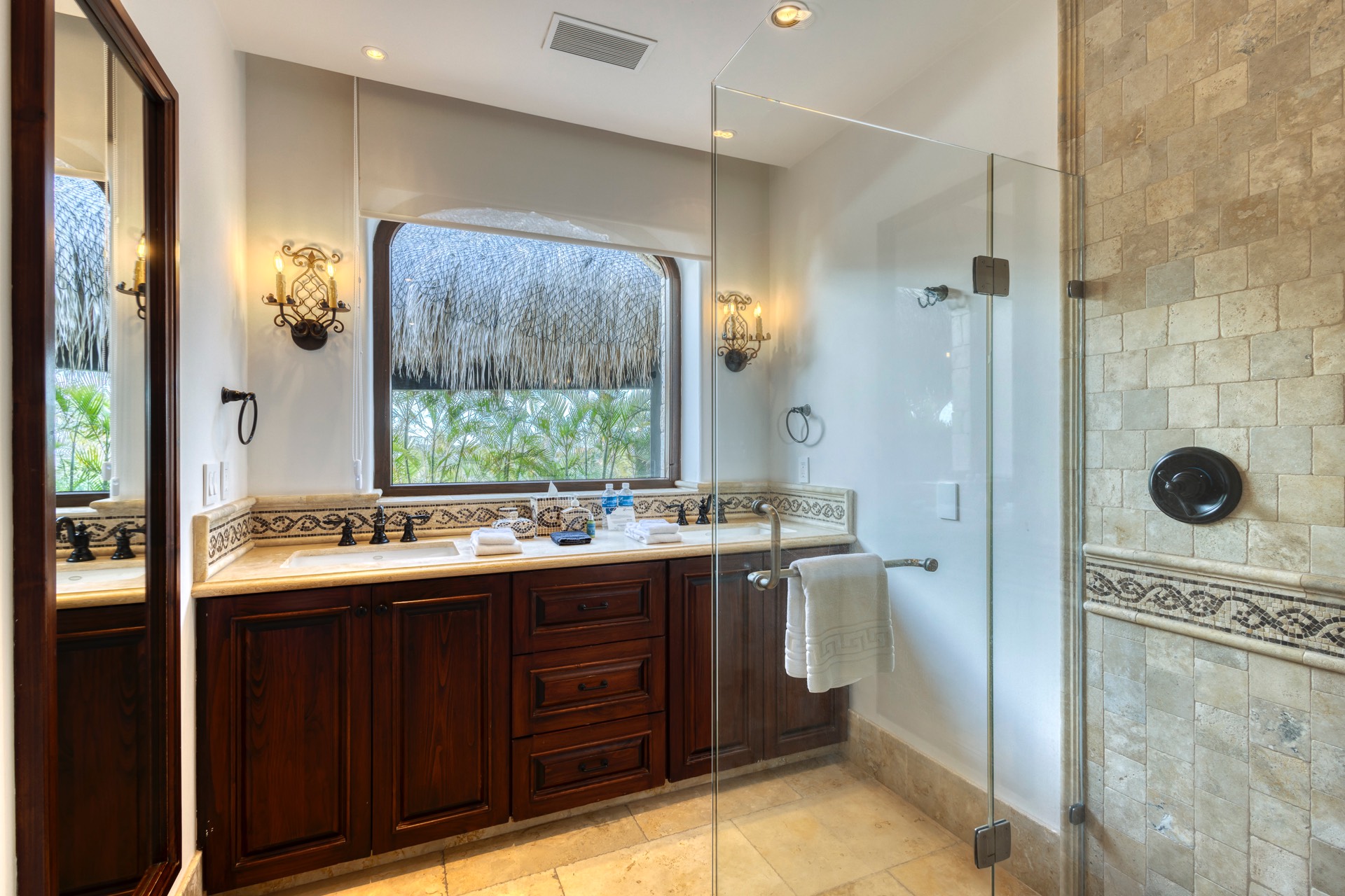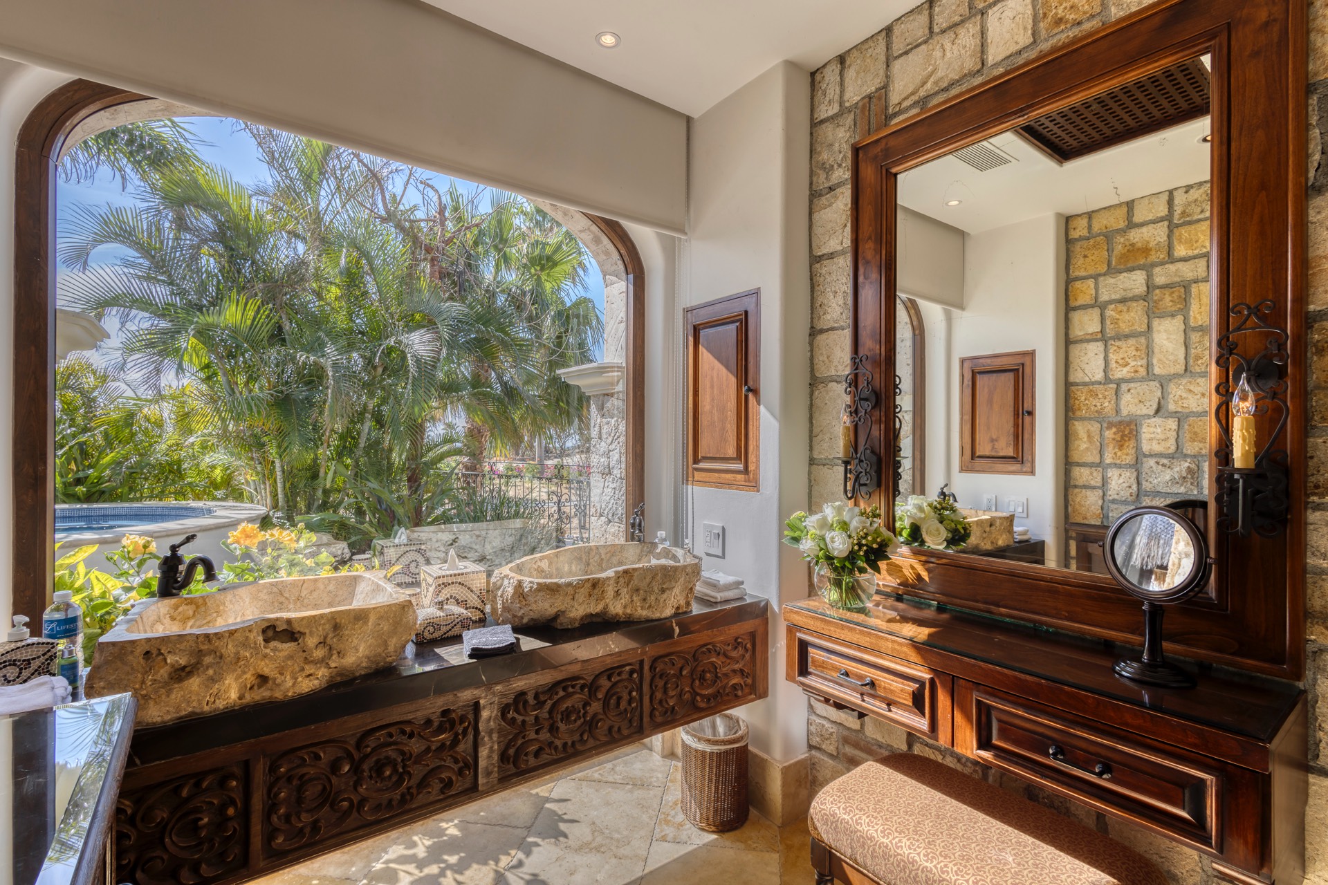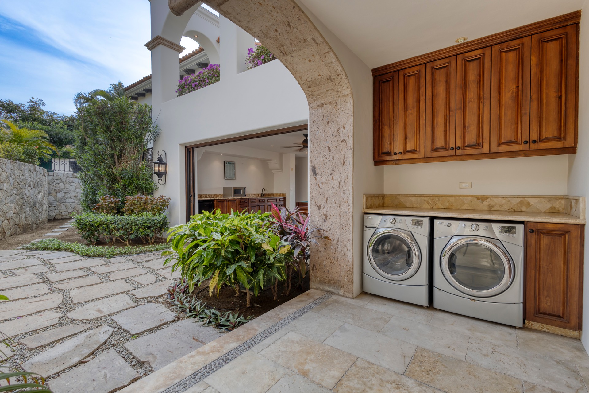 For your entertainment, the villa includes a pool table, surround sound throughout the residence, a media room with a large screen TV and Xbox, and a wine cellar, ensuring you have various options to unwind and relax.