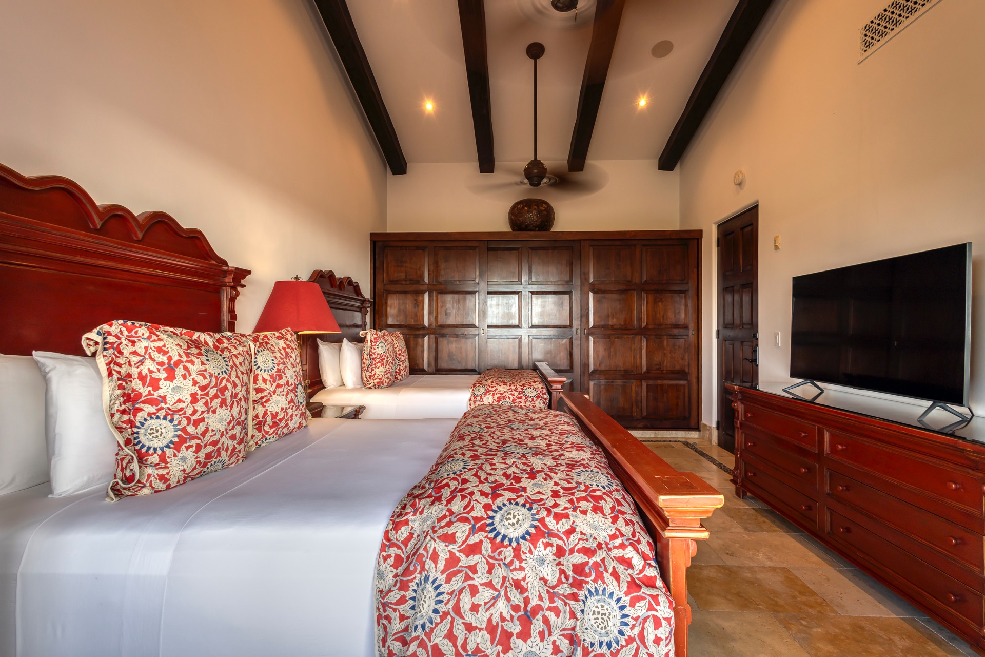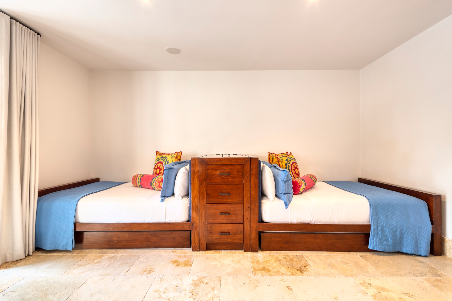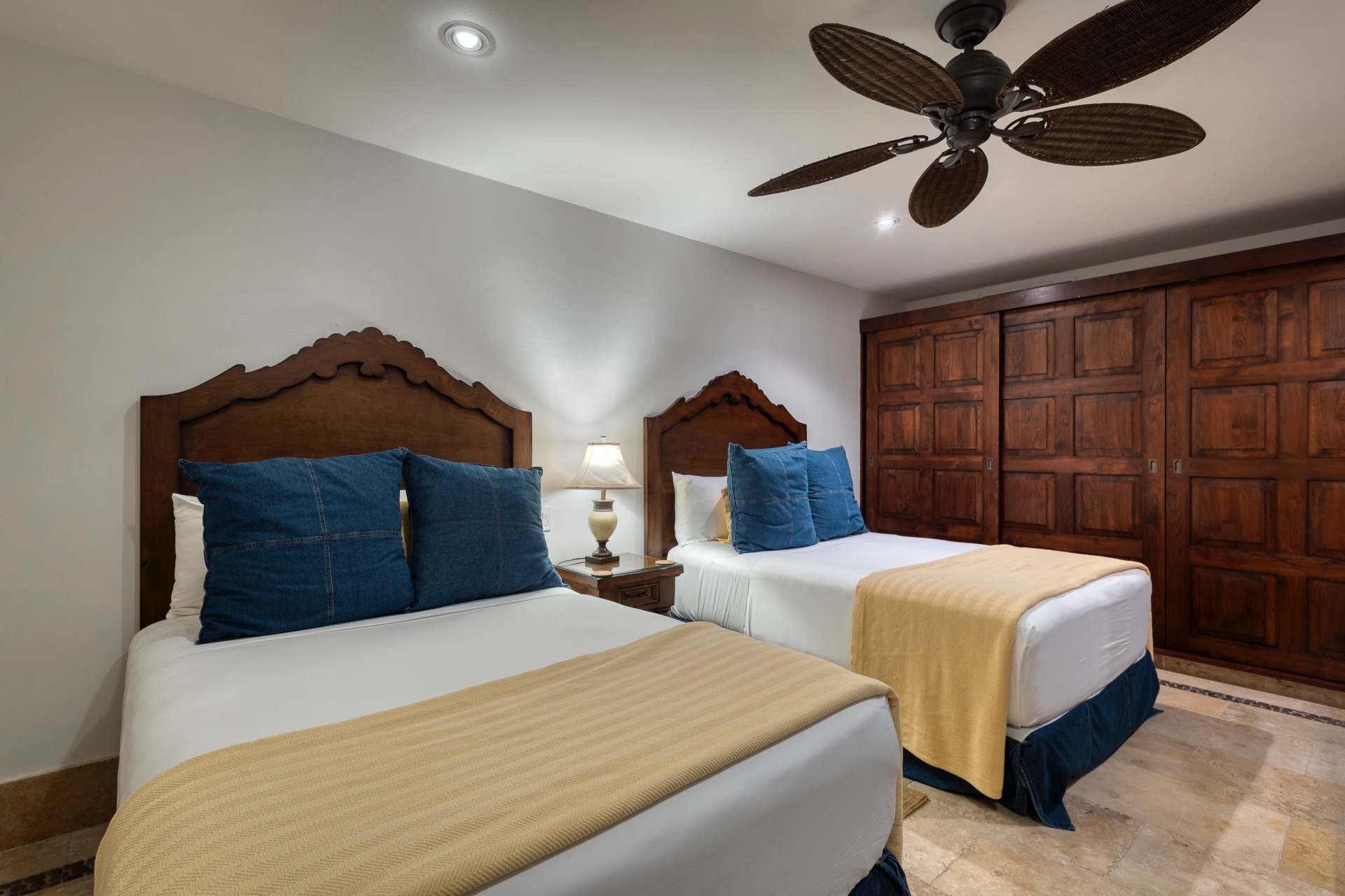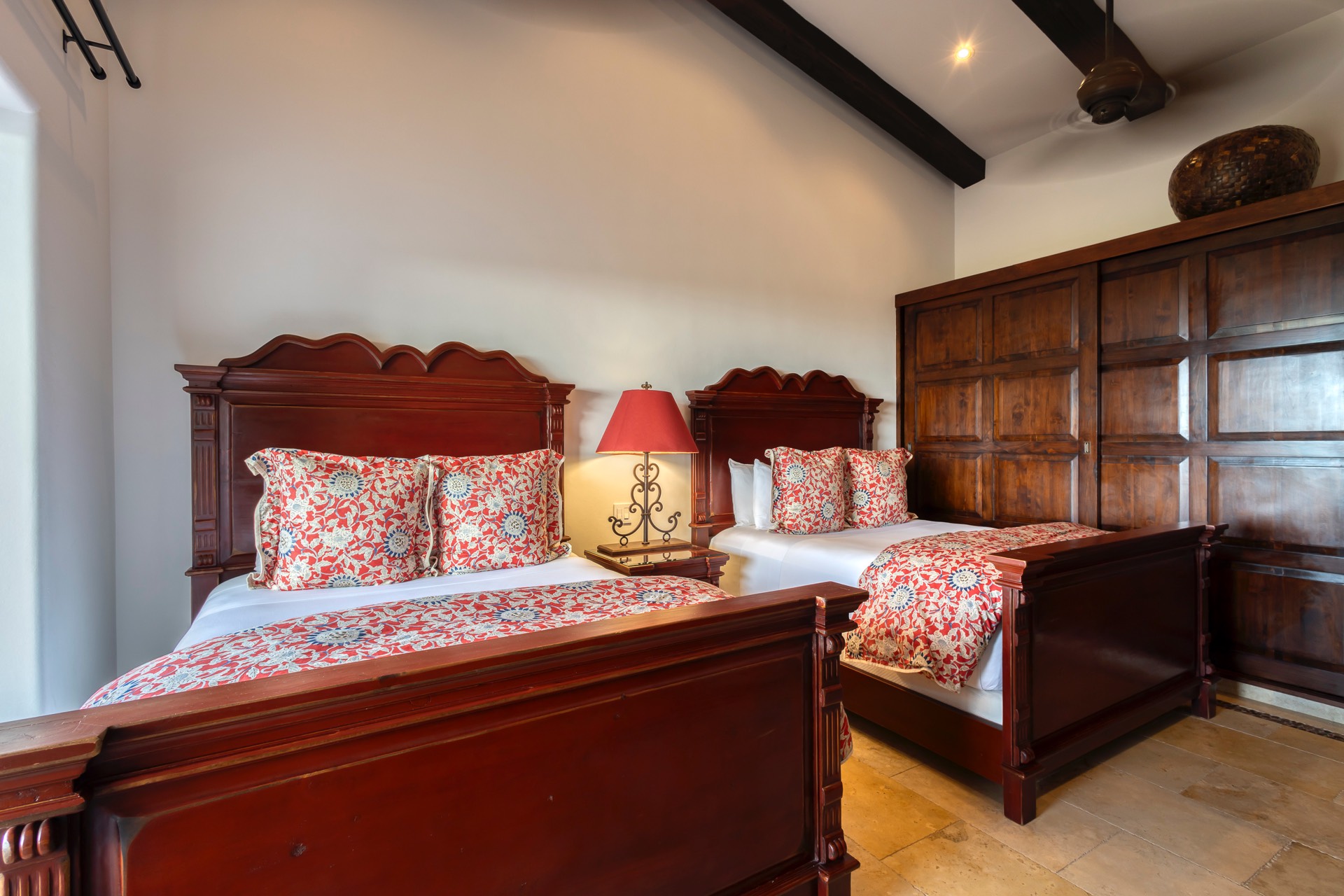 The upper guest bedroom has two queen-size beds, offering ample space for guests.