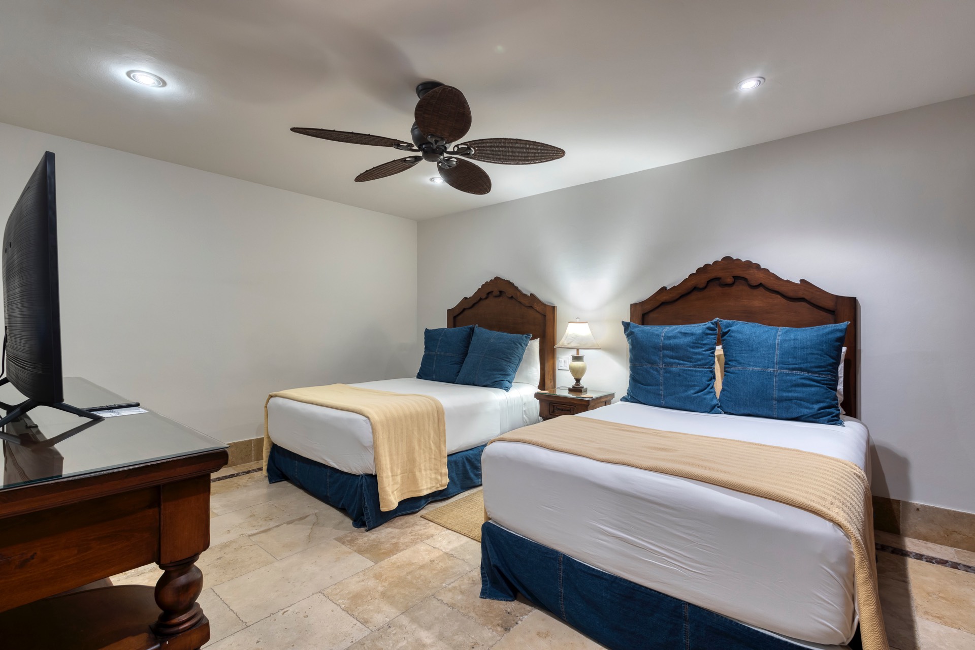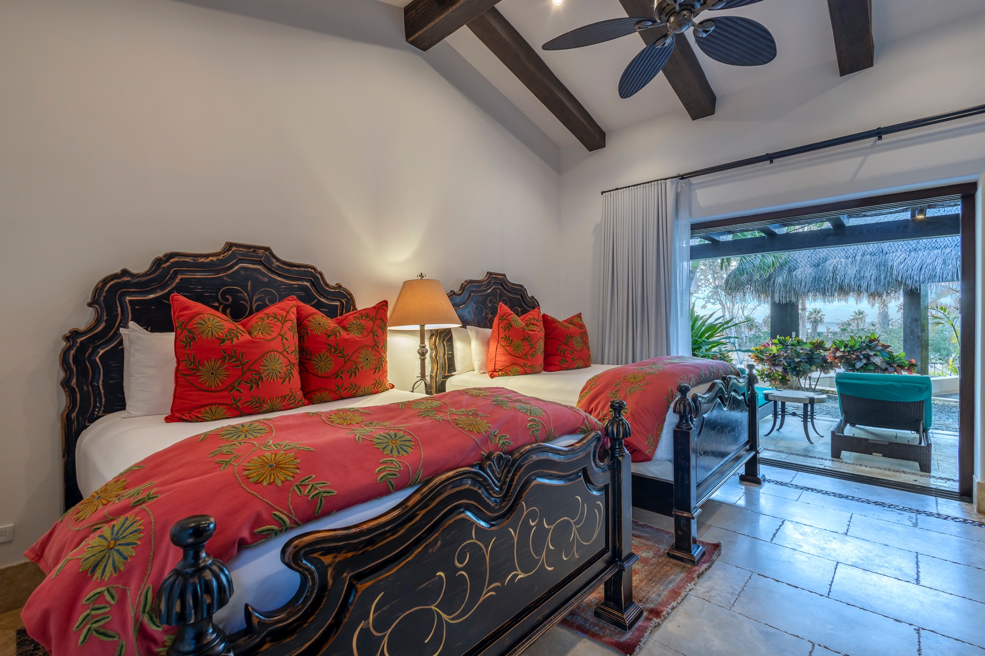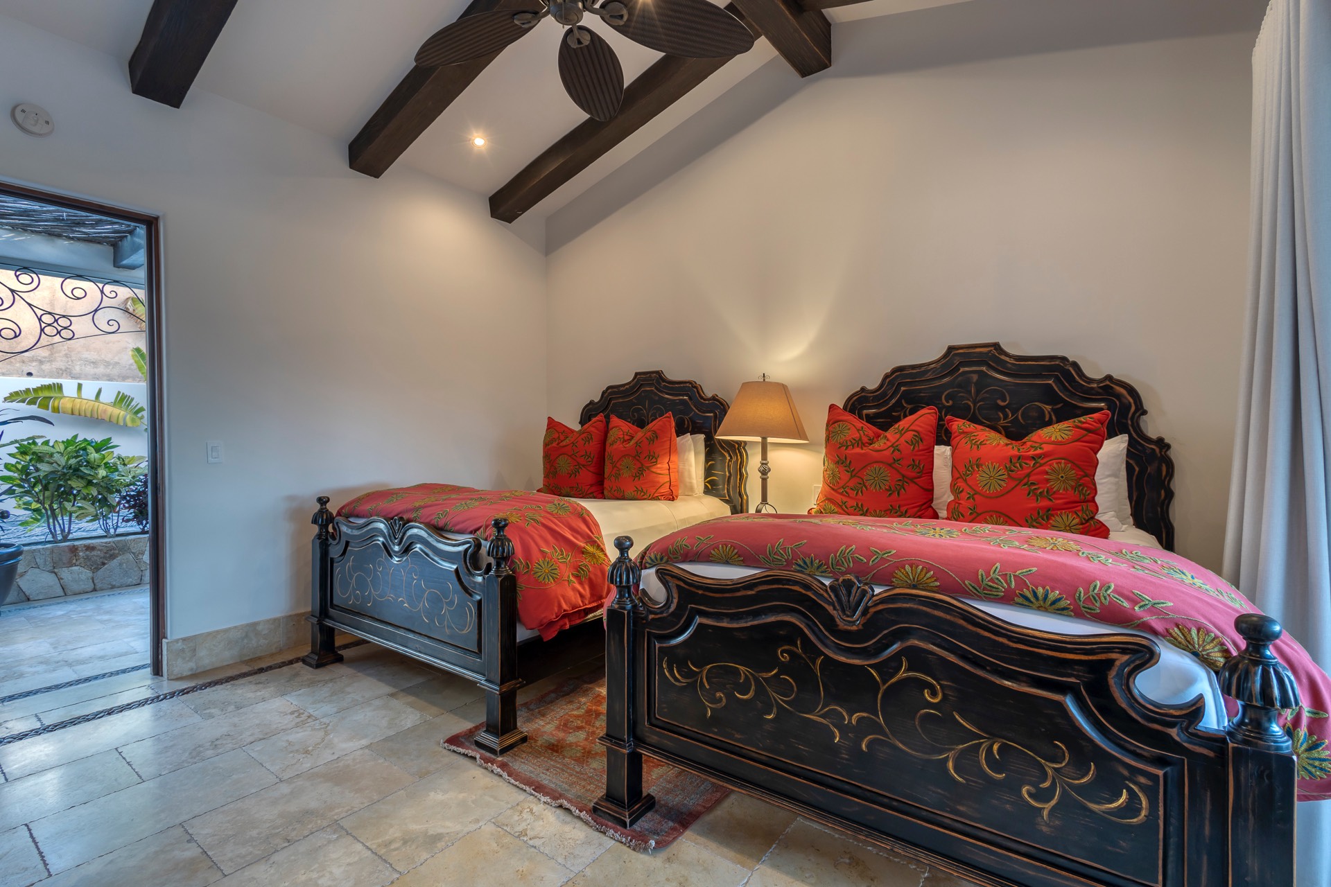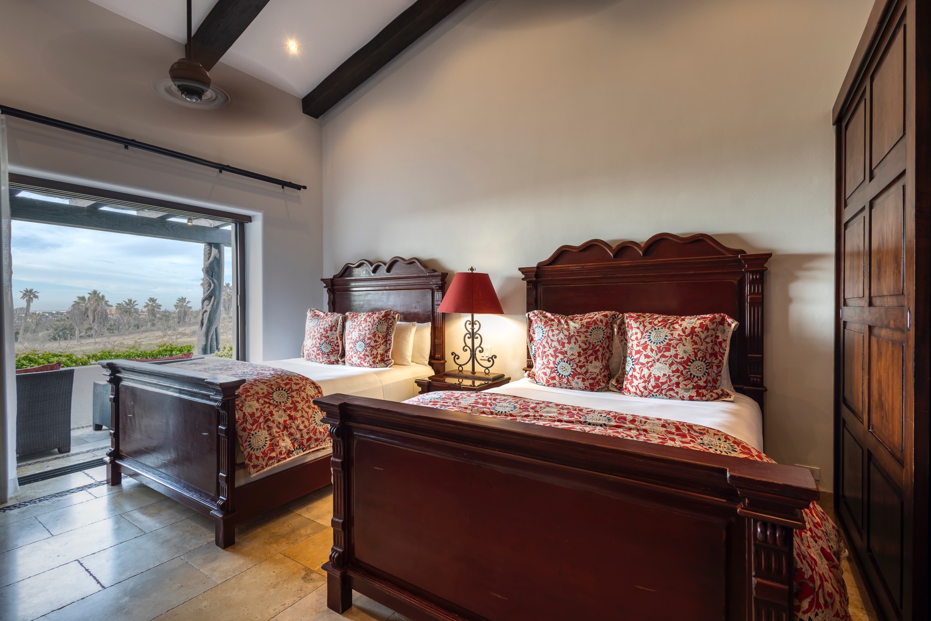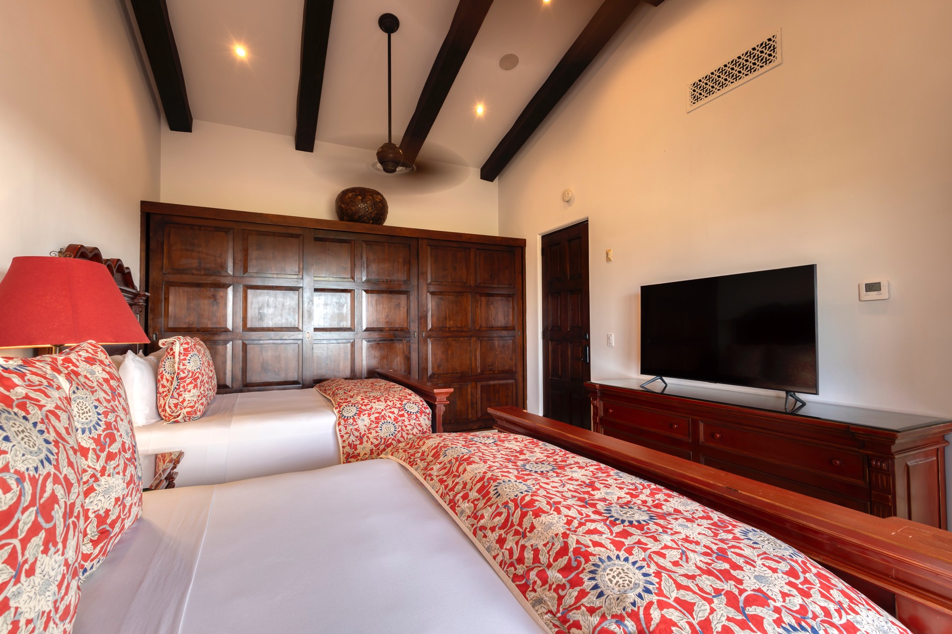 The upper guest bedroom has two queen-size beds, offering ample space for guests.